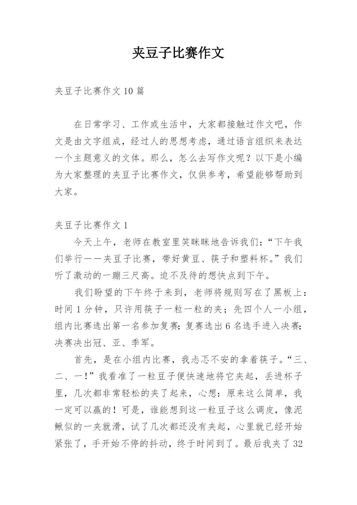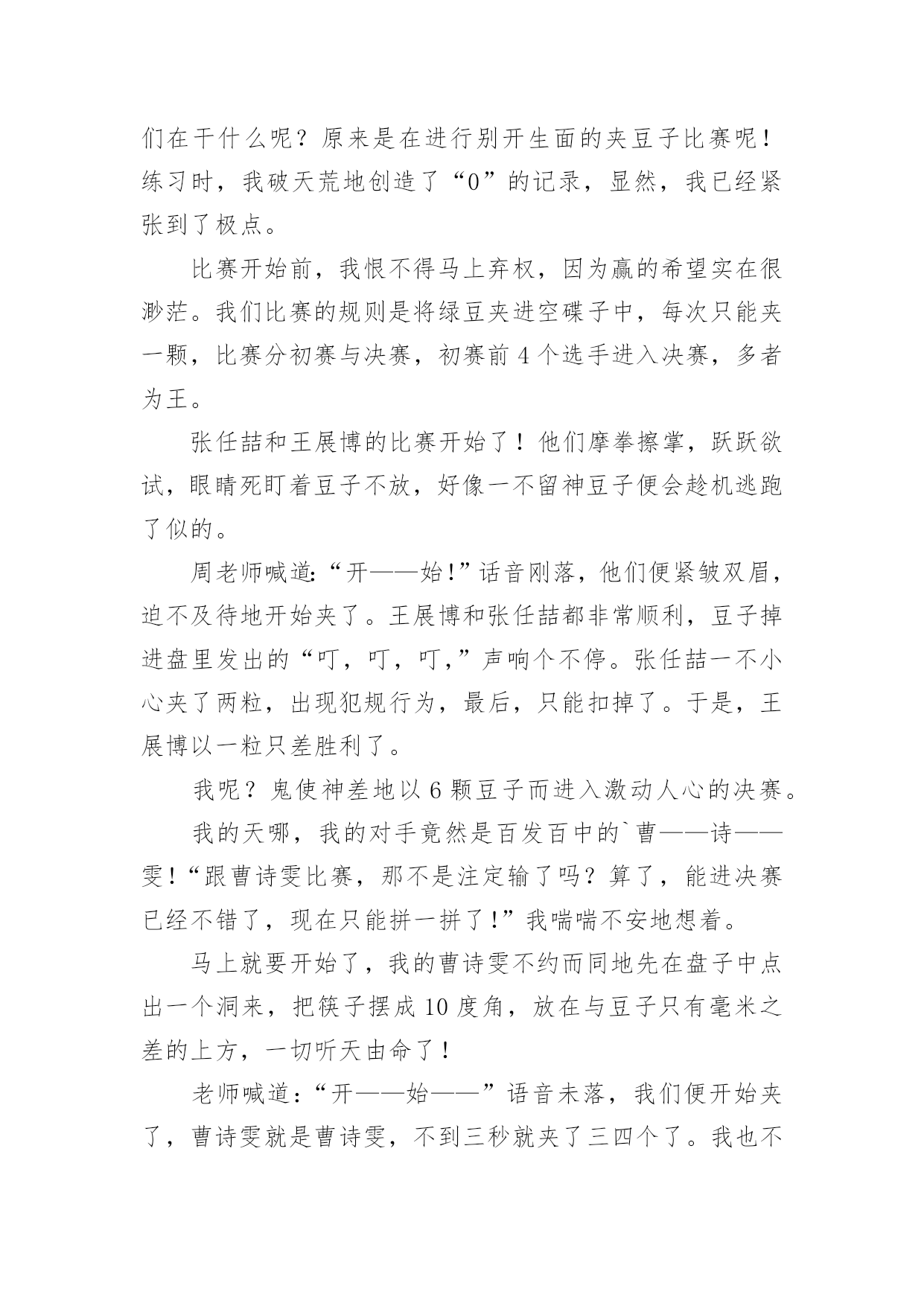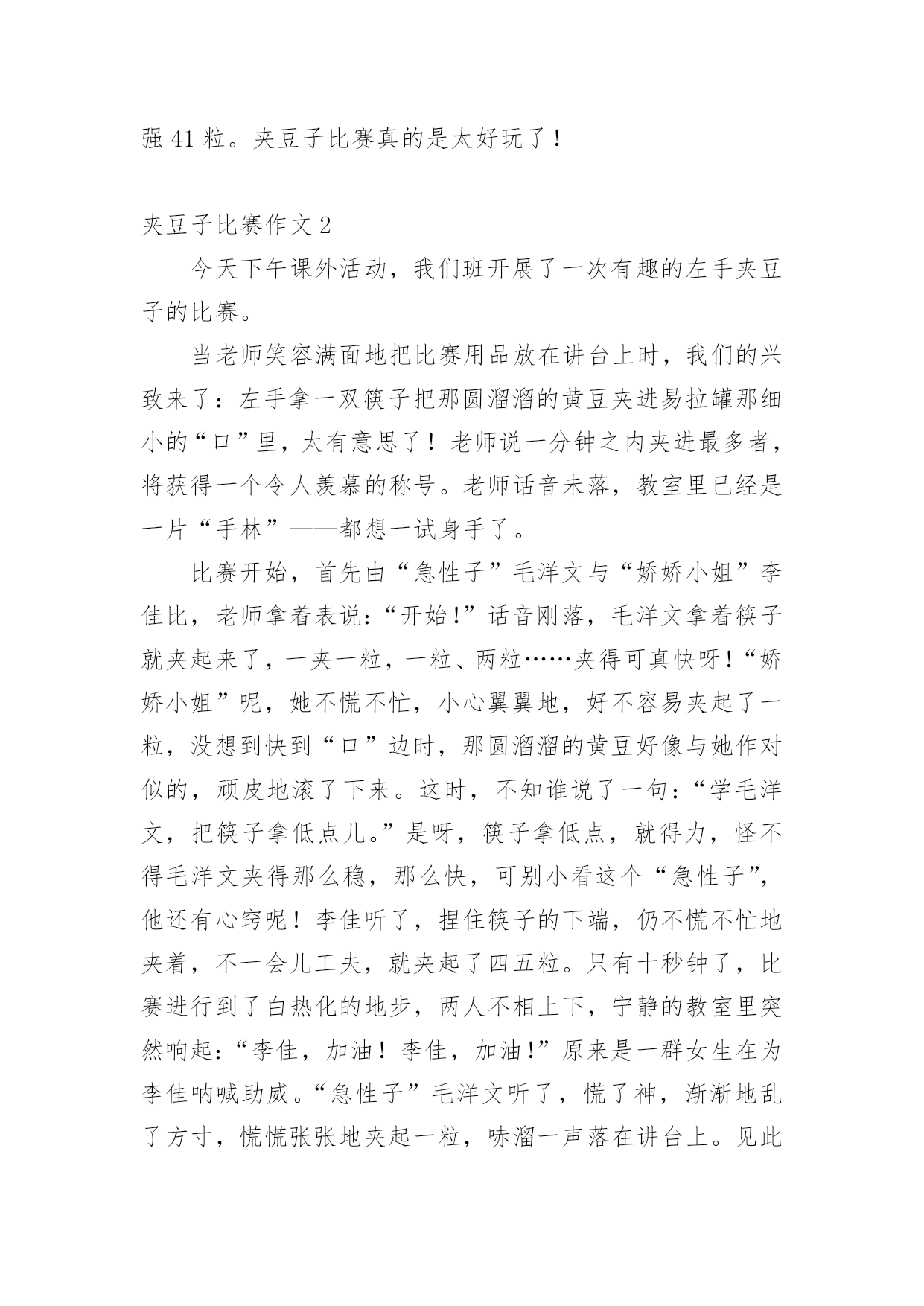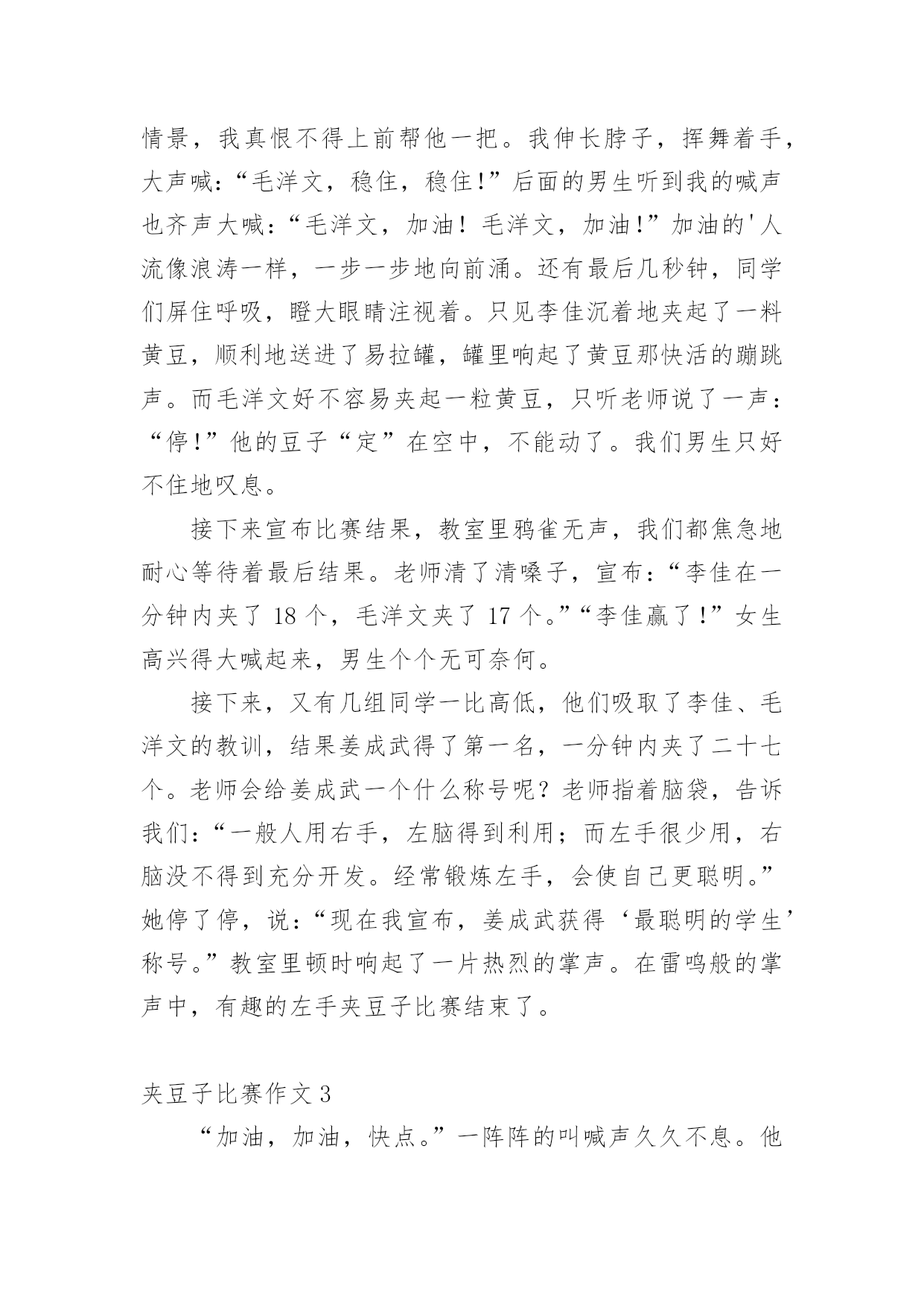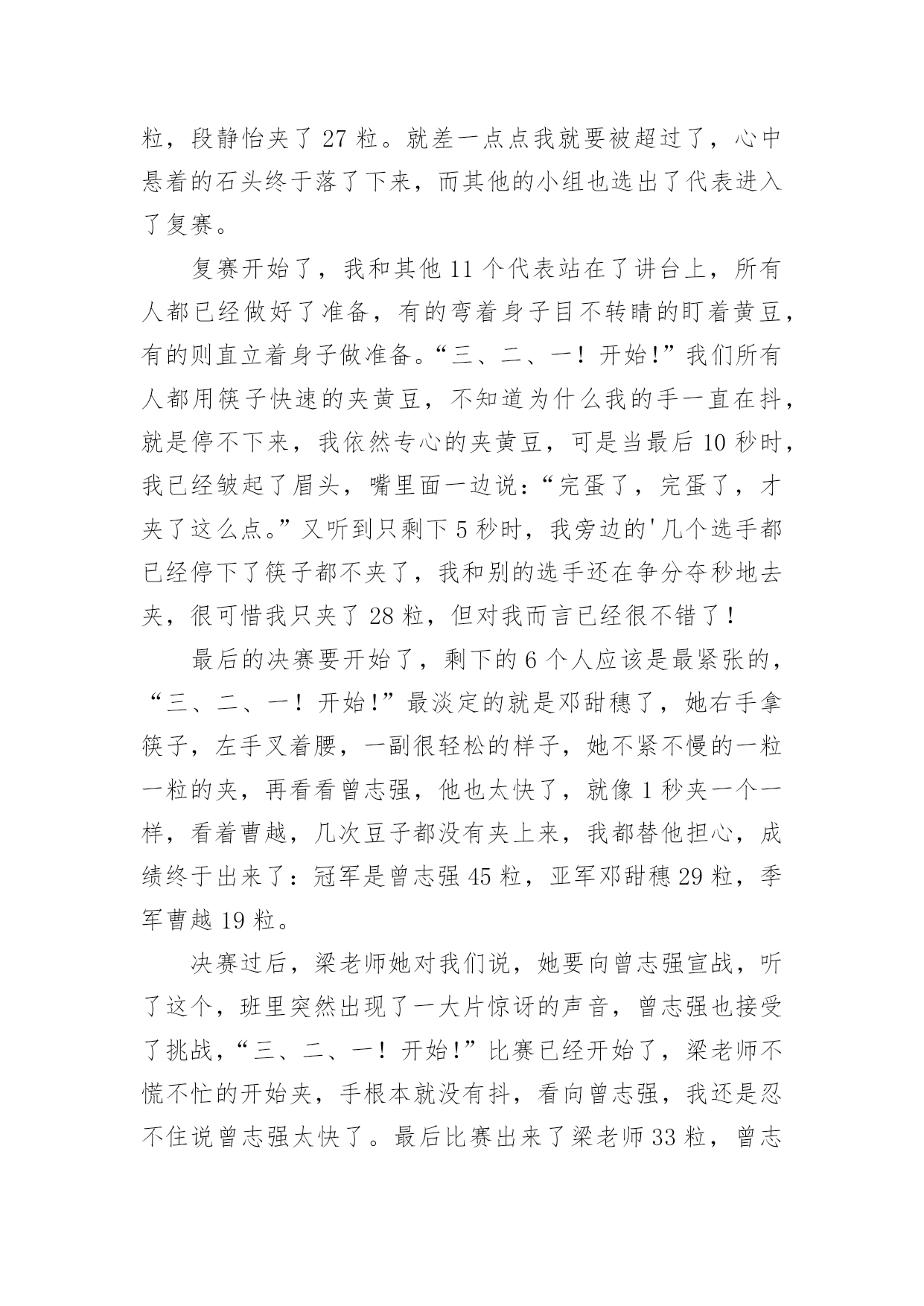夹豆子比赛作文 夹豆子比赛作文10篇在日常学习、工作或生活中,大家都接触过作文吧,作文是由文字组成,经过人的思想考虑,通过语言组织来表达一个主题意义的文体。那么,怎么去写作文呢?以下是小编为大家整理的夹豆子比赛作文,仅供参考,希望能够帮助到大家。夹豆子比赛作文1今天上午,老师在教室里笑眯眯地告诉我们:“下午我们举行--夹豆子比赛,带好黄豆、筷子和塑料杯。”我们听了激动的一蹦三尺高。迫不及待的想快点到下午。我们盼望的下午终于来到,老师将规则写在了黑板上:时间1分钟,只许用筷子一粒一粒的夹;先四个人一小组,组内比赛选出第一名参加复赛;复赛选出6名选手进入决赛;决赛决出冠、亚、季军。首先,是在小组内比赛,我忐忑不安的拿着筷子。“三、二、一!”我看准了一粒豆子便快速地将它夹起,丢进杯子里,几次都非常轻松的夹了起来,心想:原来这么简单,我一定可以赢的!可是,谁能想到这一粒豆子这么调皮,像泥鳅似的一夹就滑,试了几次都还没有夹起,心里就已经开始紧张了,手开始不停的抖动,终于时间到了。最后我夹了32粒,段静怡夹了27粒。就差一点点我就要被超过了,心中悬着的石头终于落了下来,而其他的小组也选出了代表进入了复赛。复赛开始了,我和其他11个代表站在了讲台上,所有人都已经做好了准备,有的弯着身子目不转睛的盯着黄豆,有的则直立着身子做准备。“三、二、一!开始!”我们所有人都用筷子快速的夹黄豆,不知道为什么我的手一直在抖,就是停不下来,我依然专心的夹黄豆,可是当最后10秒时,我已经皱起了眉头,嘴里面一边说:“完蛋了,完蛋了,才夹了这么点。”又听到只剩下5秒时,我旁边的'几个选手都已经停下了筷子都不夹了,我和别的选手还在争分夺秒地去夹,很可惜我只夹了28粒,但对我而言已经很不错了!最后的决赛要开始了,剩下的6个人应该是最紧张的,“三、二、一!开始!”最淡定的就是邓甜穗了,她右手拿筷子,左手叉着腰,一副很轻松的样子,她不紧不慢的一粒一粒的夹,再看看曾志强,他也太快了,就像1秒夹一个一样,看着曹越,几次豆子都没有夹上来,我都替他担心,成绩终于出来了:冠军是曾志强45粒,亚军邓甜穗29粒,季军曹越19粒。决赛过后,梁老师她对我们说,她要向曾志强宣战,听了这个,班里突然出现了一大片惊讶的声音,曾志强也接受了挑战,“三、二、一!开始!”比赛已经开始了,梁老师不慌不忙的开始夹,手根本就没有抖,看向曾志强,我还是忍不住说曾志强太快了。最后比赛出来了梁老师33粒,曾志强41粒。夹豆子比赛真的是太好玩了!夹豆子比赛作文2今天下午课外活动,我们班开展了一次有趣的左手夹豆子的比赛。当老师笑容满面地把比赛用品放在讲台上时,我们的兴致来了:左手拿一双筷子把那圆溜溜的黄豆夹进易拉罐那细小的“口”里,太有意思了!老师说一分钟之内夹进最多者,将获得一个令人羡慕的称号。老师话音未落,教室里已经是一片“手林”——都想一试身手了。比赛开始,首先由“急性子”毛洋文与“娇娇小姐”李佳比,老师拿着表说:“开始!”话音刚落,毛洋文拿着筷子就夹起来了,一夹一粒,一粒、两粒……夹得可真快呀!“娇娇小姐”呢,她不慌不忙,小心翼翼地,好不容易夹起了一粒,没想到快到“口”边时,那圆溜溜的黄豆好像与她作对似的,顽皮地滚了下来。这时,不知谁说了一句:“学毛洋文,把筷子拿低点儿。”是呀,筷子拿低点,就得力,怪不得毛洋文夹得那么稳,那么快,可别小看这个“急性子”,他还有心窍呢!李佳听了,捏住筷子的下端,仍不慌不忙地夹着,不一会儿工夫,就夹起了四五粒。只有十秒钟了,比赛进行到了白热化的地步,两人不相上下,宁静的教室里突然响起:“李佳,加油!李佳,加油!”原来是一群女生在为李佳呐喊助威。“急性子”毛洋文听了,慌了神,渐渐地乱了方寸,慌慌张张地夹起一粒,哧溜一声落在讲台上。见此情景,我真恨不得上前帮他一把。我伸长脖子,挥舞着手,大声喊:“毛洋文,稳住,稳住!”后面的男生听到我的喊声也齐声大喊:“毛洋文,加油!毛洋文,加油!”加油的'人流像浪涛一样,一步一步地向前涌。还有最后几秒钟,同学们屏住呼吸,瞪大眼睛注视着。只见李佳沉着地夹起了一料黄豆,顺利地送进了易拉罐,罐里响起了黄豆那快活的蹦跳声。而毛洋文好不容易夹起一粒黄豆,只听老师说了一声:“停!”他的豆子“定”在空中,不能动了。我们男生只好不住地叹息。接下来宣布比赛结果,教室里鸦雀无声,我们都焦急地耐心等待着最后结果。老师清了清嗓子,宣布:“李佳在一分钟内夹了18个,毛洋文夹了17个。”“李佳赢了!”女生高兴得大喊起来,男生个个无可奈何。接下来,又有几组同学一比高低,他们吸取了李佳、毛洋文的教训,结果姜成武得了第一名,一分钟内夹了二十七个。老师会给姜成武一个什么称号呢?老师指着脑袋,告诉我们:“一般人用右手,左脑得到利用;而左手很少用,右脑没不得到充分开发。经常锻炼左手,会