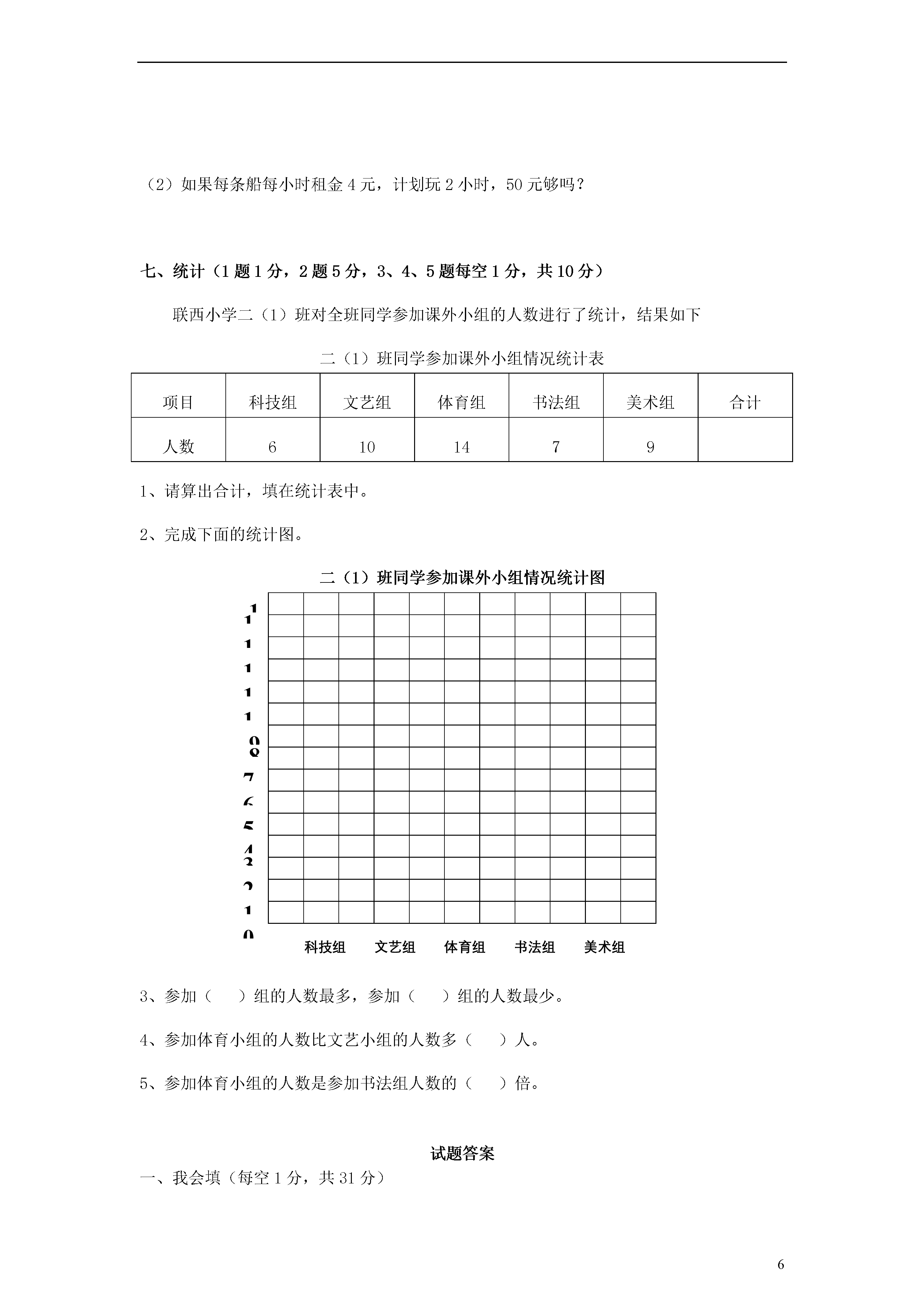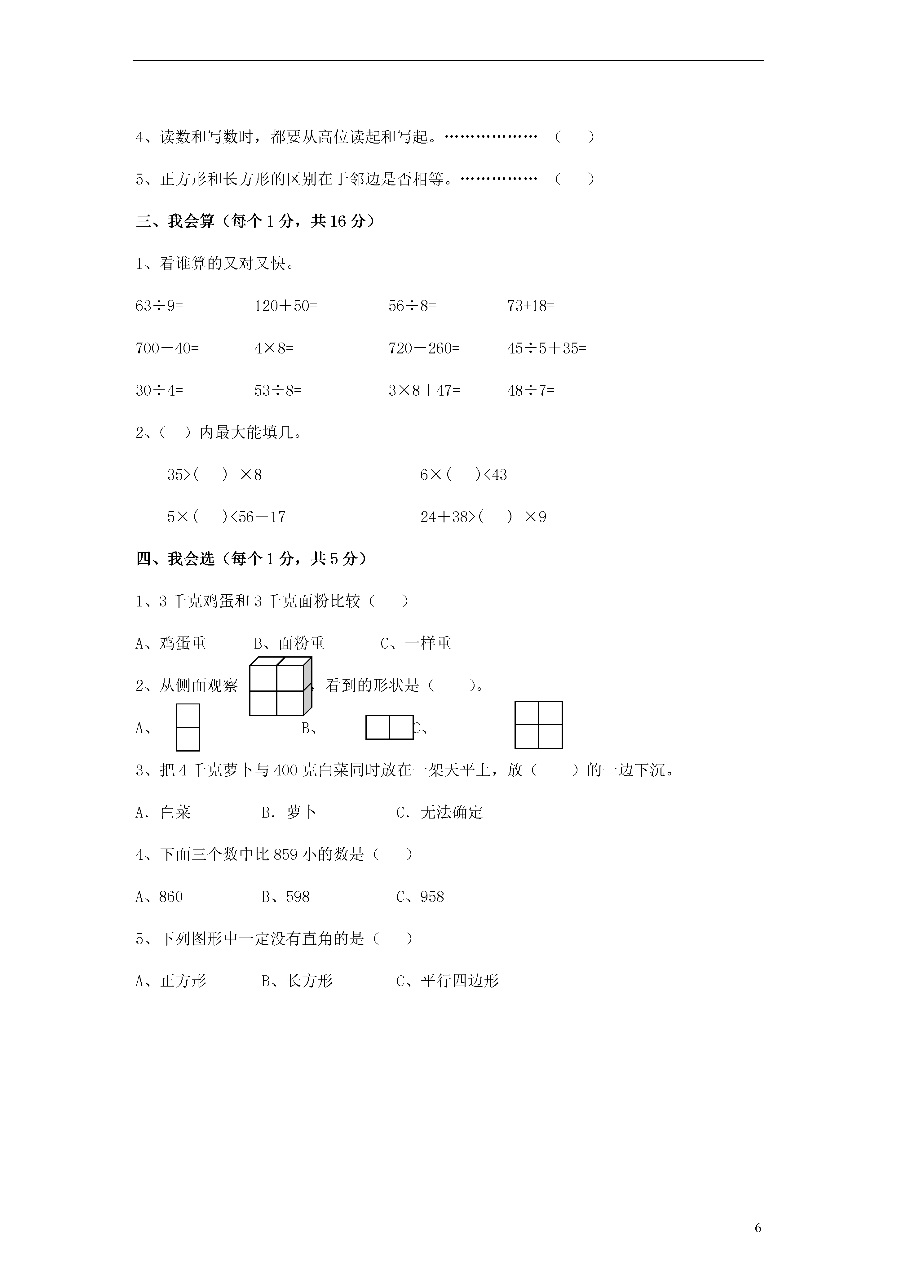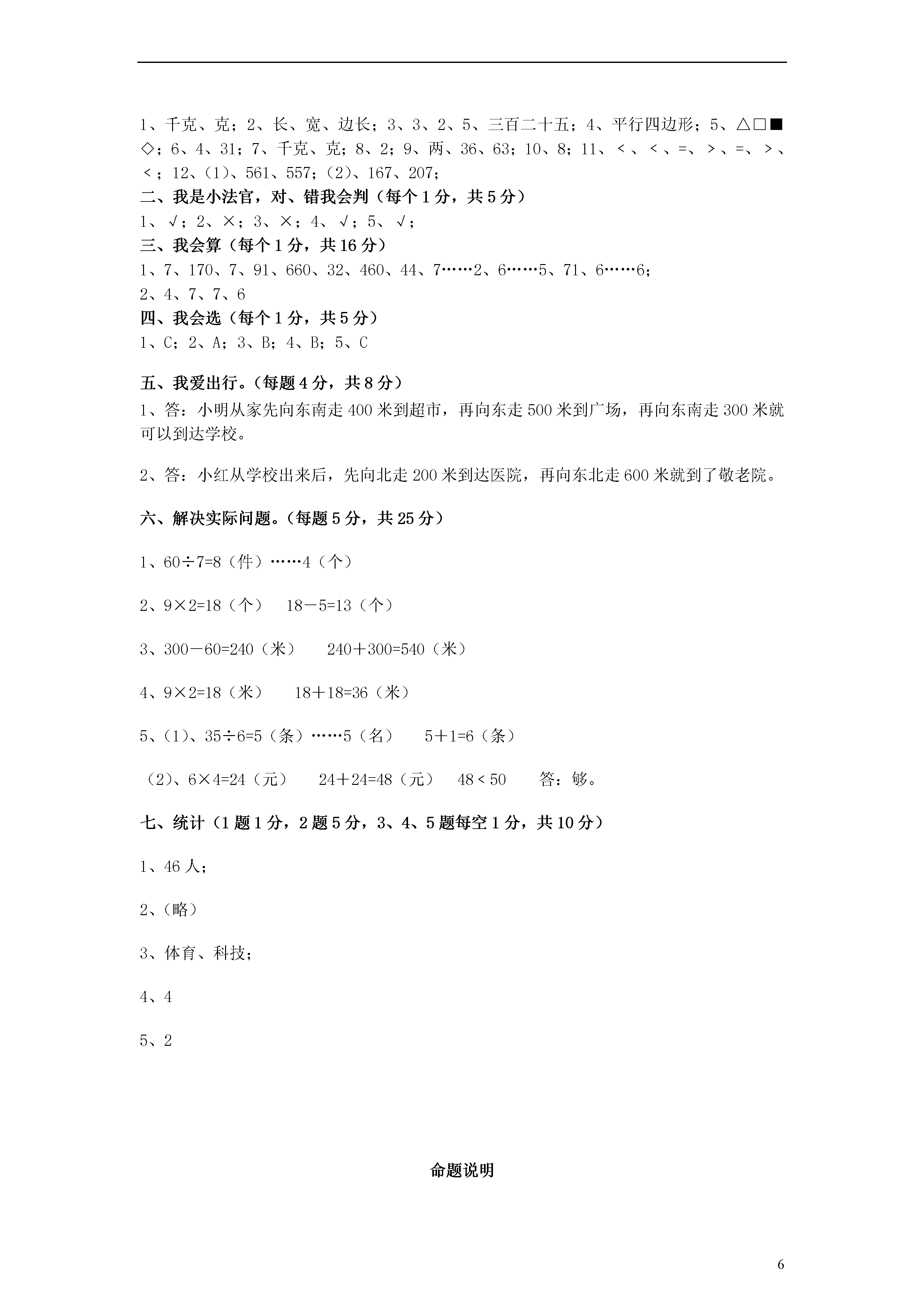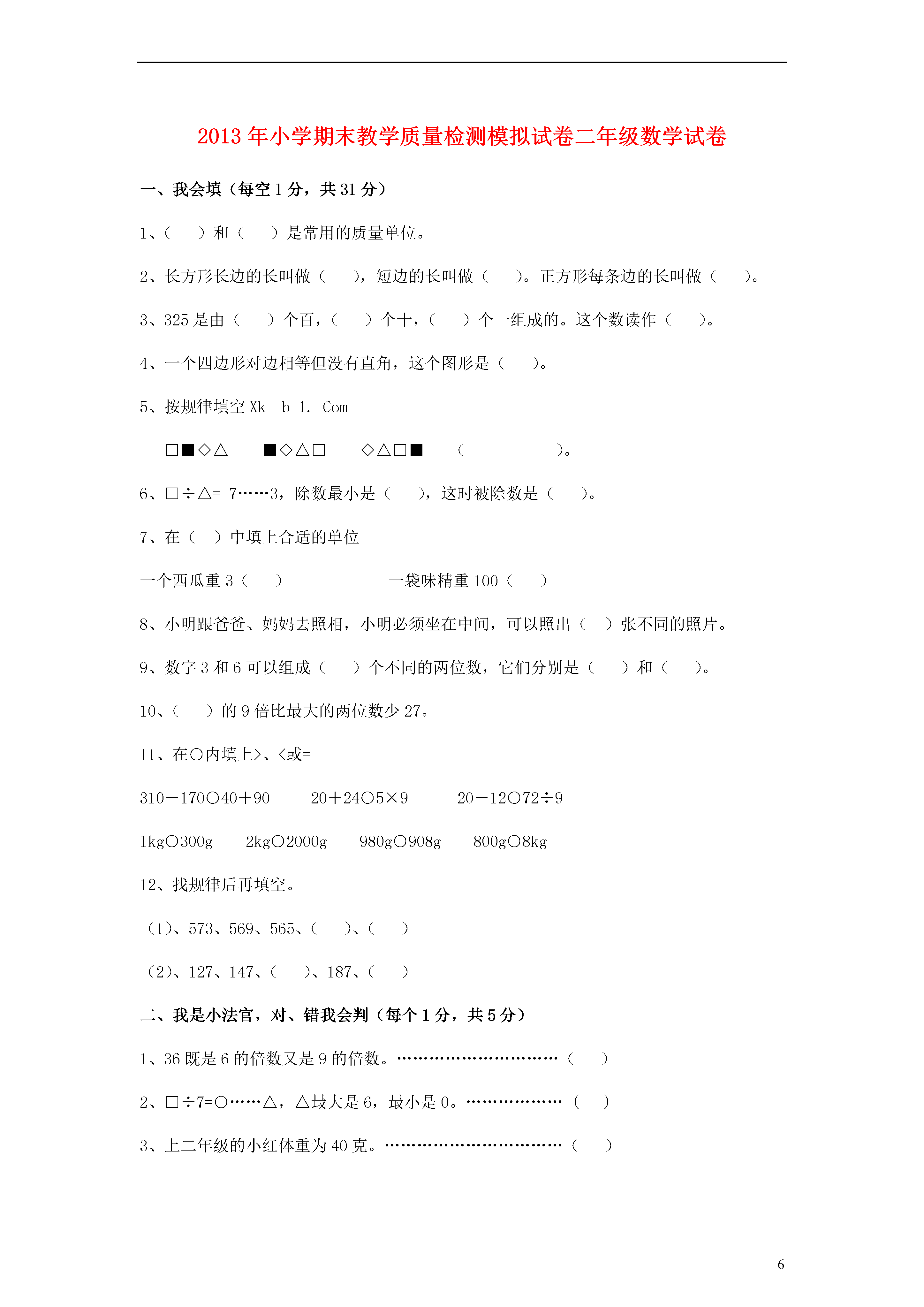 62013年小学期末教学质量检测模拟试卷二年级数学试卷一、我会填(每空1分,共31分)1、()和()是常用的质量单位。2、长方形长边的长叫做(),短边的长叫做()。正方形每条边的长叫做()。3、325是由()个百,()个十,()个一组成的。这个数读作()。4、一个四边形对边相等但没有直角,这个图形是()。5、按规律填空Xkb1.Com□■◇△■◇△□◇△□■()。6、□÷△=7……3,除数最小是(),这时被除数是()。7、在()中填上合适的单位一个西瓜重3()一袋味精重100()8、小明跟爸爸、妈妈去照相,小明必须坐在中间,可以照出()张不同的照片。9、数字3和6可以组成()个不同的两位数,它们分别是()和()。10、()的9倍比最大的两位数少27。11、在○内填上>、<或=310-170○40+9020+24○5×920-12○72÷91kg○300g2kg○2000g980g○908g800g○8kg12、找规律后再填空。(1)、573、569、565、()、()(2)、127、147、()、187、()二、我是小法官,对、错我会判(每个1分,共5分)1、36既是6的倍数又是9的倍数。…………………………()2、□÷7=○……△,△最大是6,最小是0。………………()3、上二年级的小红体重为40克。……………………………()4、读数和写数时,都要从高位读起和写起。………………()5、正方形和长方形的区别在于邻边是否相等。……………()三、我会算(每个1分,共16分)1、看谁算的又对又快。63÷9=120+50=56÷8=73+18=700-40=4×8=720-260=45÷5+35=30÷4=53÷8=3×8+47=48÷7=2、()内最大能填几。35>()×86×()<435×()<56-1724+38>()×9四、我会选(每个1分,共5分)1、3千克鸡蛋和3千克面粉比较()A、鸡蛋重B、面粉重C、一样重2、从侧面观察,看到的形状是()。A、B、C、3、把4千克萝卜与400克白菜同时放在一架天平上,放()的一边下沉。A.白菜B.萝卜C.无法确定4、下面三个数中比859小的数是()A、860B、598C、9585、下列图形中一定没有直角的是()A、正方形B、长方形C、平行四边形五、我爱出行。(每题4分,共8分)300米500米小明家超市小红家广场学校医院敬老院动物园北400米500米300米200米600米1、请说出小明从家去学校的方向和路线。(4分)2、放学后小红要去敬老院看望奶奶,请说出她的方向和路线。(4分)六、解决实际问题。(每题5分,共25分)1、每件衣服用7个扣子,有60个扣子,可以钉几件上衣?还剩几个扣子?2、小华和爸爸、妈妈掰玉米,小华掰了9个,爸爸掰的是小华的2倍,妈妈比爸爸少掰了5个。妈妈掰了多少个?3、织布厂上半月织布300米,下半月比上半月少织布60米,这个月共织布多少米?4、一根铁丝用去一半后,再用去剩下的一半,这时剩下9米,原来这根铁丝多长?5、(1)35名同学去划船,每条船最多坐6人,至少要租几条船?(2)如果每条船每小时租金4元,计划玩2小时,50元够吗?七、统计(1题1分,2题5分,3、4、5题每空1分,共10分)联西小学二(1)班对全班同学参加课外小组的人数进行了统计,结果如下二(1)班同学参加课外小组情况统计表项目科技组文艺组体育组书法组美术组合计人数61014791、请算出合计,填在统计表中。2、完成下面的统计图。15二(1)班同学参加课外小组情况统计图14131211109876534210美术组书法组体育组文艺组科技组3、参加()组的人数最多,参加()组的人数最少。4、参加体育小组的人数比文艺小组的人数多()人。5、参加体育小组的人数是参加书法组人数的()倍。试题答案一、我会填(每空1分,共31分)1、千克、克;2、长、宽、边长;3、3、2、5、三百二十五;4、平行四边形;5、△□■◇;6、4、31;7、千克、克;8、2;9、两、36、63;10、8;11、﹤、﹤、=、﹥、=、﹥、﹤;12、(1)、561、557;(2)、167、207;二、我是小法官,对、错我会判(每个1分,共5分)1、√;2、×;3、×;4、√;5、√;三、我会算(每个1分,共16分)1、7、170、7、91、660、32、460、44、7……2、6……5、71、6……6;2、4、7、7、6四、我会选(每个1分,共5分)1、C;2、A