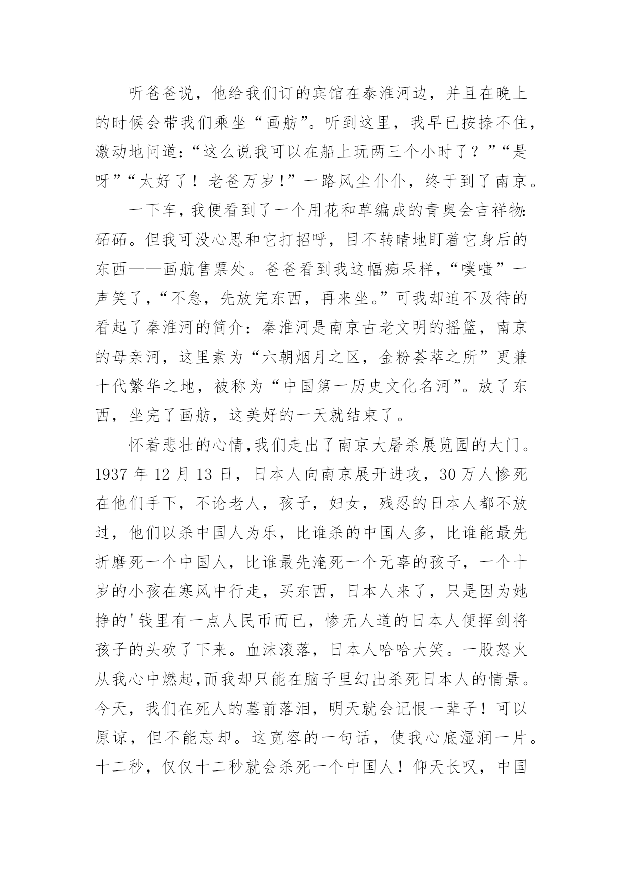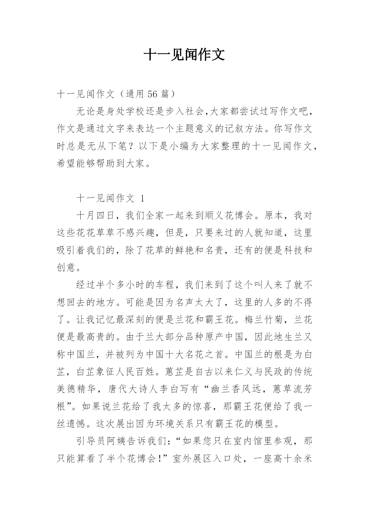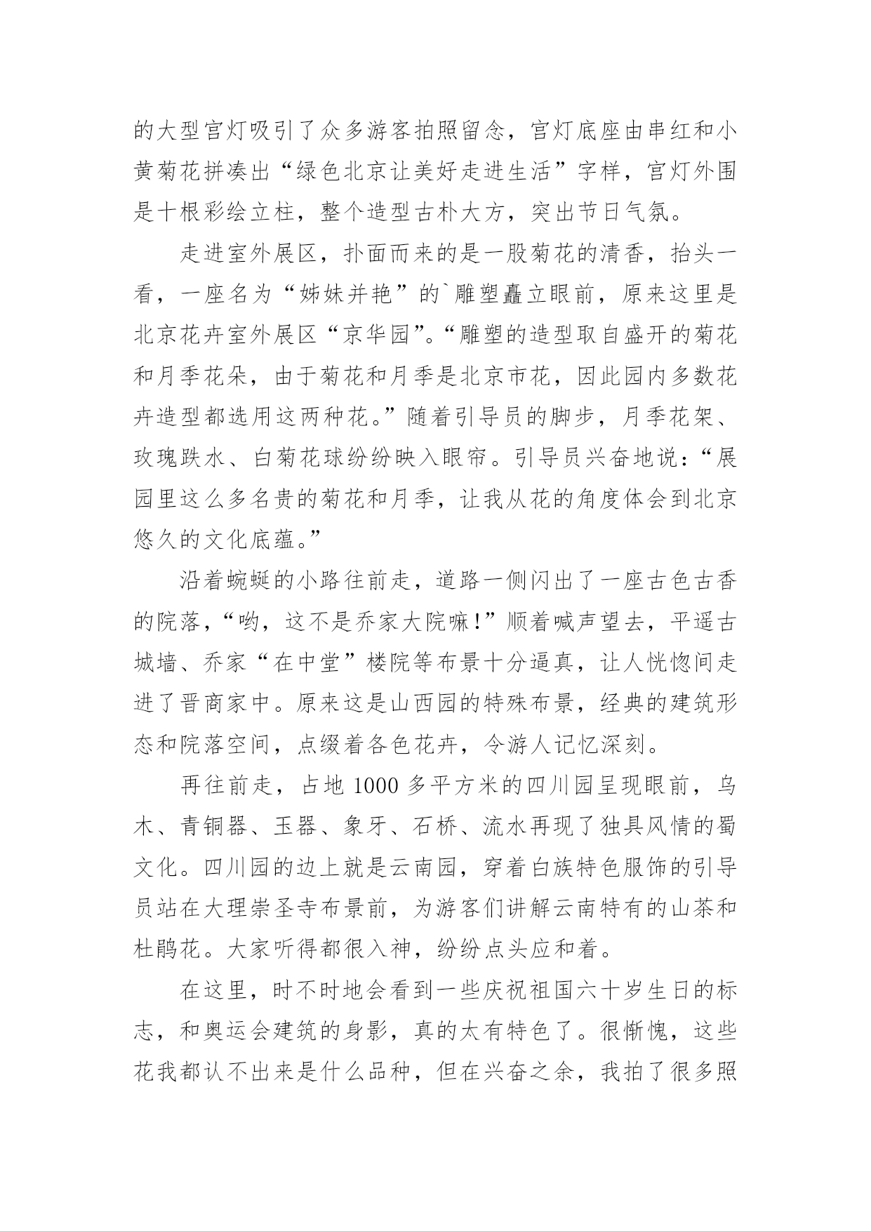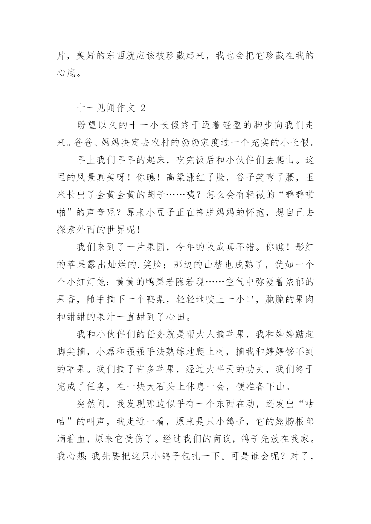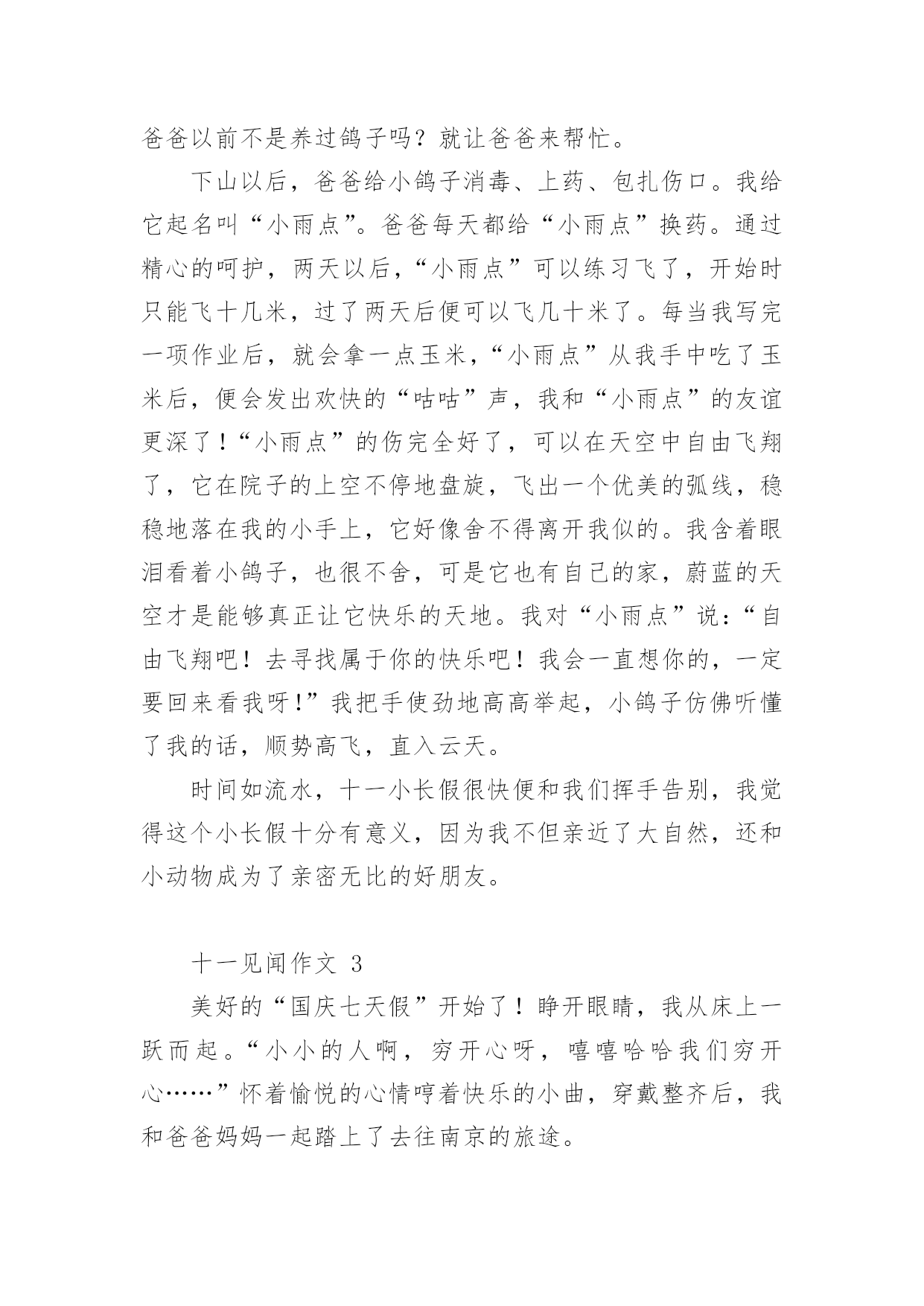 十一见闻作文 十一见闻作文(通用56篇)无论是身处学校还是步入社会,大家都尝试过写作文吧,作文是通过文字来表达一个主题意义的记叙方法。你写作文时总是无从下笔?以下是小编为大家整理的十一见闻作文,希望能够帮助到大家。十一见闻作文1十月四日,我们全家一起来到顺义花博会。原本,我对这些花花草草不感兴趣,但是,只要来过的人就知道,这里吸引着我们的,除了花草的鲜艳和名贵,还有的便是科技和创意。经过半个多小时的车程,我们来到了这个叫人来了就不想回去的地方。可能是因为名声太大了,这里的人多的不得了。让我记忆最深刻的便是兰花和霸王花。梅兰竹菊,兰花便是最高贵的。由于兰大部分品种原产中国,因此地生兰又称中国兰,并被列为中国十大名花之首。中国兰的根是为白芷,白芷象征人民百姓。蕙芷是自古以来仁义与民政的传统美德精华,唐代大诗人李白写有“幽兰香风远,蕙草流芳根”。如果说兰花给了我太多的惊喜,那霸王花便给了我一丝遗憾。这次展出因为环境关系只有霸王花的模型。引导员阿姨告诉我们:“如果您只在室内馆里参观,那只能算看了半个花博会!”室外展区入口处,一座高十余米的大型宫灯吸引了众多游客拍照留念,宫灯底座由串红和小黄菊花拼凑出“绿色北京让美好走进生活”字样,宫灯外围是十根彩绘立柱,整个造型古朴大方,突出节日气氛。走进室外展区,扑面而来的是一股菊花的清香,抬头一看,一座名为“姊妹并艳”的`雕塑矗立眼前,原来这里是北京花卉室外展区“京华园”。“雕塑的造型取自盛开的菊花和月季花朵,由于菊花和月季是北京市花,因此园内多数花卉造型都选用这两种花。”随着引导员的脚步,月季花架、玫瑰跌水、白菊花球纷纷映入眼帘。引导员兴奋地说:“展园里这么多名贵的菊花和月季,让我从花的角度体会到北京悠久的文化底蕴。”沿着蜿蜒的小路往前走,道路一侧闪出了一座古色古香的院落,“哟,这不是乔家大院嘛!”顺着喊声望去,平遥古城墙、乔家“在中堂”楼院等布景十分逼真,让人恍惚间走进了晋商家中。原来这是山西园的特殊布景,经典的建筑形态和院落空间,点缀着各色花卉,令游人记忆深刻。再往前走,占地1000多平方米的四川园呈现眼前,乌木、青铜器、玉器、象牙、石桥、流水再现了独具风情的蜀文化。四川园的边上就是云南园,穿着白族特色服饰的引导员站在大理崇圣寺布景前,为游客们讲解云南特有的山茶和杜鹃花。大家听得都很入神,纷纷点头应和着。在这里,时不时地会看到一些庆祝祖国六十岁生日的标志,和奥运会建筑的身影,真的太有特色了。很惭愧,这些花我都认不出来是什么品种,但在兴奋之余,我拍了很多照片,美好的东西就应该被珍藏起来,我也会把它珍藏在我的心底。十一见闻作文2盼望以久的十一小长假终于迈着轻盈的脚步向我们走来。爸爸、妈妈决定去农村的奶奶家度过一个充实的小长假。早上我们早早的起床,吃完饭后和小伙伴们去爬山。这里的风景真美呀!你瞧!高粱涨红了脸,谷子笑弯了腰,玉米长出了金黄金黄的胡子……咦?怎么会有轻微的“噼噼啪啪”的声音呢?原来小豆子正在挣脱妈妈的怀抱,想自己去探索外面的世界呢!我们来到了一片果园,今年的收成真不错。你瞧!彤红的苹果露出灿烂的.笑脸;那边的山楂也成熟了,犹如一个个小红灯笼;黄黄的鸭梨若隐若现……空气中弥漫着浓郁的果香,随手摘下一个鸭梨,轻轻地咬上一小口,脆脆的果肉和甜甜的果汁一直甜到了心田。我和小伙伴们的任务就是帮大人摘苹果,我和婷婷踮起脚尖摘,小磊和强强手法熟练地爬上树,摘我和婷婷够不到的苹果。我们摘了许多苹果,经过大半天的功夫,我们终于完成了任务,在一块大石头上休息一会,便准备下山。突然间,我发现那边似乎有一个东西在动,还发出“咕咕”的叫声,我走近一看,原来是只小鸽子,它的翅膀根部滴着血,原来它受伤了。经过我们的商议,鸽子先放在我家。我心想:我先要把这只小鸽子包扎一下。可是谁会呢?对了,爸爸以前不是养过鸽子吗?就让爸爸来帮忙。下山以后,爸爸给小鸽子消毒、上药、包扎伤口。我给它起名叫“小雨点”。爸爸每天都给“小雨点”换药。通过精心的呵护,两天以后,“小雨点”可以练习飞了,开始时只能飞十几米,过了两天后便可以飞几十米了。每当我写完一项作业后,就会拿一点玉米,“小雨点”从我手中吃了玉米后,便会发出欢快的“咕咕”声,我和“小雨点”的友谊更深了!“小雨点”的伤完全好了,可以在天空中自由飞翔了,它在院子的上空不停地盘旋,飞出一个优美的弧线,稳稳地落在我的小手上,它好像舍不得离开我似的。我含着眼泪看着小鸽子,也很不舍,可是它也有自己的家,蔚蓝的天空才是能够真正让它快乐的天地。我对“小雨点”说:“自由飞翔吧!去寻找属于你的快乐吧!我会一直想你的,一定要回来看我呀!”我把手使劲地高高举起,小鸽子仿佛听懂了我的话,顺势高飞,直入云天。时间如流水,十一小长假很快便和我们挥手告别,我觉得这个小长假十分有意义,因为我不但亲近了大自然,