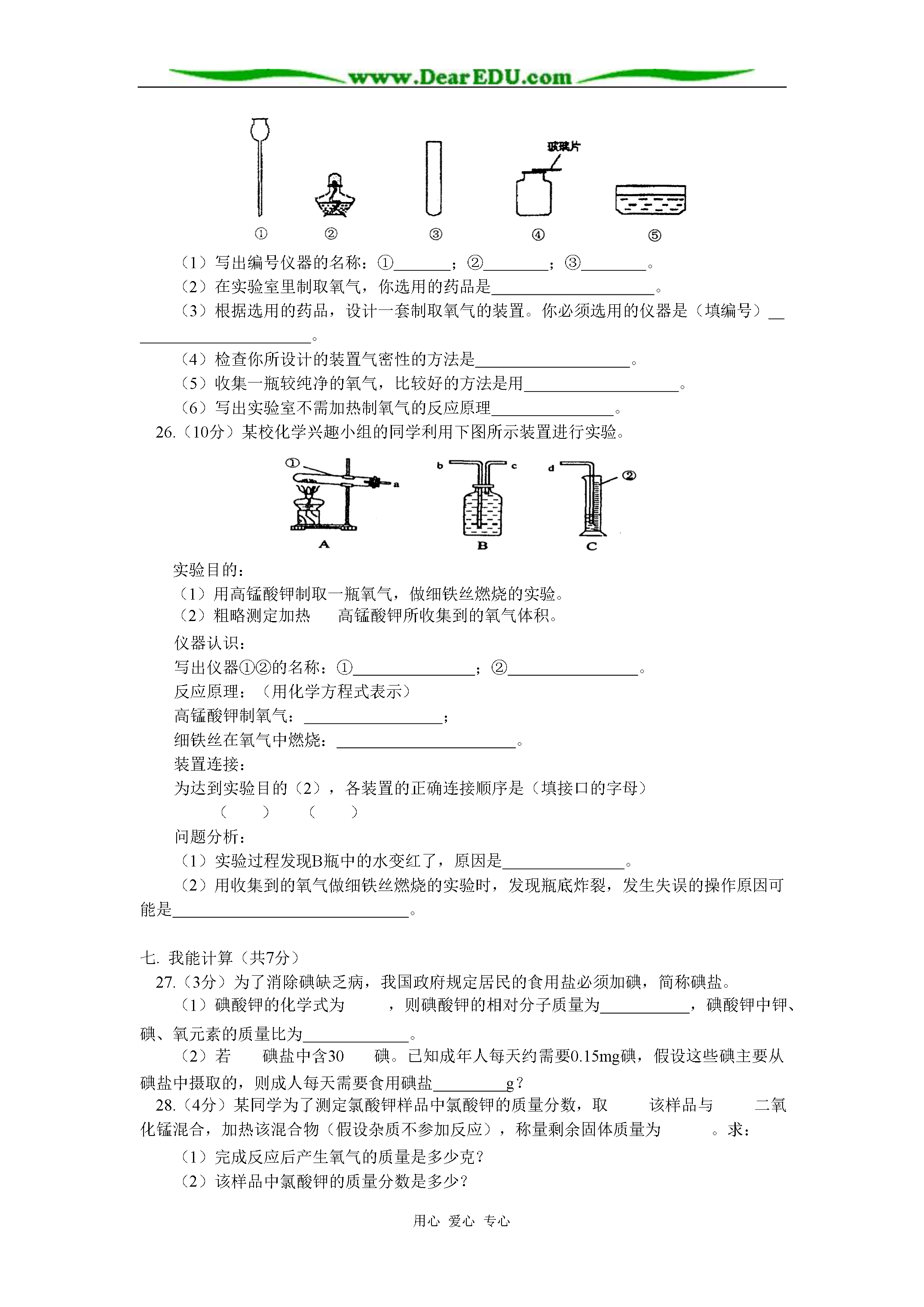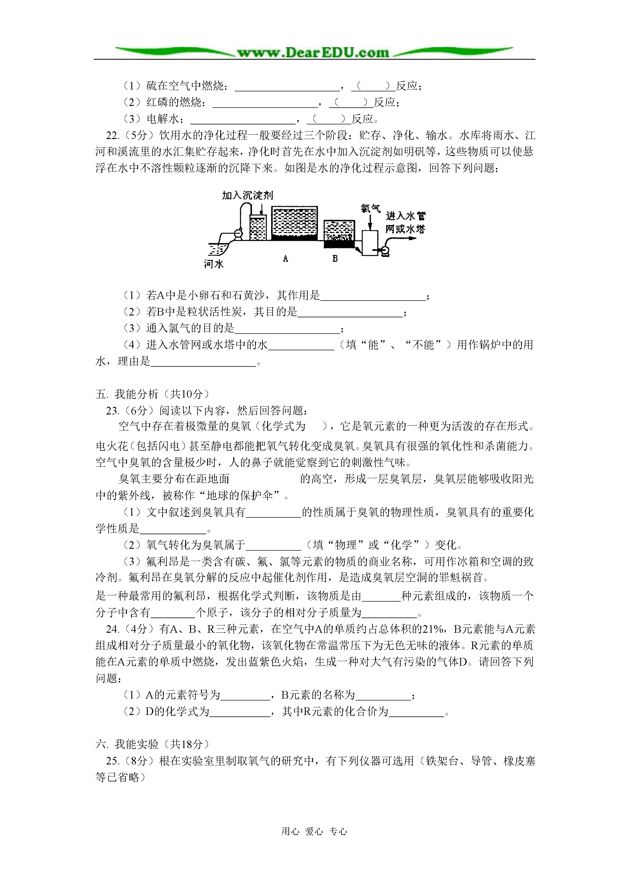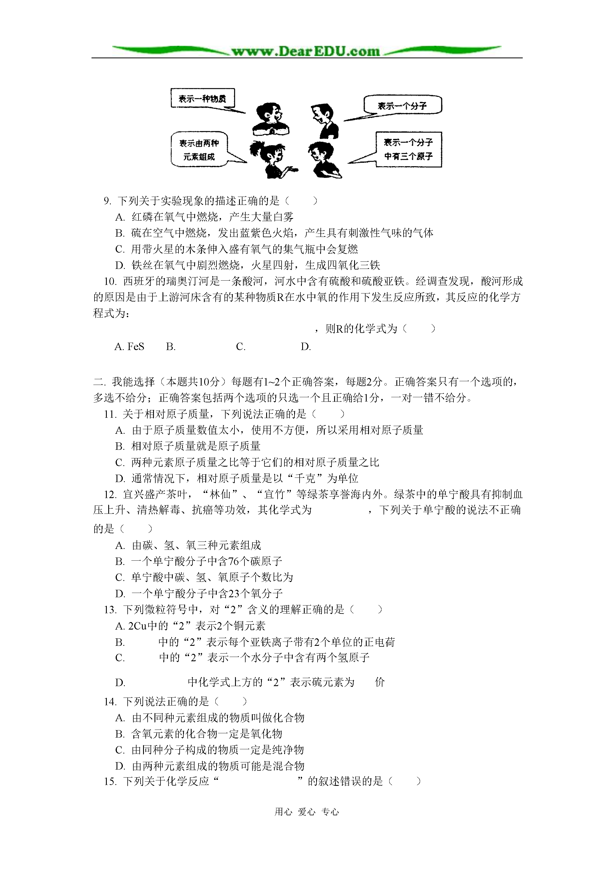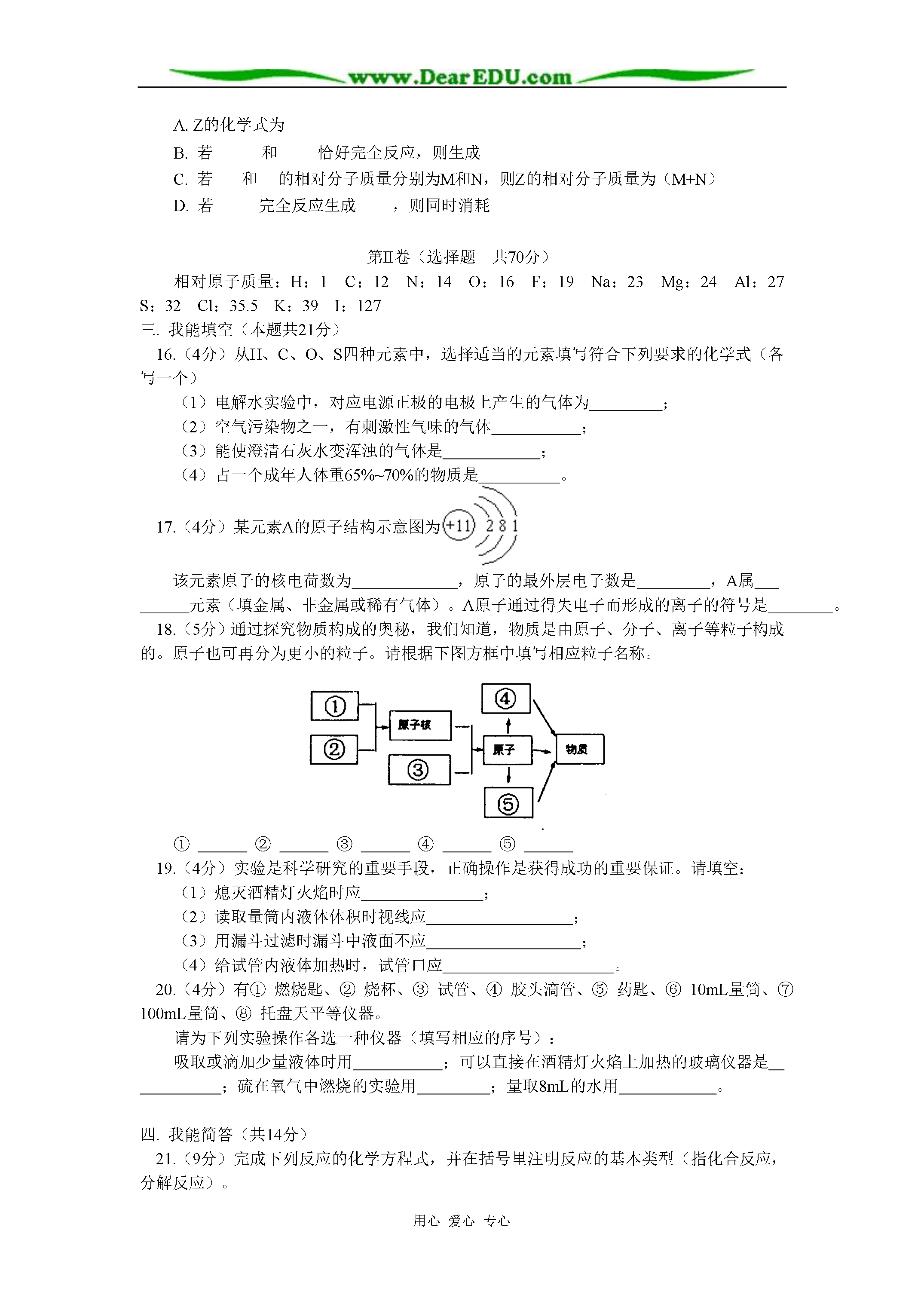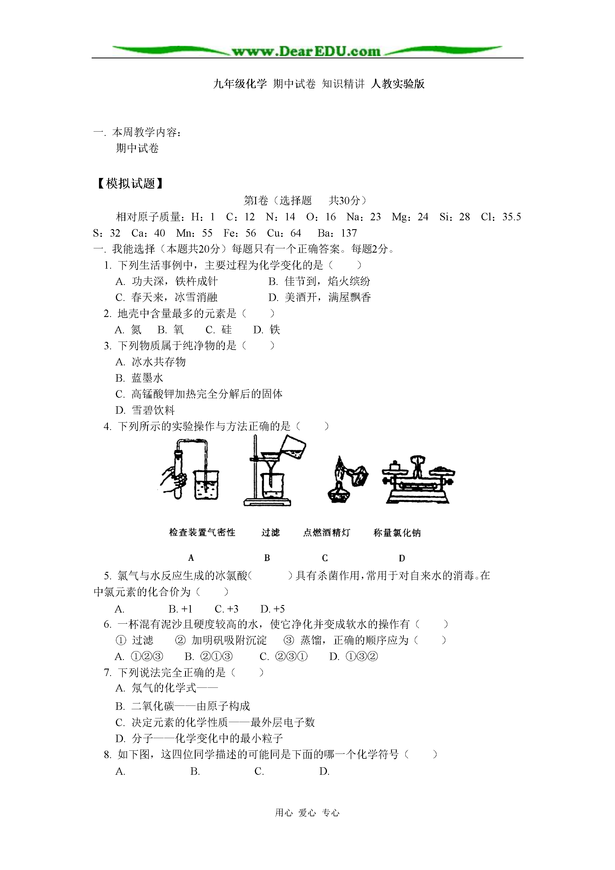 用心爱心专心九年级化学期中试卷知识精讲人教实验版一.本周教学内容:期中试卷【模拟试题】第I卷(选择题共30分)相对原子质量:H:1C:12N:14O:16Na:23Mg:24Si:28Cl:35.5S:32Ca:40Mn:55Fe:56Cu:64Ba:137一.我能选择(本题共20分)每题只有一个正确答案。每题2分。1.下列生活事例中,主要过程为化学变化的是()A.功夫深,铁杵成针B.佳节到,焰火缤纷C.春天来,冰雪消融D.美酒开,满屋飘香2.地壳中含量最多的元素是()A.氮B.氧C.硅D.铁3.下列物质属于纯净物的是()A.冰水共存物B.蓝墨水C.高锰酸钾加热完全分解后的固体D.雪碧饮料4.下列所示的实验操作与方法正确的是()5.氯气与水反应生成的冰氯酸()具有杀菌作用,常用于对自来水的消毒。在中氯元素的化合价为()A.B.+1C.+3D.+56.一杯混有泥沙且硬度较高的水,使它净化并变成软水的操作有()①过滤②加明矾吸附沉淀③蒸馏,正确的顺序应为()A.①②③B.②①③C.②③①D.①③②7.下列说法完全正确的是()A.氖气的化学式——B.二氧化碳——由原子构成C.决定元素的化学性质——最外层电子数D.分子——化学变化中的最小粒子8.如下图,这四位同学描述的可能同是下面的哪一个化学符号()A.B.C.D.9.下列关于实验现象的描述正确的是()A.红磷在氧气中燃烧,产生大量白雾B.硫在空气中燃烧,发出蓝紫色火焰,产生具有刺激性气味的气体C.用带火星的木条伸入盛有氧气的集气瓶中会复燃D.铁丝在氧气中剧烈燃烧,火星四射,生成四氧化三铁10.西班牙的瑞奥汀河是一条酸河,河水中含有硫酸和硫酸亚铁。经调查发现,酸河形成的原因是由于上游河床含有的某种物质R在水中氧的作用下发生反应所致,其反应的化学方程式为:,则R的化学式为()A.FeSB.C.D.二.我能选择(本题共10分)每题有1~2个正确答案,每题2分。正确答案只有一个选项的,多选不给分;正确答案包括两个选项的只选一个且正确给1分,一对一错不给分。11.关于相对原子质量,下列说法正确的是()A.由于原子质量数值太小,使用不方便,所以采用相对原子质量B.相对原子质量就是原子质量C.两种元素原子质量之比等于它们的相对原子质量之比D.通常情况下,相对原子质量是以“千克”为单位12.宜兴盛产茶叶,“林仙”、“宜竹”等绿茶享誉海内外。绿茶中的单宁酸具有抑制血压上升、清热解毒、抗癌等功效,其化学式为,下列关于单宁酸的说法不正确的是()A.由碳、氢、氧三种元素组成B.一个单宁酸分子中含76个碳原子C.单宁酸中碳、氢、氧原子个数比为D.一个单宁酸分子中含23个氧分子13.下列微粒符号中,对“2”含义的理解正确的是()A.2Cu中的“2”表示2个铜元素B.中的“2”表示每个亚铁离子带有2个单位的正电荷C.中的“2”表示一个水分子中含有两个氢原子D.中化学式上方的“2”表示硫元素为价14.下列说法正确的是()A.由不同种元素组成的物质叫做化合物B.含氧元素的化合物一定是氧化物C.由同种分子构成的物质一定是纯净物D.由两种元素组成的物质可能是混合物15.下列关于化学反应“”的叙述错误的是()A.Z的化学式为B.若和恰好完全反应,则生成C.若和的相对分子质量分别为M和N,则Z的相对分子质量为(M+N)D.若完全反应生成,则同时消耗第II卷(选择题共70分)相对原子质量:H:1C:12N:14O:16F:19Na:23Mg:24Al:27S:32Cl:35.5K:39I:127三.我能填空(本题共21分)16.(4分)从H、C、O、S四种元素中,选择适当的元素填写符合下列要求的化学式(各写一个)(1)电解水实验中,对应电源正极的电极上产生的气体为;(2)空气污染物之一,有刺激性气味的气体;(3)能使澄清石灰水变浑浊的气体是;(4)占一个成年人体重65%~70%的物质是。17.(4分)某元素A的原子结构示意图为该元素原子的核电荷数为,原子的最外层电子数是,A属元素(填金属、非金属或稀有气体)。A原子通过得失电子而形成的离子的符号是。18.(5分)通过探究物质构成的奥秘,我们知道,物质是由原子、分子、离子等粒子构成的。原子也可再分为更小的粒子。请根据下图方框中填写相应粒子名称。①②③④⑤19.(4分)实验是科学研究的重要手段,正确操作是获得成功的重要保证。请填空:(1)熄灭酒精灯火焰时应;(2)读取量筒内液体体积时视线应;(3)用漏斗过滤时漏斗中液面不应;(4)给试管内液体加热时,试管口应。20.(4分)有①燃烧匙、②烧杯、③试管、④胶头滴管、⑤药匙、⑥10mL量筒、⑦100mL量筒、⑧托盘天平等仪器。请为下列实验操作各选一种仪器(填写相应的序号):吸取或滴加少量液体时用;可以直接在酒精灯火焰上加热的玻璃仪器是