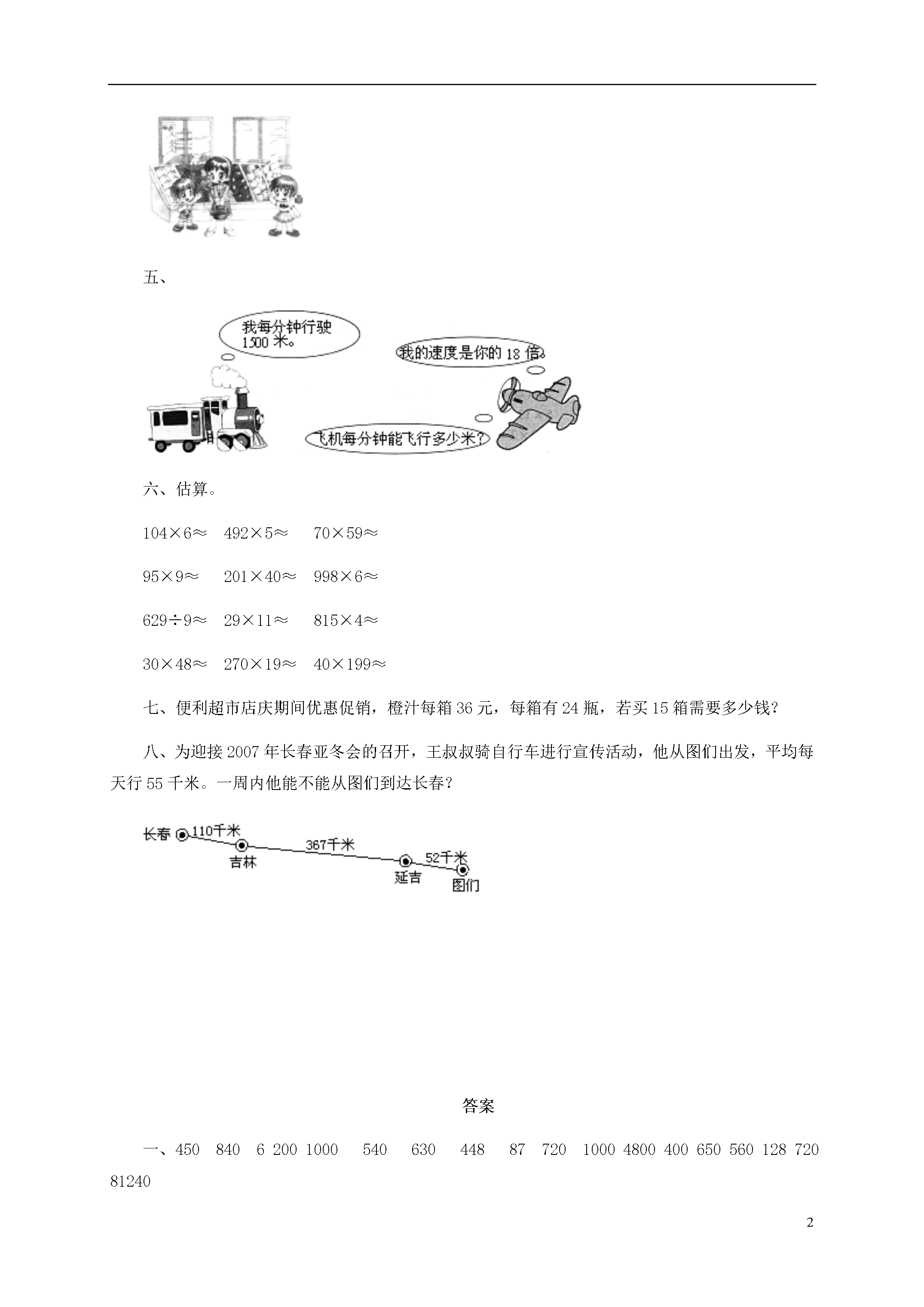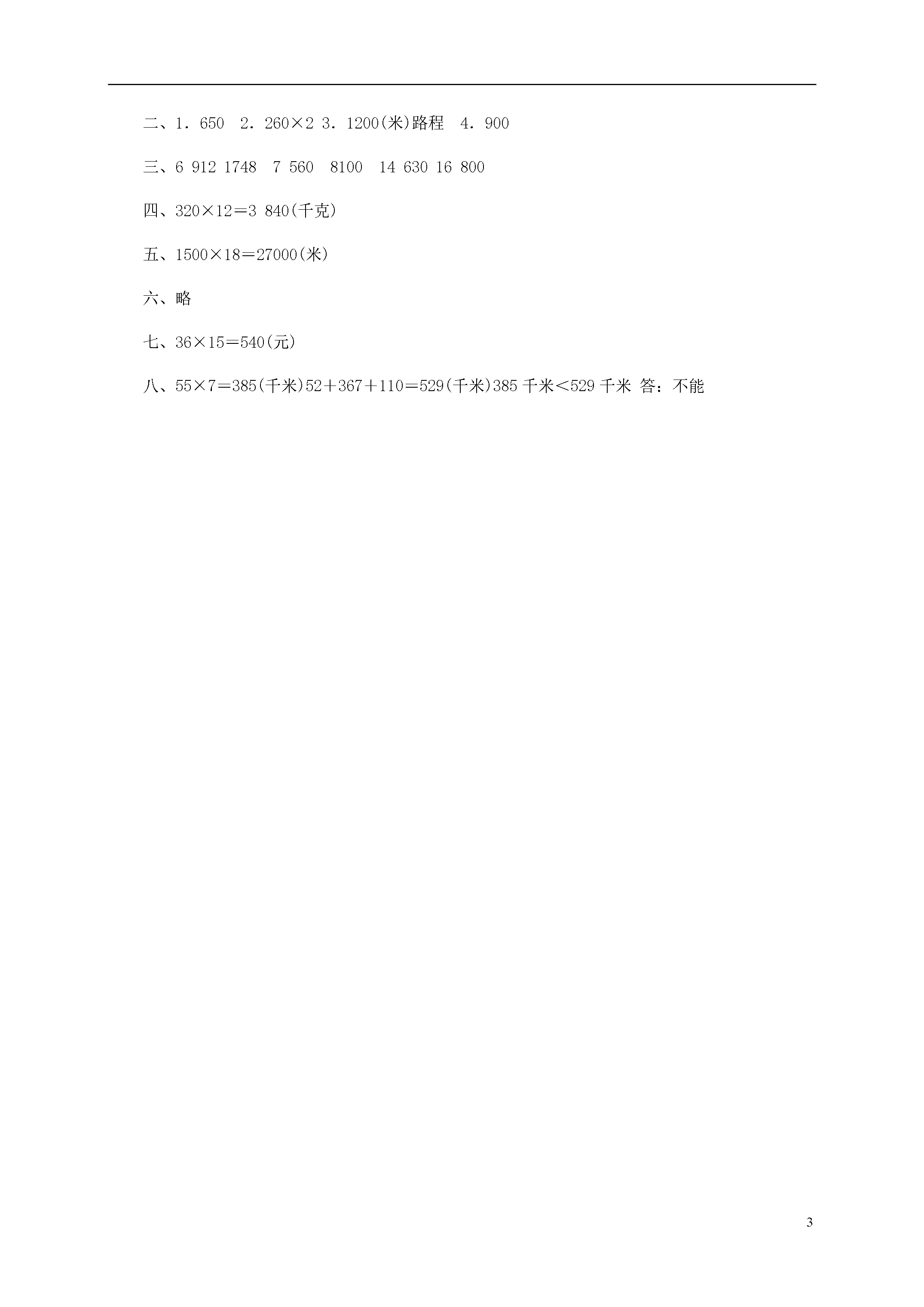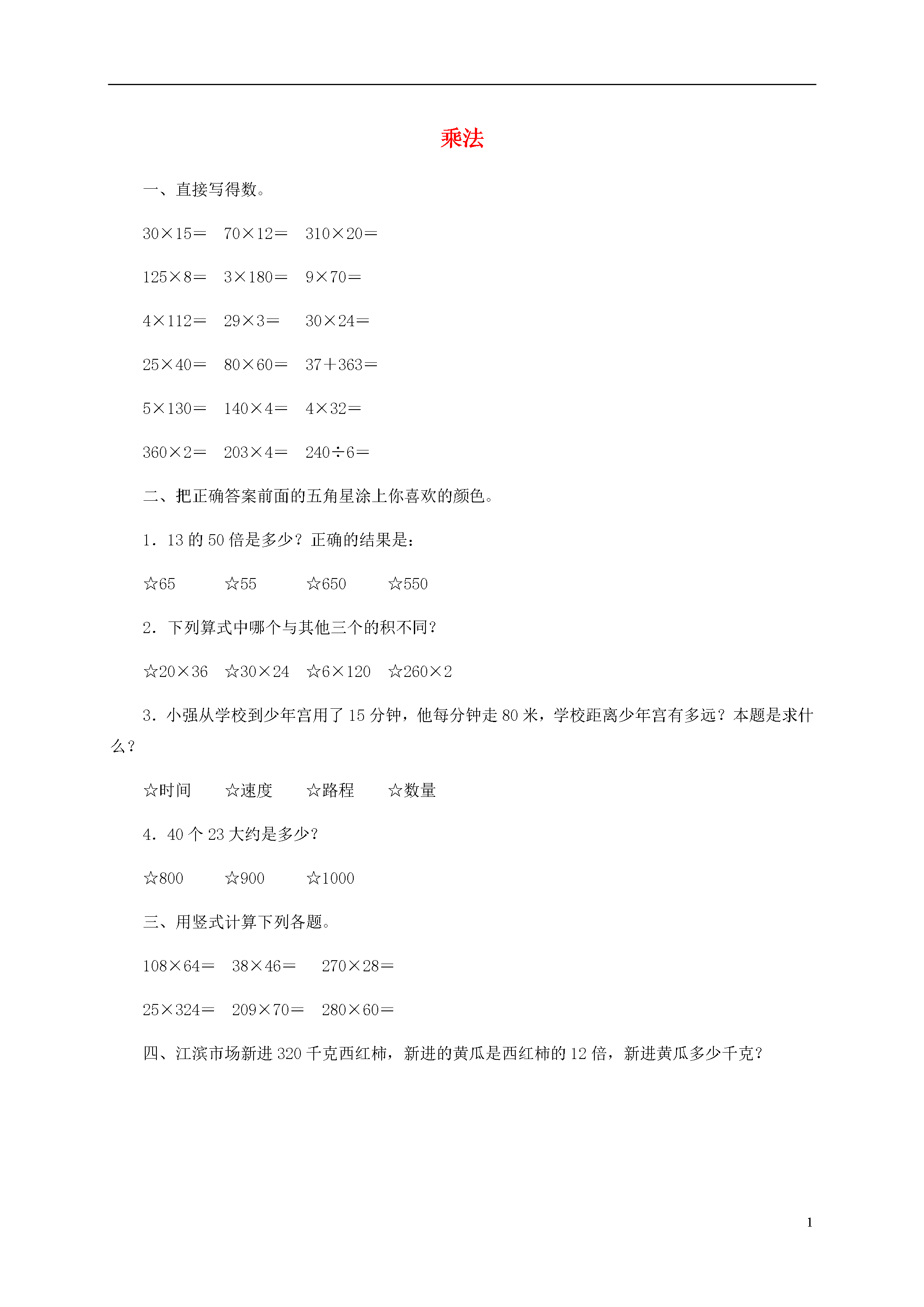 3乘法一、直接写得数。30×15=70×12=310×20=125×8=3×180=9×70=4×112=29×3=30×24=25×40=80×60=37+363=5×130=140×4=4×32=360×2=203×4=240÷6=二、把正确答案前面的五角星涂上你喜欢的颜色。1.13的50倍是多少?正确的结果是:☆65☆55☆650☆5502.下列算式中哪个与其他三个的积不同?☆20×36☆30×24☆6×120☆260×23.小强从学校到少年宫用了15分钟,他每分钟走80米,学校距离少年宫有多远?本题是求什么?☆时间☆速度☆路程☆数量4.40个23大约是多少?☆800☆900☆1000三、用竖式计算下列各题。108×64=38×46=270×28=25×324=209×70=280×60=四、江滨市场新进320千克西红柿,新进的黄瓜是西红柿的12倍,新进黄瓜多少千克?五、六、估算。104×6≈492×5≈70×59≈95×9≈201×40≈998×6≈629÷9≈29×11≈815×4≈30×48≈270×19≈40×199≈七、便利超市店庆期间优惠促销,橙汁每箱36元,每箱有24瓶,若买15箱需要多少钱?八、为迎接2007年长春亚冬会的召开,王叔叔骑自行车进行宣传活动,他从图们出发,平均每天行55千米。一周内他能不能从图们到达长春?答案一、45084062001000540630448877201000480040065056012872081240二、1.6502.260×23.1200(米)路程4.900三、69121748756081001463016800四、320×12=3840(千克)五、1500×18=27000(米)六、略七、36×15=540(元)八、55×7=385(千米)52+367+110=529(千米)385千米<529千米答:不能