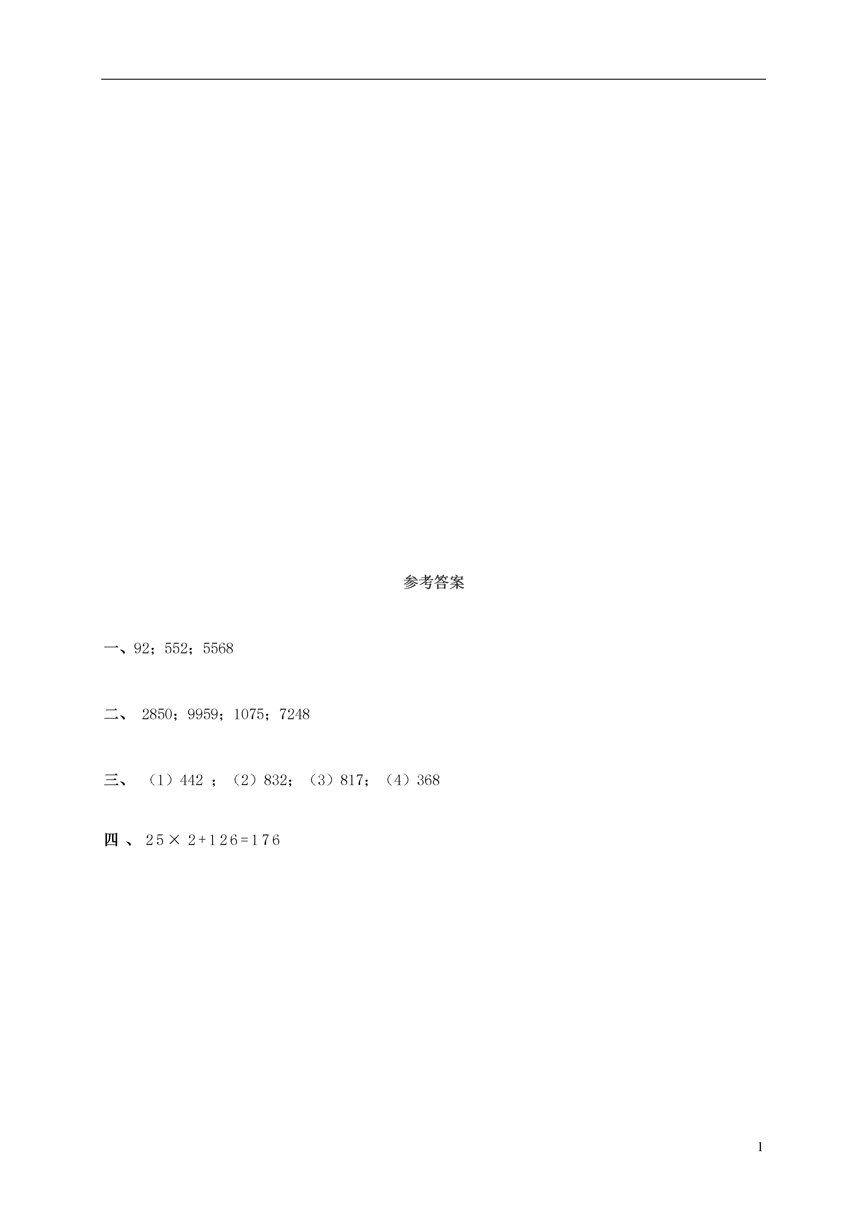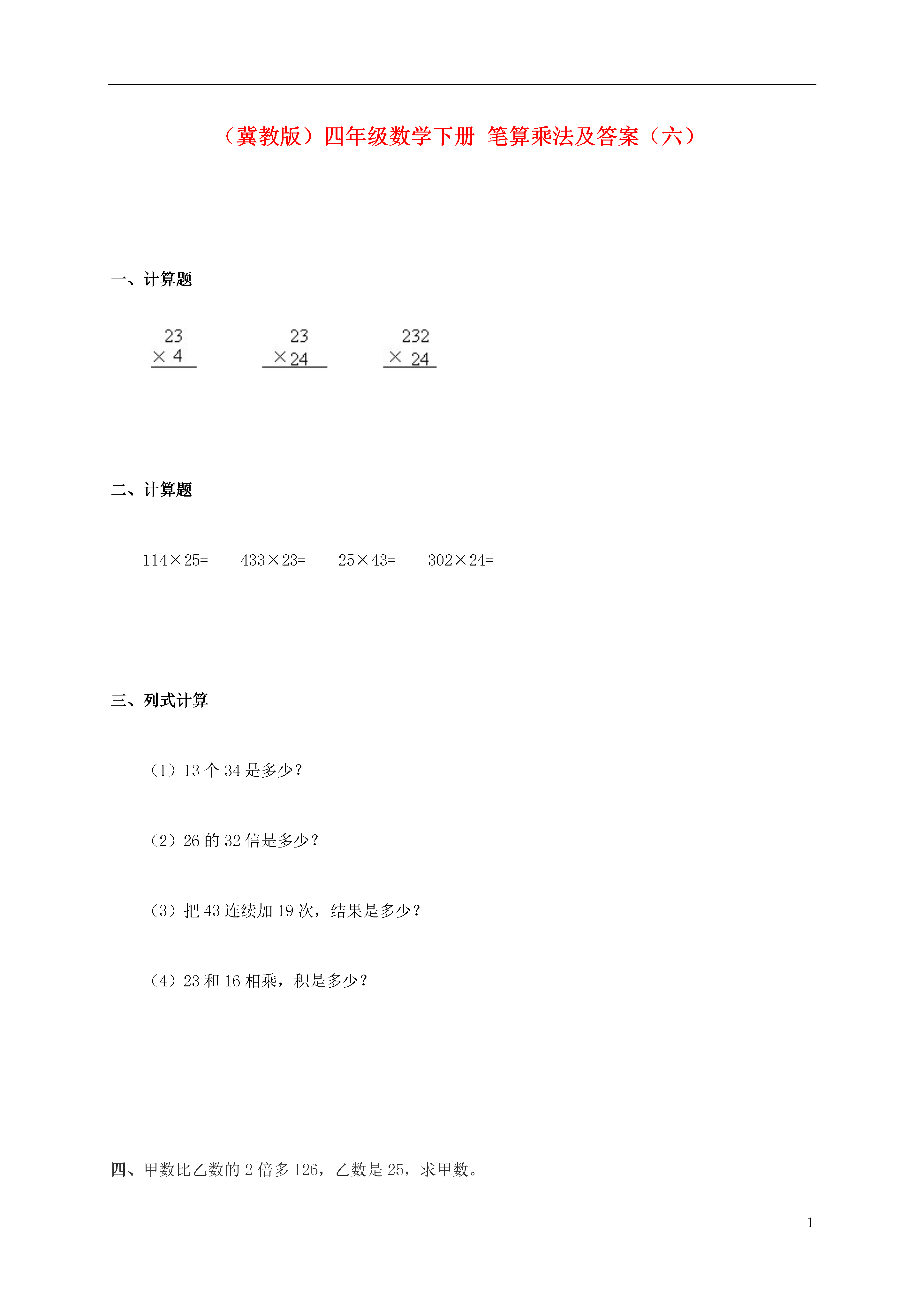 1(冀教版)四年级数学下册笔算乘法及答案(六)一、计算题二、计算题114×25=433×23=25×43=302×24=三、列式计算(1)13个34是多少?(2)26的32信是多少?(3)把43连续加19次,结果是多少?(4)23和16相乘,积是多少?四、甲数比乙数的2倍多126,乙数是25,求甲数。参考答案一、92;552;5568二、2850;9959;1075;7248三、(1)442;(2)832;(3)817;(4)368四、25×2+126=176