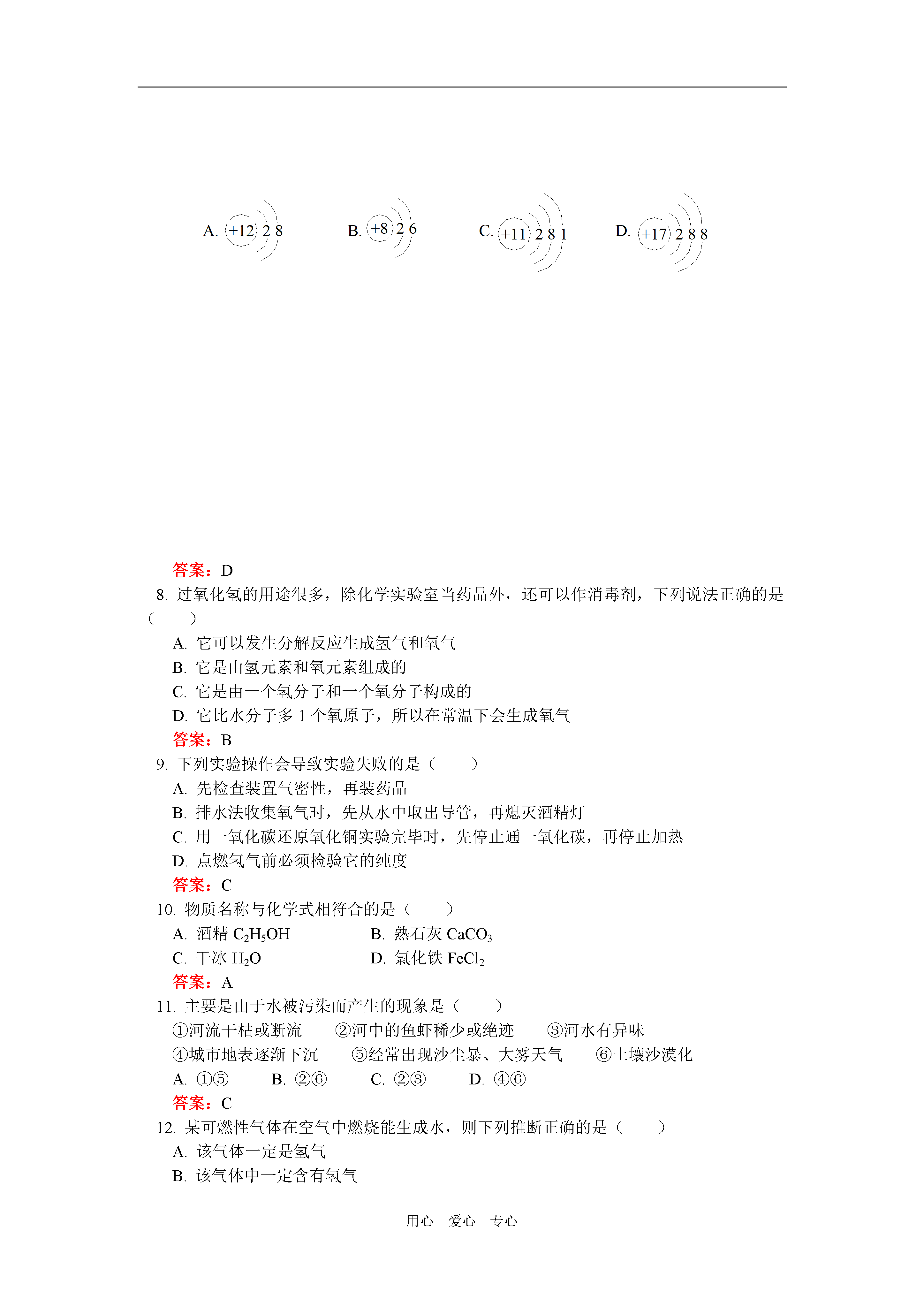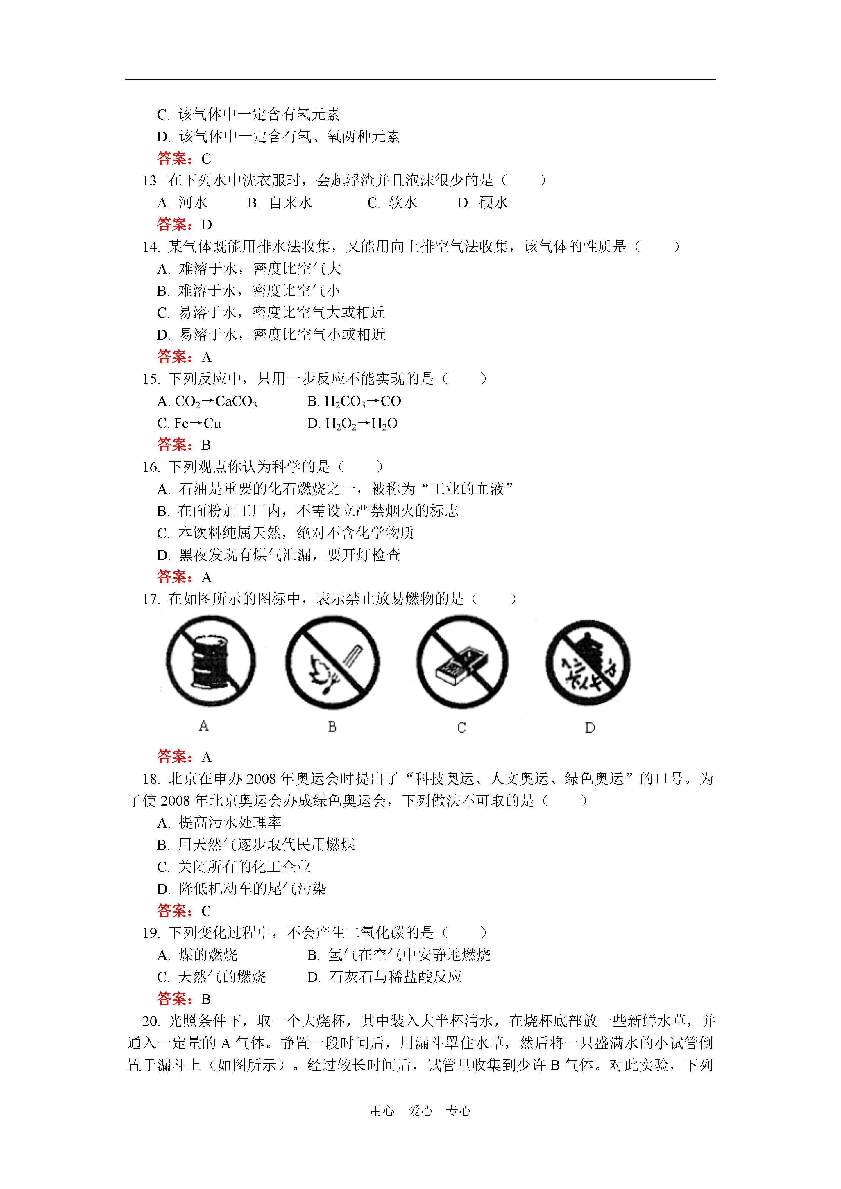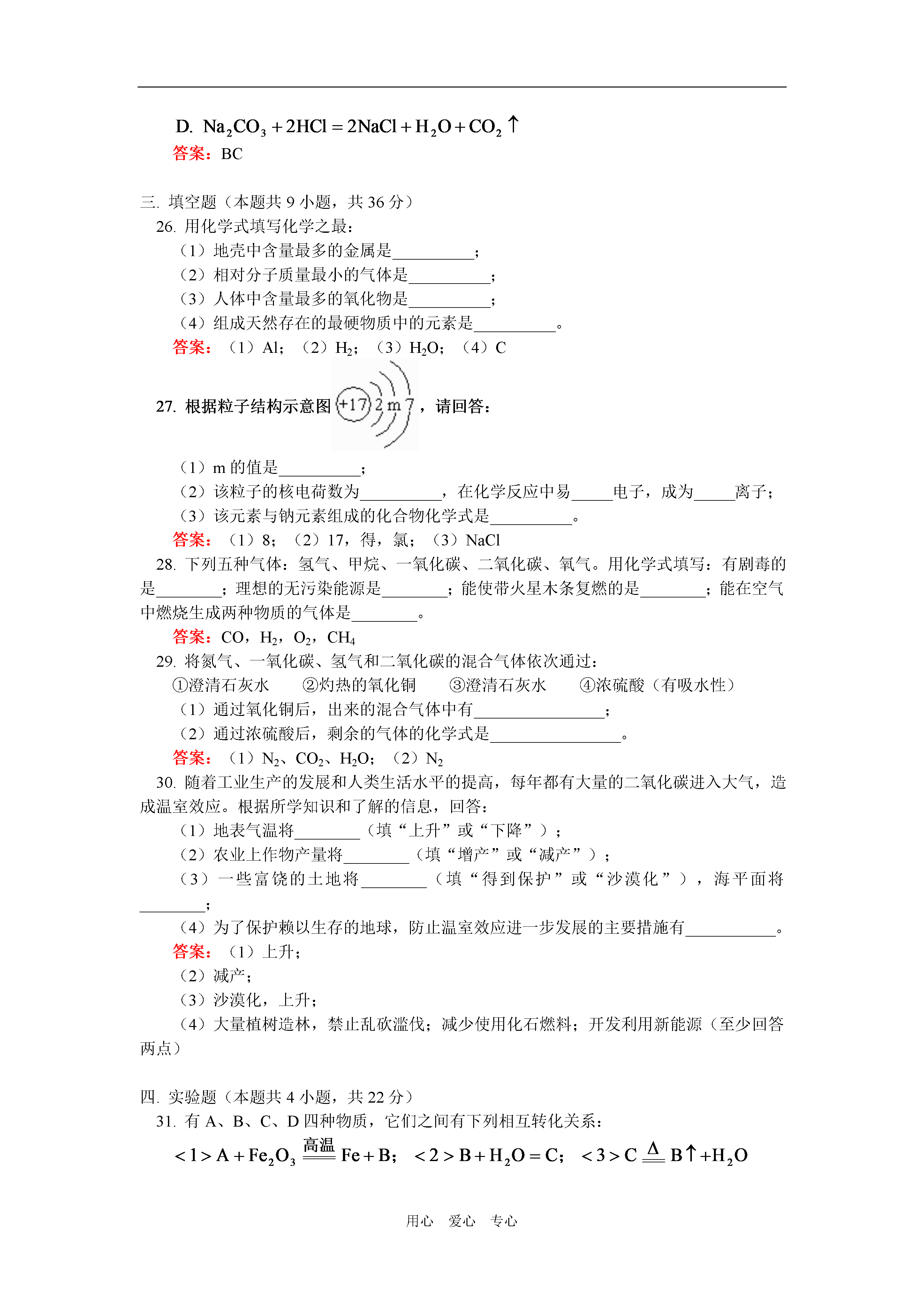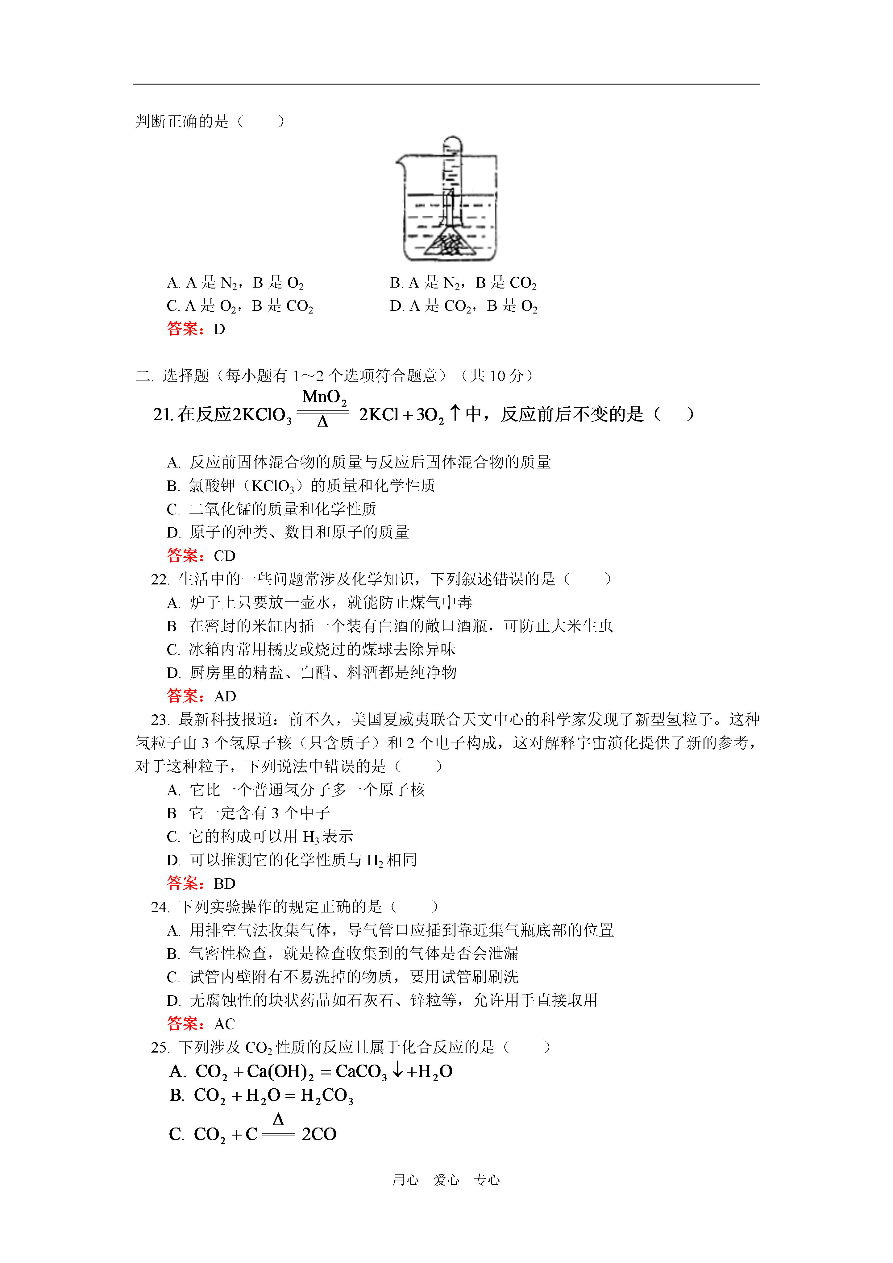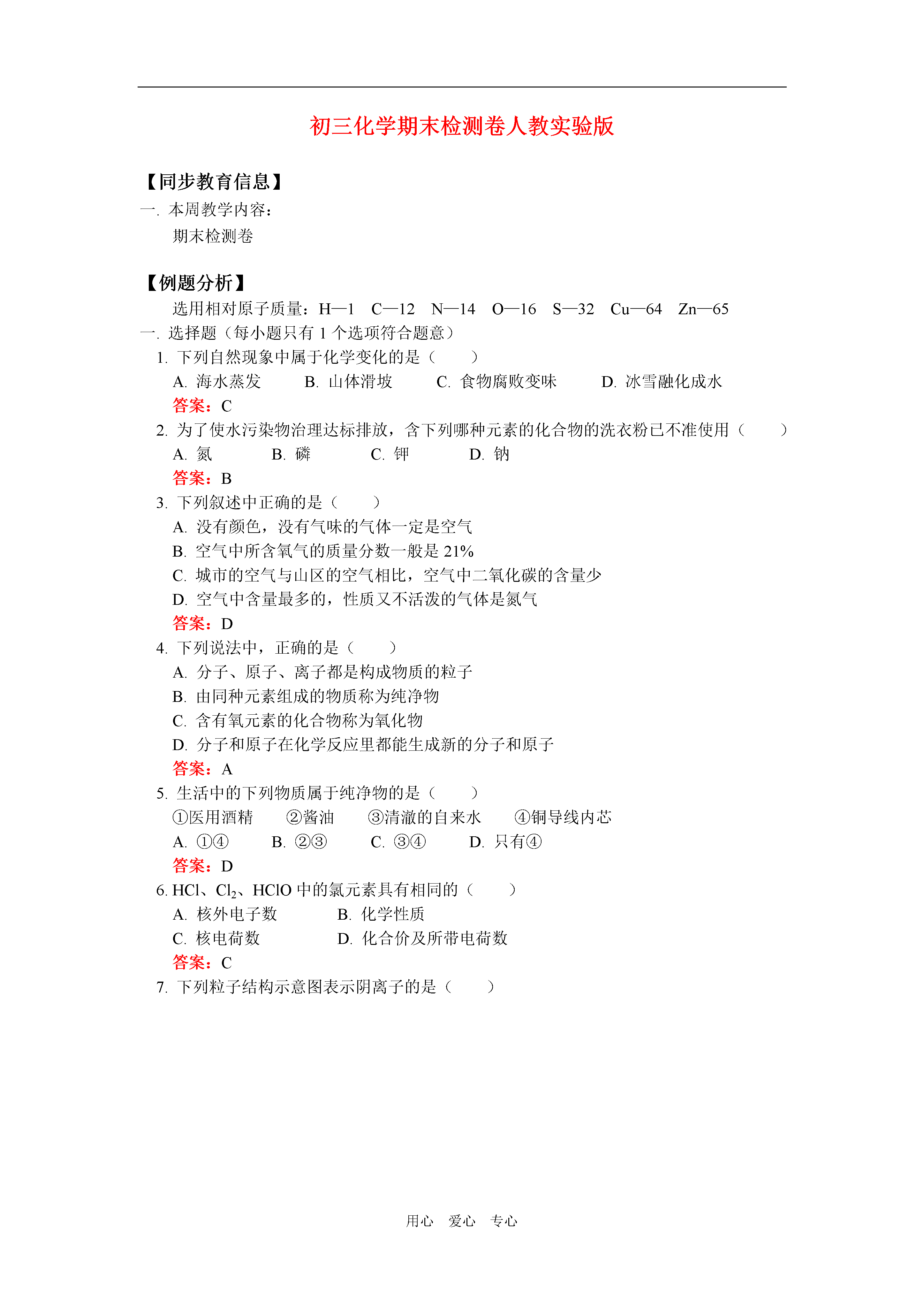 用心爱心专心初三化学期末检测卷人教实验版【同步教育信息】一.本周教学内容:期末检测卷【例题分析】选用相对原子质量:H—1C—12N—14O—16S—32Cu—64Zn—65一.选择题(每小题只有1个选项符合题意)1.下列自然现象中属于化学变化的是()A.海水蒸发B.山体滑坡C.食物腐败变味D.冰雪融化成水答案:C2.为了使水污染物治理达标排放,含下列哪种元素的化合物的洗衣粉已不准使用()A.氮B.磷C.钾D.钠答案:B3.下列叙述中正确的是()A.没有颜色,没有气味的气体一定是空气B.空气中所含氧气的质量分数一般是21%C.城市的空气与山区的空气相比,空气中二氧化碳的含量少D.空气中含量最多的,性质又不活泼的气体是氮气答案:D4.下列说法中,正确的是()A.分子、原子、离子都是构成物质的粒子B.由同种元素组成的物质称为纯净物C.含有氧元素的化合物称为氧化物D.分子和原子在化学反应里都能生成新的分子和原子答案:A5.生活中的下列物质属于纯净物的是()①医用酒精②酱油③清澈的自来水④铜导线内芯A.①④B.②③C.③④D.只有④答案:D6.HCl、Cl2、HClO中的氯元素具有相同的()A.核外电子数B.化学性质C.核电荷数D.化合价及所带电荷数答案:C7.下列粒子结构示意图表示阴离子的是()答案:D8.过氧化氢的用途很多,除化学实验室当药品外,还可以作消毒剂,下列说法正确的是()A.它可以发生分解反应生成氢气和氧气B.它是由氢元素和氧元素组成的C.它是由一个氢分子和一个氧分子构成的D.它比水分子多1个氧原子,所以在常温下会生成氧气答案:B9.下列实验操作会导致实验失败的是()A.先检查装置气密性,再装药品B.排水法收集氧气时,先从水中取出导管,再熄灭酒精灯C.用一氧化碳还原氧化铜实验完毕时,先停止通一氧化碳,再停止加热D.点燃氢气前必须检验它的纯度答案:C10.物质名称与化学式相符合的是()A.酒精C2H5OHB.熟石灰CaCO3C.干冰H2OD.氯化铁FeCl2答案:A11.主要是由于水被污染而产生的现象是()①河流干枯或断流②河中的鱼虾稀少或绝迹③河水有异味④城市地表逐渐下沉⑤经常出现沙尘暴、大雾天气⑥土壤沙漠化A.①⑤B.②⑥C.②③D.④⑥答案:C12.某可燃性气体在空气中燃烧能生成水,则下列推断正确的是()A.该气体一定是氢气B.该气体中一定含有氢气C.该气体中一定含有氢元素D.该气体中一定含有氢、氧两种元素答案:C13.在下列水中洗衣服时,会起浮渣并且泡沫很少的是()A.河水B.自来水C.软水D.硬水答案:D14.某气体既能用排水法收集,又能用向上排空气法收集,该气体的性质是()A.难溶于水,密度比空气大B.难溶于水,密度比空气小C.易溶于水,密度比空气大或相近D.易溶于水,密度比空气小或相近答案:A15.下列反应中,只用一步反应不能实现的是()A.CO2→CaCO3B.H2CO3→COC.Fe→CuD.H2O2→H2O答案:B16.下列观点你认为科学的是()A.石油是重要的化石燃烧之一,被称为“工业的血液”B.在面粉加工厂内,不需设立严禁烟火的标志C.本饮料纯属天然,绝对不含化学物质D.黑夜发现有煤气泄漏,要开灯检查答案:A17.在如图所示的图标中,表示禁止放易燃物的是()答案:A18.北京在申办2008年奥运会时提出了“科技奥运、人文奥运、绿色奥运”的口号。为了使2008年北京奥运会办成绿色奥运会,下列做法不可取的是()A.提高污水处理率B.用天然气逐步取代民用燃煤C.关闭所有的化工企业D.降低机动车的尾气污染答案:C19.下列变化过程中,不会产生二氧化碳的是()A.煤的燃烧B.氢气在空气中安静地燃烧C.天然气的燃烧D.石灰石与稀盐酸反应答案:B20.光照条件下,取一个大烧杯,其中装入大半杯清水,在烧杯底部放一些新鲜水草,并通入一定量的A气体。静置一段时间后,用漏斗罩住水草,然后将一只盛满水的小试管倒置于漏斗上(如图所示)。经过较长时间后,试管里收集到少许B气体。对此实验,下列判断正确的是()A.A是N2,B是O2B.A是N2,B是CO2C.A是O2,B是CO2D.A是CO2,B是O2答案:D二.选择题(每小题有1~2个选项符合题意)(共10分)A.反应前固体混合物的质量与反应后固体混合物的质量B.氯酸钾(KClO3)的质量和化学性质C.二氧化锰的质量和化学性质D.原子的种类、数目和原子的质量答案:CD22.生活中的一些问题常涉及化学知识,下列叙述错误的是()A.炉子上只要放一壶水,
