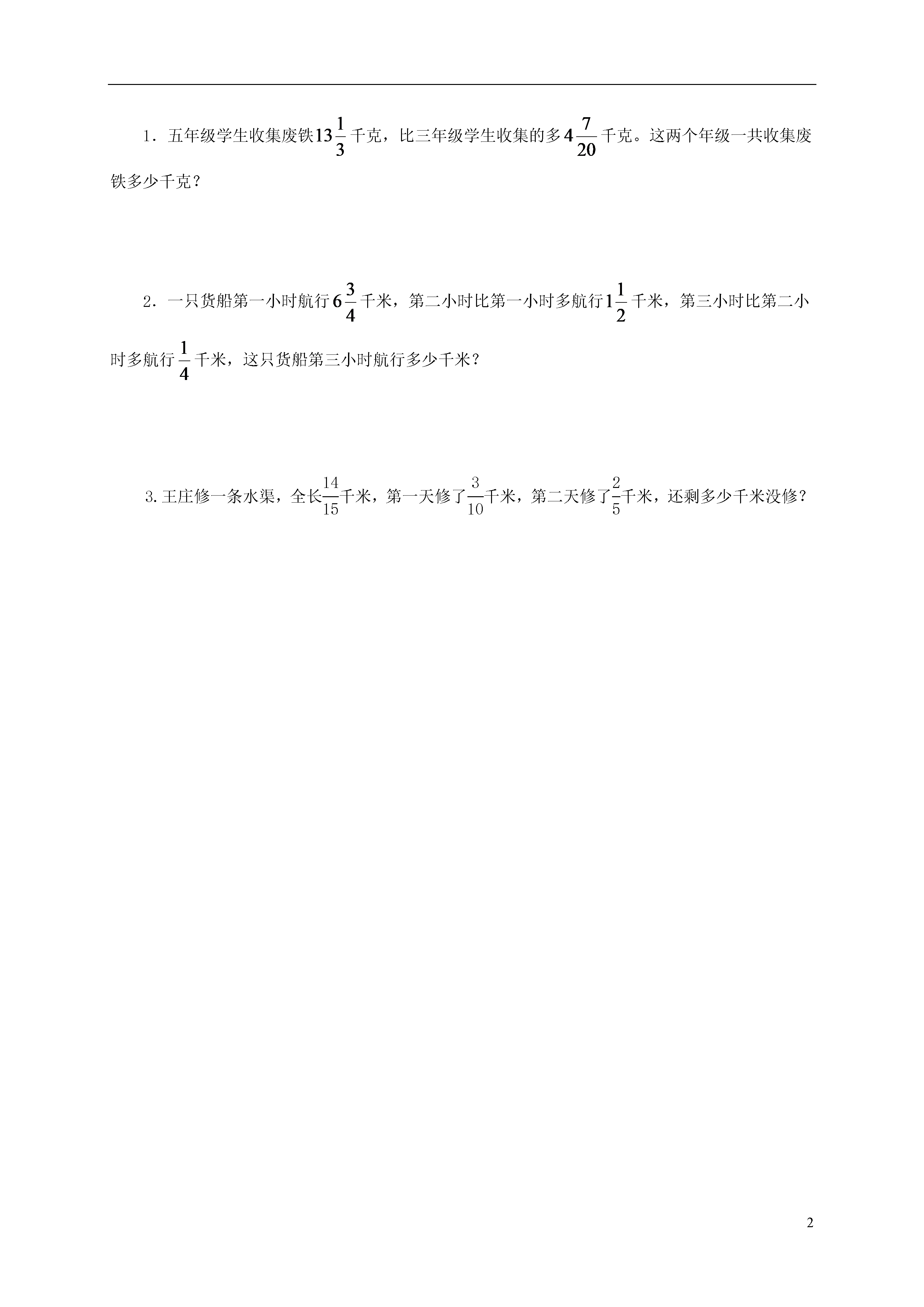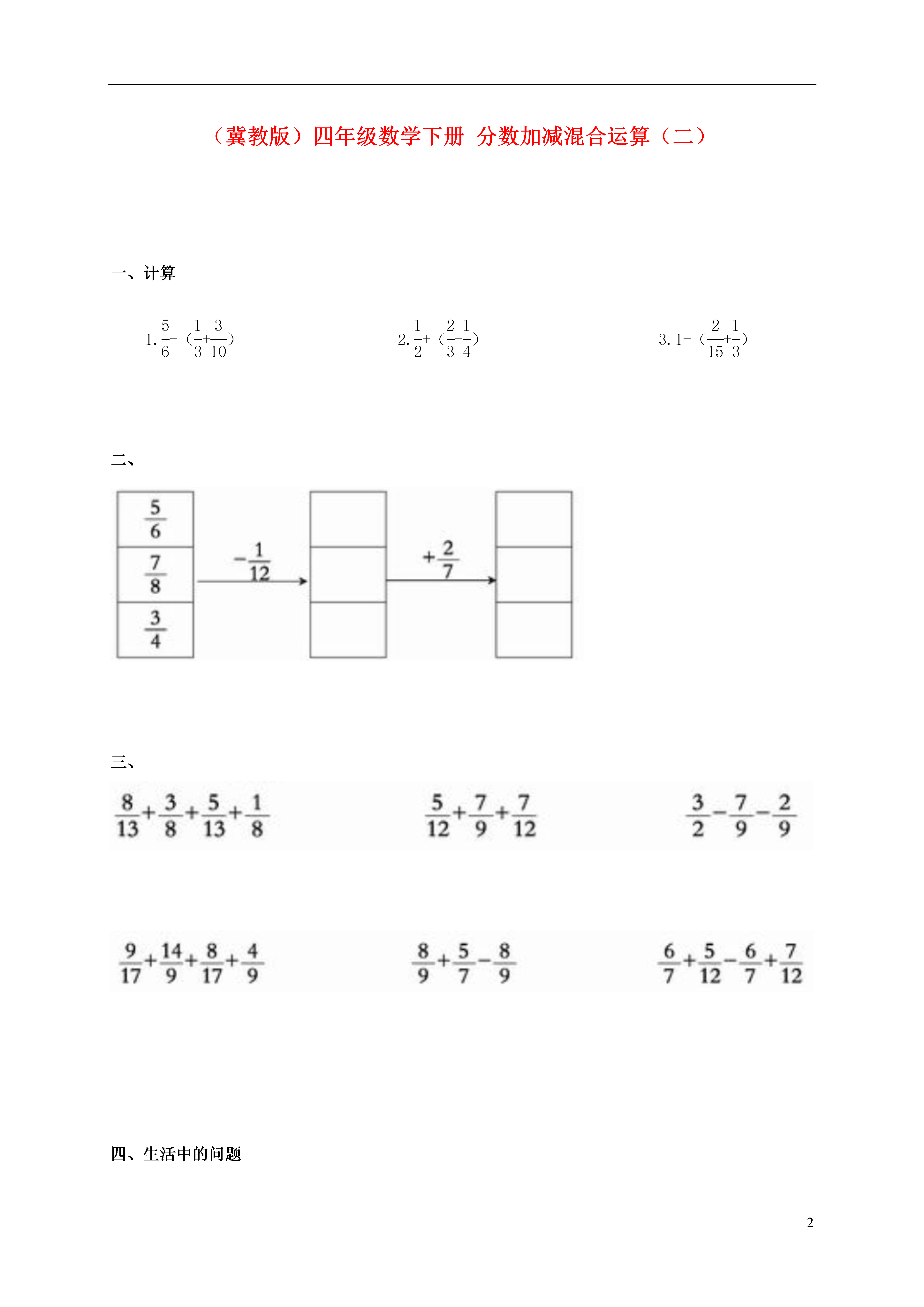 2(冀教版)四年级数学下册分数加减混合运算(二)一、计算1.eq\f(5,6)-(eq\f(1,3)+eq\f(3,10))2.eq\f(1,2)+(eq\f(2,3)-eq\f(1,4))3.1-(eq\f(2,15)+eq\f(1,3))二、三、四、生活中的问题1.五年级学生收集废铁千克,比三年级学生收集的多千克。这两个年级一共收集废铁多少千克?2.一只货船第一小时航行千米,第二小时比第一小时多航行千米,第三小时比第二小时多航行千米,这只货船第三小时航行多少千米?3.王庄修一条水渠,全长eq\f(14,15)千米,第一天修了eq\f(3,10)千米,第二天修了eq\f(2,5)千米,还剩多少千米没修?
