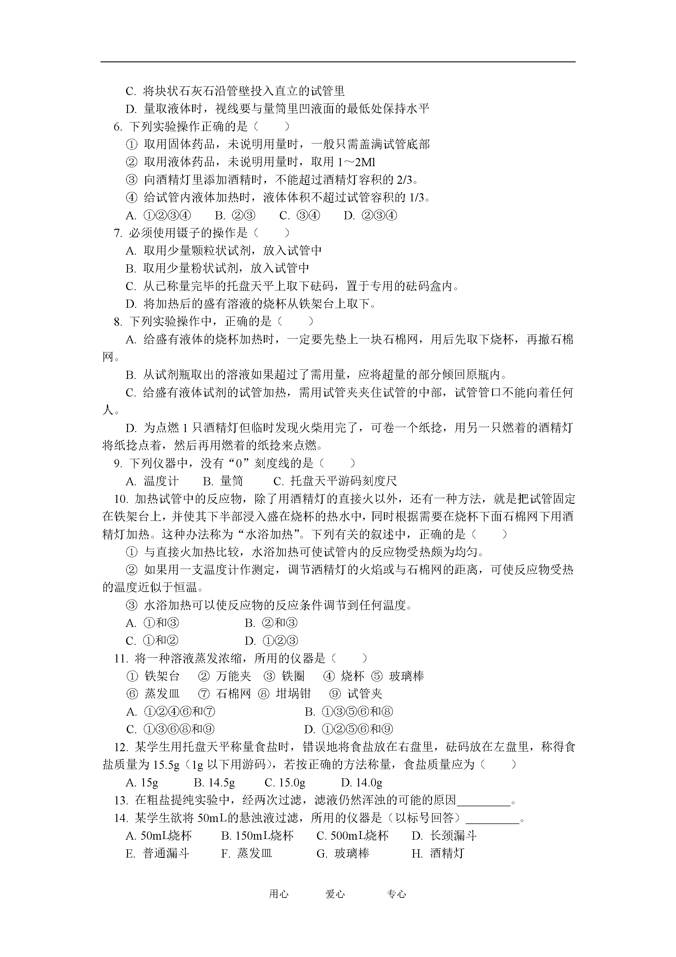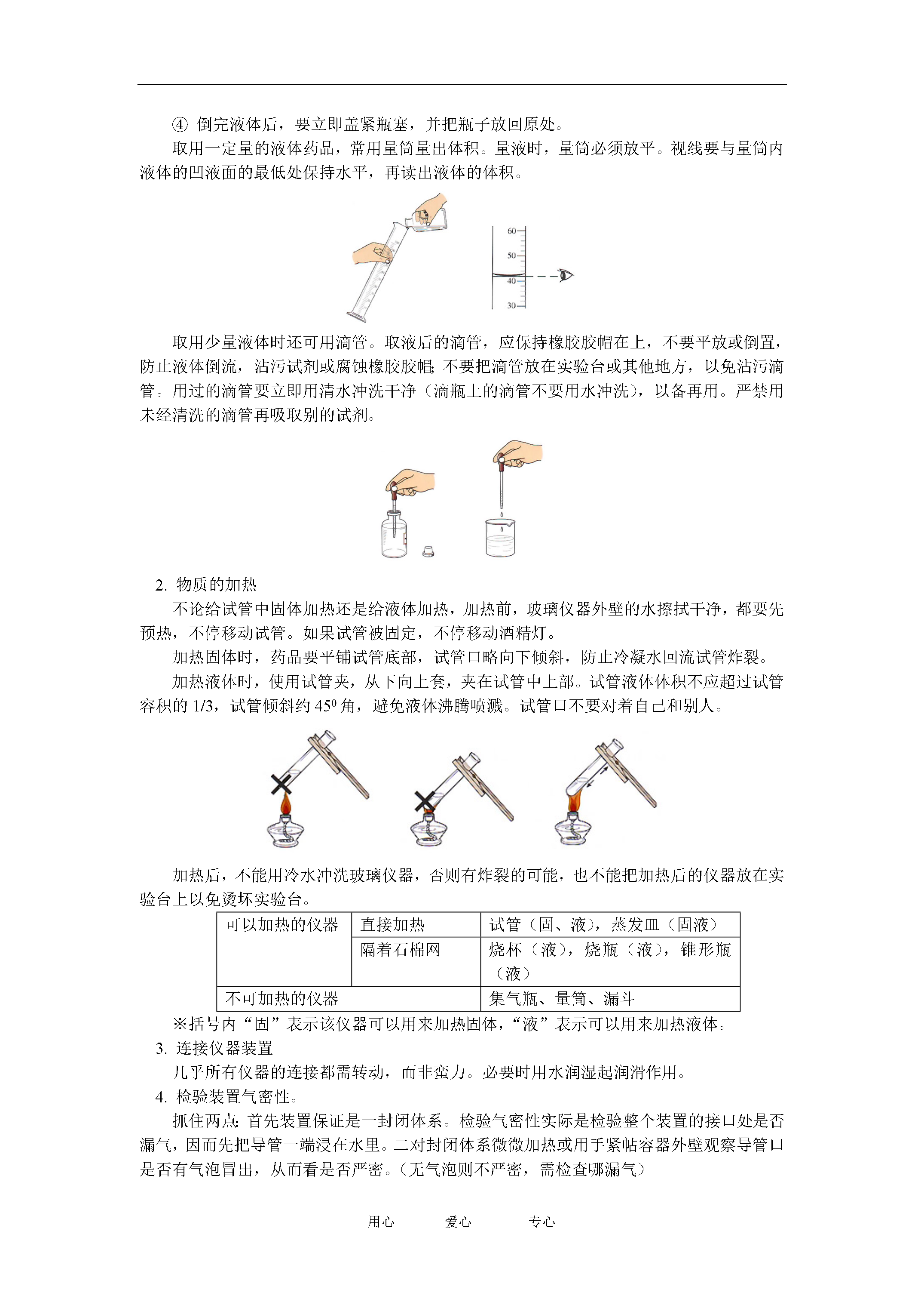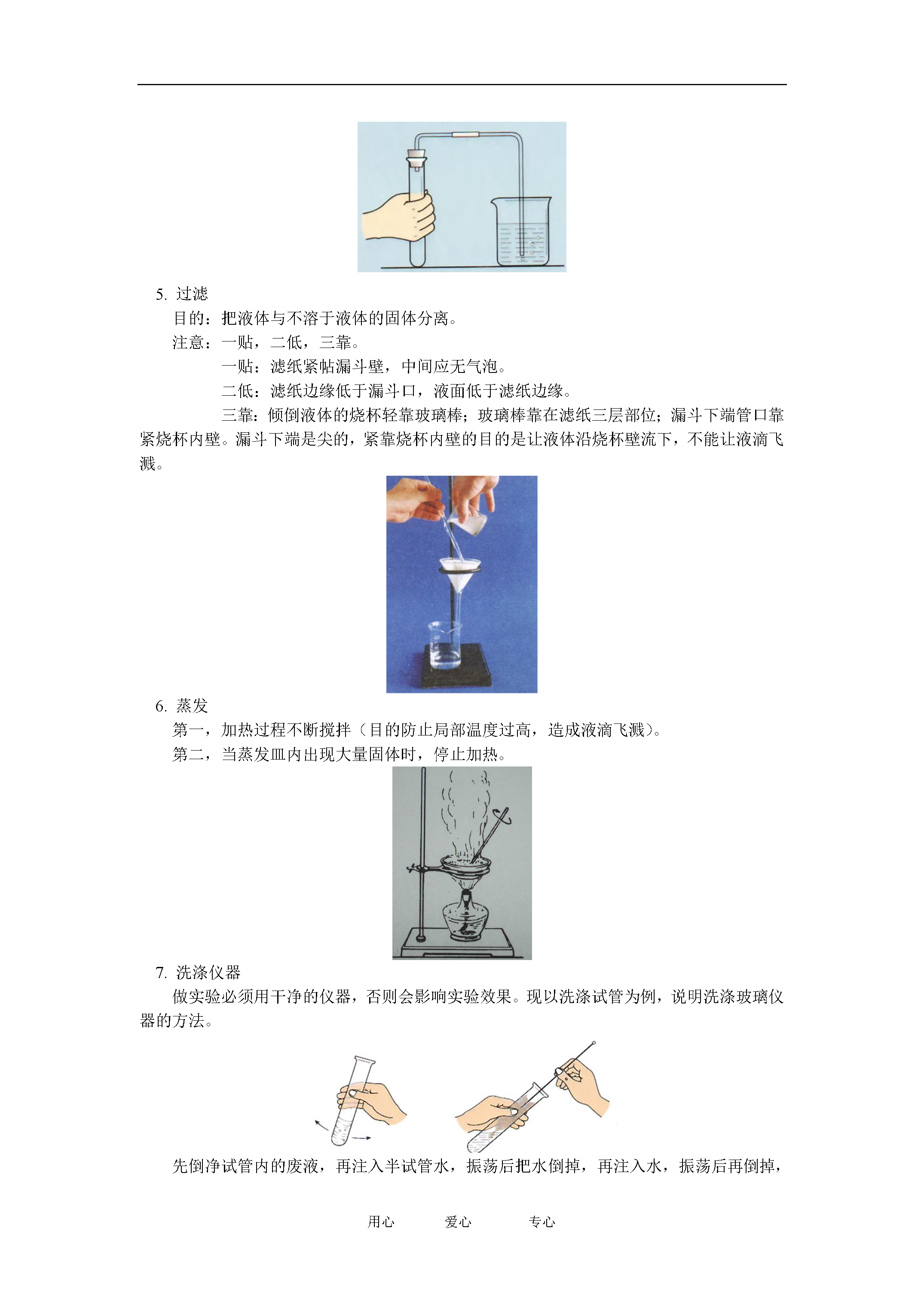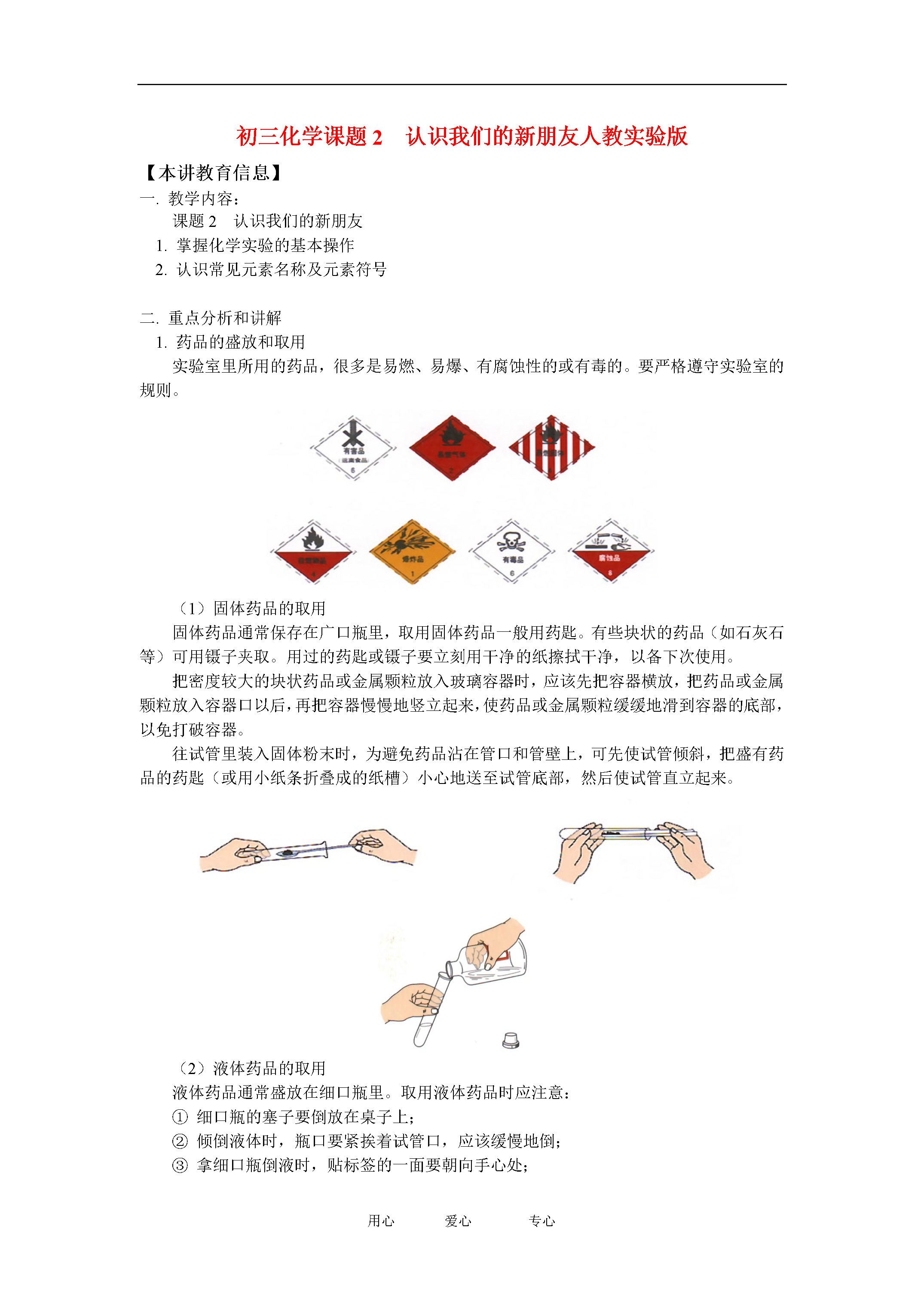 用心爱心专心初三化学课题2认识我们的新朋友人教实验版【本讲教育信息】一.教学内容:课题2认识我们的新朋友1.掌握化学实验的基本操作2.认识常见元素名称及元素符号二.重点分析和讲解1.药品的盛放和取用实验室里所用的药品,很多是易燃、易爆、有腐蚀性的或有毒的。要严格遵守实验室的规则。(1)固体药品的取用固体药品通常保存在广口瓶里,取用固体药品一般用药匙。有些块状的药品(如石灰石等)可用镊子夹取。用过的药匙或镊子要立刻用干净的纸擦拭干净,以备下次使用。把密度较大的块状药品或金属颗粒放入玻璃容器时,应该先把容器横放,把药品或金属颗粒放入容器口以后,再把容器慢慢地竖立起来,使药品或金属颗粒缓缓地滑到容器的底部,以免打破容器。往试管里装入固体粉末时,为避免药品沾在管口和管壁上,可先使试管倾斜,把盛有药品的药匙(或用小纸条折叠成的纸槽)小心地送至试管底部,然后使试管直立起来。(2)液体药品的取用液体药品通常盛放在细口瓶里。取用液体药品时应注意:①细口瓶的塞子要倒放在桌子上;②倾倒液体时,瓶口要紧挨着试管口,应该缓慢地倒;③拿细口瓶倒液时,贴标签的一面要朝向手心处;④倒完液体后,要立即盖紧瓶塞,并把瓶子放回原处。取用一定量的液体药品,常用量筒量出体积。量液时,量筒必须放平。视线要与量筒内液体的凹液面的最低处保持水平,再读出液体的体积。取用少量液体时还可用滴管。取液后的滴管,应保持橡胶胶帽在上,不要平放或倒置,防止液体倒流,沾污试剂或腐蚀橡胶胶帽;不要把滴管放在实验台或其他地方,以免沾污滴管。用过的滴管要立即用清水冲洗干净(滴瓶上的滴管不要用水冲洗),以备再用。严禁用未经清洗的滴管再吸取别的试剂。2.物质的加热不论给试管中固体加热还是给液体加热,加热前,玻璃仪器外壁的水擦拭干净,都要先预热,不停移动试管。如果试管被固定,不停移动酒精灯。加热固体时,药品要平铺试管底部,试管口略向下倾斜,防止冷凝水回流试管炸裂。加热液体时,使用试管夹,从下向上套,夹在试管中上部。试管液体体积不应超过试管容积的1/3,试管倾斜约450角,避免液体沸腾喷溅。试管口不要对着自己和别人。加热后,不能用冷水冲洗玻璃仪器,否则有炸裂的可能,也不能把加热后的仪器放在实验台上以免烫坏实验台。可以加热的仪器直接加热试管(固、液),蒸发皿(固液)隔着石棉网烧杯(液),烧瓶(液),锥形瓶(液)不可加热的仪器集气瓶、量筒、漏斗※括号内“固”表示该仪器可以用来加热固体,“液”表示可以用来加热液体。3.连接仪器装置几乎所有仪器的连接都需转动,而非蛮力。必要时用水润湿起润滑作用。4.检验装置气密性。抓住两点:首先装置保证是一封闭体系。检验气密性实际是检验整个装置的接口处是否漏气,因而先把导管一端浸在水里。二对封闭体系微微加热或用手紧帖容器外壁观察导管口是否有气泡冒出,从而看是否严密。(无气泡则不严密,需检查哪漏气)5.过滤目的:把液体与不溶于液体的固体分离。注意:一贴,二低,三靠。一贴:滤纸紧帖漏斗壁,中间应无气泡。二低:滤纸边缘低于漏斗口,液面低于滤纸边缘。三靠:倾倒液体的烧杯轻靠玻璃棒;玻璃棒靠在滤纸三层部位;漏斗下端管口靠紧烧杯内壁。漏斗下端是尖的,紧靠烧杯内壁的目的是让液体沿烧杯壁流下,不能让液滴飞溅。6.蒸发第一,加热过程不断搅拌(目的防止局部温度过高,造成液滴飞溅)。第二,当蒸发皿内出现大量固体时,停止加热。7.洗涤仪器做实验必须用干净的仪器,否则会影响实验效果。现以洗涤试管为例,说明洗涤玻璃仪器的方法。先倒净试管内的废液,再注入半试管水,振荡后把水倒掉,再注入水,振荡后再倒掉,这样连洗几次。如果内壁附有不易洗掉的物质,要用试管刷刷洗。刷洗时须转动或上下移动试管刷,但用力不能过猛,以防试管损坏。洗过的玻璃仪器内壁附着的水既不聚成水滴,也不成股流下时,表示仪器已洗干净。洗净的玻璃仪器应放在试管架上或指定的地方。【模拟试题】1.下列有关实验操作的叙述,正确的是()A.用100mL量筒量取8.5mL水B.在托盘天平的左右盘中,各放一块纸片,调平后,左盘放药品,右盘放砝码,并调整游码,称取一定质量的氢氧化钠固体。C.加热试管前,用抹布将试管外壁擦干,以防试管受热不匀而破裂。D.称量时先加质量大的砝码,再加质量小的砝码2.下列化学实验基本操作正确的是()A.每次取液后,滴瓶上的滴管必须用水冲洗干净B.为了加快过滤速度,用玻璃棒不断搅拌过滤器内液体。C.检验气密性时,先用手紧帖容器外壁,再把导管浸在水里,看是否有气泡产生。D.无论是给试管中固体加热,还是给液体加热,都必须给试管预热。3.下列各组仪器,能用来加热液体药品的一组是()A.试管、量筒、蒸发皿B.试管、蒸发皿、烧杯C.量筒、蒸发皿、烧杯D.试管,蒸发皿、集气瓶4.按下列实验方法能达到要求的是()A.用托盘天平称量25.20g食盐B.用