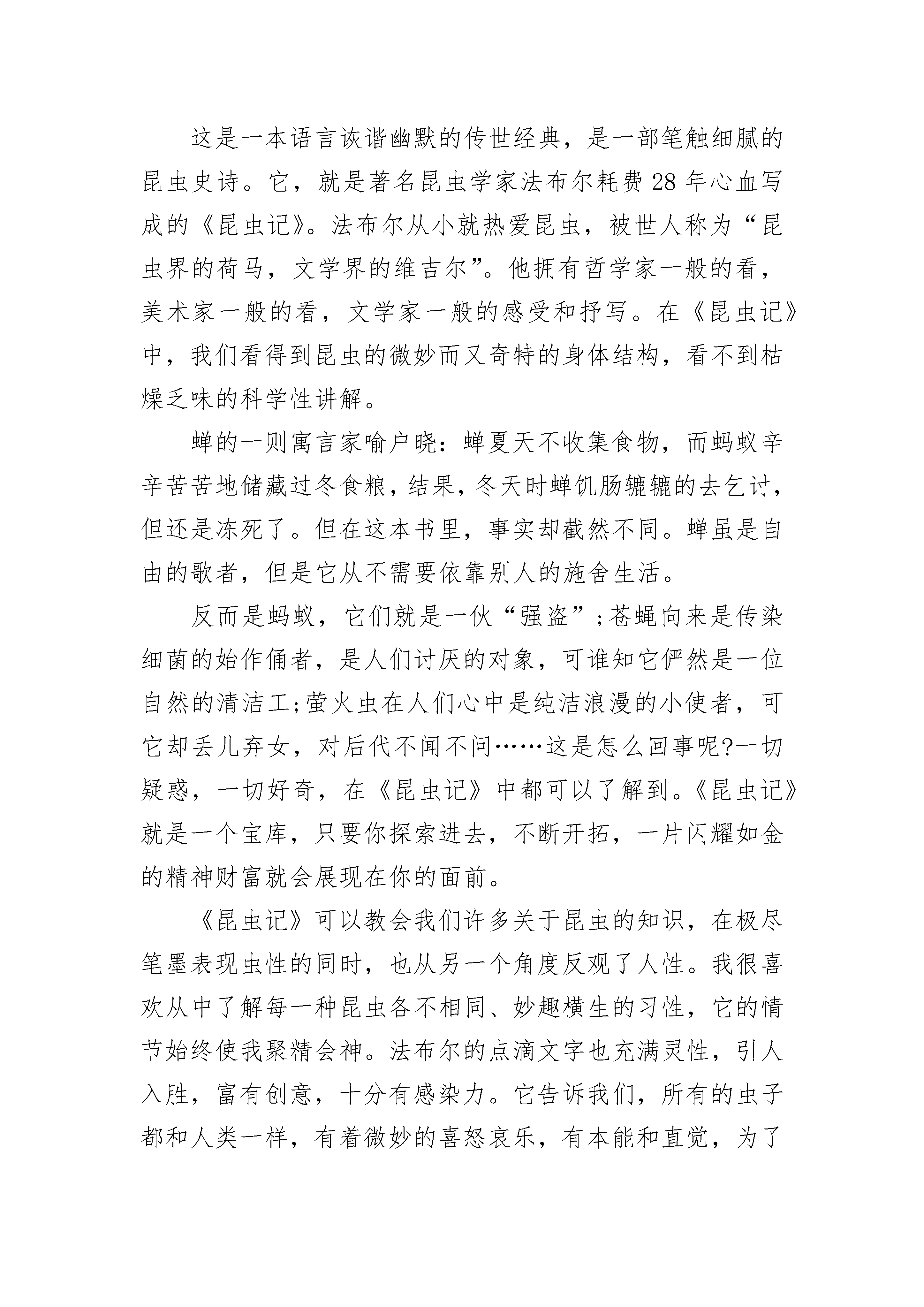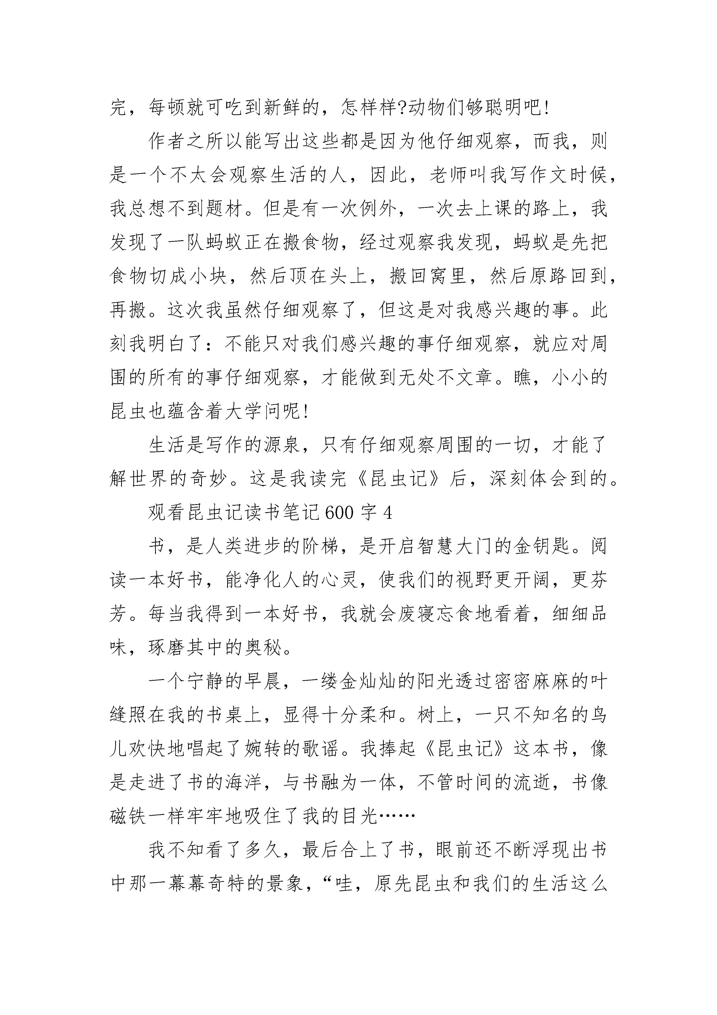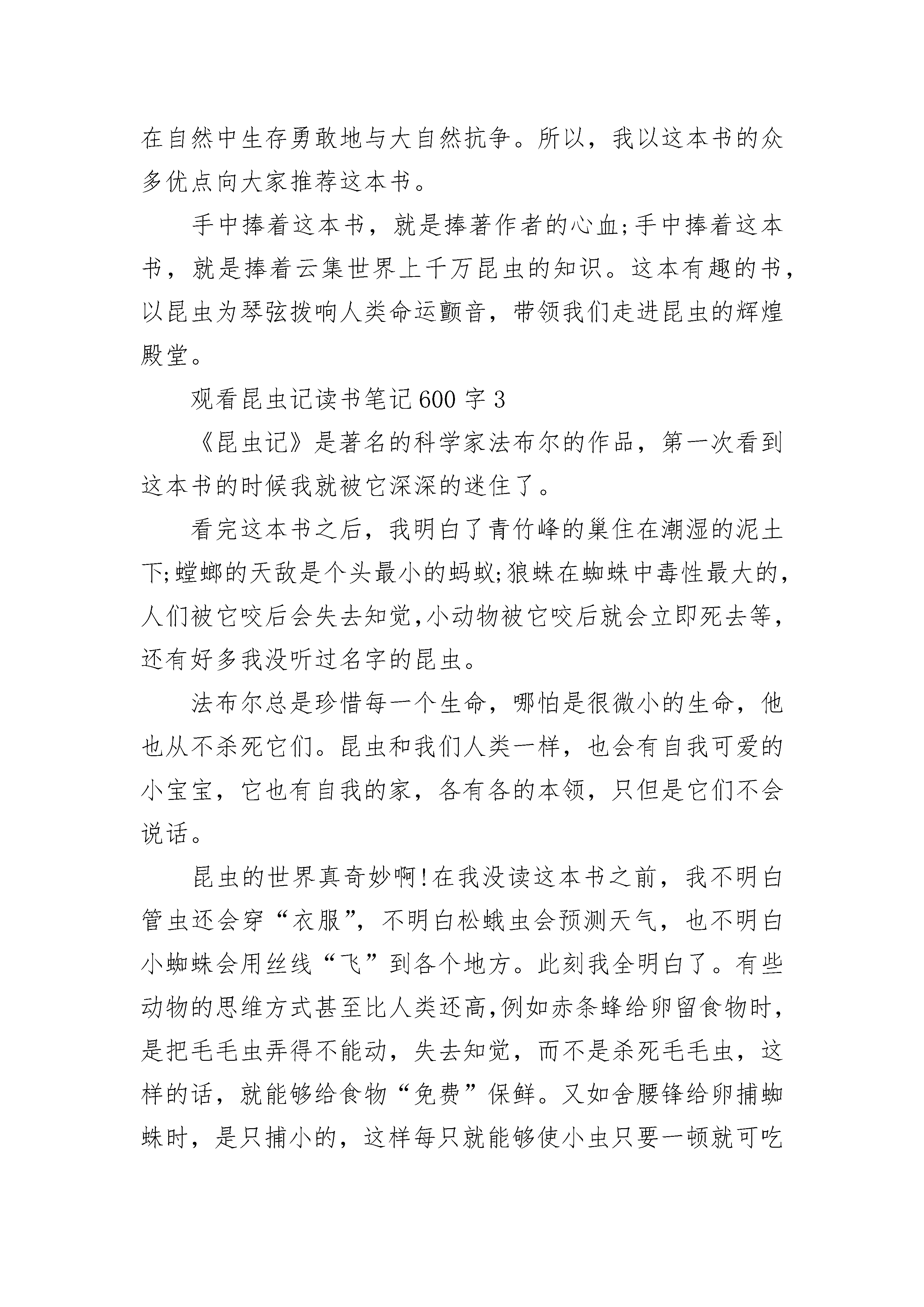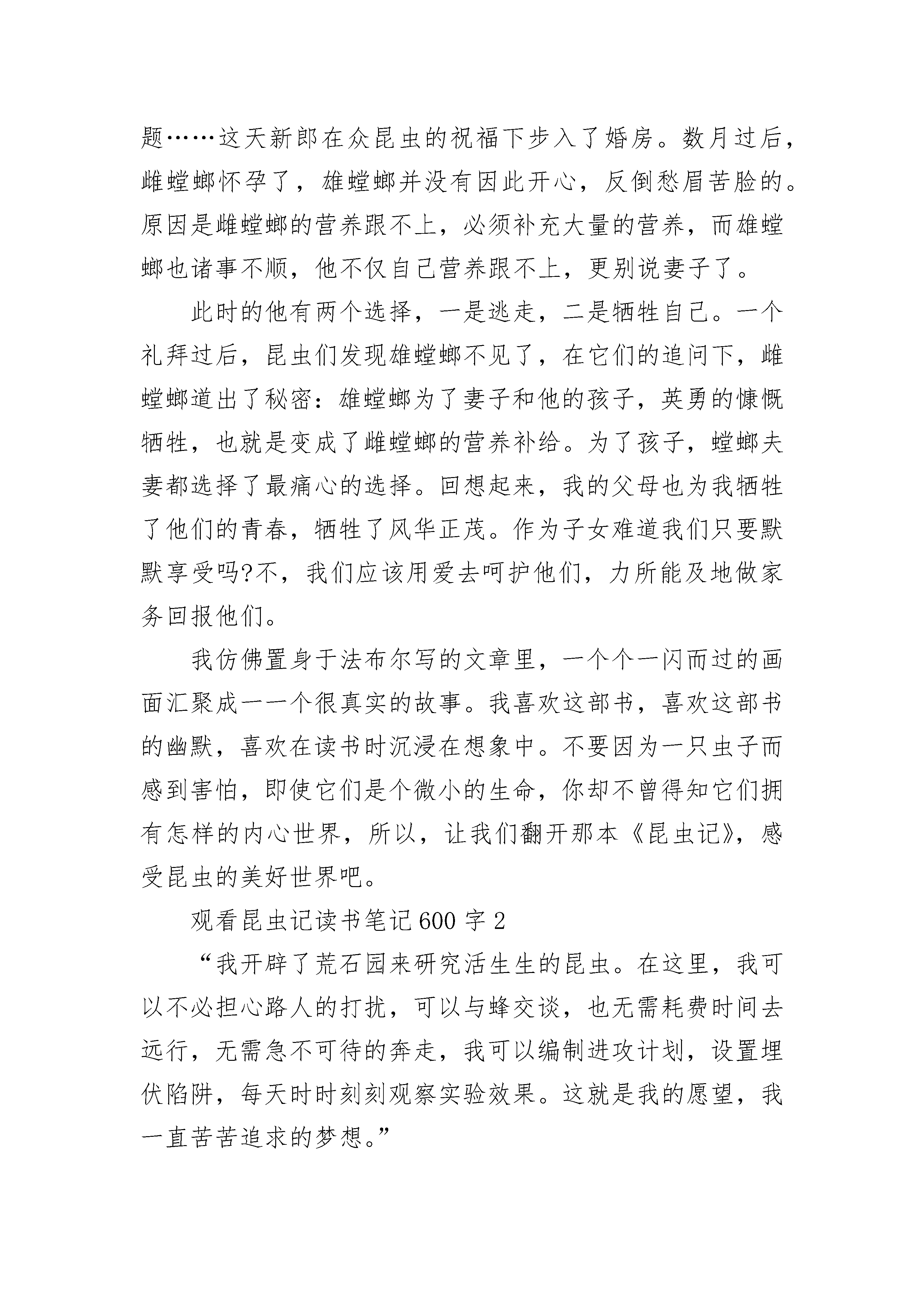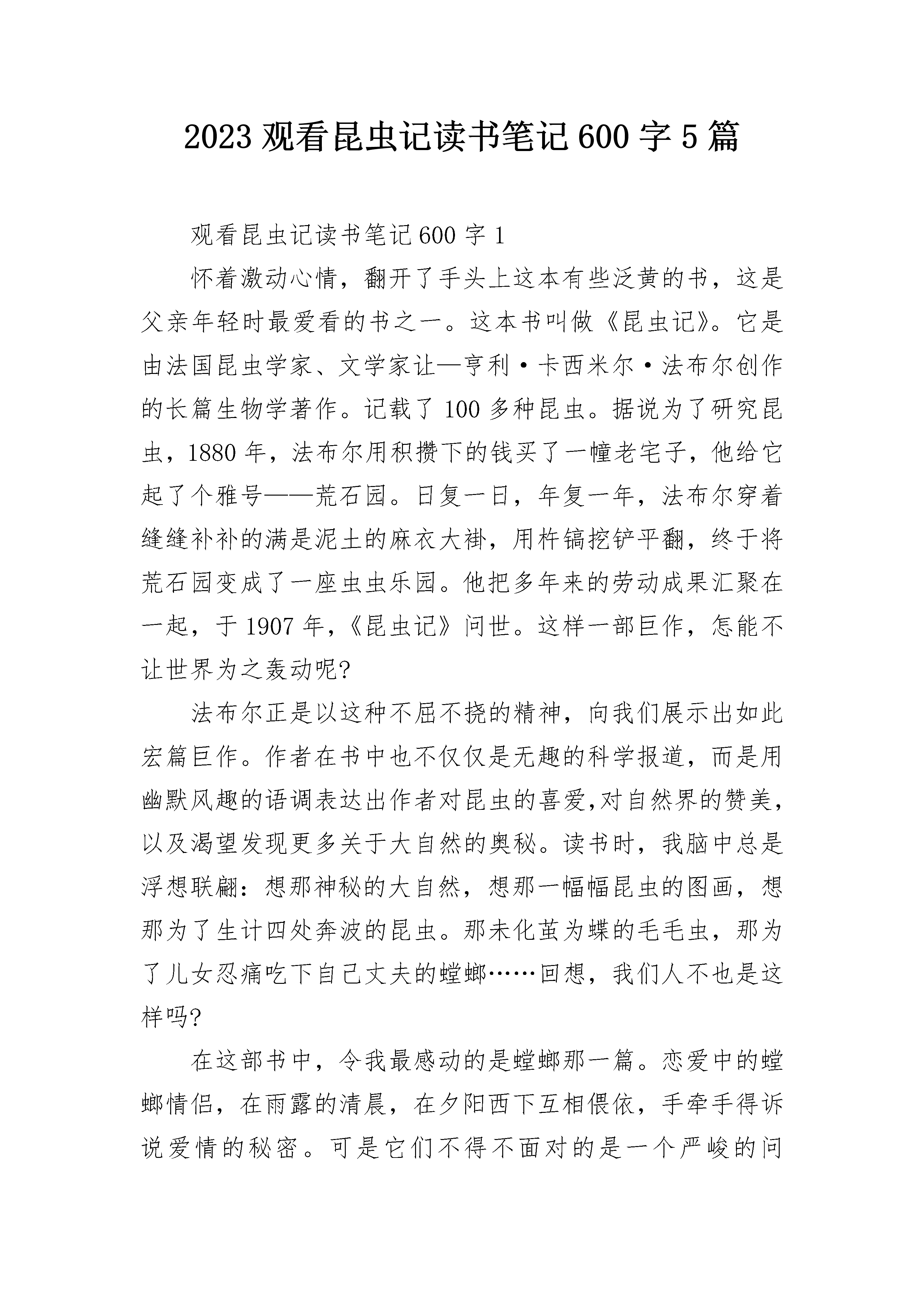 2023观看昆虫记读书笔记600字5篇观看昆虫记读书笔记600字1怀着激动心情,翻开了手头上这本有些泛黄的书,这是父亲年轻时最爱看的书之一。这本书叫做《昆虫记》。它是由法国昆虫学家、文学家让—亨利·卡西米尔·法布尔创作的长篇生物学著作。记载了100多种昆虫。据说为了研究昆虫,1880年,法布尔用积攒下的钱买了一幢老宅子,他给它起了个雅号——荒石园。日复一日,年复一年,法布尔穿着缝缝补补的满是泥土的麻衣大褂,用杵镐挖铲平翻,终于将荒石园变成了一座虫虫乐园。他把多年来的劳动成果汇聚在一起,于1907年,《昆虫记》问世。这样一部巨作,怎能不让世界为之轰动呢?法布尔正是以这种不屈不挠的精神,向我们展示出如此宏篇巨作。作者在书中也不仅仅是无趣的科学报道,而是用幽默风趣的语调表达出作者对昆虫的喜爱,对自然界的赞美,以及渴望发现更多关于大自然的奥秘。读书时,我脑中总是浮想联翩:想那神秘的大自然,想那一幅幅昆虫的图画,想那为了生计四处奔波的昆虫。那未化茧为蝶的毛毛虫,那为了儿女忍痛吃下自己丈夫的螳螂……回想,我们人不也是这样吗?在这部书中,令我最感动的是螳螂那一篇。恋爱中的螳螂情侣,在雨露的清晨,在夕阳西下互相偎依,手牵手得诉说爱情的秘密。可是它们不得不面对的是一个严峻的问题……这天新郎在众昆虫的祝福下步入了婚房。数月过后,雌螳螂怀孕了,雄螳螂并没有因此开心,反倒愁眉苦脸的。原因是雌螳螂的营养跟不上,必须补充大量的营养,而雄螳螂也诸事不顺,他不仅自己营养跟不上,更别说妻子了。此时的他有两个选择,一是逃走,二是牺牲自己。一个礼拜过后,昆虫们发现雄螳螂不见了,在它们的追问下,雌螳螂道出了秘密:雄螳螂为了妻子和他的孩子,英勇的慷慨牺牲,也就是变成了雌螳螂的营养补给。为了孩子,螳螂夫妻都选择了最痛心的选择。回想起来,我的父母也为我牺牲了他们的青春,牺牲了风华正茂。作为子女难道我们只要默默享受吗?不,我们应该用爱去呵护他们,力所能及地做家务回报他们。我仿佛置身于法布尔写的文章里,一个个一闪而过的画面汇聚成一一个很真实的故事。我喜欢这部书,喜欢这部书的幽默,喜欢在读书时沉浸在想象中。不要因为一只虫子而感到害怕,即使它们是个微小的生命,你却不曾得知它们拥有怎样的内心世界,所以,让我们翻开那本《昆虫记》,感受昆虫的美好世界吧。观看昆虫记读书笔记600字2“我开辟了荒石园来研究活生生的昆虫。在这里,我可以不必担心路人的打扰,可以与蜂交谈,也无需耗费时间去远行,无需急不可待的奔走,我可以编制进攻计划,设置埋伏陷阱,每天时时刻刻观察实验效果。这就是我的愿望,我一直苦苦追求的梦想。”这是一本语言诙谐幽默的传世经典,是一部笔触细腻的昆虫史诗。它,就是著名昆虫学家法布尔耗费28年心血写成的《昆虫记》。法布尔从小就热爱昆虫,被世人称为“昆虫界的荷马,文学界的维吉尔”。他拥有哲学家一般的看,美术家一般的看,文学家一般的感受和抒写。在《昆虫记》中,我们看得到昆虫的微妙而又奇特的身体结构,看不到枯燥乏味的科学性讲解。蝉的一则寓言家喻户晓:蝉夏天不收集食物,而蚂蚁辛辛苦苦地储藏过冬食粮,结果,冬天时蝉饥肠辘辘的去乞讨,但还是冻死了。但在这本书里,事实却截然不同。蝉虽是自由的歌者,但是它从不需要依靠别人的施舍生活。反而是蚂蚁,它们就是一伙“强盗”;苍蝇向来是传染细菌的始作俑者,是人们讨厌的对象,可谁知它俨然是一位自然的清洁工;萤火虫在人们心中是纯洁浪漫的小使者,可它却丢儿弃女,对后代不闻不问……这是怎么回事呢?一切疑惑,一切好奇,在《昆虫记》中都可以了解到。《昆虫记》就是一个宝库,只要你探索进去,不断开拓,一片闪耀如金的精神财富就会展现在你的面前。《昆虫记》可以教会我们许多关于昆虫的知识,在极尽笔墨表现虫性的同时,也从另一个角度反观了人性。我很喜欢从中了解每一种昆虫各不相同、妙趣横生的习性,它的情节始终使我聚精会神。法布尔的点滴文字也充满灵性,引人入胜,富有创意,十分有感染力。它告诉我们,所有的虫子都和人类一样,有着微妙的喜怒哀乐,有本能和直觉,为了在自然中生存勇敢地与大自然抗争。所以,我以这本书的众多优点向大家推荐这本书。手中捧着这本书,就是捧著作者的心血;手中捧着这本书,就是捧着云集世界上千万昆虫的知识。这本有趣的书,以昆虫为琴弦拨响人类命运颤音,带领我们走进昆虫的辉煌殿堂。观看昆虫记读书笔记600字3《昆虫记》是著名的科学家法布尔的作品,第一次看到这本书的时候我就被它深深的迷住了。看完这本书之后,我明白了青竹峰的巢住在潮湿的泥土下;螳螂的天敌是个头最小的蚂蚁;狼蛛在蜘蛛中毒性最大的,人们被它咬后会失去知觉,小动物被它咬后就会立即死去等,还有好多我没听过名字的昆虫。法布尔总是珍惜每一个生命,哪怕是很微小的生命,他也从不杀死它们。昆虫和我们人类一样,也会有自我可爱的小宝宝,它