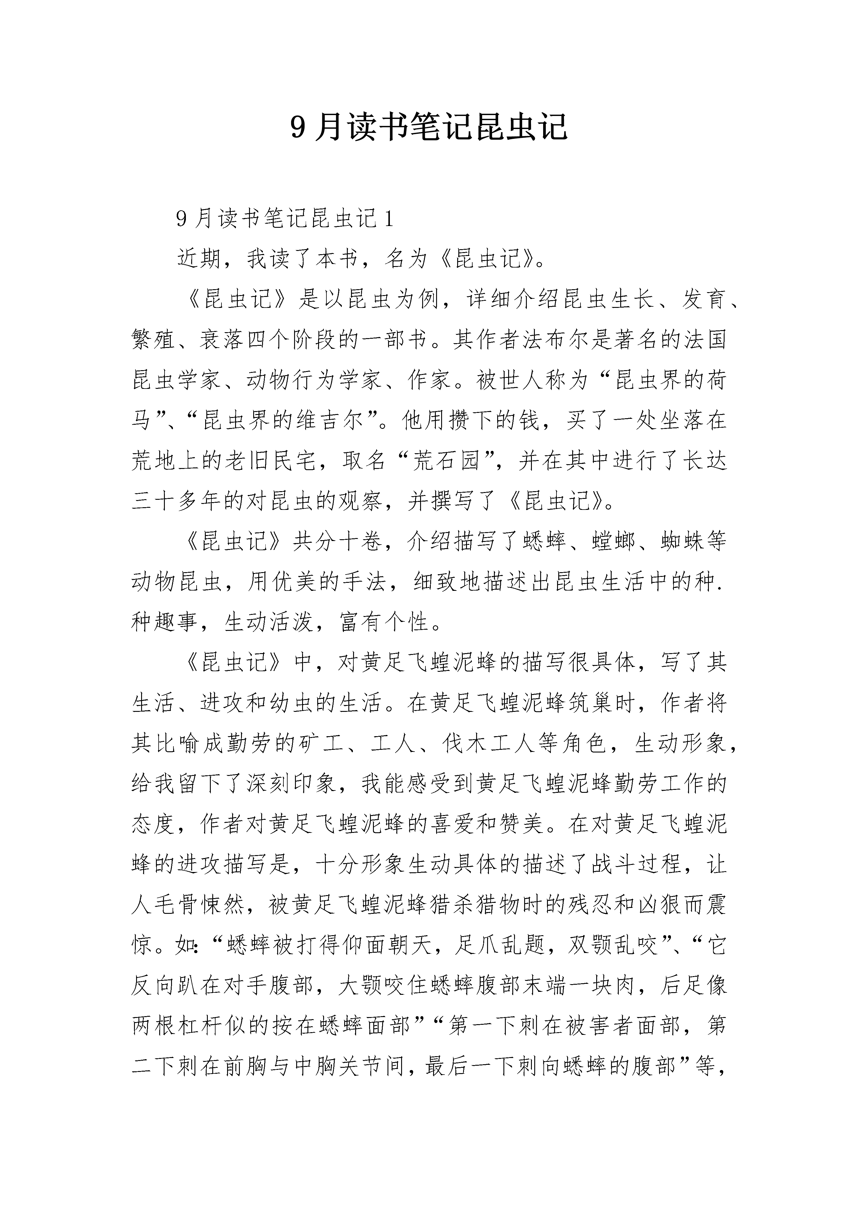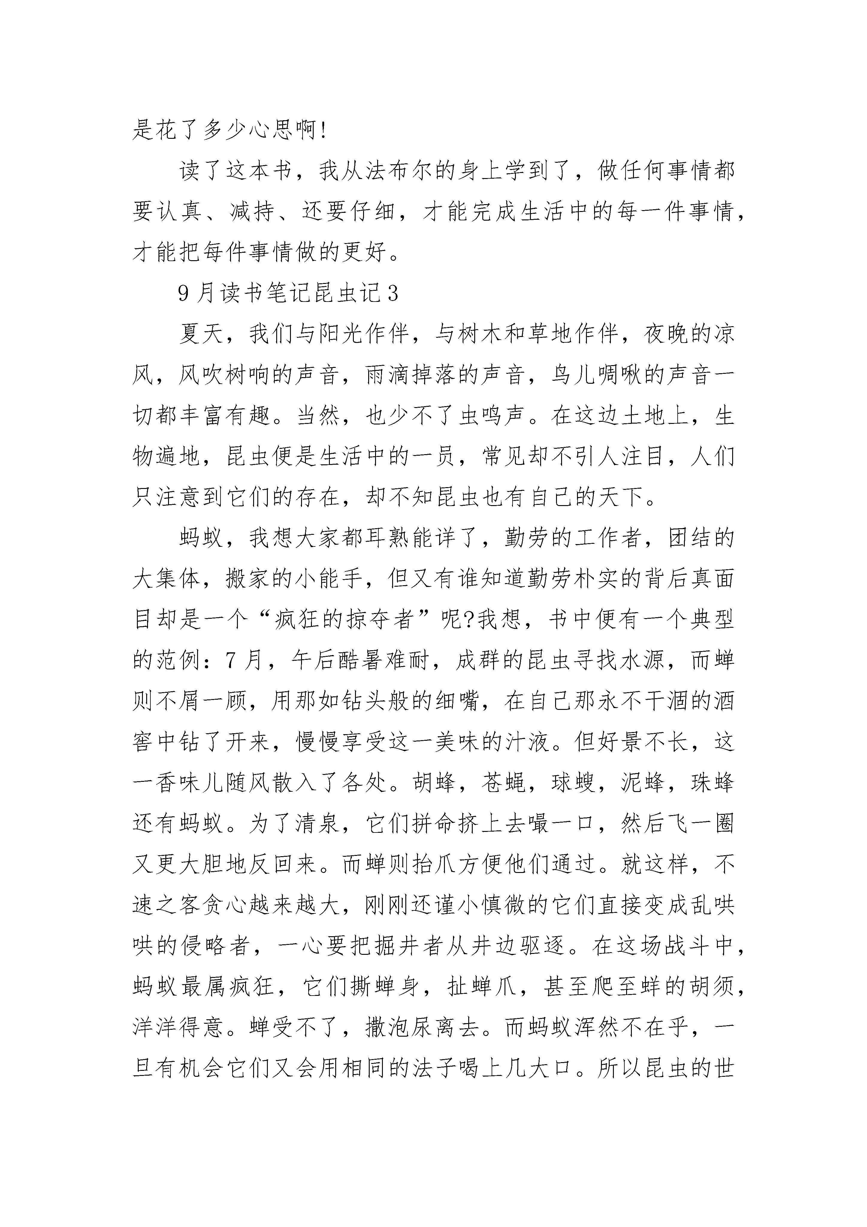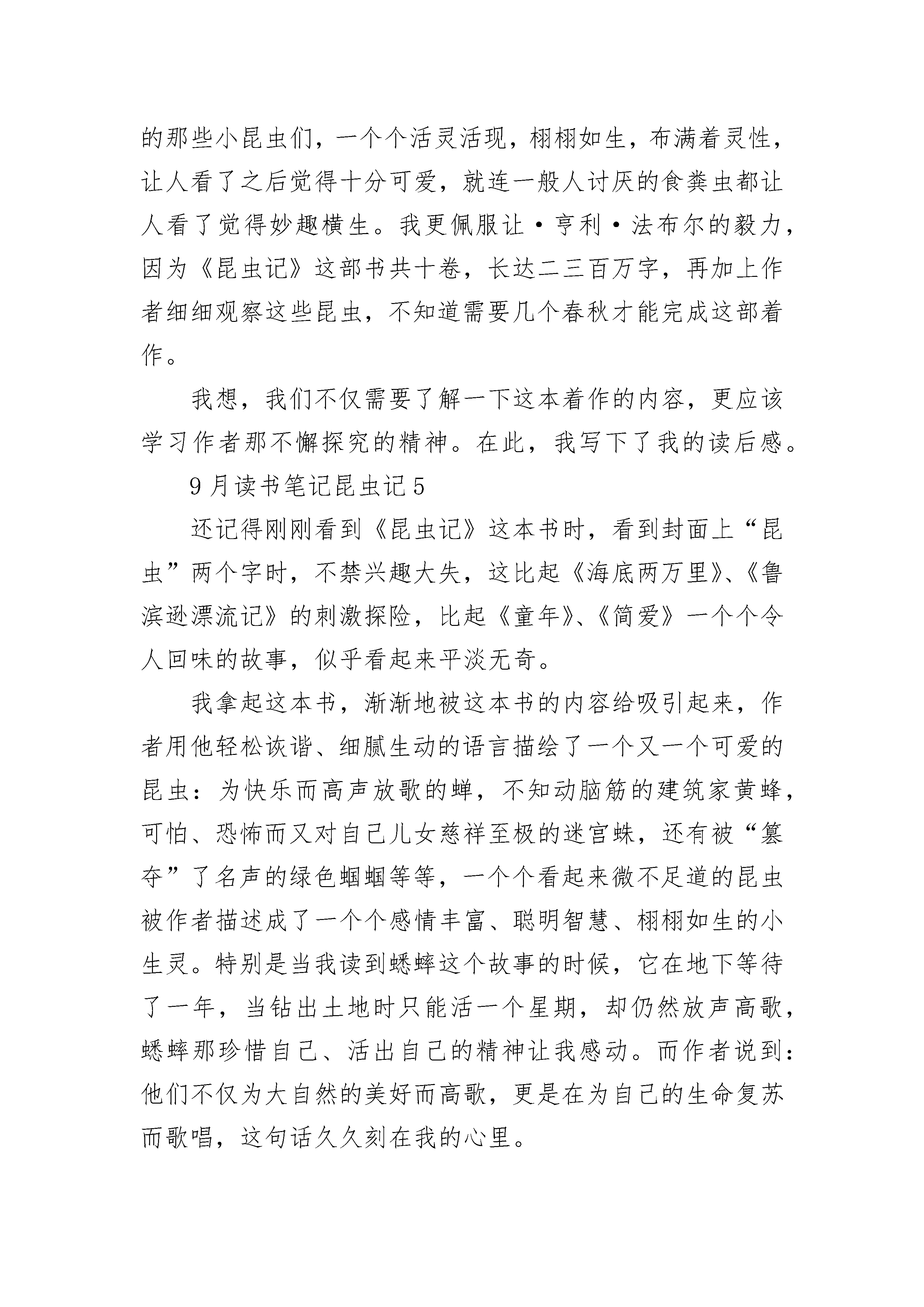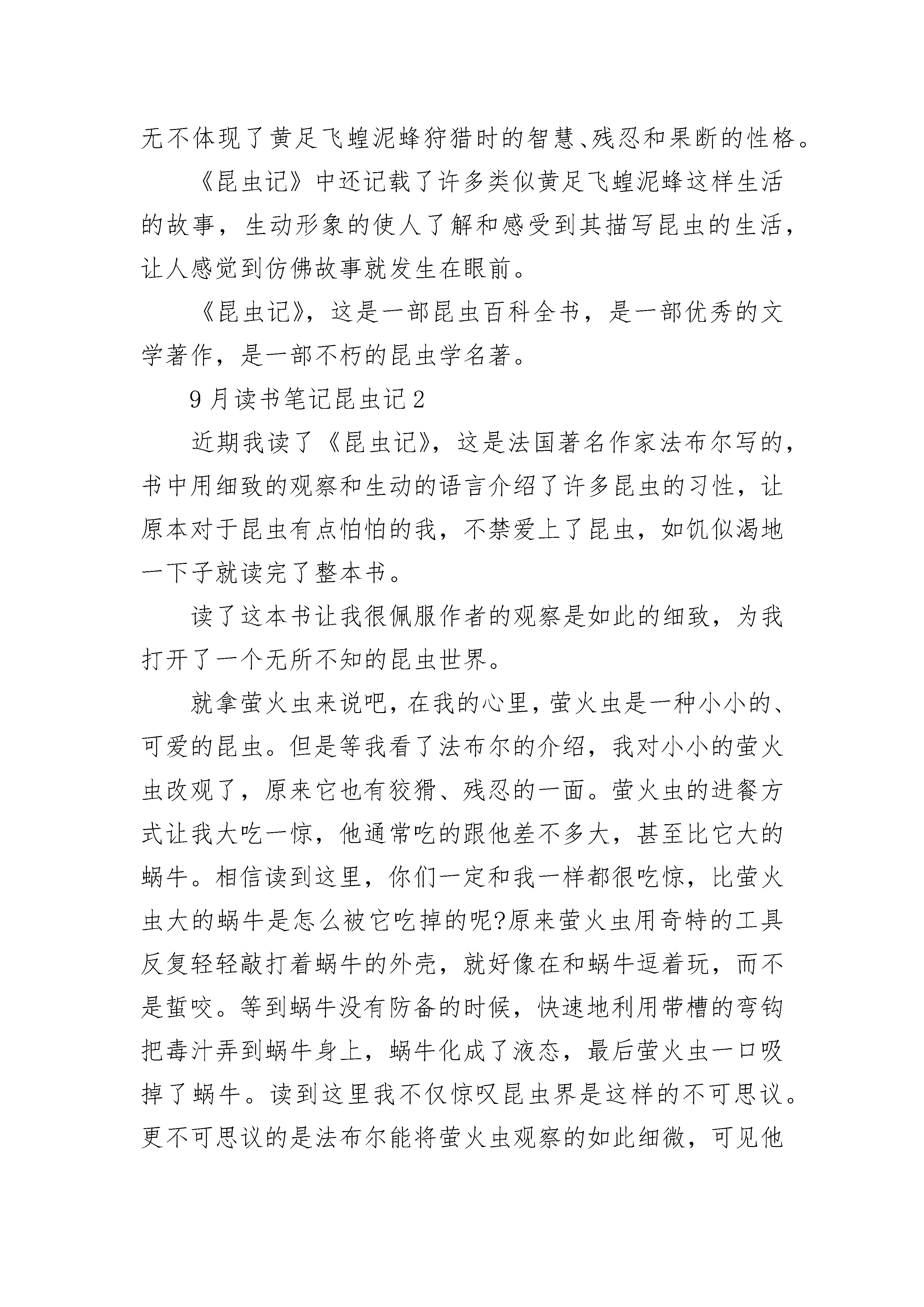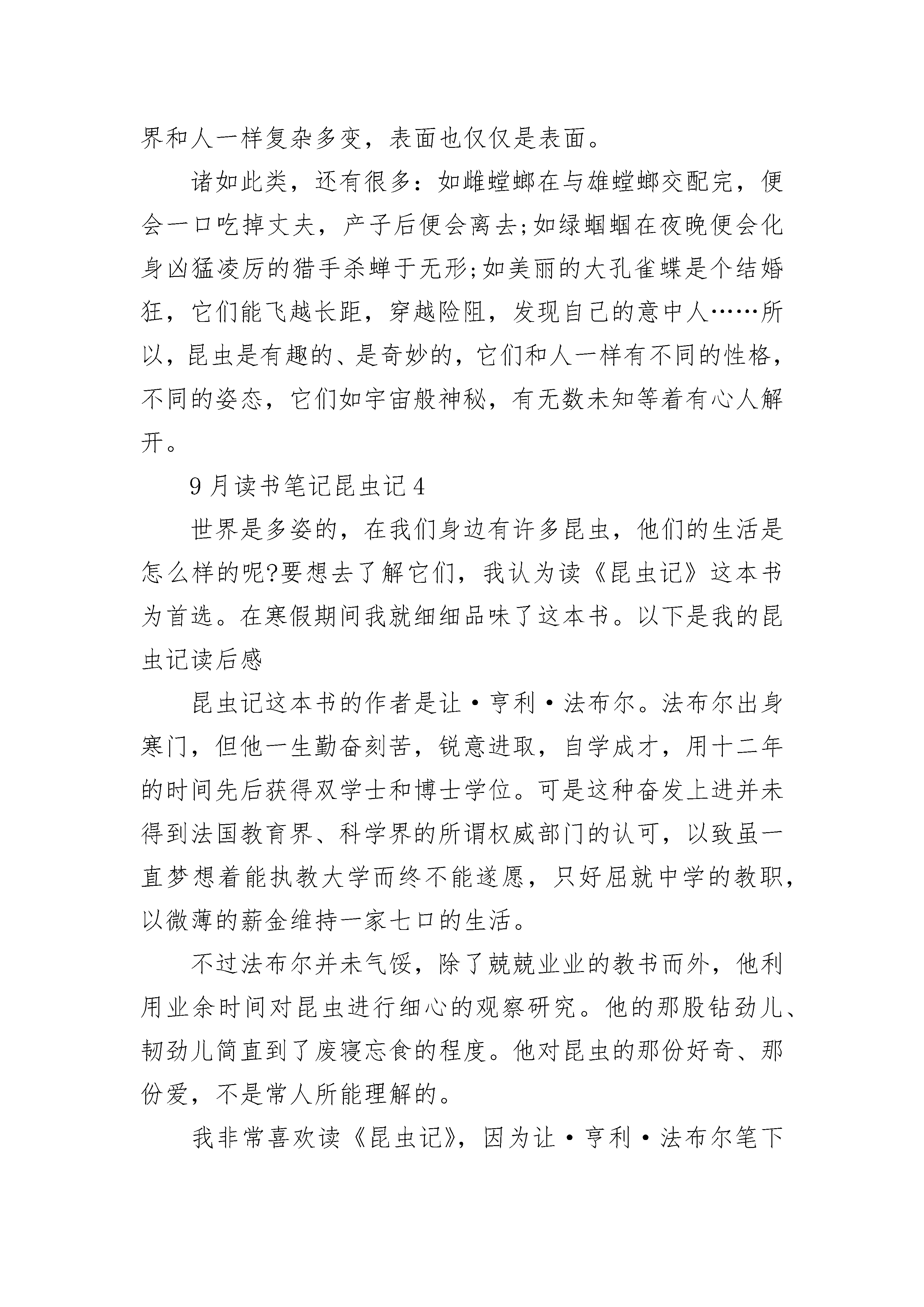 9月读书笔记昆虫记9月读书笔记昆虫记1近期,我读了本书,名为《昆虫记》。《昆虫记》是以昆虫为例,详细介绍昆虫生长、发育、繁殖、衰落四个阶段的一部书。其作者法布尔是著名的法国昆虫学家、动物行为学家、作家。被世人称为“昆虫界的荷马”、“昆虫界的维吉尔”。他用攒下的钱,买了一处坐落在荒地上的老旧民宅,取名“荒石园”,并在其中进行了长达三十多年的对昆虫的观察,并撰写了《昆虫记》。《昆虫记》共分十卷,介绍描写了蟋蟀、螳螂、蜘蛛等动物昆虫,用优美的手法,细致地描述出昆虫生活中的种.种趣事,生动活泼,富有个性。《昆虫记》中,对黄足飞蝗泥蜂的描写很具体,写了其生活、进攻和幼虫的生活。在黄足飞蝗泥蜂筑巢时,作者将其比喻成勤劳的矿工、工人、伐木工人等角色,生动形象,给我留下了深刻印象,我能感受到黄足飞蝗泥蜂勤劳工作的态度,作者对黄足飞蝗泥蜂的喜爱和赞美。在对黄足飞蝗泥蜂的进攻描写是,十分形象生动具体的描述了战斗过程,让人毛骨悚然,被黄足飞蝗泥蜂猎杀猎物时的残忍和凶狠而震惊。如:“蟋蟀被打得仰面朝天,足爪乱题,双颚乱咬”、“它反向趴在对手腹部,大颚咬住蟋蟀腹部末端一块肉,后足像两根杠杆似的按在蟋蟀面部”“第一下刺在被害者面部,第二下刺在前胸与中胸关节间,最后一下刺向蟋蟀的腹部”等,无不体现了黄足飞蝗泥蜂狩猎时的智慧、残忍和果断的性格。《昆虫记》中还记载了许多类似黄足飞蝗泥蜂这样生活的故事,生动形象的使人了解和感受到其描写昆虫的生活,让人感觉到仿佛故事就发生在眼前。《昆虫记》,这是一部昆虫百科全书,是一部优秀的文学著作,是一部不朽的昆虫学名著。9月读书笔记昆虫记2近期我读了《昆虫记》,这是法国著名作家法布尔写的,书中用细致的观察和生动的语言介绍了许多昆虫的习性,让原本对于昆虫有点怕怕的我,不禁爱上了昆虫,如饥似渴地一下子就读完了整本书。读了这本书让我很佩服作者的观察是如此的细致,为我打开了一个无所不知的昆虫世界。就拿萤火虫来说吧,在我的心里,萤火虫是一种小小的、可爱的昆虫。但是等我看了法布尔的介绍,我对小小的萤火虫改观了,原来它也有狡猾、残忍的一面。萤火虫的进餐方式让我大吃一惊,他通常吃的跟他差不多大,甚至比它大的蜗牛。相信读到这里,你们一定和我一样都很吃惊,比萤火虫大的蜗牛是怎么被它吃掉的呢?原来萤火虫用奇特的工具反复轻轻敲打着蜗牛的外壳,就好像在和蜗牛逗着玩,而不是蜇咬。等到蜗牛没有防备的时候,快速地利用带槽的弯钩把毒汁弄到蜗牛身上,蜗牛化成了液态,最后萤火虫一口吸掉了蜗牛。读到这里我不仅惊叹昆虫界是这样的不可思议。更不可思议的是法布尔能将萤火虫观察的如此细微,可见他是花了多少心思啊!读了这本书,我从法布尔的身上学到了,做任何事情都要认真、减持、还要仔细,才能完成生活中的每一件事情,才能把每件事情做的更好。9月读书笔记昆虫记3夏天,我们与阳光作伴,与树木和草地作伴,夜晚的凉风,风吹树响的声音,雨滴掉落的声音,鸟儿啁啾的声音一切都丰富有趣。当然,也少不了虫鸣声。在这边土地上,生物遍地,昆虫便是生活中的一员,常见却不引人注目,人们只注意到它们的存在,却不知昆虫也有自己的天下。蚂蚁,我想大家都耳熟能详了,勤劳的工作者,团结的大集体,搬家的小能手,但又有谁知道勤劳朴实的背后真面目却是一个“疯狂的掠夺者”呢?我想,书中便有一个典型的范例:7月,午后酷暑难耐,成群的昆虫寻找水源,而蝉则不屑一顾,用那如钻头般的细嘴,在自己那永不干涸的酒窖中钻了开来,慢慢享受这一美味的汁液。但好景不长,这一香味儿随风散入了各处。胡蜂,苍蝇,球螋,泥蜂,珠蜂还有蚂蚁。为了清泉,它们拼命挤上去嘬一口,然后飞一圈又更大胆地反回来。而蝉则抬爪方便他们通过。就这样,不速之客贪心越来越大,刚刚还谨小慎微的它们直接变成乱哄哄的侵略者,一心要把掘井者从井边驱逐。在这场战斗中,蚂蚁最属疯狂,它们撕蝉身,扯蝉爪,甚至爬至蛘的胡须,洋洋得意。蝉受不了,撒泡尿离去。而蚂蚁浑然不在乎,一旦有机会它们又会用相同的法子喝上几大口。所以昆虫的世界和人一样复杂多变,表面也仅仅是表面。诸如此类,还有很多:如雌螳螂在与雄螳螂交配完,便会一口吃掉丈夫,产子后便会离去;如绿蝈蝈在夜晚便会化身凶猛凌厉的猎手杀蝉于无形;如美丽的大孔雀蝶是个结婚狂,它们能飞越长距,穿越险阻,发现自己的意中人……所以,昆虫是有趣的、是奇妙的,它们和人一样有不同的性格,不同的姿态,它们如宇宙般神秘,有无数未知等着有心人解开。9月读书笔记昆虫记4世界是多姿的,在我们身边有许多昆虫,他们的生活是怎么样的呢?要想去了解它们,我认为读《昆虫记》这本书为首选。在寒假期间我就细细品味了这本书。以下是我的昆虫记读后感昆虫记这本书的作者是让·亨利·法布尔。法布尔出身寒门,但他一生勤奋刻苦,锐意进取,自学成才,用十二年的时间先后获得双学士和博士学位。可是这种