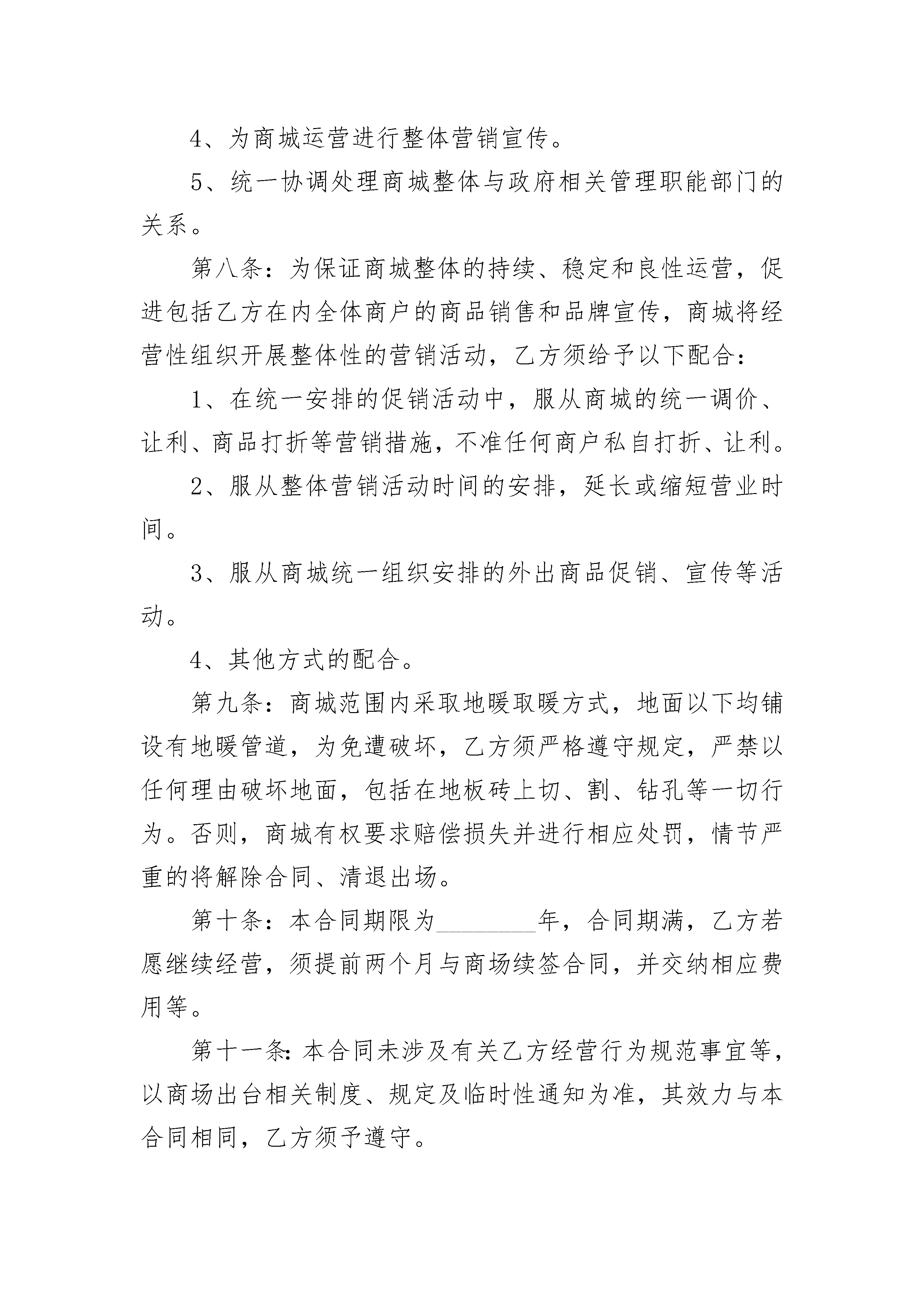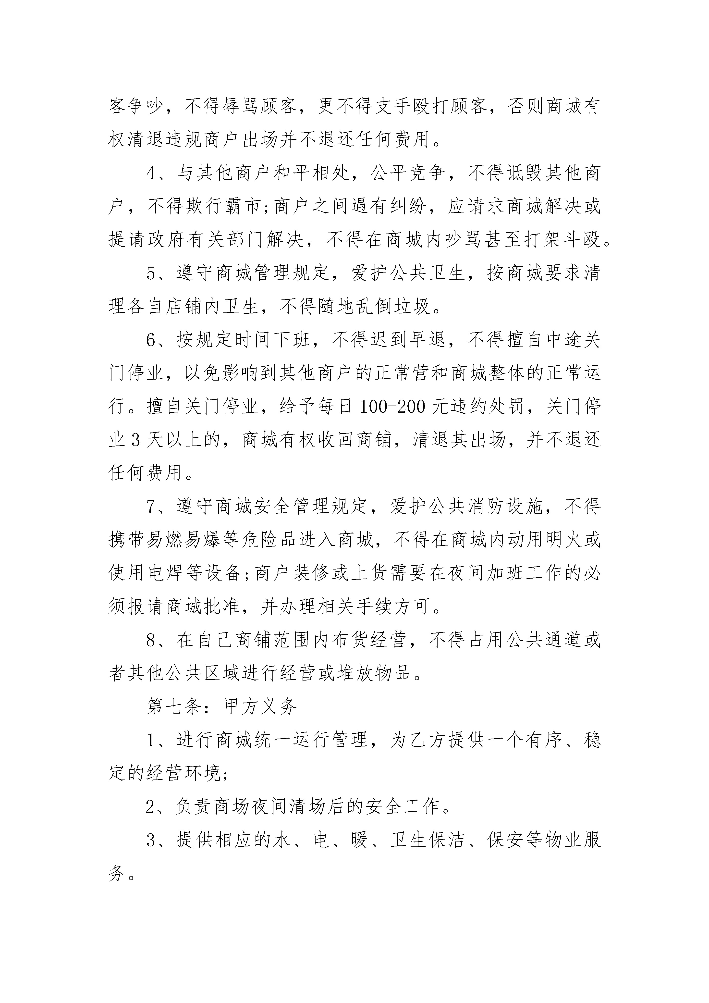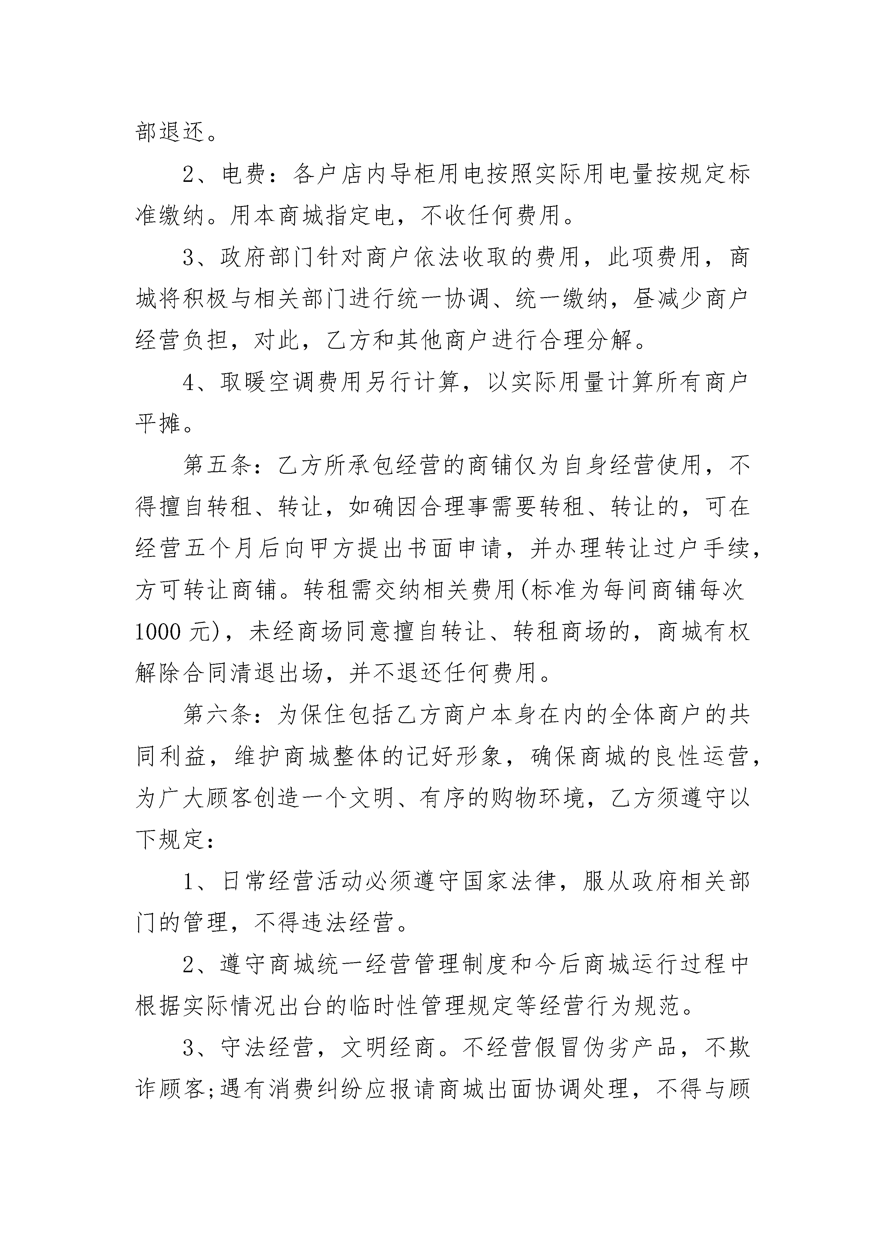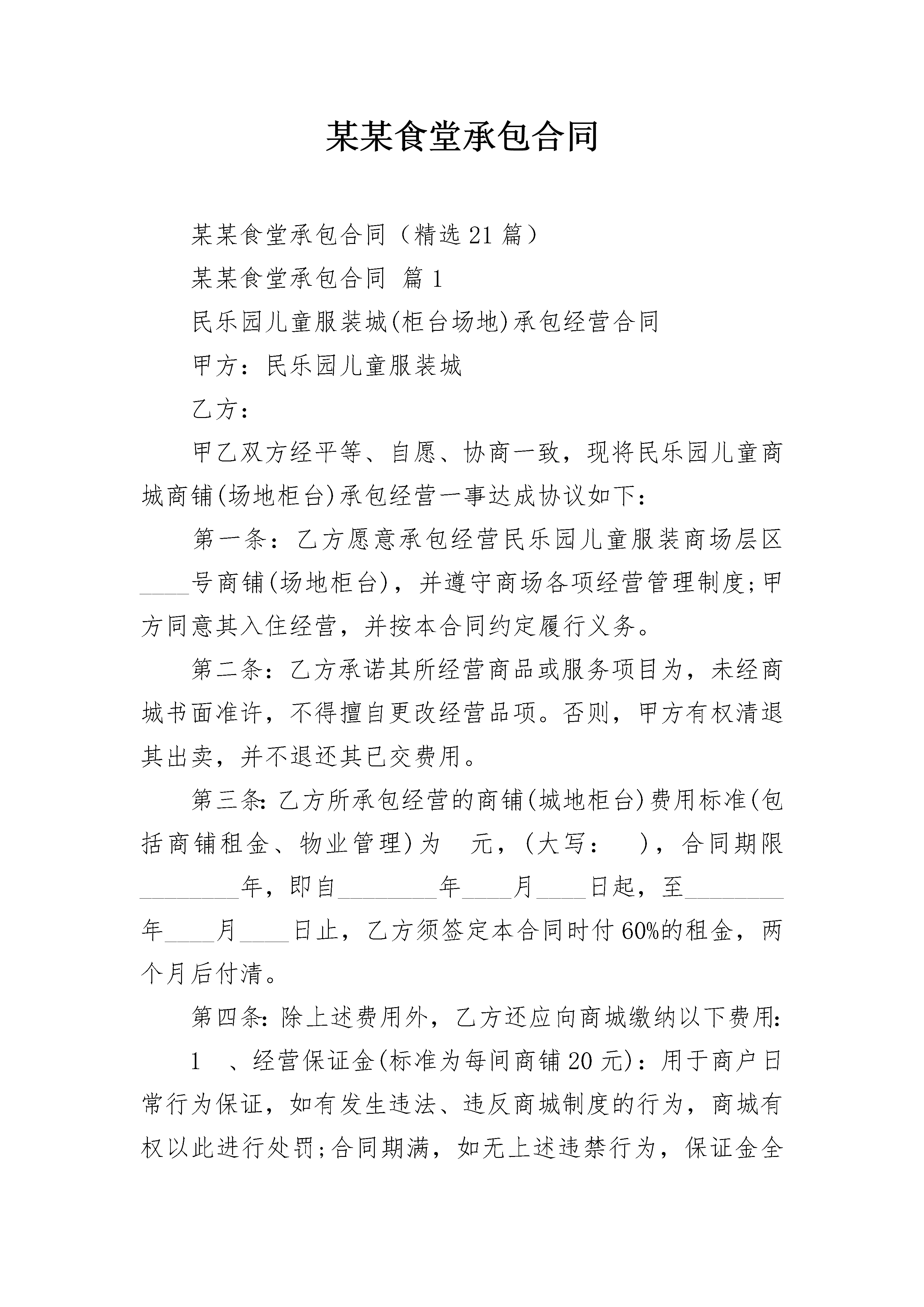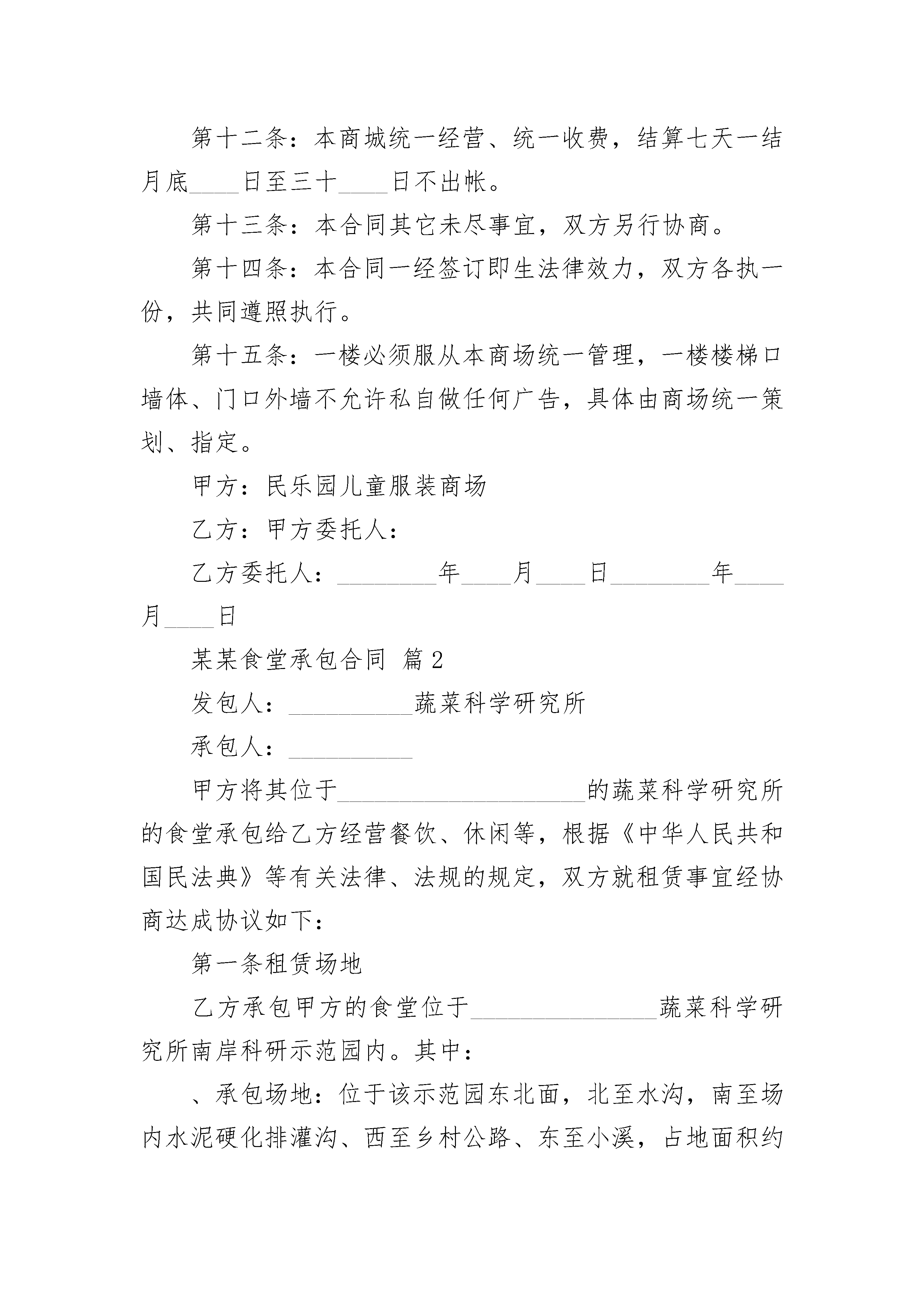 某某食堂承包合同某某食堂承包合同(精选21篇)某某食堂承包合同篇1民乐园儿童服装城(柜台场地)承包经营合同甲方:民乐园儿童服装城乙方:甲乙双方经平等、自愿、协商一致,现将民乐园儿童商城商铺(场地柜台)承包经营一事达成协议如下:第一条:乙方愿意承包经营民乐园儿童服装商场层区____号商铺(场地柜台),并遵守商场各项经营管理制度;甲方同意其入住经营,并按本合同约定履行义务。第二条:乙方承诺其所经营商品或服务项目为,未经商城书面准许,不得擅自更改经营品项。否则,甲方有权清退其出卖,并不退还其已交费用。第三条:乙方所承包经营的商铺(城地柜台)费用标准(包括商铺租金、物业管理)为元,(大写:),合同期限________年,即自________年____月____日起,至________年____月____日止,乙方须签定本合同时付60%的租金,两个月后付清。第四条:除上述费用外,乙方还应向商城缴纳以下费用:1、经营保证金(标准为每间商铺20元):用于商户日常行为保证,如有发生违法、违反商城制度的行为,商城有权以此进行处罚;合同期满,如无上述违禁行为,保证金全部退还。2、电费:各户店内导柜用电按照实际用电量按规定标准缴纳。用本商城指定电,不收任何费用。3、政府部门针对商户依法收取的费用,此项费用,商城将积极与相关部门进行统一协调、统一缴纳,昼减少商户经营负担,对此,乙方和其他商户进行合理分解。4、取暖空调费用另行计算,以实际用量计算所有商户平摊。第五条:乙方所承包经营的商铺仅为自身经营使用,不得擅自转租、转让,如确因合理事需要转租、转让的,可在经营五个月后向甲方提出书面申请,并办理转让过户手续,方可转让商铺。转租需交纳相关费用(标准为每间商铺每次1000元),未经商场同意擅自转让、转租商场的,商城有权解除合同清退出场,并不退还任何费用。第六条:为保住包括乙方商户本身在内的全体商户的共同利益,维护商城整体的记好形象,确保商城的良性运营,为广大顾客创造一个文明、有序的购物环境,乙方须遵守以下规定:1、日常经营活动必须遵守国家法律,服从政府相关部门的管理,不得违法经营。2、遵守商城统一经营管理制度和今后商城运行过程中根据实际情况出台的临时性管理规定等经营行为规范。3、守法经营,文明经商。不经营假冒伪劣产品,不欺诈顾客;遇有消费纠纷应报请商城出面协调处理,不得与顾客争吵,不得辱骂顾客,更不得支手殴打顾客,否则商城有权清退违规商户出场并不退还任何费用。4、与其他商户和平相处,公平竞争,不得诋毁其他商户,不得欺行霸市;商户之间遇有纠纷,应请求商城解决或提请政府有关部门解决,不得在商城内吵骂甚至打架斗殴。5、遵守商城管理规定,爱护公共卫生,按商城要求清理各自店铺内卫生,不得随地乱倒垃圾。6、按规定时间下班,不得迟到早退,不得擅自中途关门停业,以免影响到其他商户的正常营和商城整体的正常运行。擅自关门停业,给予每日100-200元违约处罚,关门停业3天以上的,商城有权收回商铺,清退其出场,并不退还任何费用。7、遵守商城安全管理规定,爱护公共消防设施,不得携带易燃易爆等危险品进入商城,不得在商城内动用明火或使用电焊等设备;商户装修或上货需要在夜间加班工作的必须报请商城批准,并办理相关手续方可。8、在自己商铺范围内布货经营,不得占用公共通道或者其他公共区域进行经营或堆放物品。第七条:甲方义务1、进行商城统一运行管理,为乙方提供一个有序、稳定的经营环境;2、负责商场夜间清场后的安全工作。3、提供相应的水、电、暖、卫生保洁、保安等物业服务。4、为商城运营进行整体营销宣传。5、统一协调处理商城整体与政府相关管理职能部门的关系。第八条:为保证商城整体的持续、稳定和良性运营,促进包括乙方在内全体商户的商品销售和品牌宣传,商城将经营性组织开展整体性的营销活动,乙方须给予以下配合:1、在统一安排的促销活动中,服从商城的统一调价、让利、商品打折等营销措施,不准任何商户私自打折、让利。2、服从整体营销活动时间的安排,延长或缩短营业时间。3、服从商城统一组织安排的外出商品促销、宣传等活动。4、其他方式的配合。第九条:商城范围内采取地暖取暖方式,地面以下均铺设有地暖管道,为免遭破坏,乙方须严格遵守规定,严禁以任何理由破坏地面,包括在地板砖上切、割、钻孔等一切行为。否则,商城有权要求赔偿损失并进行相应处罚,情节严重的将解除合同、清退出场。第十条:本合同期限为________年,合同期满,乙方若愿继续经营,须提前两个月与商场续签合同,并交纳相应费用等。第十一条:本合同未涉及有关乙方经营行为规范事宜等,以商场出台相关制度、规定及临时性通知为准,其效力与本合同相同,乙方须予遵守。第十二条:本商城统一经营、统一收费,结算七天一结月底____日至三十____日不出帐。第十三条:本合同