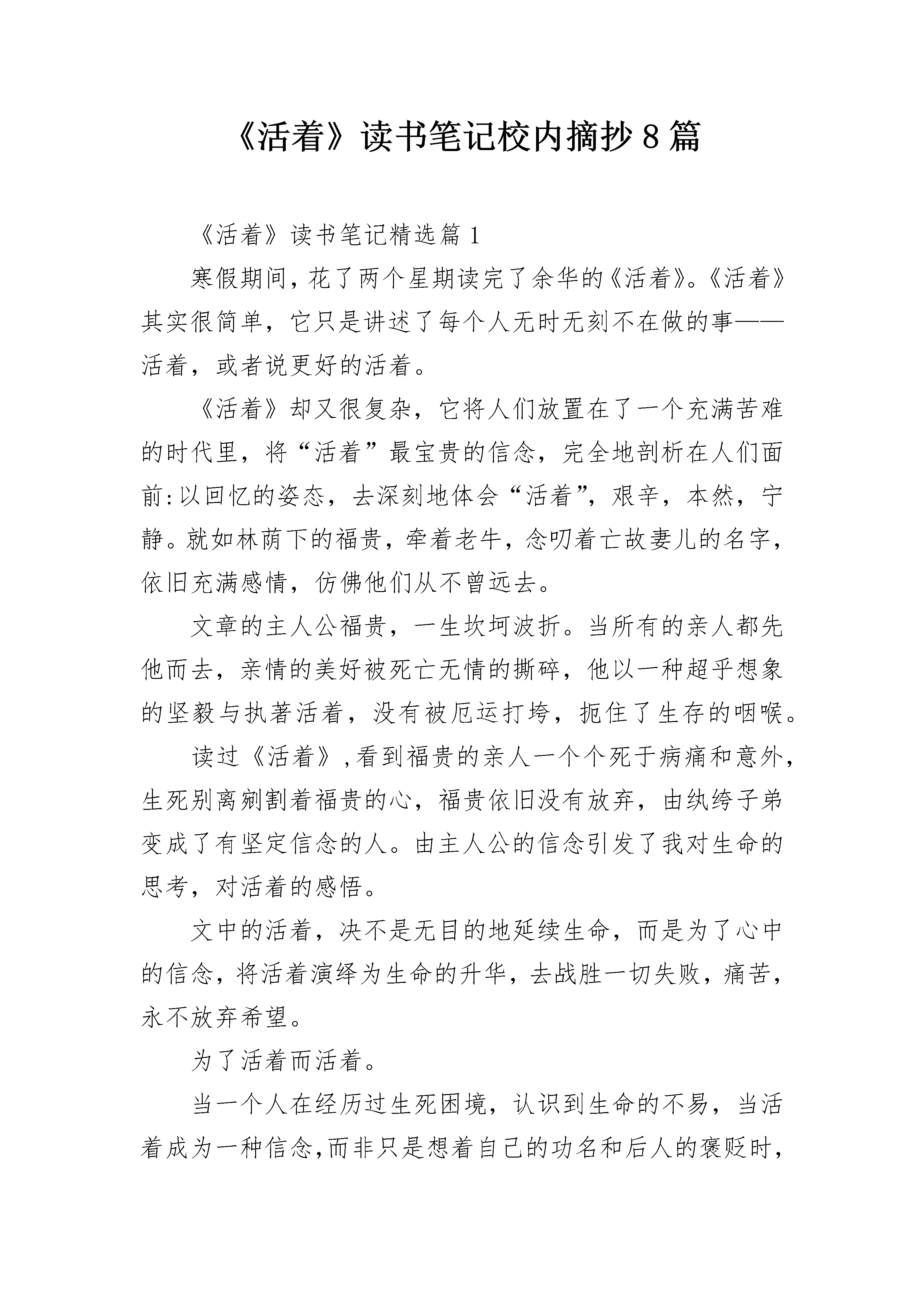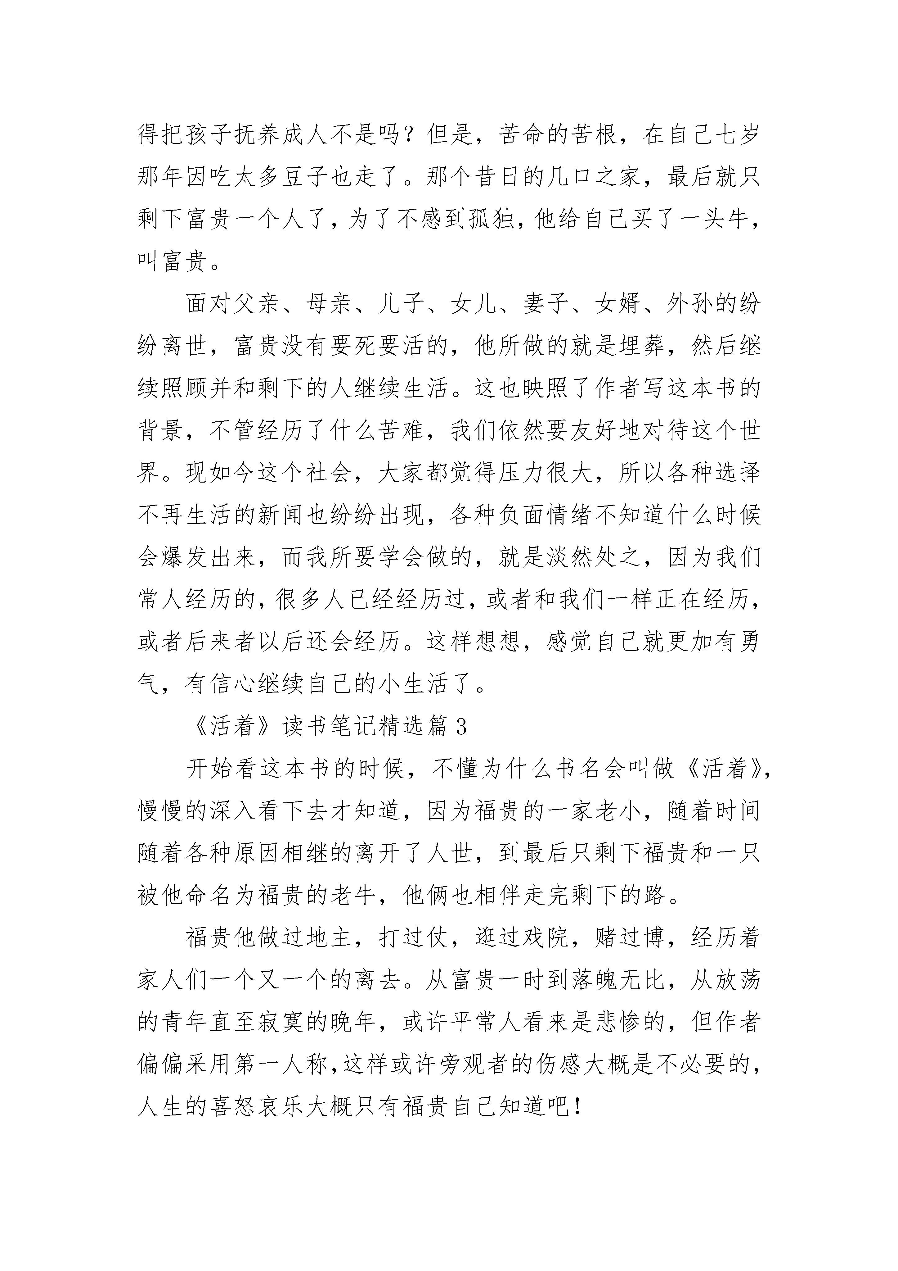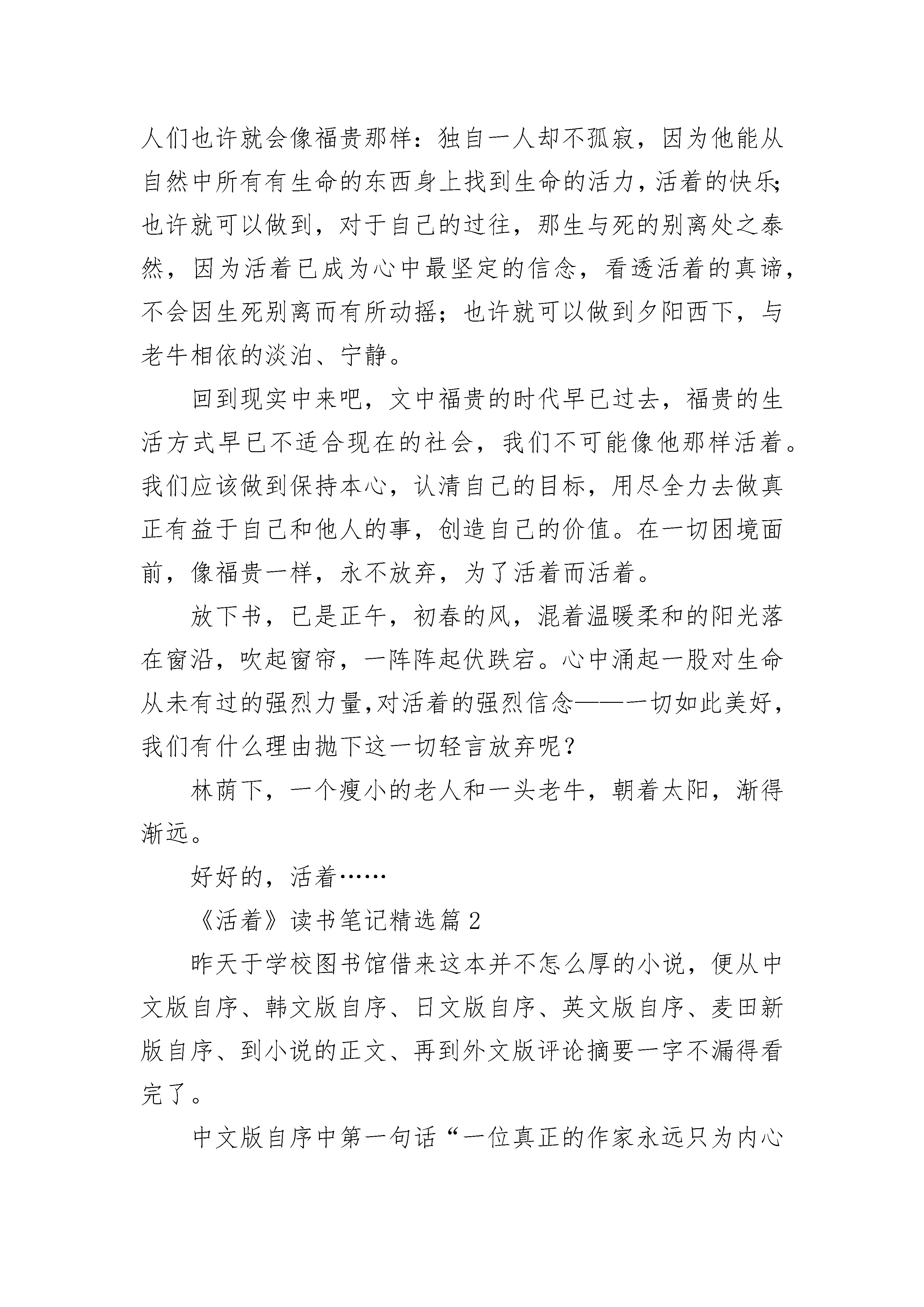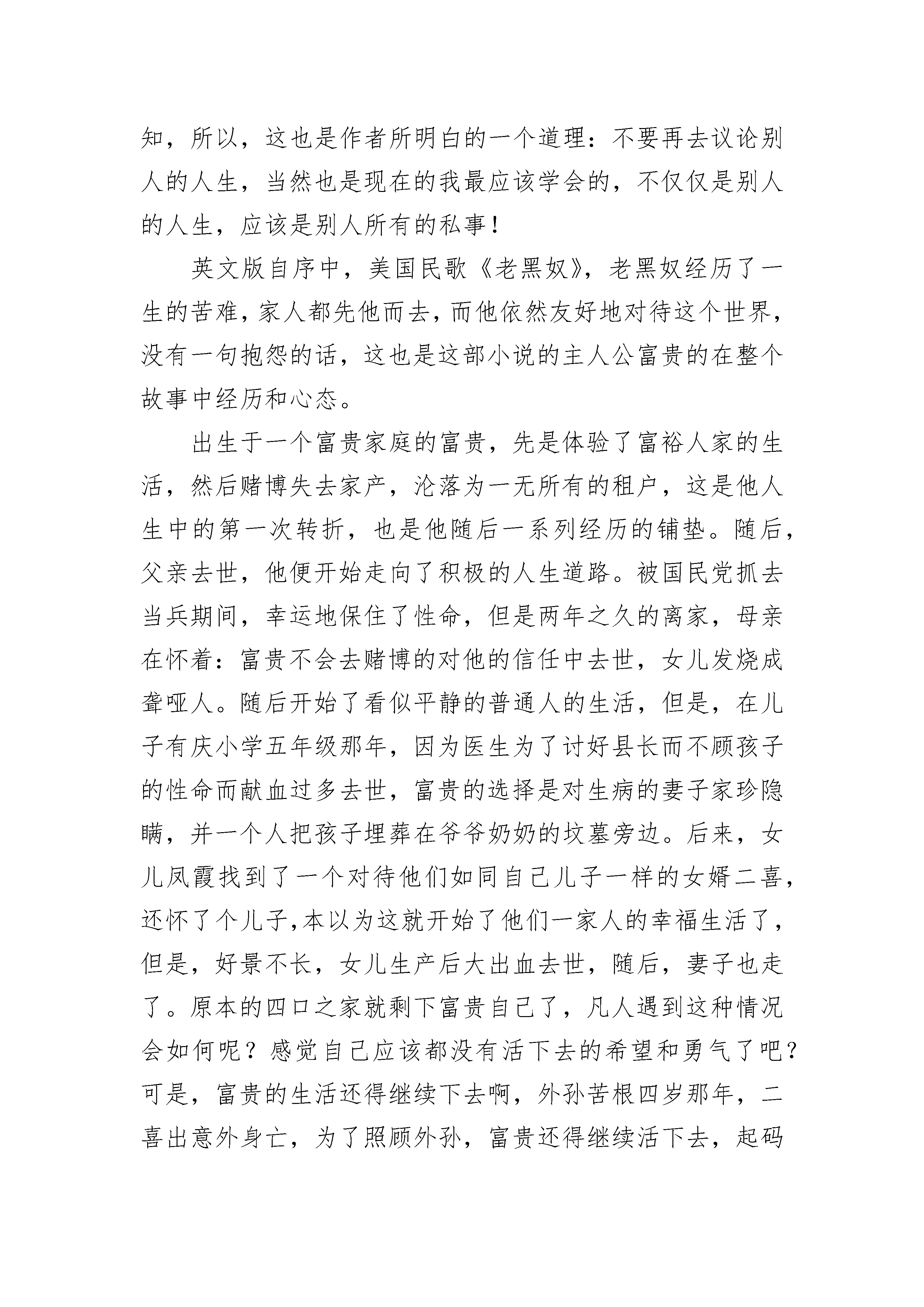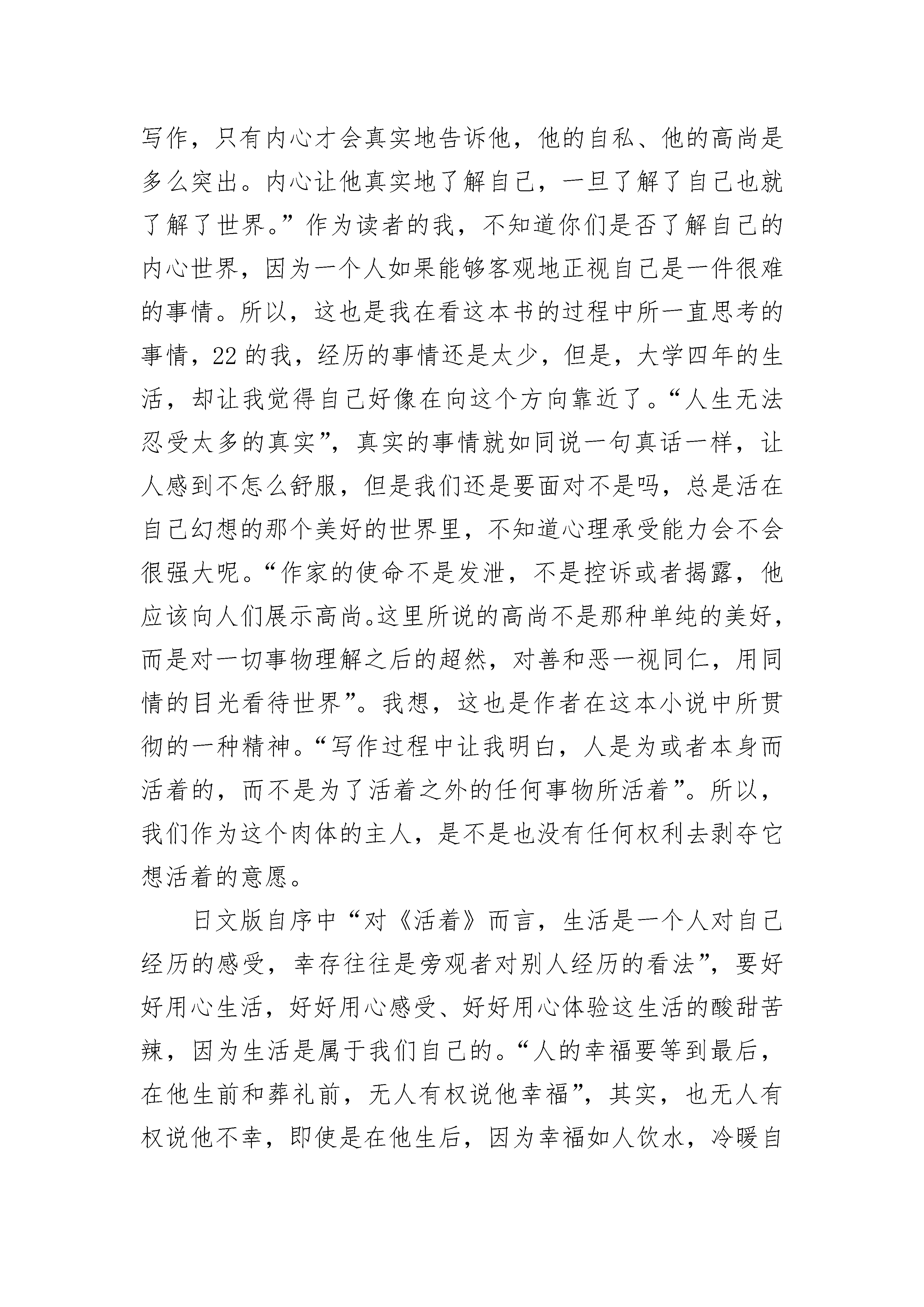 《活着》读书笔记校内摘抄8篇《活着》读书笔记精选篇1寒假期间,花了两个星期读完了余华的《活着》。《活着》其实很简单,它只是讲述了每个人无时无刻不在做的事——活着,或者说更好的活着。《活着》却又很复杂,它将人们放置在了一个充满苦难的时代里,将“活着”最宝贵的信念,完全地剖析在人们面前:以回忆的姿态,去深刻地体会“活着”,艰辛,本然,宁静。就如林荫下的福贵,牵着老牛,念叨着亡故妻儿的名字,依旧充满感情,仿佛他们从不曾远去。文章的主人公福贵,一生坎坷波折。当所有的亲人都先他而去,亲情的美好被死亡无情的撕碎,他以一种超乎想象的坚毅与执著活着,没有被厄运打垮,扼住了生存的咽喉。读过《活着》,看到福贵的亲人一个个死于病痛和意外,生死别离剜割着福贵的心,福贵依旧没有放弃,由纨绔子弟变成了有坚定信念的人。由主人公的信念引发了我对生命的思考,对活着的感悟。文中的活着,决不是无目的地延续生命,而是为了心中的信念,将活着演绎为生命的升华,去战胜一切失败,痛苦,永不放弃希望。为了活着而活着。当一个人在经历过生死困境,认识到生命的不易,当活着成为一种信念,而非只是想着自己的功名和后人的褒贬时,人们也许就会像福贵那样:独自一人却不孤寂,因为他能从自然中所有有生命的东西身上找到生命的活力,活着的快乐;也许就可以做到,对于自己的过往,那生与死的别离处之泰然,因为活着已成为心中最坚定的信念,看透活着的真谛,不会因生死别离而有所动摇;也许就可以做到夕阳西下,与老牛相依的淡泊、宁静。回到现实中来吧,文中福贵的时代早已过去,福贵的生活方式早已不适合现在的社会,我们不可能像他那样活着。我们应该做到保持本心,认清自己的目标,用尽全力去做真正有益于自己和他人的事,创造自己的价值。在一切困境面前,像福贵一样,永不放弃,为了活着而活着。放下书,已是正午,初春的风,混着温暖柔和的阳光落在窗沿,吹起窗帘,一阵阵起伏跌宕。心中涌起一股对生命从未有过的强烈力量,对活着的强烈信念——一切如此美好,我们有什么理由抛下这一切轻言放弃呢?林荫下,一个瘦小的老人和一头老牛,朝着太阳,渐得渐远。好好的,活着……《活着》读书笔记精选篇2昨天于学校图书馆借来这本并不怎么厚的小说,便从中文版自序、韩文版自序、日文版自序、英文版自序、麦田新版自序、到小说的正文、再到外文版评论摘要一字不漏得看完了。中文版自序中第一句话“一位真正的作家永远只为内心写作,只有内心才会真实地告诉他,他的自私、他的高尚是多么突出。内心让他真实地了解自己,一旦了解了自己也就了解了世界。”作为读者的我,不知道你们是否了解自己的内心世界,因为一个人如果能够客观地正视自己是一件很难的事情。所以,这也是我在看这本书的过程中所一直思考的事情,22的我,经历的事情还是太少,但是,大学四年的生活,却让我觉得自己好像在向这个方向靠近了。“人生无法忍受太多的真实”,真实的事情就如同说一句真话一样,让人感到不怎么舒服,但是我们还是要面对不是吗,总是活在自己幻想的那个美好的世界里,不知道心理承受能力会不会很强大呢。“作家的使命不是发泄,不是控诉或者揭露,他应该向人们展示高尚。这里所说的高尚不是那种单纯的美好,而是对一切事物理解之后的超然,对善和恶一视同仁,用同情的目光看待世界”。我想,这也是作者在这本小说中所贯彻的一种精神。“写作过程中让我明白,人是为或者本身而活着的,而不是为了活着之外的任何事物所活着”。所以,我们作为这个肉体的主人,是不是也没有任何权利去剥夺它想活着的意愿。日文版自序中“对《活着》而言,生活是一个人对自己经历的感受,幸存往往是旁观者对别人经历的看法”,要好好用心生活,好好用心感受、好好用心体验这生活的酸甜苦辣,因为生活是属于我们自己的。“人的幸福要等到最后,在他生前和葬礼前,无人有权说他幸福”,其实,也无人有权说他不幸,即使是在他生后,因为幸福如人饮水,冷暖自知,所以,这也是作者所明白的一个道理:不要再去议论别人的人生,当然也是现在的我最应该学会的,不仅仅是别人的人生,应该是别人所有的私事!英文版自序中,美国民歌《老黑奴》,老黑奴经历了一生的苦难,家人都先他而去,而他依然友好地对待这个世界,没有一句抱怨的话,这也是这部小说的主人公富贵的在整个故事中经历和心态。出生于一个富贵家庭的富贵,先是体验了富裕人家的生活,然后赌博失去家产,沦落为一无所有的租户,这是他人生中的第一次转折,也是他随后一系列经历的铺垫。随后,父亲去世,他便开始走向了积极的人生道路。被国民党抓去当兵期间,幸运地保住了性命,但是两年之久的离家,母亲在怀着:富贵不会去赌博的对他的信任中去世,女儿发烧成聋哑人。随后开始了看似平静的普通人的生活,但是,在儿子有庆小学五年级那年,因为医生为了讨好县长而不顾孩子的性命而献血过多去世,富贵的选择是对生病的妻子家珍隐瞒,并一个人把