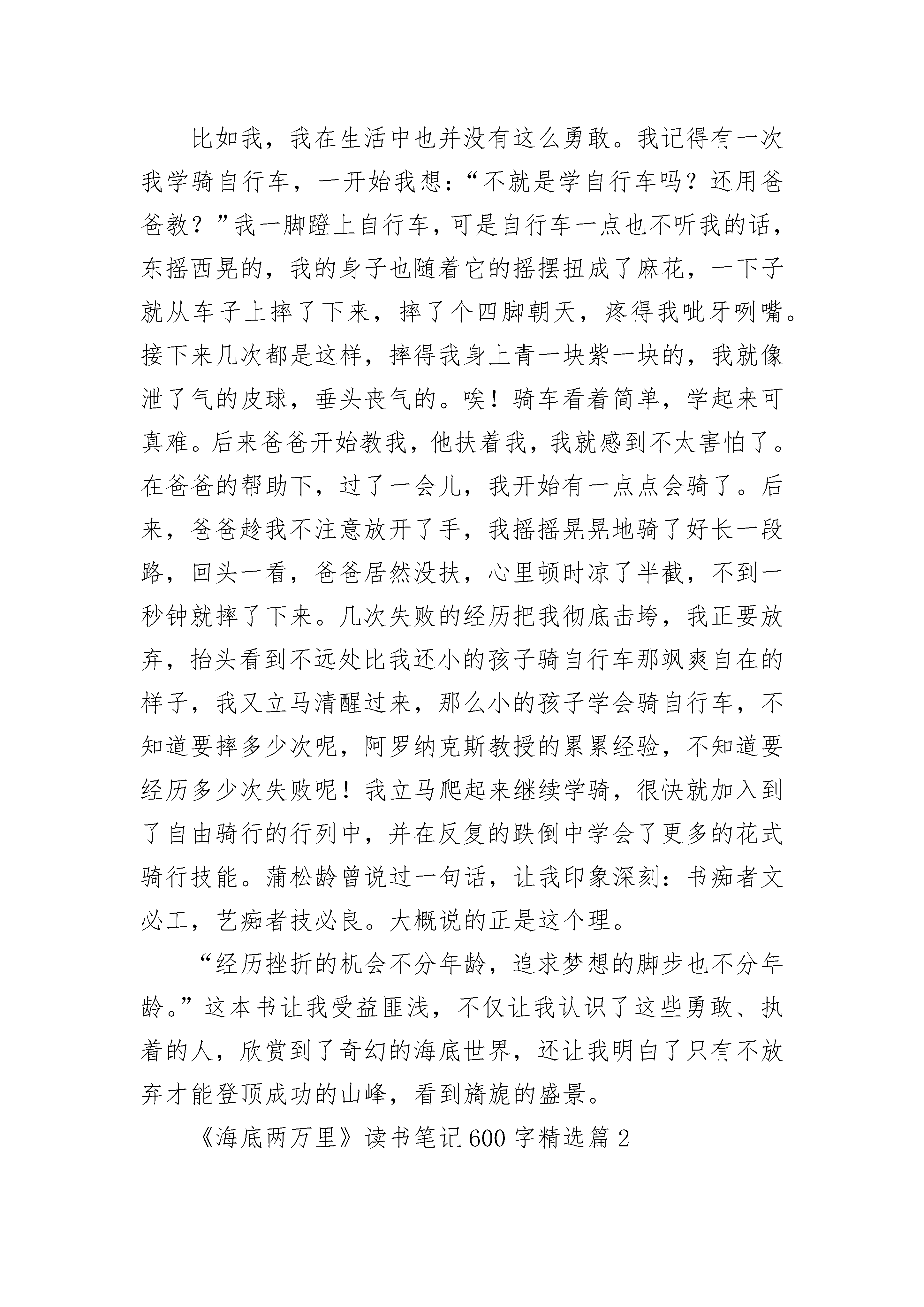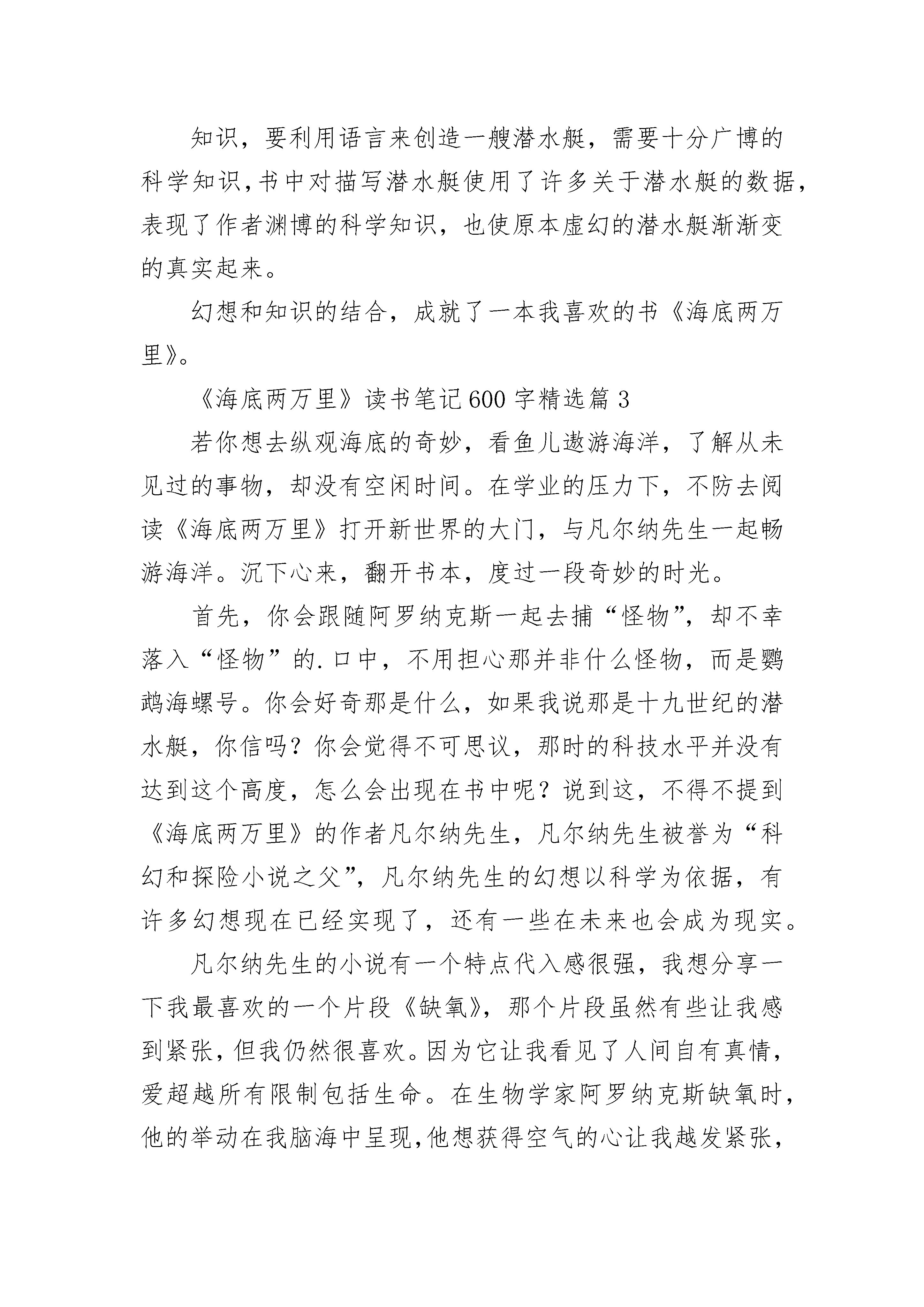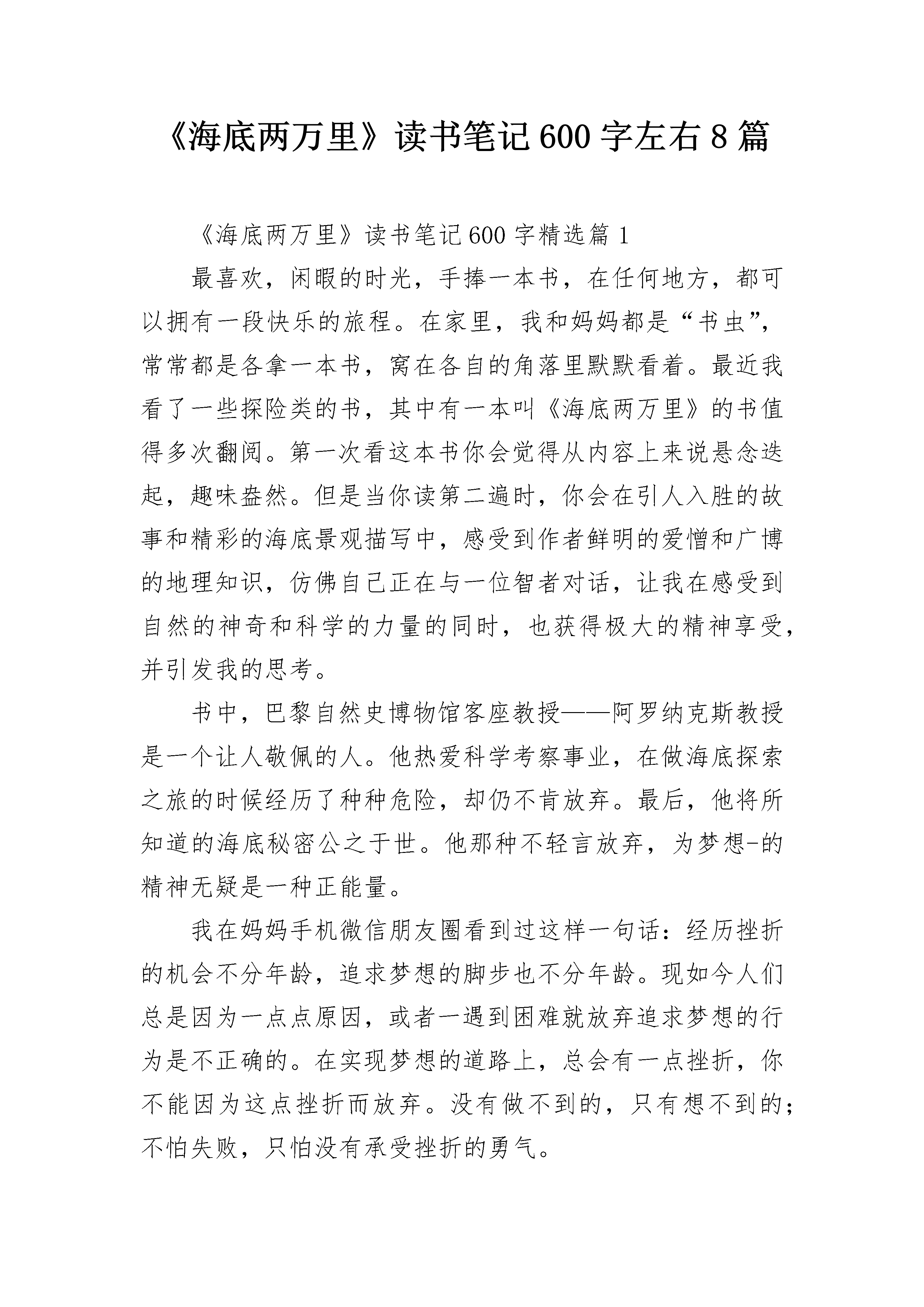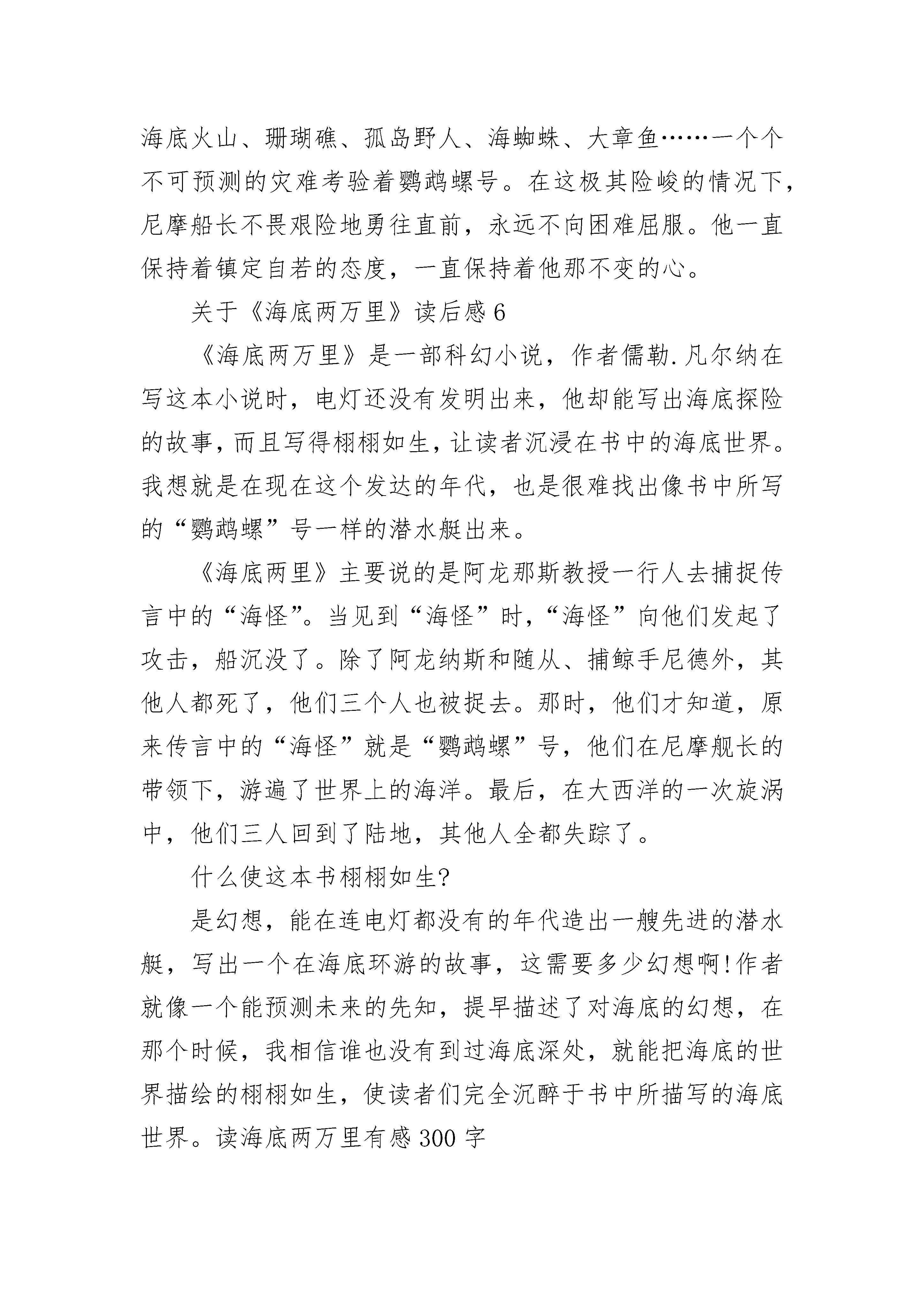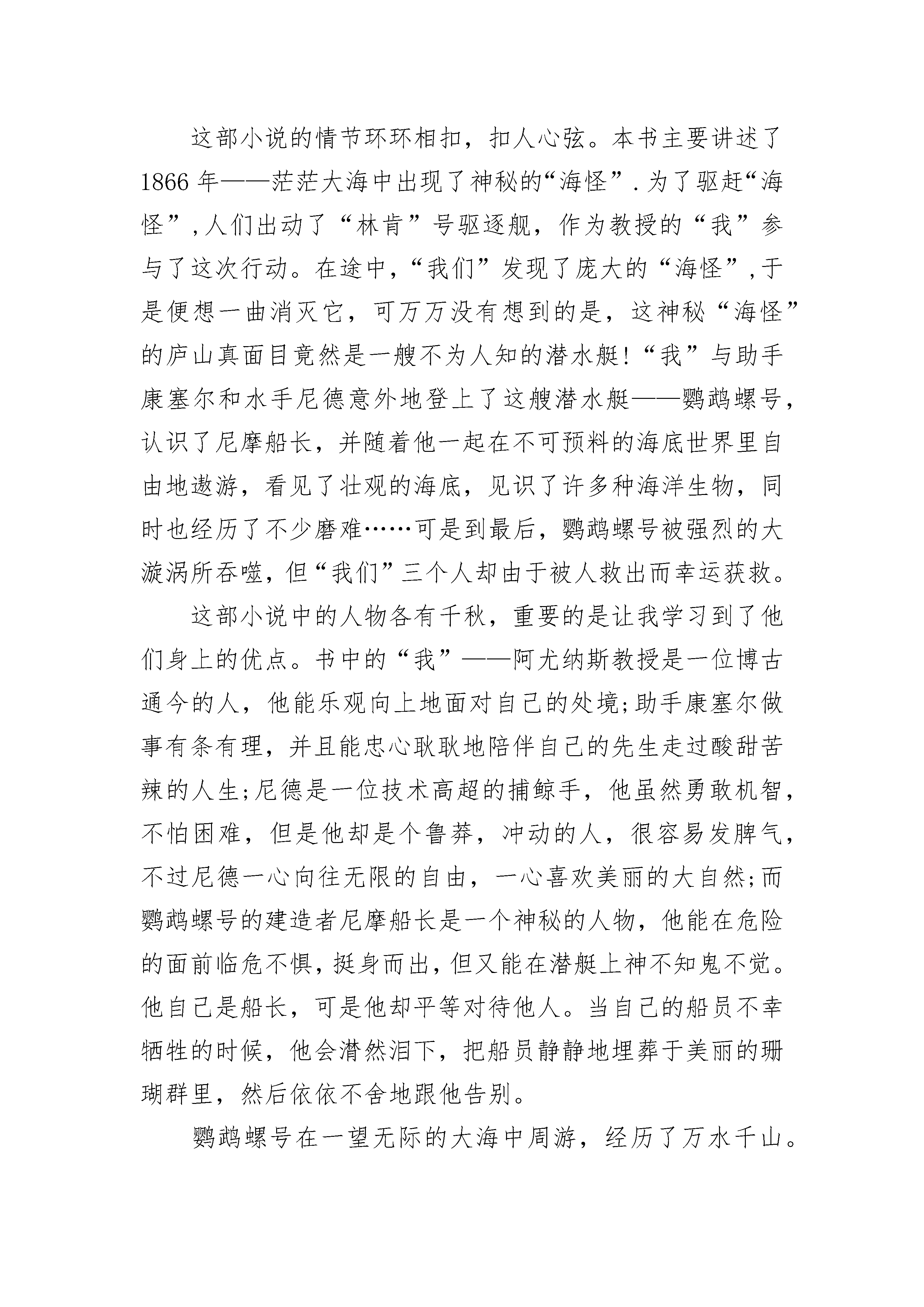 《海底两万里》读书笔记600字左右8篇《海底两万里》读书笔记600字精选篇1最喜欢,闲暇的时光,手捧一本书,在任何地方,都可以拥有一段快乐的旅程。在家里,我和妈妈都是“书虫”,常常都是各拿一本书,窝在各自的角落里默默看着。最近我看了一些探险类的书,其中有一本叫《海底两万里》的书值得多次翻阅。第一次看这本书你会觉得从内容上来说悬念迭起,趣味盎然。但是当你读第二遍时,你会在引人入胜的故事和精彩的海底景观描写中,感受到作者鲜明的爱憎和广博的地理知识,仿佛自己正在与一位智者对话,让我在感受到自然的神奇和科学的力量的同时,也获得极大的精神享受,并引发我的思考。书中,巴黎自然史博物馆客座教授——阿罗纳克斯教授是一个让人敬佩的人。他热爱科学考察事业,在做海底探索之旅的时候经历了种种危险,却仍不肯放弃。最后,他将所知道的海底秘密公之于世。他那种不轻言放弃,为梦想-的精神无疑是一种正能量。我在妈妈手机微信朋友圈看到过这样一句话:经历挫折的机会不分年龄,追求梦想的脚步也不分年龄。现如今人们总是因为一点点原因,或者一遇到困难就放弃追求梦想的行为是不正确的。在实现梦想的道路上,总会有一点挫折,你不能因为这点挫折而放弃。没有做不到的,只有想不到的;不怕失败,只怕没有承受挫折的勇气。比如我,我在生活中也并没有这么勇敢。我记得有一次我学骑自行车,一开始我想:“不就是学自行车吗?还用爸爸教?”我一脚蹬上自行车,可是自行车一点也不听我的话,东摇西晃的,我的身子也随着它的摇摆扭成了麻花,一下子就从车子上摔了下来,摔了个四脚朝天,疼得我呲牙咧嘴。接下来几次都是这样,摔得我身上青一块紫一块的,我就像泄了气的皮球,垂头丧气的。唉!骑车看着简单,学起来可真难。后来爸爸开始教我,他扶着我,我就感到不太害怕了。在爸爸的帮助下,过了一会儿,我开始有一点点会骑了。后来,爸爸趁我不注意放开了手,我摇摇晃晃地骑了好长一段路,回头一看,爸爸居然没扶,心里顿时凉了半截,不到一秒钟就摔了下来。几次失败的经历把我彻底击垮,我正要放弃,抬头看到不远处比我还小的孩子骑自行车那飒爽自在的样子,我又立马清醒过来,那么小的孩子学会骑自行车,不知道要摔多少次呢,阿罗纳克斯教授的累累经验,不知道要经历多少次失败呢!我立马爬起来继续学骑,很快就加入到了自由骑行的行列中,并在反复的跌倒中学会了更多的花式骑行技能。蒲松龄曾说过一句话,让我印象深刻:书痴者文必工,艺痴者技必良。大概说的正是这个理。“经历挫折的机会不分年龄,追求梦想的脚步也不分年龄。”这本书让我受益匪浅,不仅让我认识了这些勇敢、执着的人,欣赏到了奇幻的海底世界,还让我明白了只有不放弃才能登顶成功的山峰,看到旖旎的盛景。《海底两万里》读书笔记600字精选篇2这部小说的情节环环相扣,扣人心弦。本书主要讲述了1866年——茫茫大海中出现了神秘的“海怪”.为了驱赶“海怪”,人们出动了“林肯”号驱逐舰,作为教授的“我”参与了这次行动。在途中,“我们”发现了庞大的“海怪”,于是便想一曲消灭它,可万万没有想到的是,这神秘“海怪”的庐山真面目竟然是一艘不为人知的潜水艇!“我”与助手康塞尔和水手尼德意外地登上了这艘潜水艇——鹦鹉螺号,认识了尼摩船长,并随着他一起在不可预料的海底世界里自由地遨游,看见了壮观的海底,见识了许多种海洋生物,同时也经历了不少磨难……可是到最后,鹦鹉螺号被强烈的大漩涡所吞噬,但“我们”三个人却由于被人救出而幸运获救。这部小说中的人物各有千秋,重要的是让我学习到了他们身上的优点。书中的“我”——阿尤纳斯教授是一位博古通今的人,他能乐观向上地面对自己的处境;助手康塞尔做事有条有理,并且能忠心耿耿地陪伴自己的先生走过酸甜苦辣的人生;尼德是一位技术高超的捕鲸手,他虽然勇敢机智,不怕困难,但是他却是个鲁莽,冲动的人,很容易发脾气,不过尼德一心向往无限的自由,一心喜欢美丽的大自然;而鹦鹉螺号的建造者尼摩船长是一个神秘的人物,他能在危险的面前临危不惧,挺身而出,但又能在潜艇上神不知鬼不觉。他自己是船长,可是他却平等对待他人。当自己的船员不幸牺牲的时候,他会潸然泪下,把船员静静地埋葬于美丽的珊瑚群里,然后依依不舍地跟他告别。鹦鹉螺号在一望无际的大海中周游,经历了万水千山。海底火山、珊瑚礁、孤岛野人、海蜘蛛、大章鱼……一个个不可预测的灾难考验着鹦鹉螺号。在这极其险峻的情况下,尼摩船长不畏艰险地勇往直前,永远不向困难屈服。他一直保持着镇定自若的态度,一直保持着他那不变的心。关于《海底两万里》读后感6《海底两万里》是一部科幻小说,作者儒勒.凡尔纳在写这本小说时,电灯还没有发明出来,他却能写出海底探险的故事,而且写得栩栩如生,让读者沉浸在书中的海底世界。我想就是在现在这个发达的年代,也是很难找出像书中所写的“鹦鹉螺”号一样的潜水艇出来。《海底两里》主要说的是阿