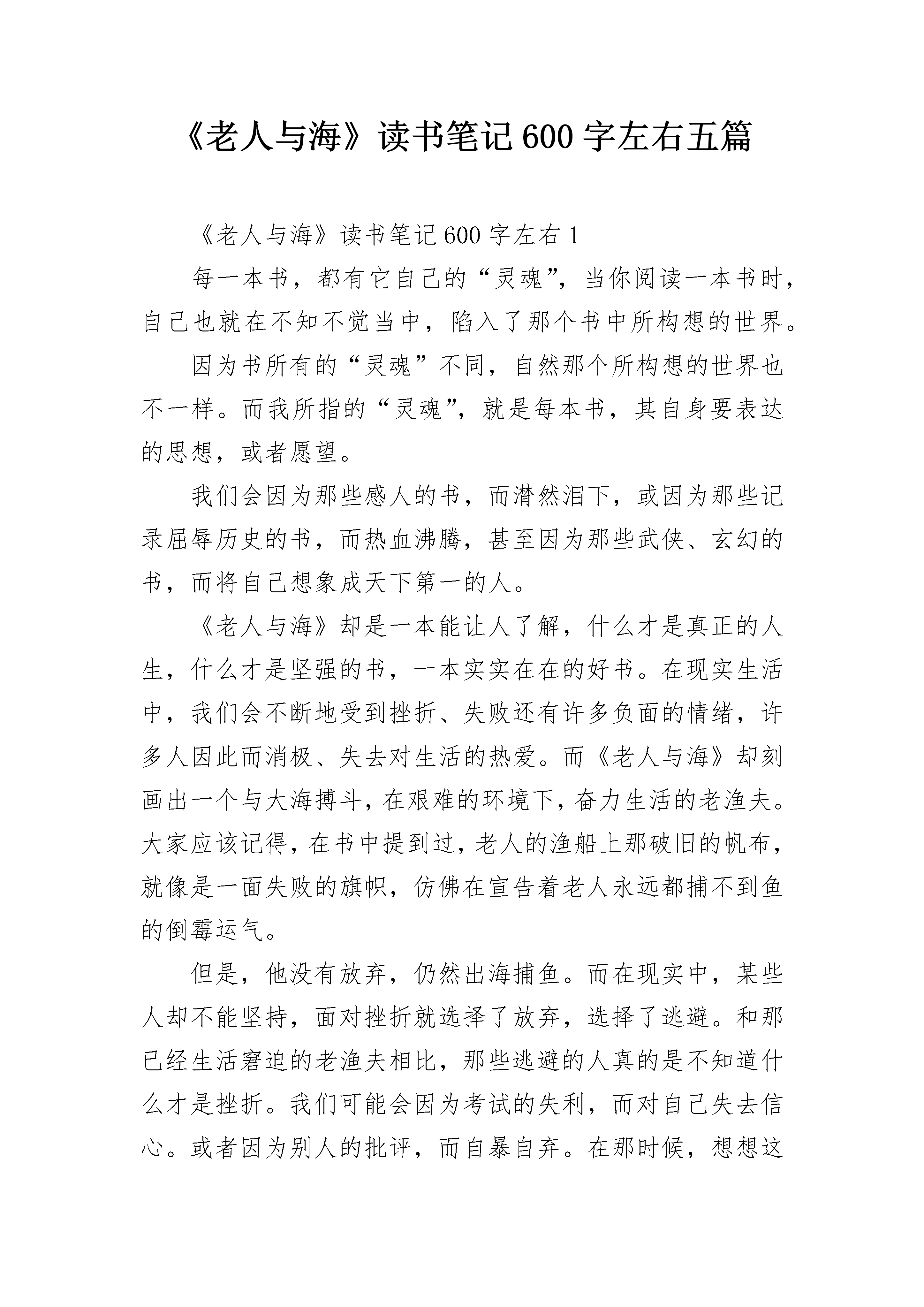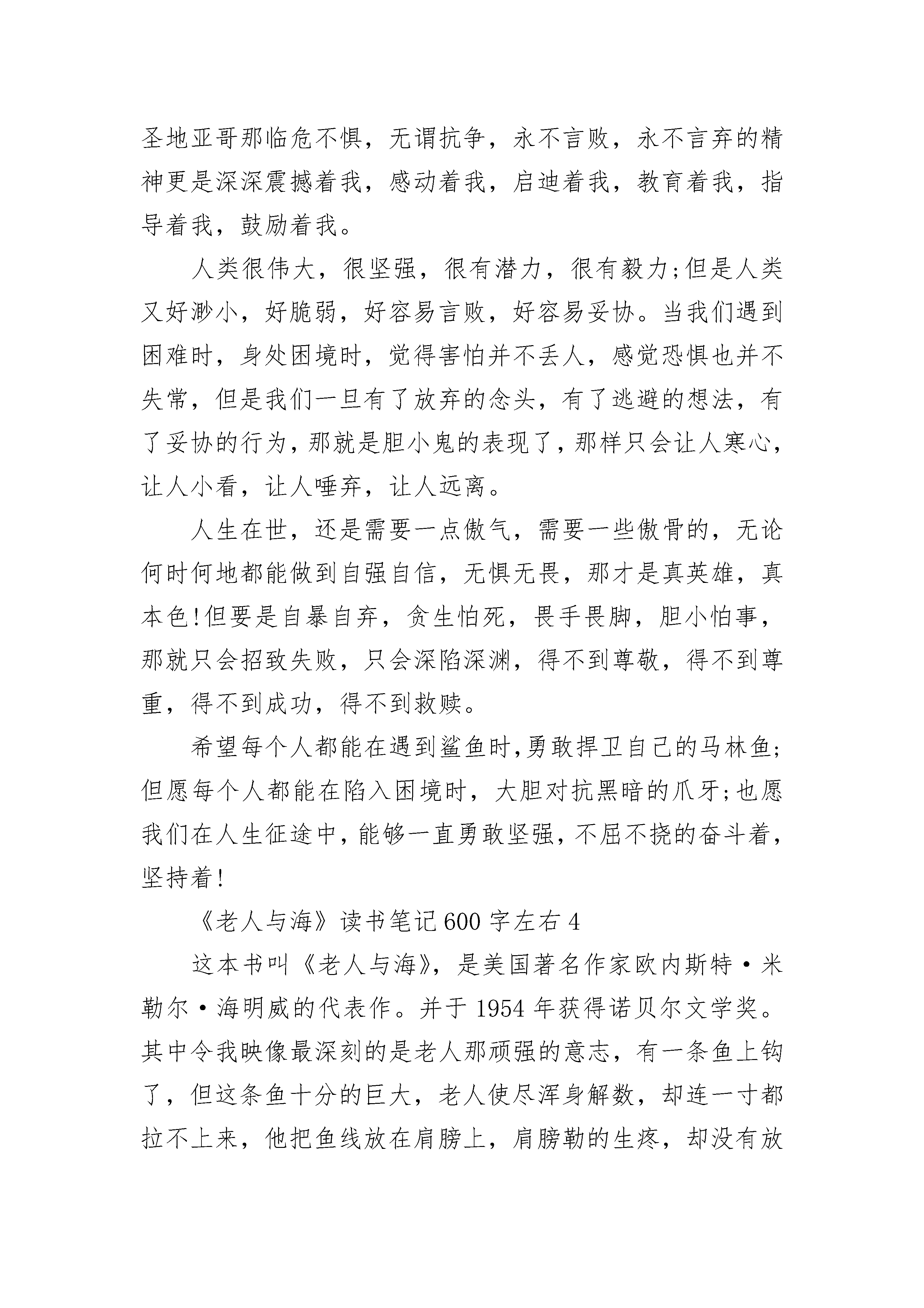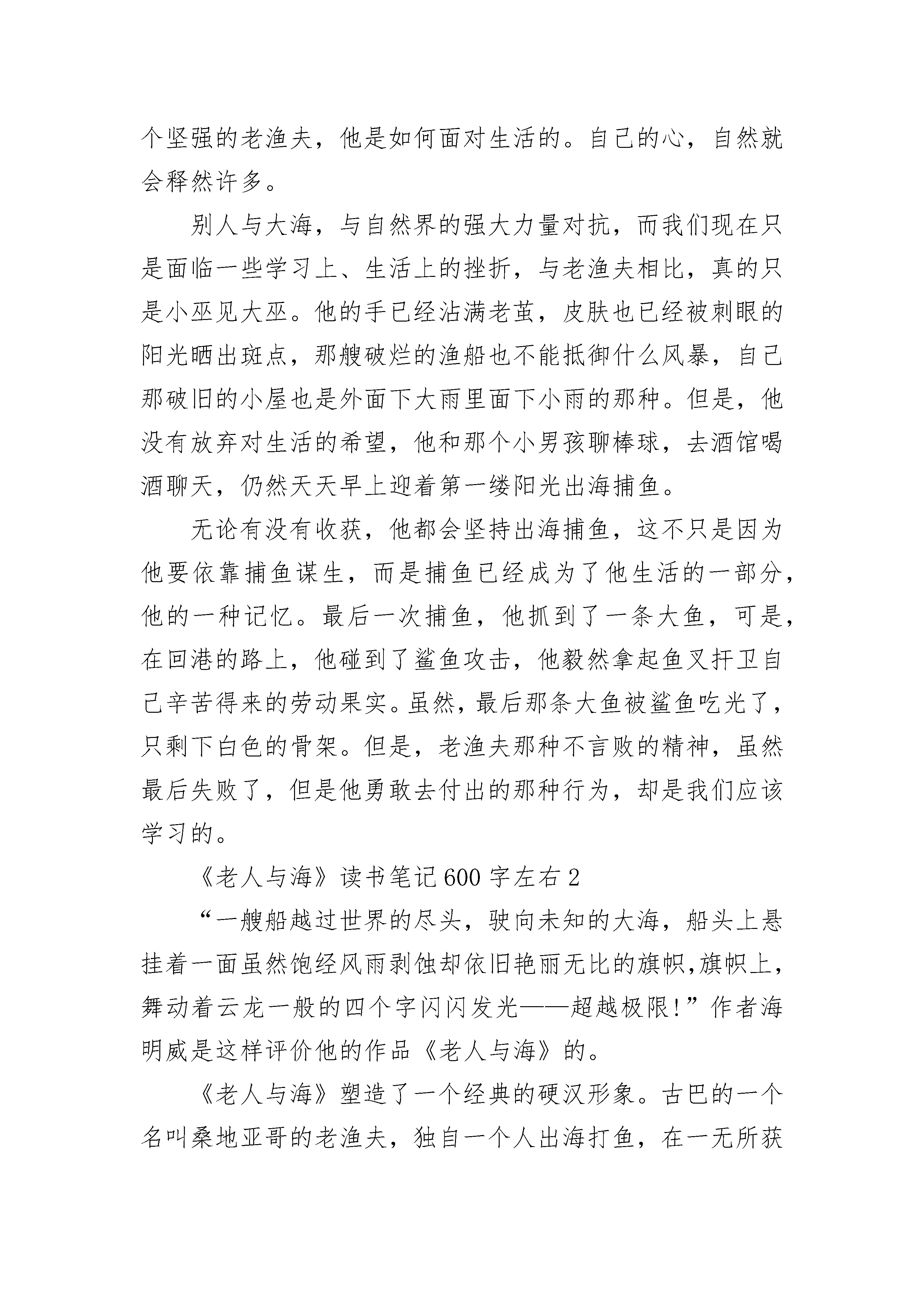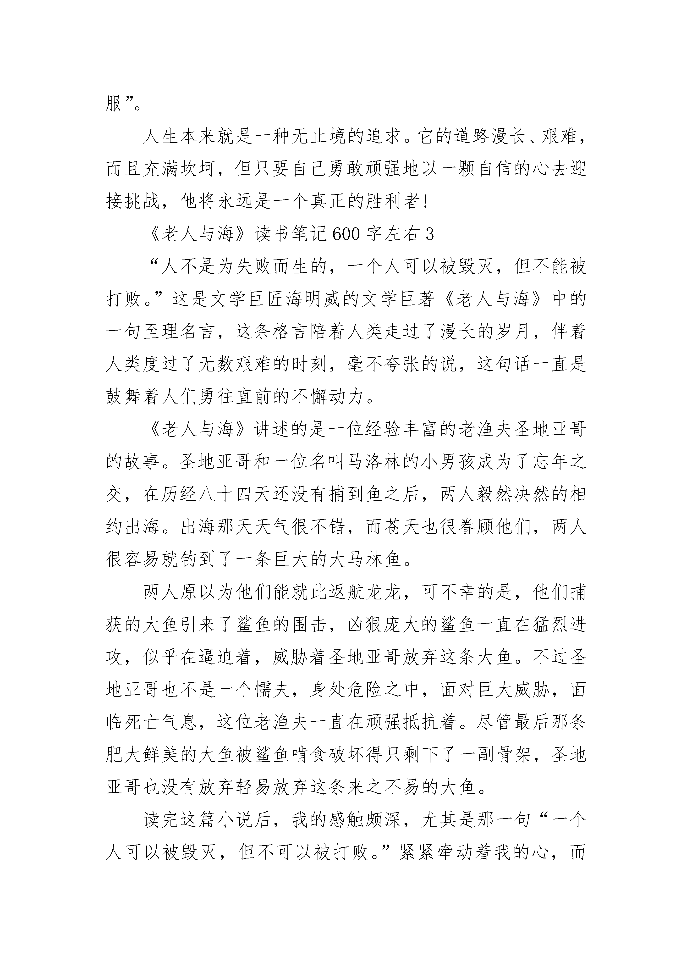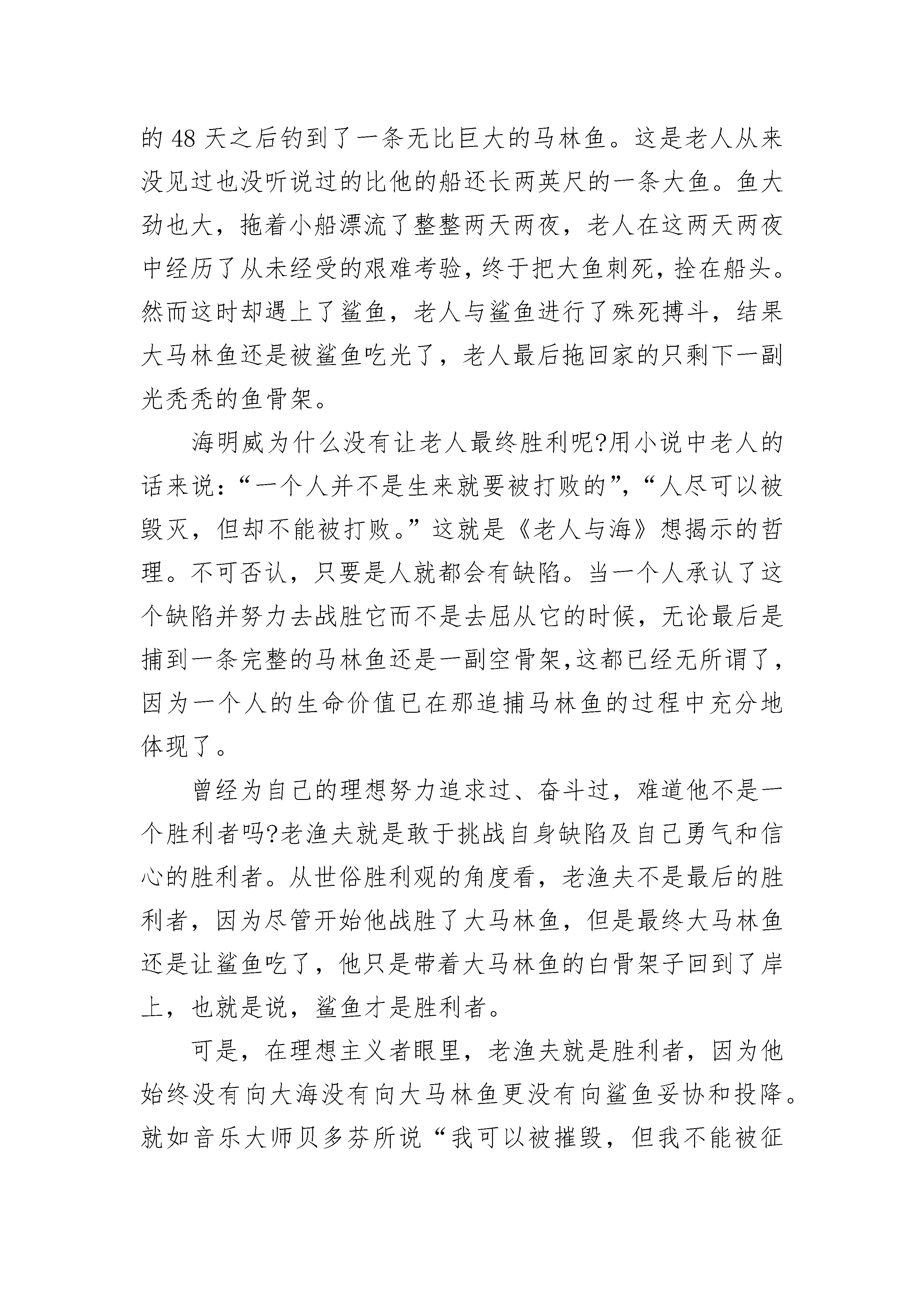 《老人与海》读书笔记600字左右五篇《老人与海》读书笔记600字左右1每一本书,都有它自己的“灵魂”,当你阅读一本书时,自己也就在不知不觉当中,陷入了那个书中所构想的世界。因为书所有的“灵魂”不同,自然那个所构想的世界也不一样。而我所指的“灵魂”,就是每本书,其自身要表达的思想,或者愿望。我们会因为那些感人的书,而潸然泪下,或因为那些记录屈辱历史的书,而热血沸腾,甚至因为那些武侠、玄幻的书,而将自己想象成天下第一的人。《老人与海》却是一本能让人了解,什么才是真正的人生,什么才是坚强的书,一本实实在在的好书。在现实生活中,我们会不断地受到挫折、失败还有许多负面的情绪,许多人因此而消极、失去对生活的热爱。而《老人与海》却刻画出一个与大海搏斗,在艰难的环境下,奋力生活的老渔夫。大家应该记得,在书中提到过,老人的渔船上那破旧的帆布,就像是一面失败的旗帜,仿佛在宣告着老人永远都捕不到鱼的倒霉运气。但是,他没有放弃,仍然出海捕鱼。而在现实中,某些人却不能坚持,面对挫折就选择了放弃,选择了逃避。和那已经生活窘迫的老渔夫相比,那些逃避的人真的是不知道什么才是挫折。我们可能会因为考试的失利,而对自己失去信心。或者因为别人的批评,而自暴自弃。在那时候,想想这个坚强的老渔夫,他是如何面对生活的。自己的心,自然就会释然许多。别人与大海,与自然界的强大力量对抗,而我们现在只是面临一些学习上、生活上的挫折,与老渔夫相比,真的只是小巫见大巫。他的手已经沾满老茧,皮肤也已经被刺眼的阳光晒出斑点,那艘破烂的渔船也不能抵御什么风暴,自己那破旧的小屋也是外面下大雨里面下小雨的那种。但是,他没有放弃对生活的希望,他和那个小男孩聊棒球,去酒馆喝酒聊天,仍然天天早上迎着第一缕阳光出海捕鱼。无论有没有收获,他都会坚持出海捕鱼,这不只是因为他要依靠捕鱼谋生,而是捕鱼已经成为了他生活的一部分,他的一种记忆。最后一次捕鱼,他抓到了一条大鱼,可是,在回港的路上,他碰到了鲨鱼攻击,他毅然拿起鱼叉扞卫自己辛苦得来的劳动果实。虽然,最后那条大鱼被鲨鱼吃光了,只剩下白色的骨架。但是,老渔夫那种不言败的精神,虽然最后失败了,但是他勇敢去付出的那种行为,却是我们应该学习的。《老人与海》读书笔记600字左右2“一艘船越过世界的尽头,驶向未知的大海,船头上悬挂着一面虽然饱经风雨剥蚀却依旧艳丽无比的旗帜,旗帜上,舞动着云龙一般的四个字闪闪发光——超越极限!”作者海明威是这样评价他的作品《老人与海》的。《老人与海》塑造了一个经典的硬汉形象。古巴的一个名叫桑地亚哥的老渔夫,独自一个人出海打鱼,在一无所获的48天之后钓到了一条无比巨大的马林鱼。这是老人从来没见过也没听说过的比他的船还长两英尺的一条大鱼。鱼大劲也大,拖着小船漂流了整整两天两夜,老人在这两天两夜中经历了从未经受的艰难考验,终于把大鱼刺死,拴在船头。然而这时却遇上了鲨鱼,老人与鲨鱼进行了殊死搏斗,结果大马林鱼还是被鲨鱼吃光了,老人最后拖回家的只剩下一副光秃秃的鱼骨架。海明威为什么没有让老人最终胜利呢?用小说中老人的话来说:“一个人并不是生来就要被打败的”,“人尽可以被毁灭,但却不能被打败。”这就是《老人与海》想揭示的哲理。不可否认,只要是人就都会有缺陷。当一个人承认了这个缺陷并努力去战胜它而不是去屈从它的时候,无论最后是捕到一条完整的马林鱼还是一副空骨架,这都已经无所谓了,因为一个人的生命价值已在那追捕马林鱼的过程中充分地体现了。曾经为自己的理想努力追求过、奋斗过,难道他不是一个胜利者吗?老渔夫就是敢于挑战自身缺陷及自己勇气和信心的胜利者。从世俗胜利观的角度看,老渔夫不是最后的胜利者,因为尽管开始他战胜了大马林鱼,但是最终大马林鱼还是让鲨鱼吃了,他只是带着大马林鱼的白骨架子回到了岸上,也就是说,鲨鱼才是胜利者。可是,在理想主义者眼里,老渔夫就是胜利者,因为他始终没有向大海没有向大马林鱼更没有向鲨鱼妥协和投降。就如音乐大师贝多芬所说“我可以被摧毁,但我不能被征服”。人生本来就是一种无止境的追求。它的道路漫长、艰难,而且充满坎坷,但只要自己勇敢顽强地以一颗自信的心去迎接挑战,他将永远是一个真正的胜利者!《老人与海》读书笔记600字左右3“人不是为失败而生的,一个人可以被毁灭,但不能被打败。”这是文学巨匠海明威的文学巨著《老人与海》中的一句至理名言,这条格言陪着人类走过了漫长的岁月,伴着人类度过了无数艰难的时刻,毫不夸张的说,这句话一直是鼓舞着人们勇往直前的不懈动力。《老人与海》讲述的是一位经验丰富的老渔夫圣地亚哥的故事。圣地亚哥和一位名叫马洛林的小男孩成为了忘年之交,在历经八十四天还没有捕到鱼之后,两人毅然决然的相约出海。出海那天天气很不错,而苍天也很眷顾他们,两人很容易就钓到了一条巨大的大马林鱼。两人原以为他们能就此返航龙龙,可不幸的是,他