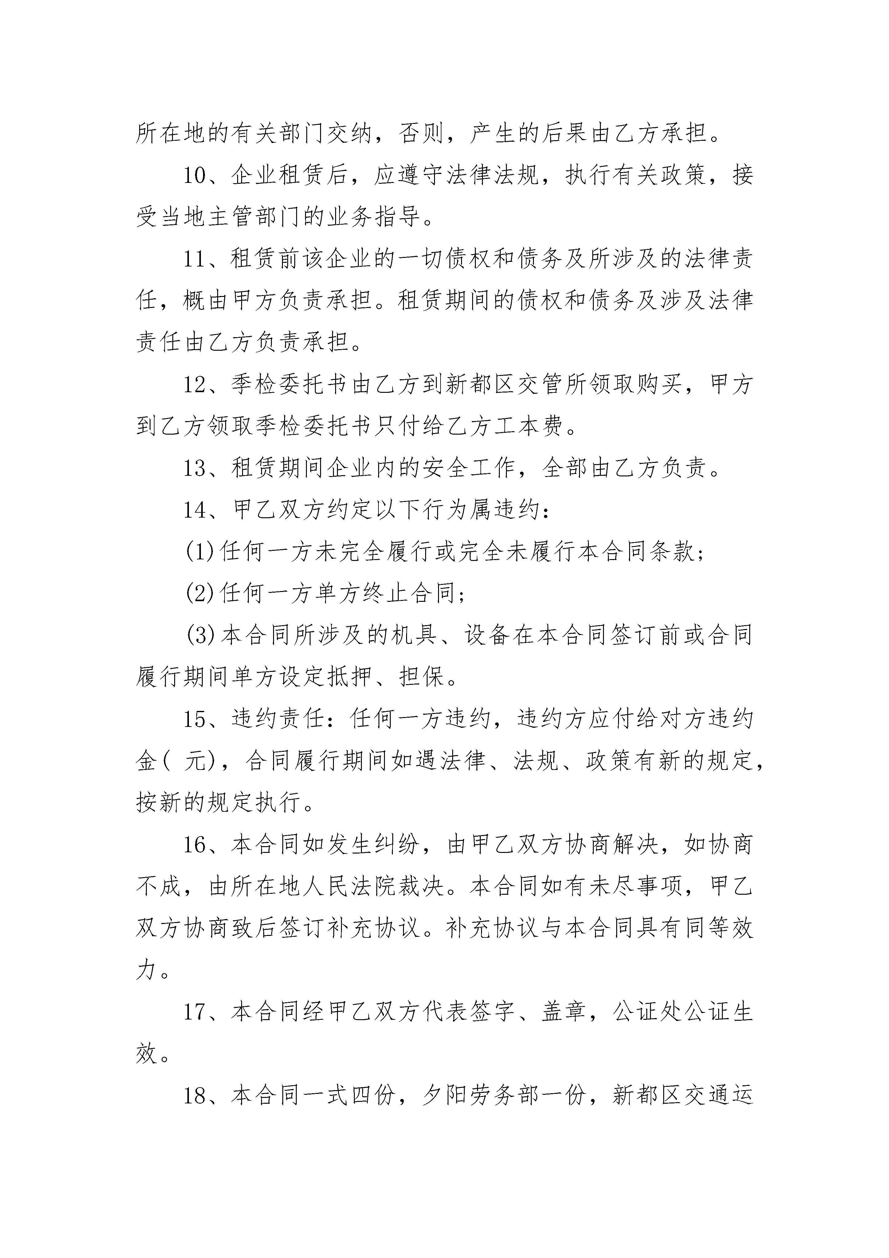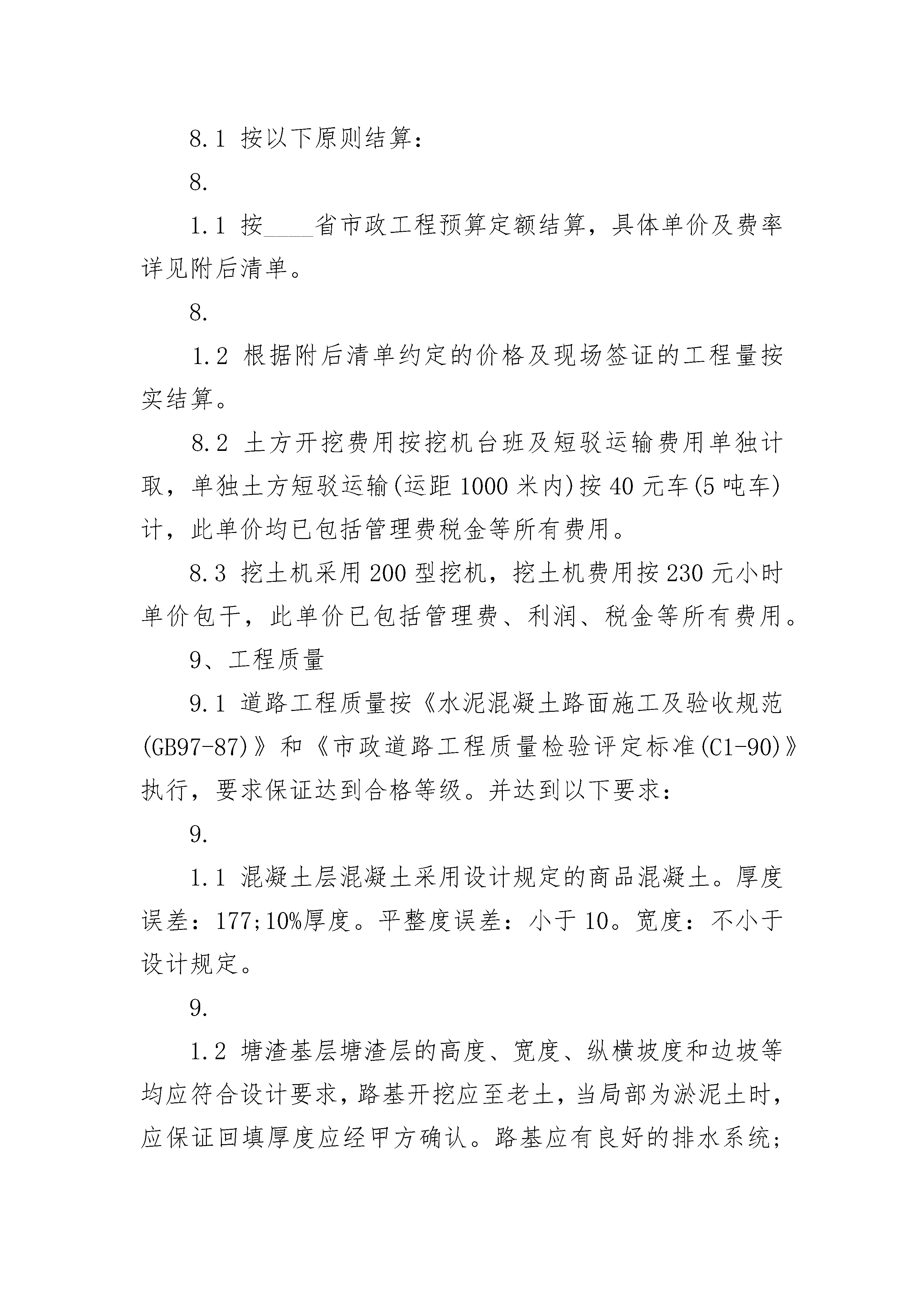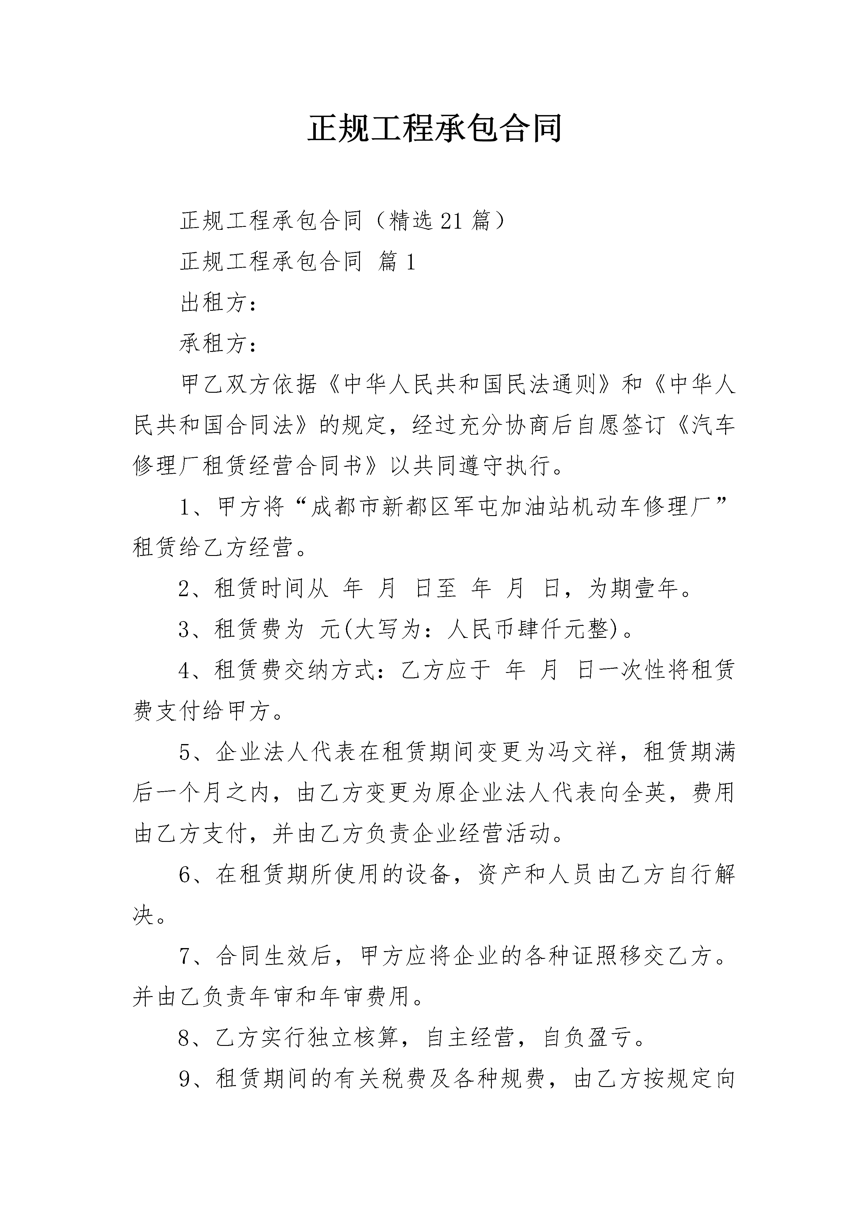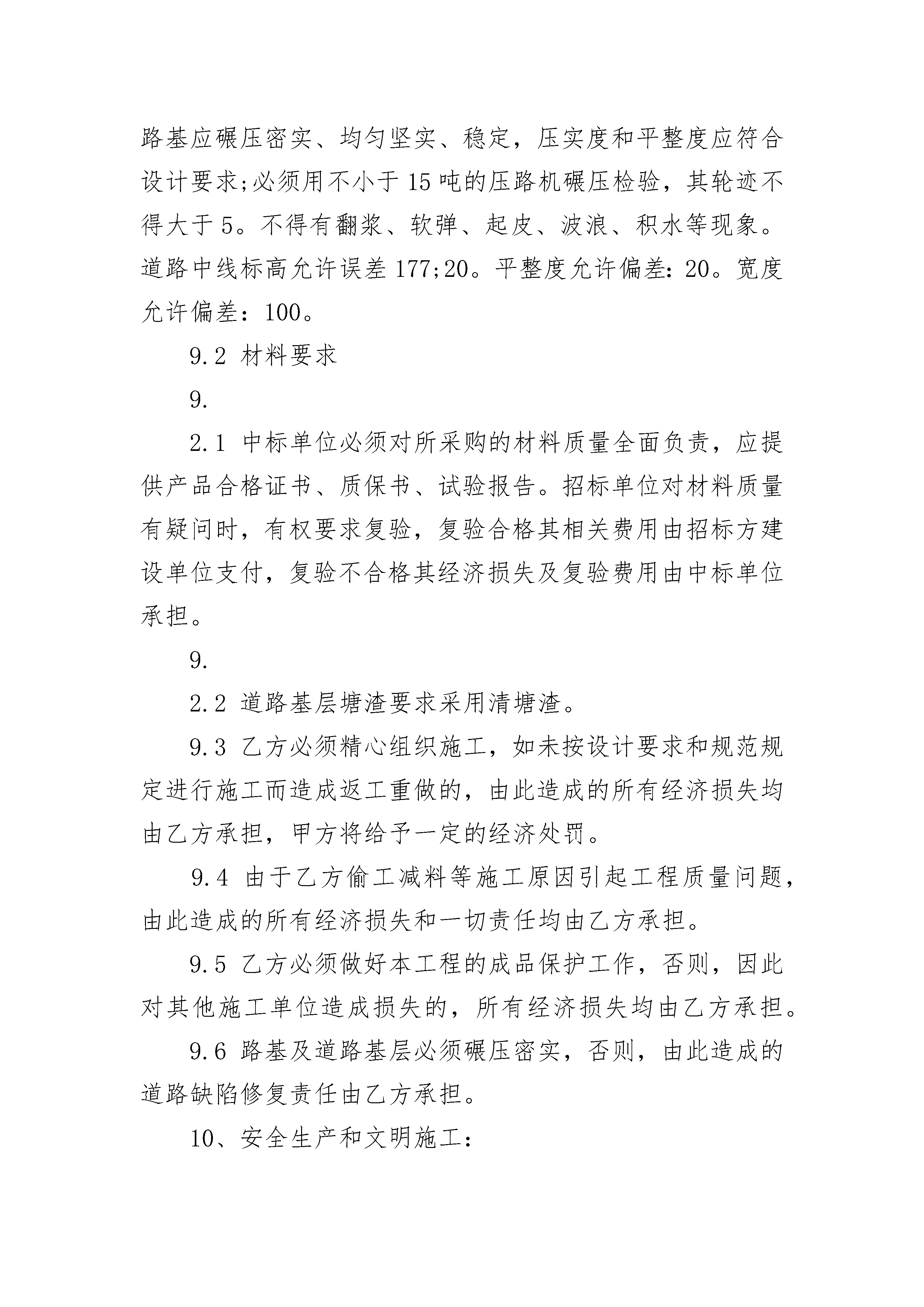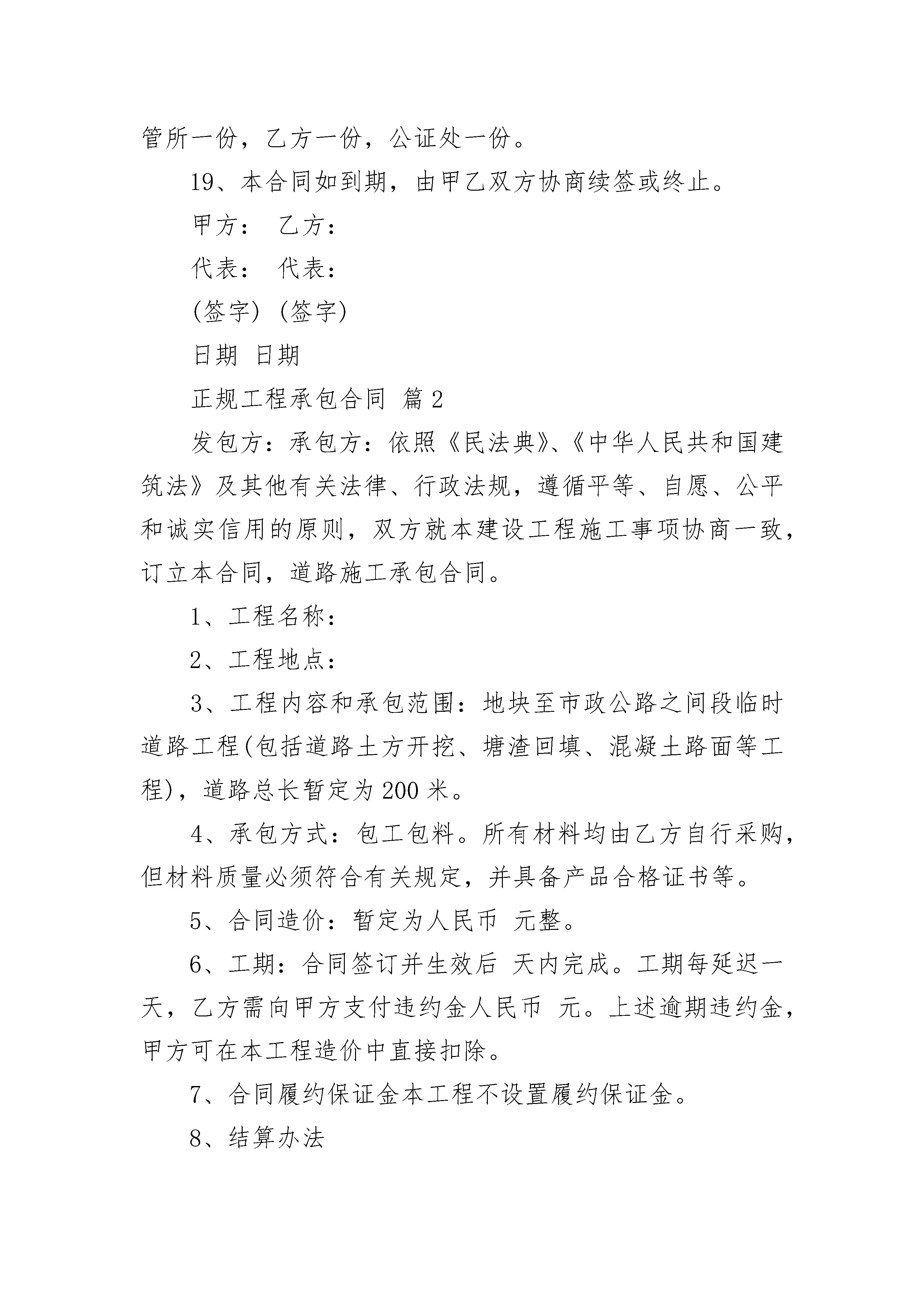 正规工程承包合同正规工程承包合同(精选21篇)正规工程承包合同篇1出租方:承租方:甲乙双方依据《中华人民共和国民法通则》和《中华人民共和国合同法》的规定,经过充分协商后自愿签订《汽车修理厂租赁经营合同书》以共同遵守执行。1、甲方将“成都市新都区军屯加油站机动车修理厂”租赁给乙方经营。2、租赁时间从年月日至年月日,为期壹年。3、租赁费为元(大写为:人民币肆仟元整)。4、租赁费交纳方式:乙方应于年月日一次性将租赁费支付给甲方。5、企业法人代表在租赁期间变更为冯文祥,租赁期满后一个月之内,由乙方变更为原企业法人代表向全英,费用由乙方支付,并由乙方负责企业经营活动。6、在租赁期所使用的设备,资产和人员由乙方自行解决。7、合同生效后,甲方应将企业的各种证照移交乙方。并由乙负责年审和年审费用。8、乙方实行独立核算,自主经营,自负盈亏。9、租赁期间的有关税费及各种规费,由乙方按规定向所在地的有关部门交纳,否则,产生的后果由乙方承担。10、企业租赁后,应遵守法律法规,执行有关政策,接受当地主管部门的业务指导。11、租赁前该企业的一切债权和债务及所涉及的法律责任,概由甲方负责承担。租赁期间的债权和债务及涉及法律责任由乙方负责承担。12、季检委托书由乙方到新都区交管所领取购买,甲方到乙方领取季检委托书只付给乙方工本费。13、租赁期间企业内的安全工作,全部由乙方负责。14、甲乙双方约定以下行为属违约:(1)任何一方未完全履行或完全未履行本合同条款;(2)任何一方单方终止合同;(3)本合同所涉及的机具、设备在本合同签订前或合同履行期间单方设定抵押、担保。15、违约责任:任何一方违约,违约方应付给对方违约金(元),合同履行期间如遇法律、法规、政策有新的规定,按新的规定执行。16、本合同如发生纠纷,由甲乙双方协商解决,如协商不成,由所在地人民法院裁决。本合同如有未尽事项,甲乙双方协商致后签订补充协议。补充协议与本合同具有同等效力。17、本合同经甲乙双方代表签字、盖章,公证处公证生效。18、本合同一式四份,夕阳劳务部一份,新都区交通运管所一份,乙方一份,公证处一份。19、本合同如到期,由甲乙双方协商续签或终止。甲方:乙方:代表:代表:(签字)(签字)日期日期正规工程承包合同篇2发包方:承包方:依照《民法典》、《中华人民共和国建筑法》及其他有关法律、行政法规,遵循平等、自愿、公平和诚实信用的原则,双方就本建设工程施工事项协商一致,订立本合同,道路施工承包合同。1、工程名称:2、工程地点:3、工程内容和承包范围:地块至市政公路之间段临时道路工程(包括道路土方开挖、塘渣回填、混凝土路面等工程),道路总长暂定为200米。4、承包方式:包工包料。所有材料均由乙方自行采购,但材料质量必须符合有关规定,并具备产品合格证书等。5、合同造价:暂定为人民币元整。6、工期:合同签订并生效后天内完成。工期每延迟一天,乙方需向甲方支付违约金人民币元。上述逾期违约金,甲方可在本工程造价中直接扣除。7、合同履约保证金本工程不设置履约保证金。8、结算办法8.1按以下原则结算:8.1.1按____省市政工程预算定额结算,具体单价及费率详见附后清单。8.1.2根据附后清单约定的价格及现场签证的工程量按实结算。8.2土方开挖费用按挖机台班及短驳运输费用单独计取,单独土方短驳运输(运距1000米内)按40元车(5吨车)计,此单价均已包括管理费税金等所有费用。8.3挖土机采用200型挖机,挖土机费用按230元小时单价包干,此单价已包括管理费、利润、税金等所有费用。9、工程质量9.1道路工程质量按《水泥混凝土路面施工及验收规范(GB97-87)》和《市政道路工程质量检验评定标准(C1-90)》执行,要求保证达到合格等级。并达到以下要求:9.1.1混凝土层混凝土采用设计规定的商品混凝土。厚度误差:177;10%厚度。平整度误差:小于10。宽度:不小于设计规定。9.1.2塘渣基层塘渣层的高度、宽度、纵横坡度和边坡等均应符合设计要求,路基开挖应至老土,当局部为淤泥土时,应保证回填厚度应经甲方确认。路基应有良好的排水系统;路基应碾压密实、均匀坚实、稳定,压实度和平整度应符合设计要求;必须用不小于15吨的压路机碾压检验,其轮迹不得大于5。不得有翻浆、软弹、起皮、波浪、积水等现象。道路中线标高允许误差177;20。平整度允许偏差:20。宽度允许偏差:100。9.2材料要求9.2.1中标单位必须对所采购的材料质量全面负责,应提供产品合格证书、质保书、试验报告。招标单位对材料质量有疑问时,有权要求复验,复验合格其相关费用由招标方建设单位支付,复验不合格其经济损失及复验费用由中标单位承担。9.2.2道路基层塘渣要求采用清塘渣。9.3乙方必须精心组织施工,如未按设计要求和规范规定进行施工而造成返工重做的,由此造成的