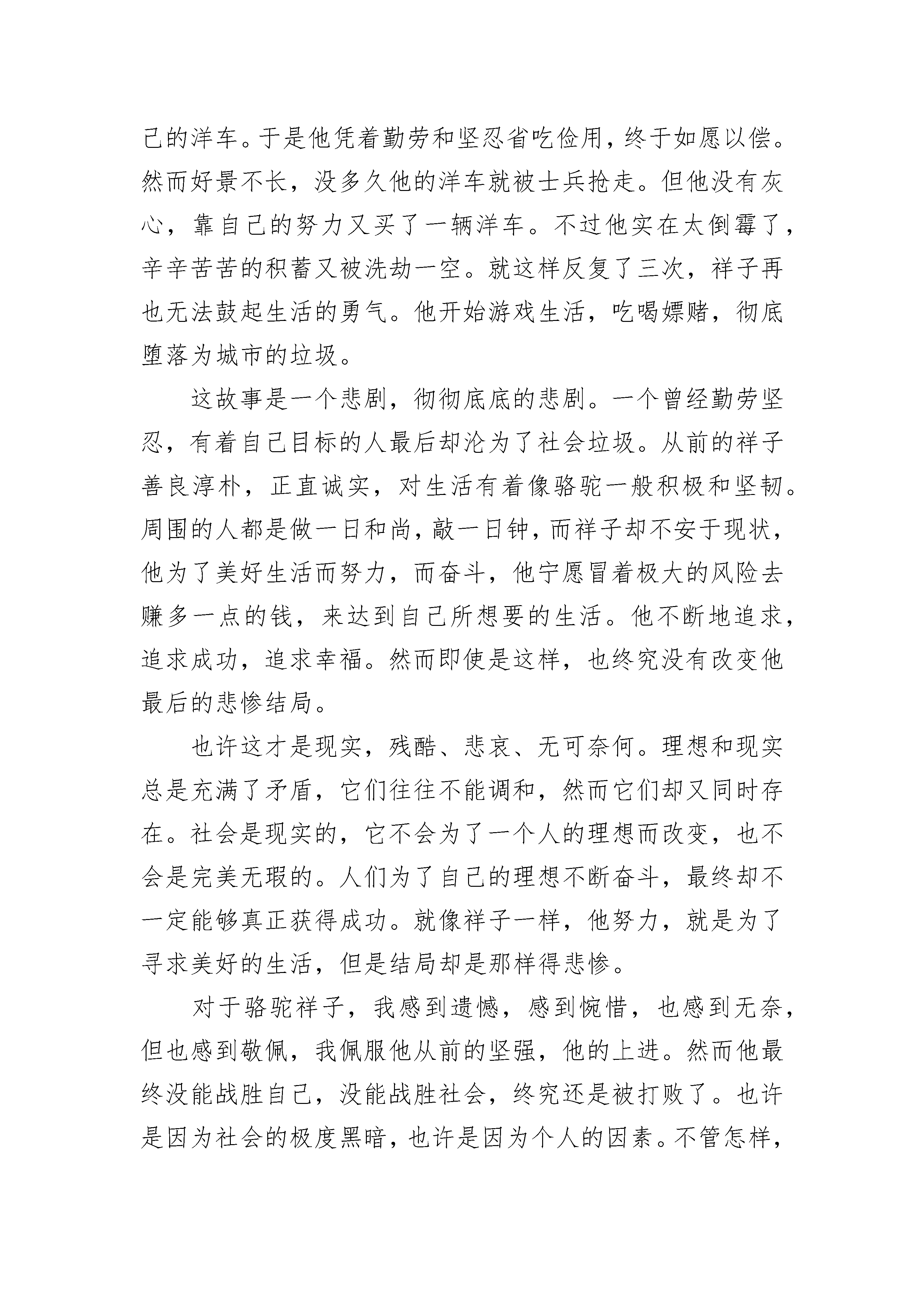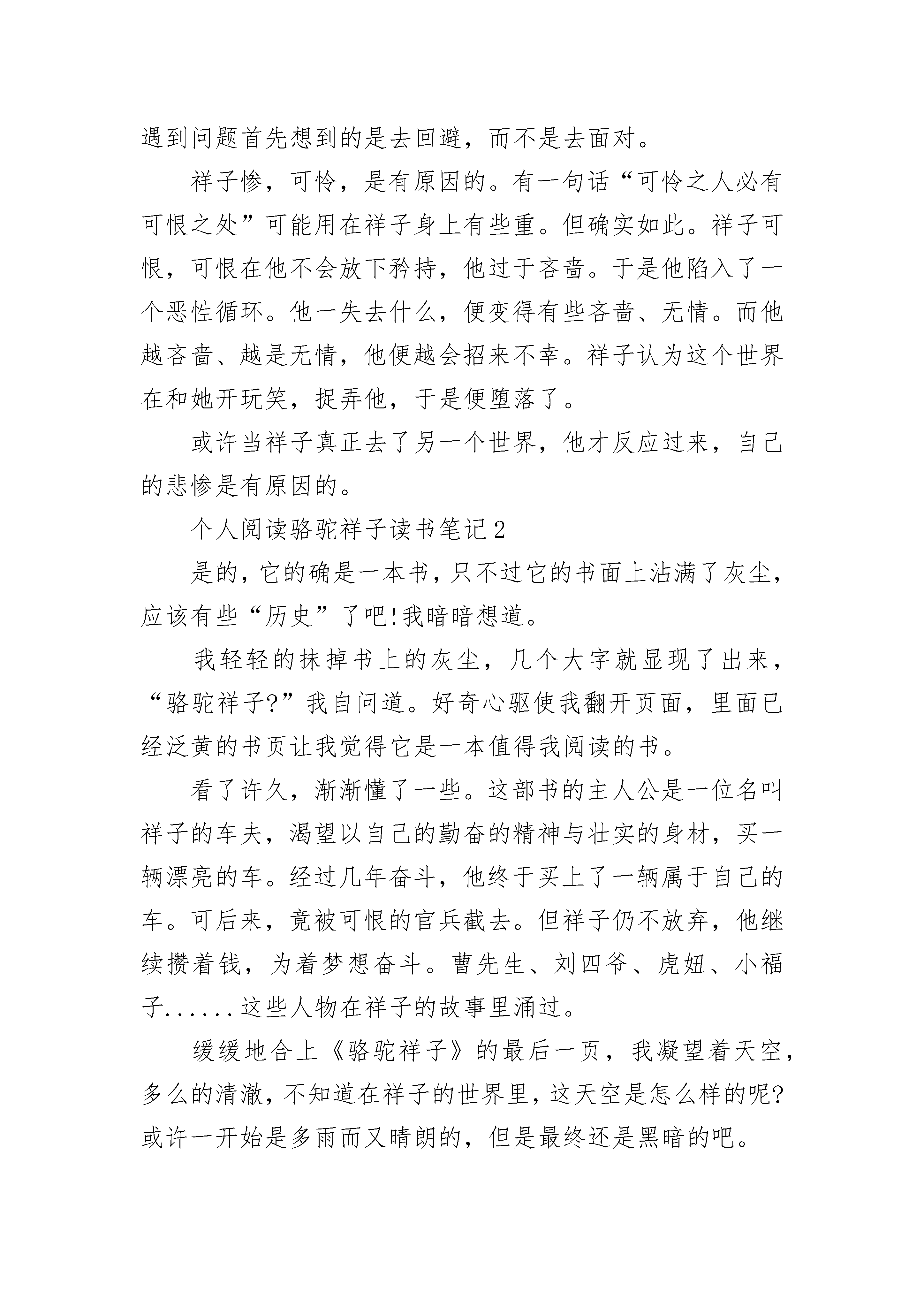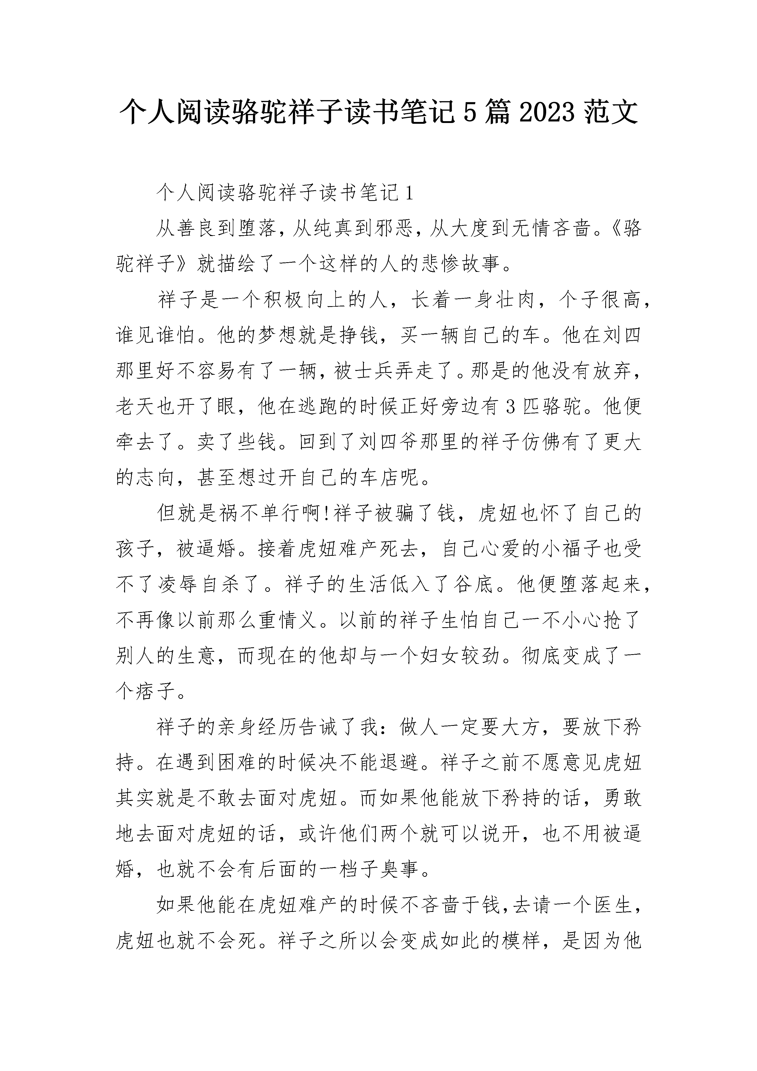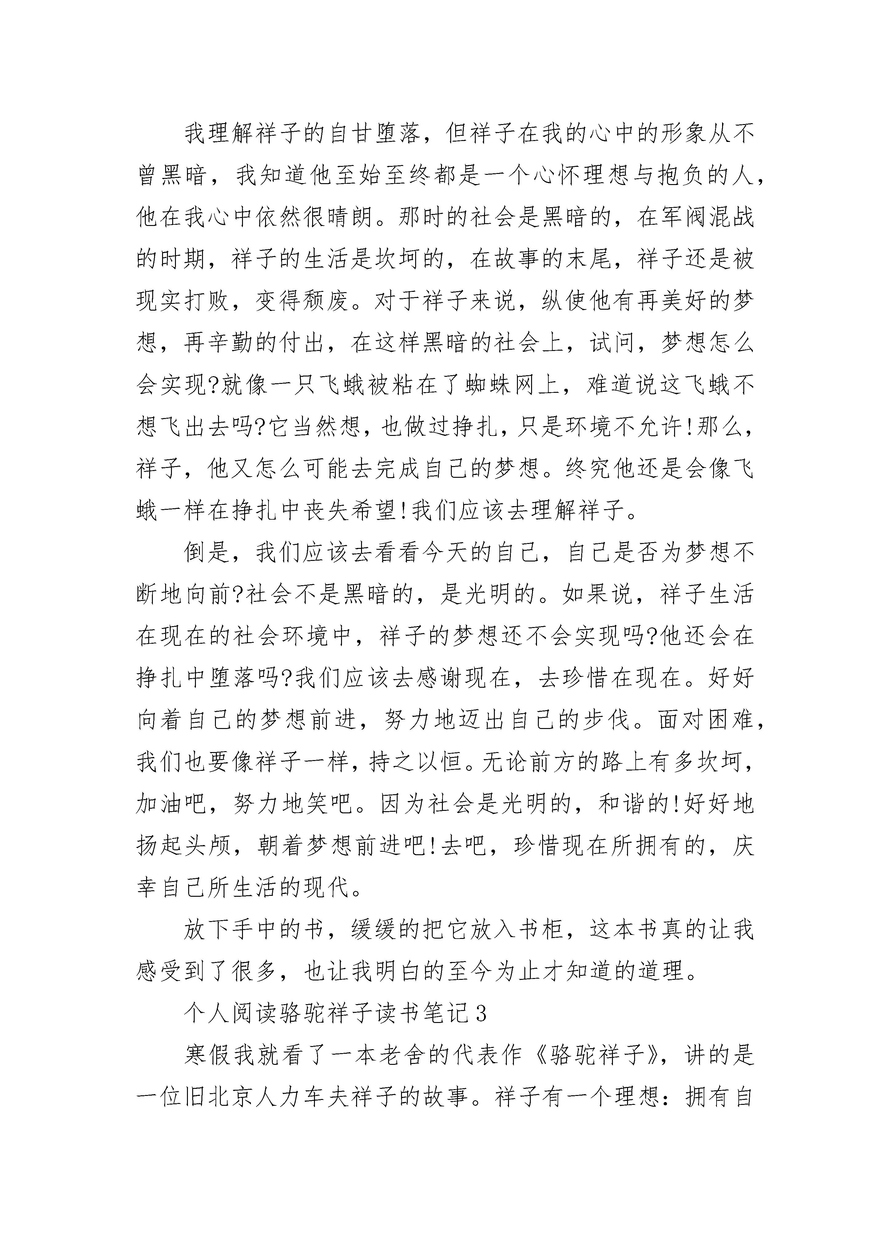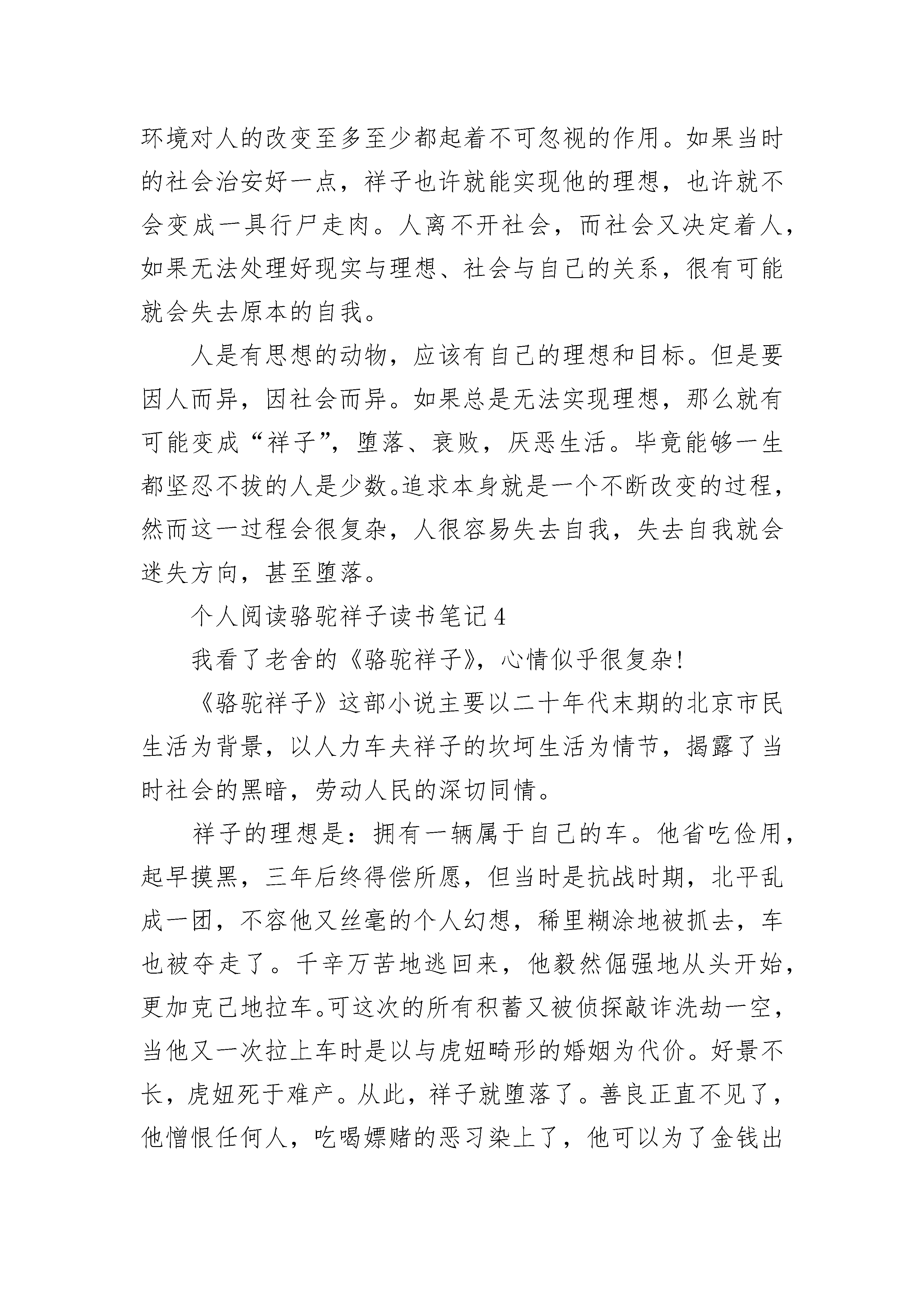 个人阅读骆驼祥子读书笔记5篇2023范文个人阅读骆驼祥子读书笔记1从善良到堕落,从纯真到邪恶,从大度到无情吝啬。《骆驼祥子》就描绘了一个这样的人的悲惨故事。祥子是一个积极向上的人,长着一身壮肉,个子很高,谁见谁怕。他的梦想就是挣钱,买一辆自己的车。他在刘四那里好不容易有了一辆,被士兵弄走了。那是的他没有放弃,老天也开了眼,他在逃跑的时候正好旁边有3匹骆驼。他便牵去了。卖了些钱。回到了刘四爷那里的祥子仿佛有了更大的志向,甚至想过开自己的车店呢。但就是祸不单行啊!祥子被骗了钱,虎妞也怀了自己的孩子,被逼婚。接着虎妞难产死去,自己心爱的小福子也受不了凌辱自杀了。祥子的生活低入了谷底。他便堕落起来,不再像以前那么重情义。以前的祥子生怕自己一不小心抢了别人的生意,而现在的他却与一个妇女较劲。彻底变成了一个痞子。祥子的亲身经历告诫了我:做人一定要大方,要放下矜持。在遇到困难的时候决不能退避。祥子之前不愿意见虎妞其实就是不敢去面对虎妞。而如果他能放下矜持的话,勇敢地去面对虎妞的话,或许他们两个就可以说开,也不用被逼婚,也就不会有后面的一档子臭事。如果他能在虎妞难产的时候不吝啬于钱,去请一个医生,虎妞也就不会死。祥子之所以会变成如此的模样,是因为他遇到问题首先想到的是去回避,而不是去面对。祥子惨,可怜,是有原因的。有一句话“可怜之人必有可恨之处”可能用在祥子身上有些重。但确实如此。祥子可恨,可恨在他不会放下矜持,他过于吝啬。于是他陷入了一个恶性循环。他一失去什么,便变得有些吝啬、无情。而他越吝啬、越是无情,他便越会招来不幸。祥子认为这个世界在和她开玩笑,捉弄他,于是便堕落了。或许当祥子真正去了另一个世界,他才反应过来,自己的悲惨是有原因的。个人阅读骆驼祥子读书笔记2是的,它的确是一本书,只不过它的书面上沾满了灰尘,应该有些“历史”了吧!我暗暗想道。我轻轻的抹掉书上的灰尘,几个大字就显现了出来,“骆驼祥子?”我自问道。好奇心驱使我翻开页面,里面已经泛黄的书页让我觉得它是一本值得我阅读的书。看了许久,渐渐懂了一些。这部书的主人公是一位名叫祥子的车夫,渴望以自己的勤奋的精神与壮实的身材,买一辆漂亮的车。经过几年奋斗,他终于买上了一辆属于自己的车。可后来,竟被可恨的官兵截去。但祥子仍不放弃,他继续攒着钱,为着梦想奋斗。曹先生、刘四爷、虎妞、小福子......这些人物在祥子的故事里涌过。缓缓地合上《骆驼祥子》的最后一页,我凝望着天空,多么的清澈,不知道在祥子的世界里,这天空是怎么样的呢?或许一开始是多雨而又晴朗的,但是最终还是黑暗的吧。我理解祥子的自甘堕落,但祥子在我的心中的形象从不曾黑暗,我知道他至始至终都是一个心怀理想与抱负的人,他在我心中依然很晴朗。那时的社会是黑暗的,在军阀混战的时期,祥子的生活是坎坷的,在故事的末尾,祥子还是被现实打败,变得颓废。对于祥子来说,纵使他有再美好的梦想,再辛勤的付出,在这样黑暗的社会上,试问,梦想怎么会实现?就像一只飞蛾被粘在了蜘蛛网上,难道说这飞蛾不想飞出去吗?它当然想,也做过挣扎,只是环境不允许!那么,祥子,他又怎么可能去完成自己的梦想。终究他还是会像飞蛾一样在挣扎中丧失希望!我们应该去理解祥子。倒是,我们应该去看看今天的自己,自己是否为梦想不断地向前?社会不是黑暗的,是光明的。如果说,祥子生活在现在的社会环境中,祥子的梦想还不会实现吗?他还会在挣扎中堕落吗?我们应该去感谢现在,去珍惜在现在。好好向着自己的梦想前进,努力地迈出自己的步伐。面对困难,我们也要像祥子一样,持之以恒。无论前方的路上有多坎坷,加油吧,努力地笑吧。因为社会是光明的,和谐的!好好地扬起头颅,朝着梦想前进吧!去吧,珍惜现在所拥有的,庆幸自己所生活的现代。放下手中的书,缓缓的把它放入书柜,这本书真的让我感受到了很多,也让我明白的至今为止才知道的道理。个人阅读骆驼祥子读书笔记3寒假我就看了一本老舍的代表作《骆驼祥子》,讲的是一位旧北京人力车夫祥子的故事。祥子有一个理想:拥有自己的洋车。于是他凭着勤劳和坚忍省吃俭用,终于如愿以偿。然而好景不长,没多久他的洋车就被士兵抢走。但他没有灰心,靠自己的努力又买了一辆洋车。不过他实在太倒霉了,辛辛苦苦的积蓄又被洗劫一空。就这样反复了三次,祥子再也无法鼓起生活的勇气。他开始游戏生活,吃喝嫖赌,彻底堕落为城市的垃圾。这故事是一个悲剧,彻彻底底的悲剧。一个曾经勤劳坚忍,有着自己目标的人最后却沦为了社会垃圾。从前的祥子善良淳朴,正直诚实,对生活有着像骆驼一般积极和坚韧。周围的人都是做一日和尚,敲一日钟,而祥子却不安于现状,他为了美好生活而努力,而奋斗,他宁愿冒着极大的风险去赚多一点的钱,来达到自己所想要的生活。他不断地追求,追求成功,追求幸福。然而即使是这样,也终究没有改变他最后的悲惨结局。也许这才是现实,残酷、