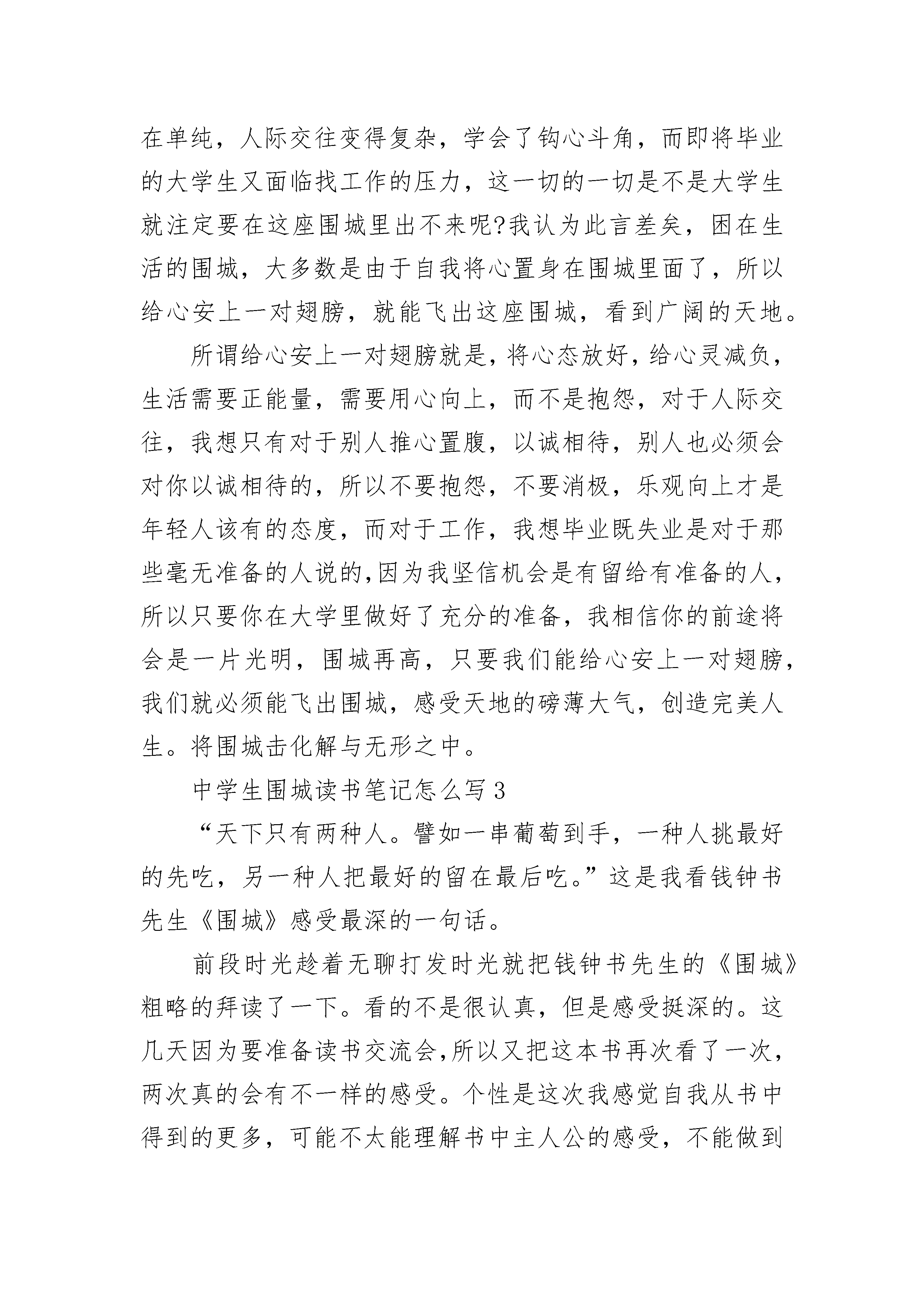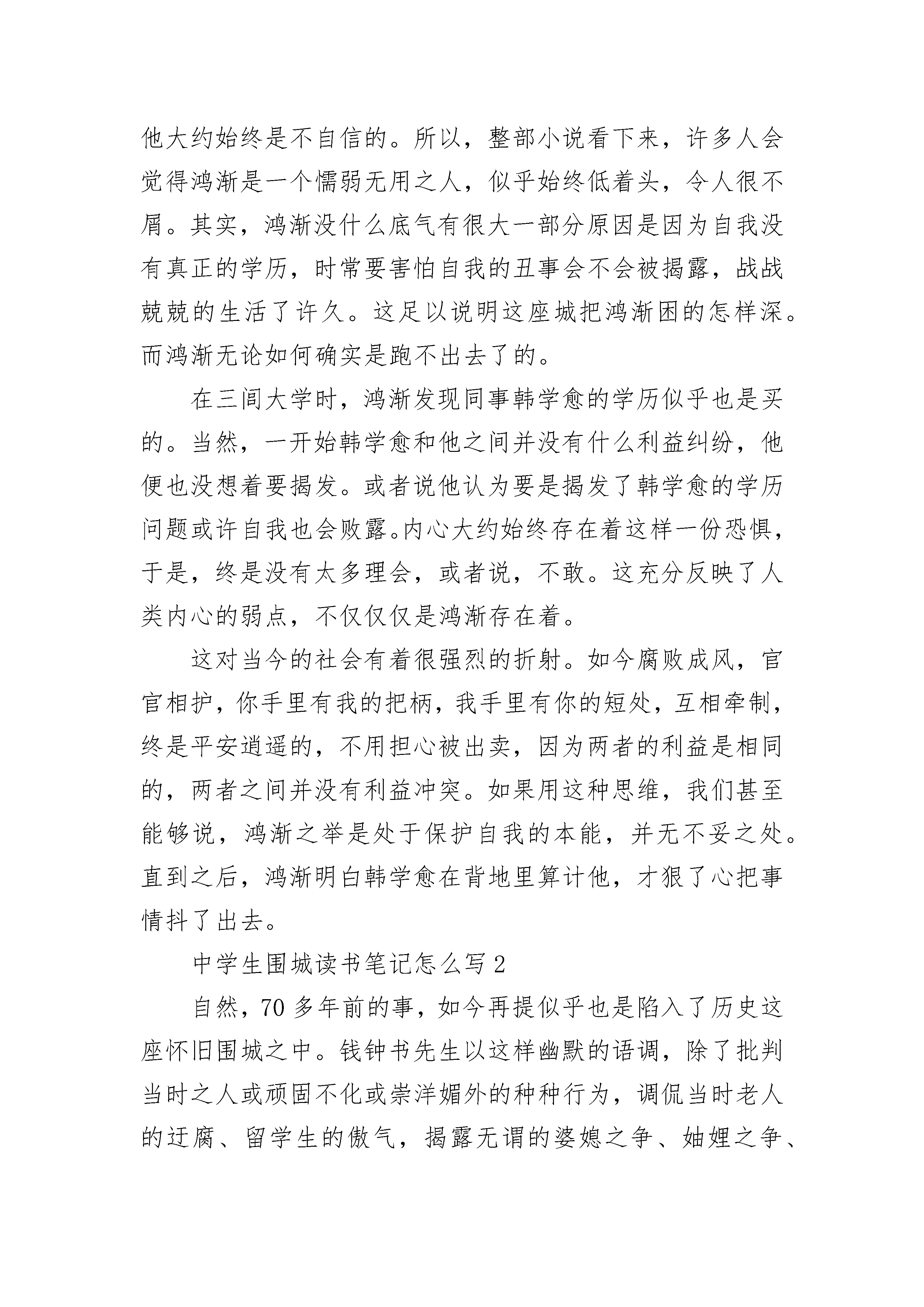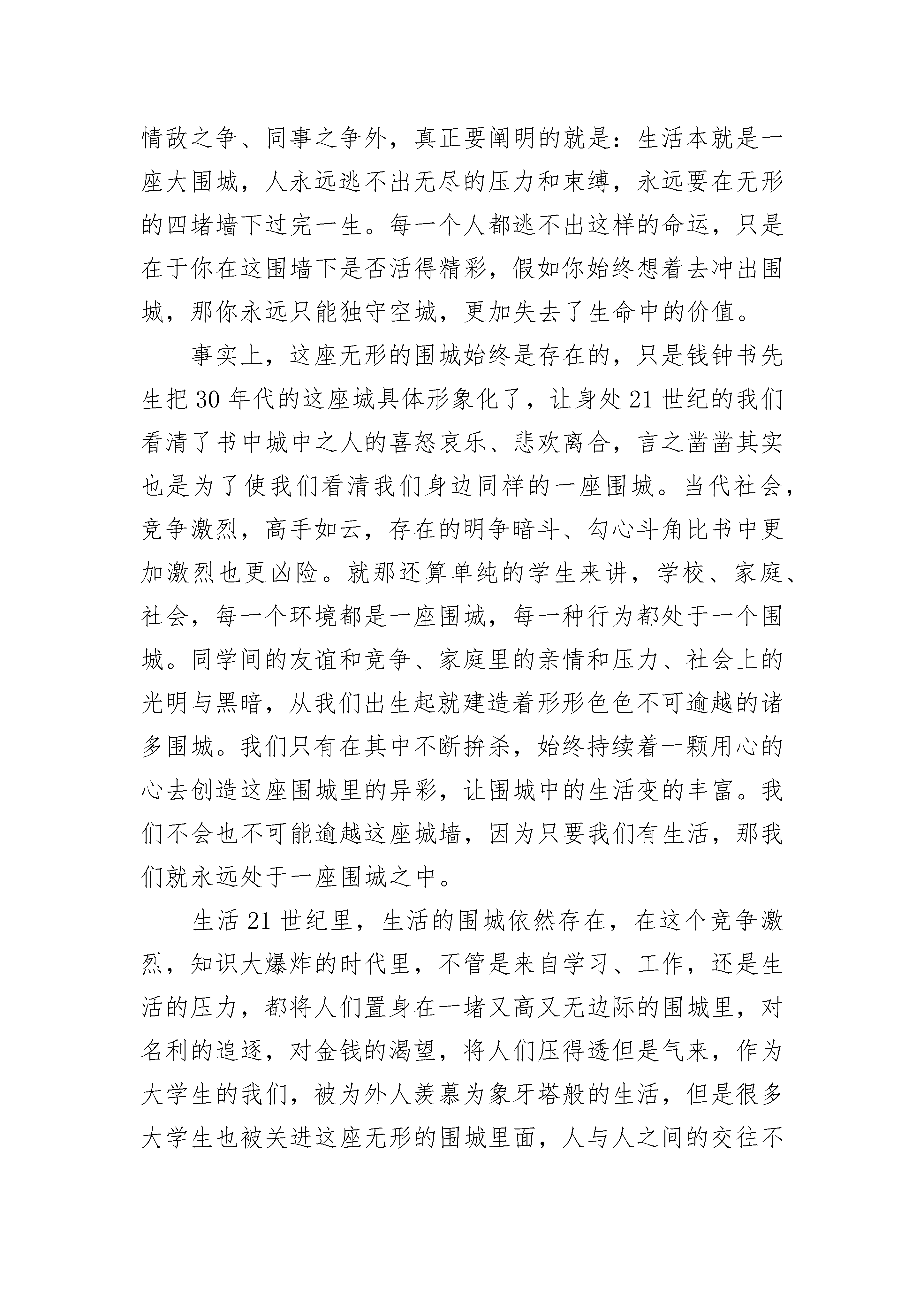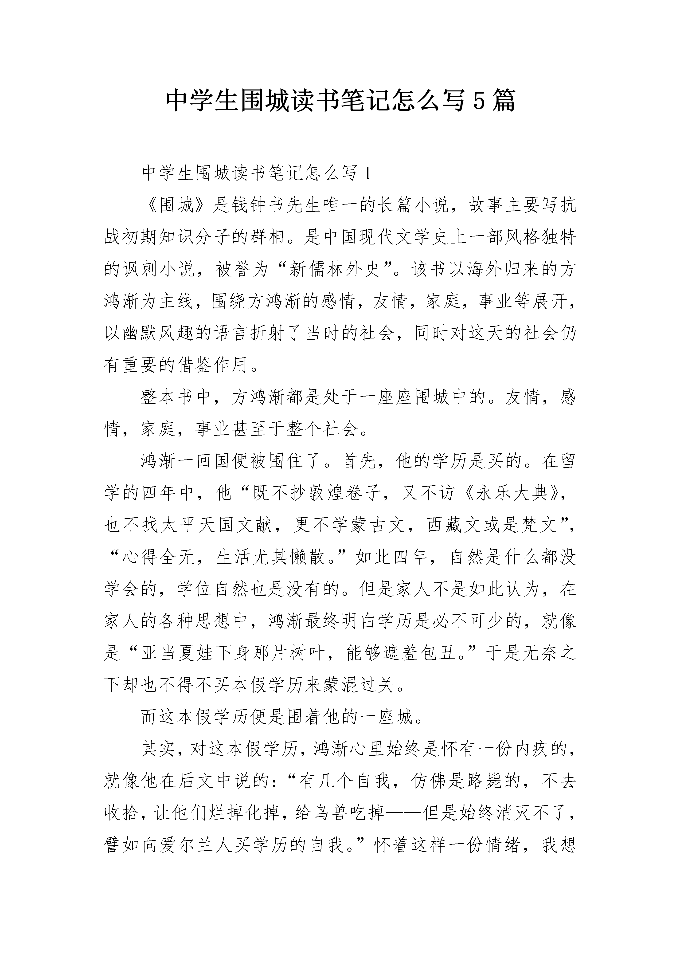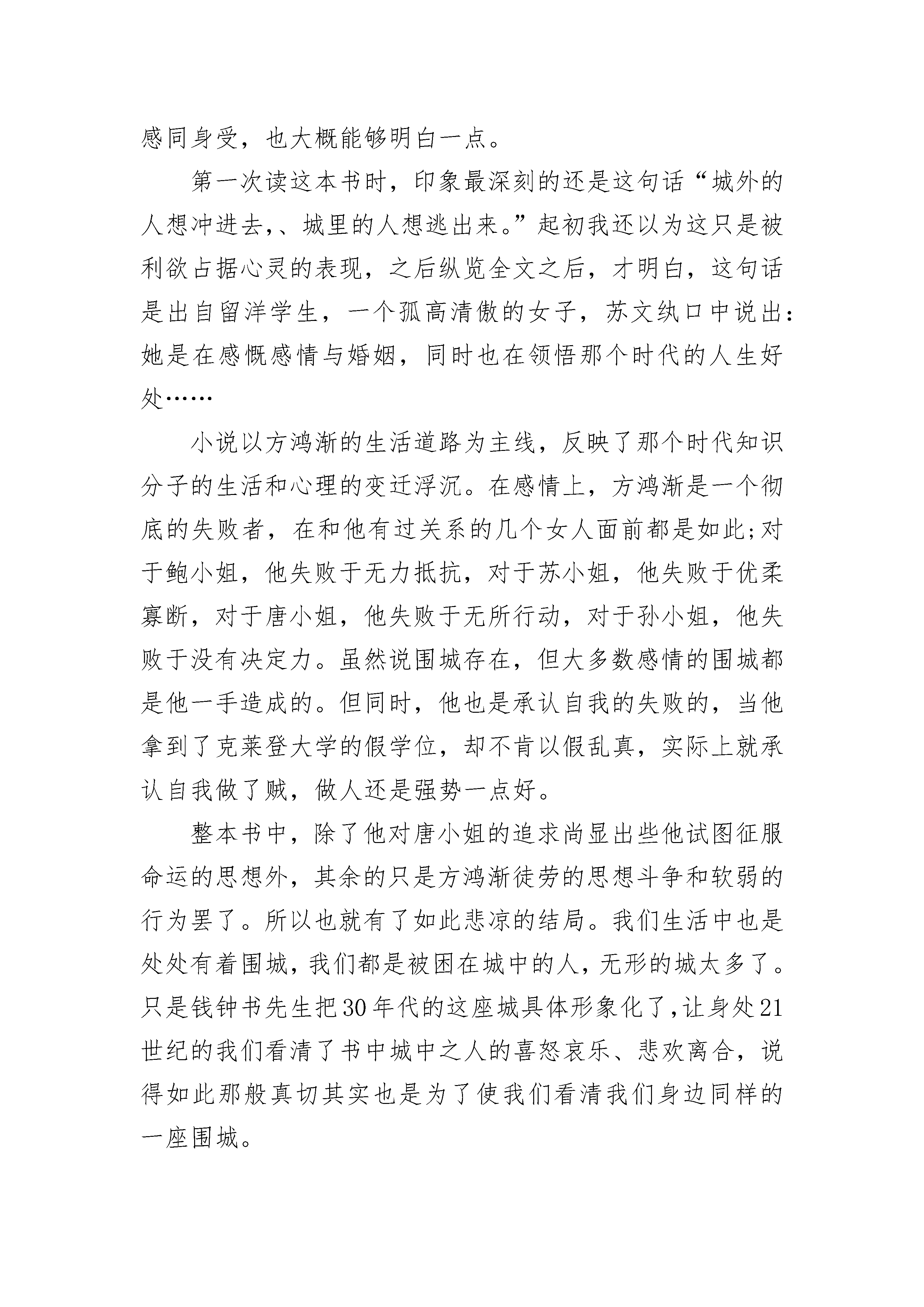 中学生围城读书笔记怎么写5篇中学生围城读书笔记怎么写1《围城》是钱钟书先生唯一的长篇小说,故事主要写抗战初期知识分子的群相。是中国现代文学史上一部风格独特的讽刺小说,被誉为“新儒林外史”。该书以海外归来的方鸿渐为主线,围绕方鸿渐的感情,友情,家庭,事业等展开,以幽默风趣的语言折射了当时的社会,同时对这天的社会仍有重要的借鉴作用。整本书中,方鸿渐都是处于一座座围城中的。友情,感情,家庭,事业甚至于整个社会。鸿渐一回国便被围住了。首先,他的学历是买的。在留学的四年中,他“既不抄敦煌卷子,又不访《永乐大典》,也不找太平天国文献,更不学蒙古文,西藏文或是梵文”,“心得全无,生活尤其懒散。”如此四年,自然是什么都没学会的,学位自然也是没有的。但是家人不是如此认为,在家人的各种思想中,鸿渐最终明白学历是必不可少的,就像是“亚当夏娃下身那片树叶,能够遮羞包丑。”于是无奈之下却也不得不买本假学历来蒙混过关。而这本假学历便是围着他的一座城。其实,对这本假学历,鸿渐心里始终是怀有一份内疚的,就像他在后文中说的:“有几个自我,仿佛是路毙的,不去收拾,让他们烂掉化掉,给鸟兽吃掉——但是始终消灭不了,譬如向爱尔兰人买学历的自我。”怀着这样一份情绪,我想他大约始终是不自信的。所以,整部小说看下来,许多人会觉得鸿渐是一个懦弱无用之人,似乎始终低着头,令人很不屑。其实,鸿渐没什么底气有很大一部分原因是因为自我没有真正的学历,时常要害怕自我的丑事会不会被揭露,战战兢兢的生活了许久。这足以说明这座城把鸿渐困的怎样深。而鸿渐无论如何确实是跑不出去了的。在三闾大学时,鸿渐发现同事韩学愈的学历似乎也是买的。当然,一开始韩学愈和他之间并没有什么利益纠纷,他便也没想着要揭发。或者说他认为要是揭发了韩学愈的学历问题或许自我也会败露。内心大约始终存在着这样一份恐惧,于是,终是没有太多理会,或者说,不敢。这充分反映了人类内心的弱点,不仅仅仅是鸿渐存在着。这对当今的社会有着很强烈的折射。如今腐败成风,官官相护,你手里有我的把柄,我手里有你的短处,互相牵制,终是平安逍遥的,不用担心被出卖,因为两者的利益是相同的,两者之间并没有利益冲突。如果用这种思维,我们甚至能够说,鸿渐之举是处于保护自我的本能,并无不妥之处。直到之后,鸿渐明白韩学愈在背地里算计他,才狠了心把事情抖了出去。中学生围城读书笔记怎么写2自然,70多年前的事,如今再提似乎也是陷入了历史这座怀旧围城之中。钱钟书先生以这样幽默的语调,除了批判当时之人或顽固不化或崇洋媚外的种种行为,调侃当时老人的迂腐、留学生的傲气,揭露无谓的婆媳之争、妯娌之争、情敌之争、同事之争外,真正要阐明的就是:生活本就是一座大围城,人永远逃不出无尽的压力和束缚,永远要在无形的四堵墙下过完一生。每一个人都逃不出这样的命运,只是在于你在这围墙下是否活得精彩,假如你始终想着去冲出围城,那你永远只能独守空城,更加失去了生命中的价值。事实上,这座无形的围城始终是存在的,只是钱钟书先生把30年代的这座城具体形象化了,让身处21世纪的我们看清了书中城中之人的喜怒哀乐、悲欢离合,言之凿凿其实也是为了使我们看清我们身边同样的一座围城。当代社会,竞争激烈,高手如云,存在的明争暗斗、勾心斗角比书中更加激烈也更凶险。就那还算单纯的学生来讲,学校、家庭、社会,每一个环境都是一座围城,每一种行为都处于一个围城。同学间的友谊和竞争、家庭里的亲情和压力、社会上的光明与黑暗,从我们出生起就建造着形形色色不可逾越的诸多围城。我们只有在其中不断拚杀,始终持续着一颗用心的心去创造这座围城里的异彩,让围城中的生活变的丰富。我们不会也不可能逾越这座城墙,因为只要我们有生活,那我们就永远处于一座围城之中。生活21世纪里,生活的围城依然存在,在这个竞争激烈,知识大爆炸的时代里,不管是来自学习、工作,还是生活的压力,都将人们置身在一堵又高又无边际的围城里,对名利的追逐,对金钱的渴望,将人们压得透但是气来,作为大学生的我们,被为外人羡慕为象牙塔般的生活,但是很多大学生也被关进这座无形的围城里面,人与人之间的交往不在单纯,人际交往变得复杂,学会了钩心斗角,而即将毕业的大学生又面临找工作的压力,这一切的一切是不是大学生就注定要在这座围城里出不来呢?我认为此言差矣,困在生活的围城,大多数是由于自我将心置身在围城里面了,所以给心安上一对翅膀,就能飞出这座围城,看到广阔的天地。所谓给心安上一对翅膀就是,将心态放好,给心灵减负,生活需要正能量,需要用心向上,而不是抱怨,对于人际交往,我想只有对于别人推心置腹,以诚相待,别人也必须会对你以诚相待的,所以不要抱怨,不要消极,乐观向上才是年轻人该有的态度,而对于工作,我想毕业既失业是对于那些毫无准备的人说的,因为我坚信机会是有留给有准备的人,所以只要你在大学里做好了充