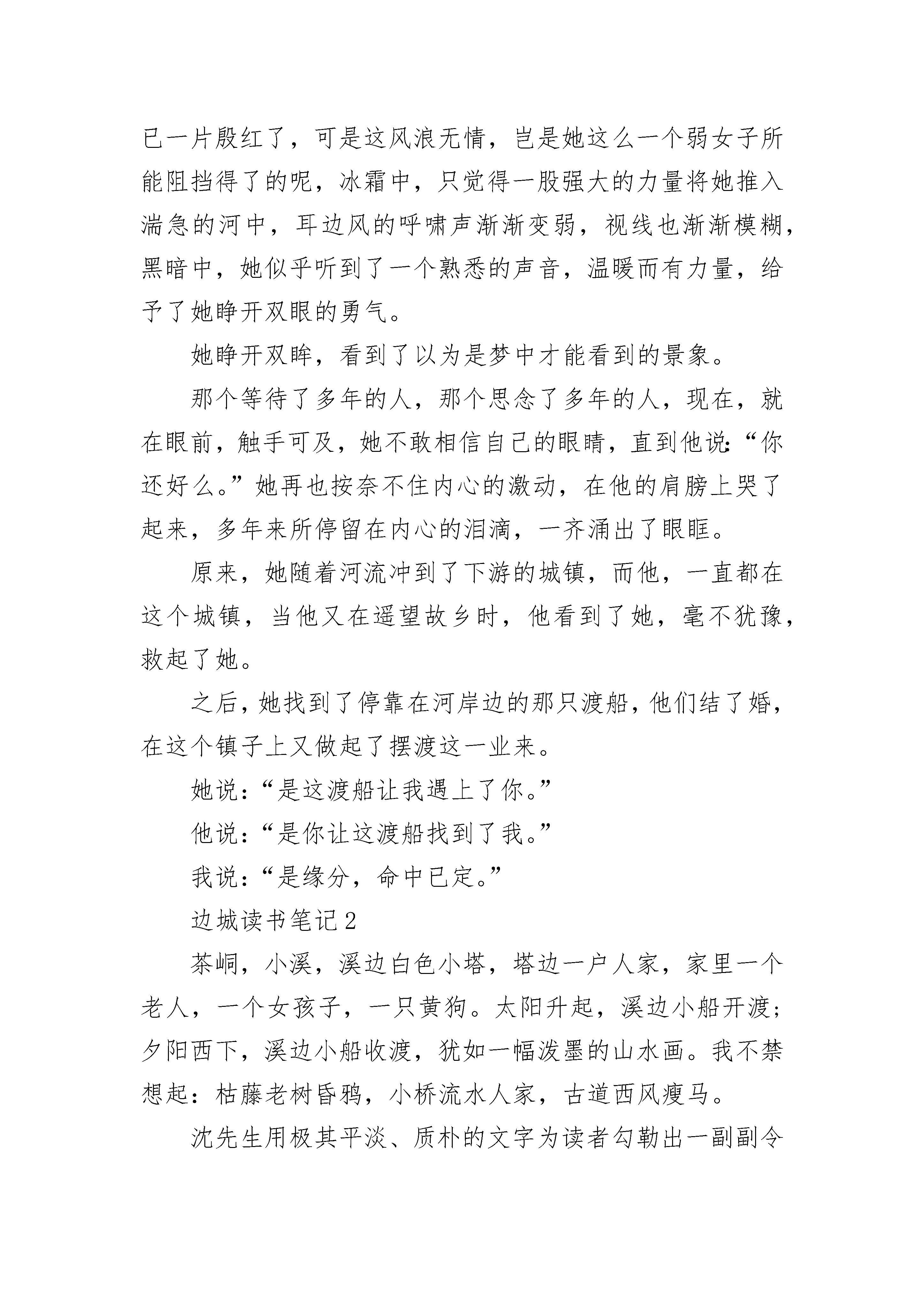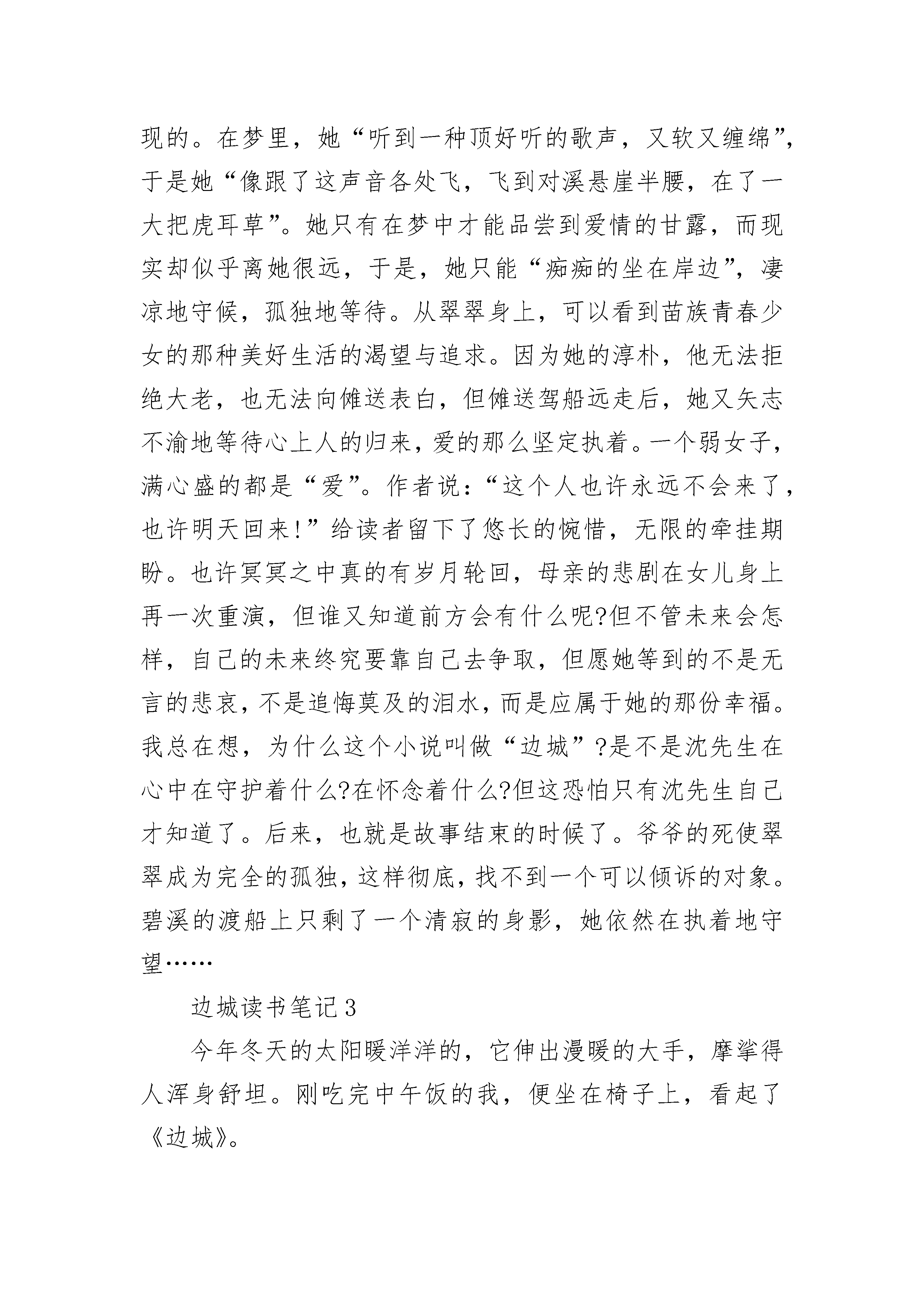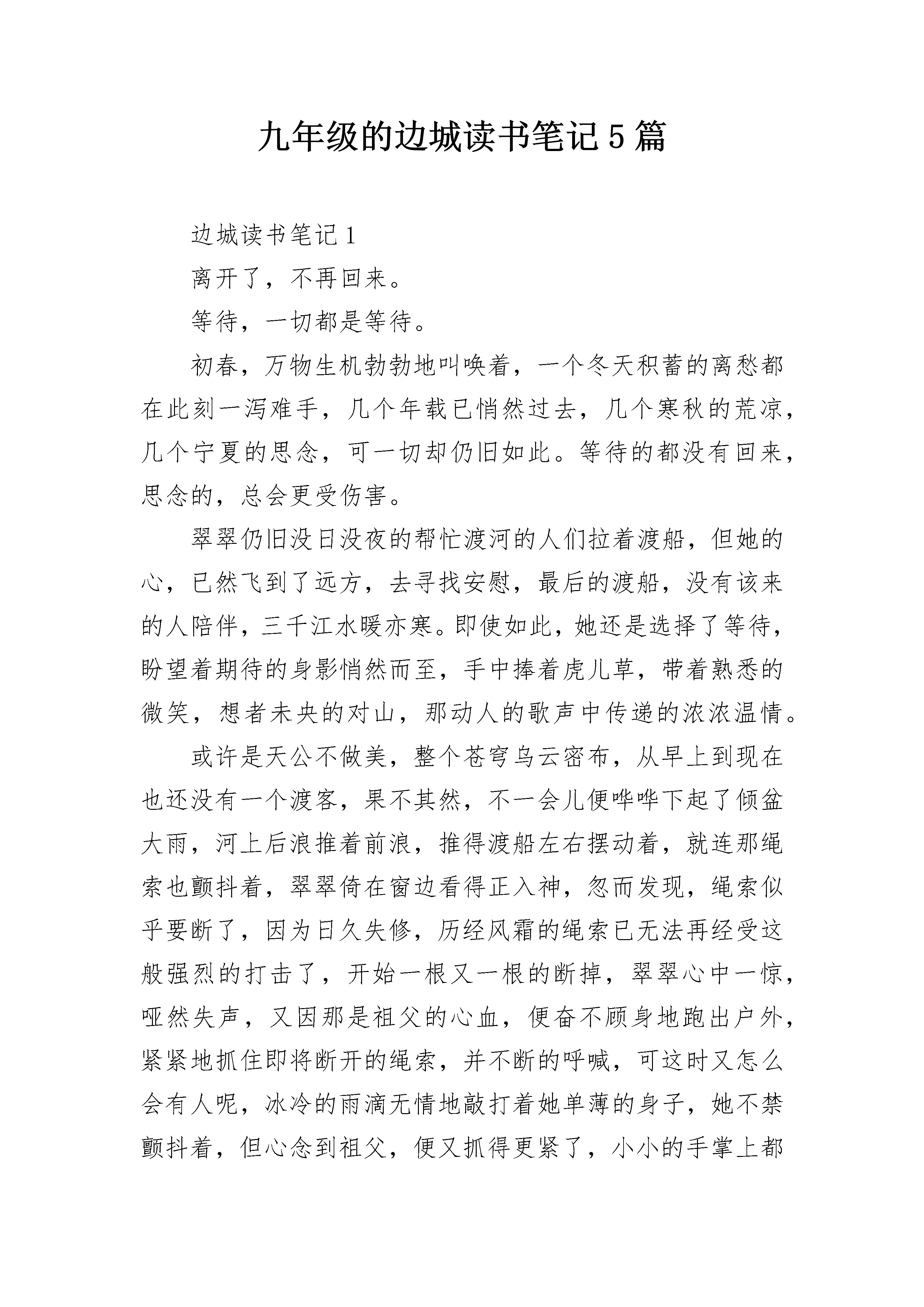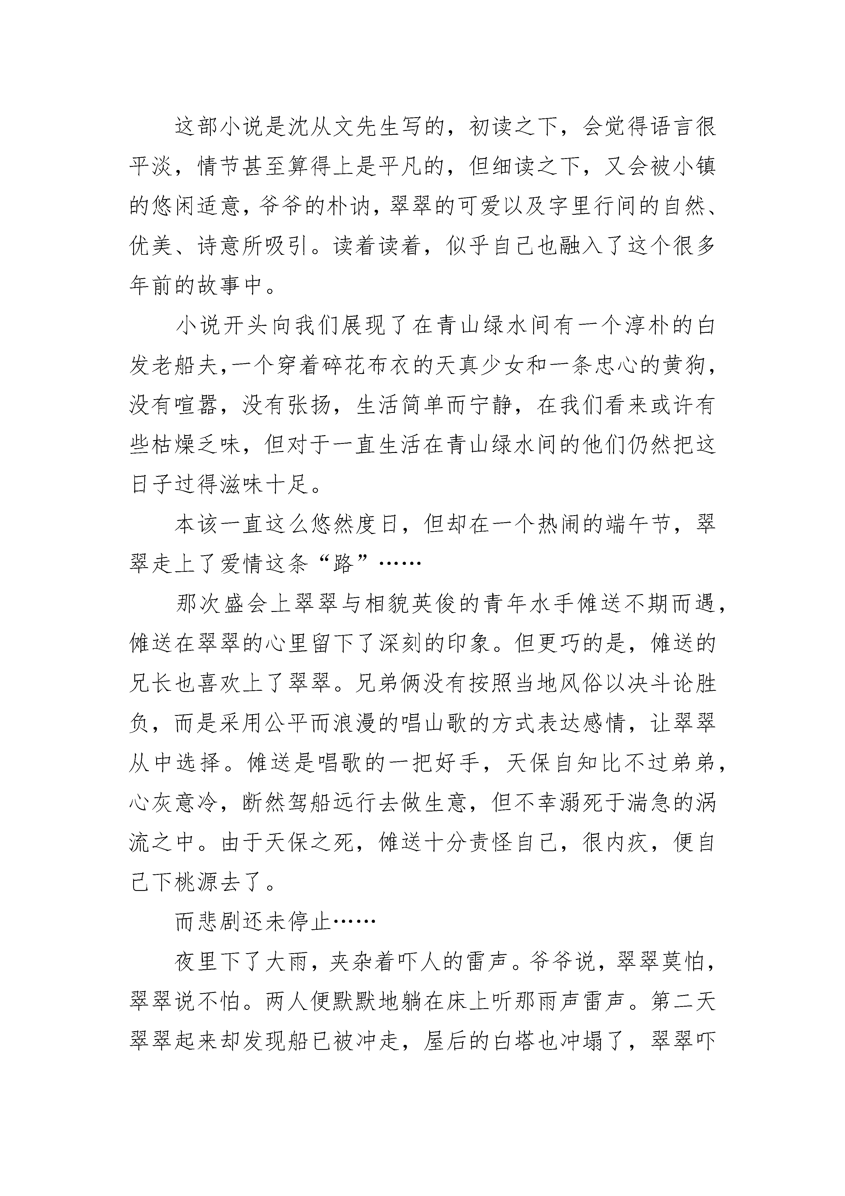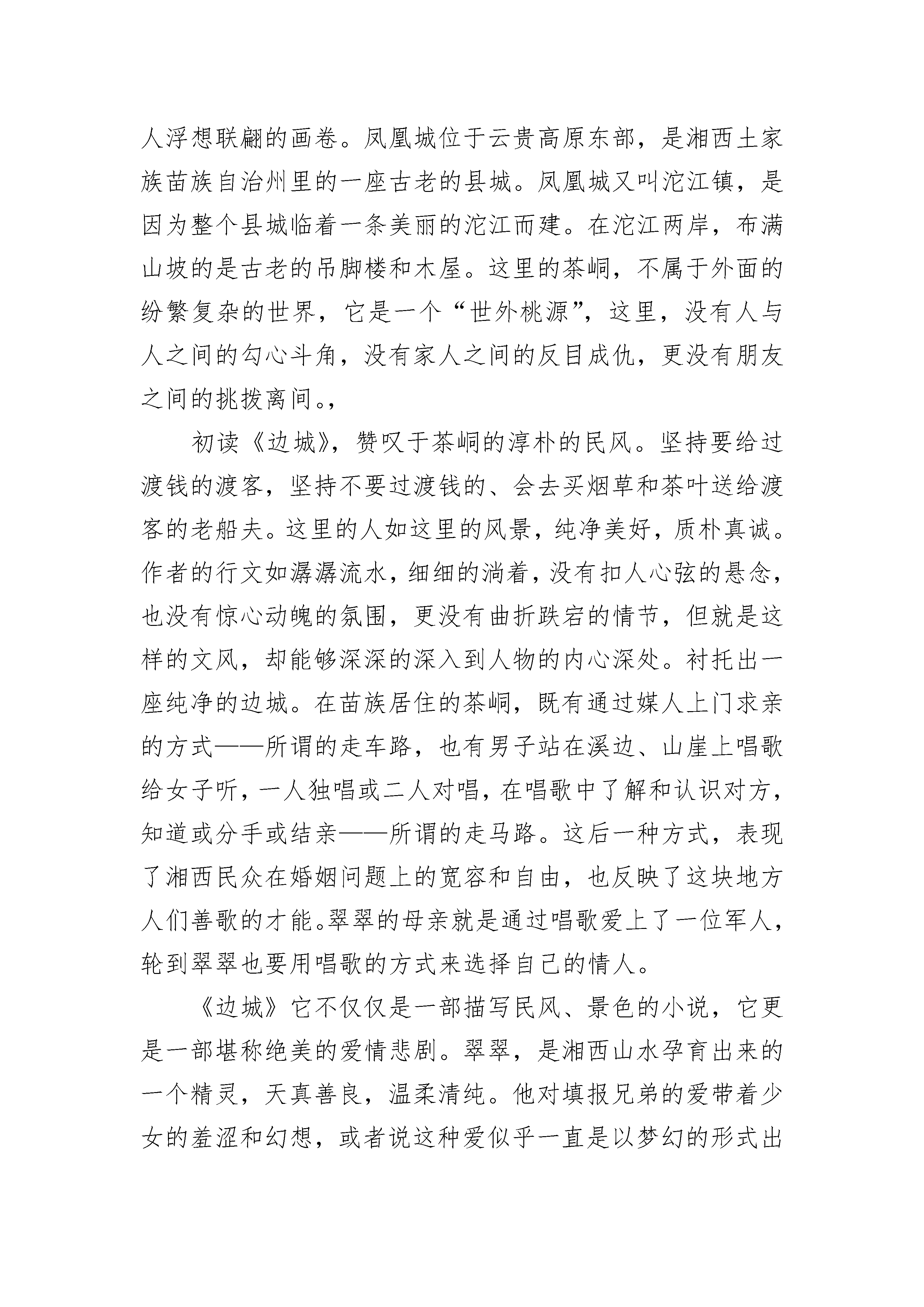 九年级的边城读书笔记5篇边城读书笔记1离开了,不再回来。等待,一切都是等待。初春,万物生机勃勃地叫唤着,一个冬天积蓄的离愁都在此刻一泻难手,几个年载已悄然过去,几个寒秋的荒凉,几个宁夏的思念,可一切却仍旧如此。等待的都没有回来,思念的,总会更受伤害。翠翠仍旧没日没夜的帮忙渡河的人们拉着渡船,但她的心,已然飞到了远方,去寻找安慰,最后的渡船,没有该来的人陪伴,三千江水暖亦寒。即使如此,她还是选择了等待,盼望着期待的身影悄然而至,手中捧着虎儿草,带着熟悉的微笑,想者未央的对山,那动人的歌声中传递的浓浓温情。或许是天公不做美,整个苍穹乌云密布,从早上到现在也还没有一个渡客,果不其然,不一会儿便哗哗下起了倾盆大雨,河上后浪推着前浪,推得渡船左右摆动着,就连那绳索也颤抖着,翠翠倚在窗边看得正入神,忽而发现,绳索似乎要断了,因为日久失修,历经风霜的绳索已无法再经受这般强烈的打击了,开始一根又一根的断掉,翠翠心中一惊,哑然失声,又因那是祖父的心血,便奋不顾身地跑出户外,紧紧地抓住即将断开的绳索,并不断的呼喊,可这时又怎么会有人呢,冰冷的雨滴无情地敲打着她单薄的身子,她不禁颤抖着,但心念到祖父,便又抓得更紧了,小小的手掌上都已一片殷红了,可是这风浪无情,岂是她这么一个弱女子所能阻挡得了的呢,冰霜中,只觉得一股强大的力量将她推入湍急的河中,耳边风的呼啸声渐渐变弱,视线也渐渐模糊,黑暗中,她似乎听到了一个熟悉的声音,温暖而有力量,给予了她睁开双眼的勇气。她睁开双眸,看到了以为是梦中才能看到的景象。那个等待了多年的人,那个思念了多年的人,现在,就在眼前,触手可及,她不敢相信自己的眼睛,直到他说:“你还好么。”她再也按奈不住内心的激动,在他的肩膀上哭了起来,多年来所停留在内心的泪滴,一齐涌出了眼眶。原来,她随着河流冲到了下游的城镇,而他,一直都在这个城镇,当他又在遥望故乡时,他看到了她,毫不犹豫,救起了她。之后,她找到了停靠在河岸边的那只渡船,他们结了婚,在这个镇子上又做起了摆渡这一业来。她说:“是这渡船让我遇上了你。”他说:“是你让这渡船找到了我。”我说:“是缘分,命中已定。”边城读书笔记2茶峒,小溪,溪边白色小塔,塔边一户人家,家里一个老人,一个女孩子,一只黄狗。太阳升起,溪边小船开渡;夕阳西下,溪边小船收渡,犹如一幅泼墨的山水画。我不禁想起:枯藤老树昏鸦,小桥流水人家,古道西风瘦马。沈先生用极其平淡、质朴的文字为读者勾勒出一副副令人浮想联翩的画卷。凤凰城位于云贵高原东部,是湘西土家族苗族自治州里的一座古老的县城。凤凰城又叫沱江镇,是因为整个县城临着一条美丽的沱江而建。在沱江两岸,布满山坡的是古老的吊脚楼和木屋。这里的茶峒,不属于外面的纷繁复杂的世界,它是一个“世外桃源”,这里,没有人与人之间的勾心斗角,没有家人之间的反目成仇,更没有朋友之间的挑拨离间。,初读《边城》,赞叹于茶峒的淳朴的民风。坚持要给过渡钱的渡客,坚持不要过渡钱的、会去买烟草和茶叶送给渡客的老船夫。这里的人如这里的风景,纯净美好,质朴真诚。作者的行文如潺潺流水,细细的淌着,没有扣人心弦的悬念,也没有惊心动魄的氛围,更没有曲折跌宕的情节,但就是这样的文风,却能够深深的深入到人物的内心深处。衬托出一座纯净的边城。在苗族居住的茶峒,既有通过媒人上门求亲的方式——所谓的走车路,也有男子站在溪边、山崖上唱歌给女子听,一人独唱或二人对唱,在唱歌中了解和认识对方,知道或分手或结亲——所谓的走马路。这后一种方式,表现了湘西民众在婚姻问题上的宽容和自由,也反映了这块地方人们善歌的才能。翠翠的母亲就是通过唱歌爱上了一位军人,轮到翠翠也要用唱歌的方式来选择自己的情人。《边城》它不仅仅是一部描写民风、景色的小说,它更是一部堪称绝美的爱情悲剧。翠翠,是湘西山水孕育出来的一个精灵,天真善良,温柔清纯。他对填报兄弟的爱带着少女的羞涩和幻想,或者说这种爱似乎一直是以梦幻的形式出现的。在梦里,她“听到一种顶好听的歌声,又软又缠绵”,于是她“像跟了这声音各处飞,飞到对溪悬崖半腰,在了一大把虎耳草”。她只有在梦中才能品尝到爱情的甘露,而现实却似乎离她很远,于是,她只能“痴痴的坐在岸边”,凄凉地守候,孤独地等待。从翠翠身上,可以看到苗族青春少女的那种美好生活的渴望与追求。因为她的淳朴,他无法拒绝大老,也无法向傩送表白,但傩送驾船远走后,她又矢志不渝地等待心上人的归来,爱的那么坚定执着。一个弱女子,满心盛的都是“爱”。作者说:“这个人也许永远不会来了,也许明天回来!”给读者留下了悠长的惋惜,无限的牵挂期盼。也许冥冥之中真的有岁月轮回,母亲的悲剧在女儿身上再一次重演,但谁又知道前方会有什么呢?但不管未来会怎样,自己的未来终究要靠自己去争取,但愿她等到的不是无言的悲哀,不是追悔莫及的泪水,而是应属于她的那份幸福。我总在想