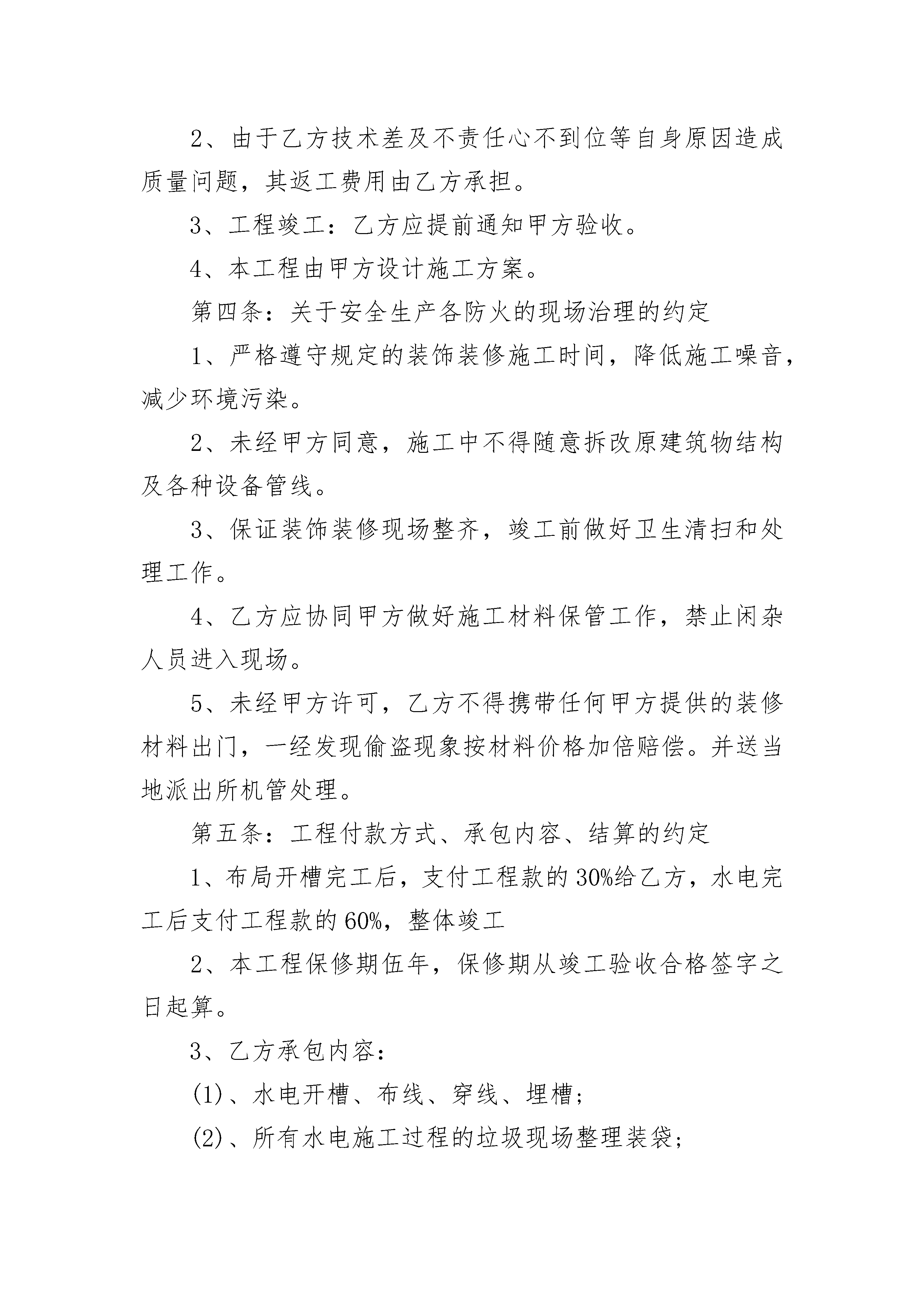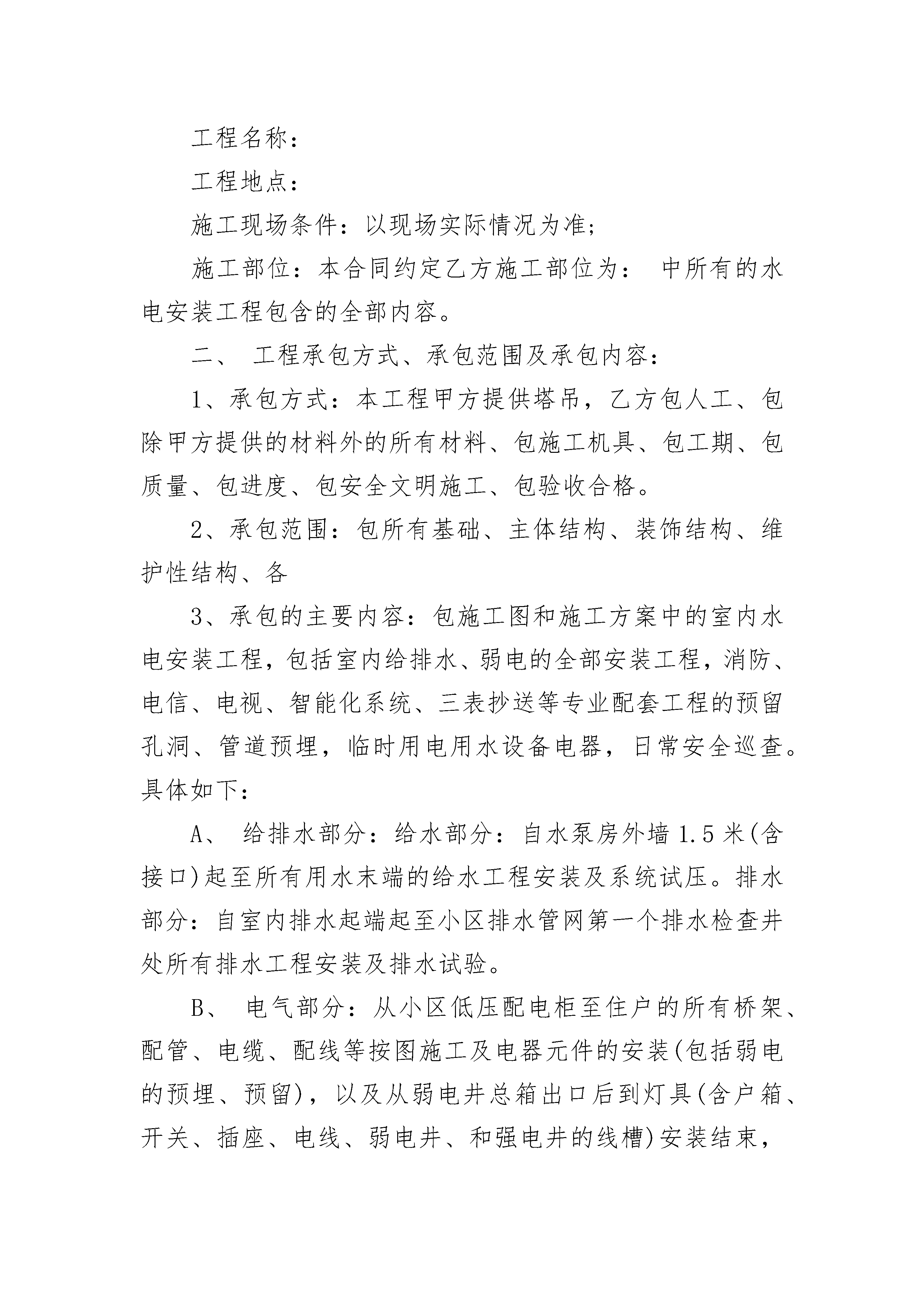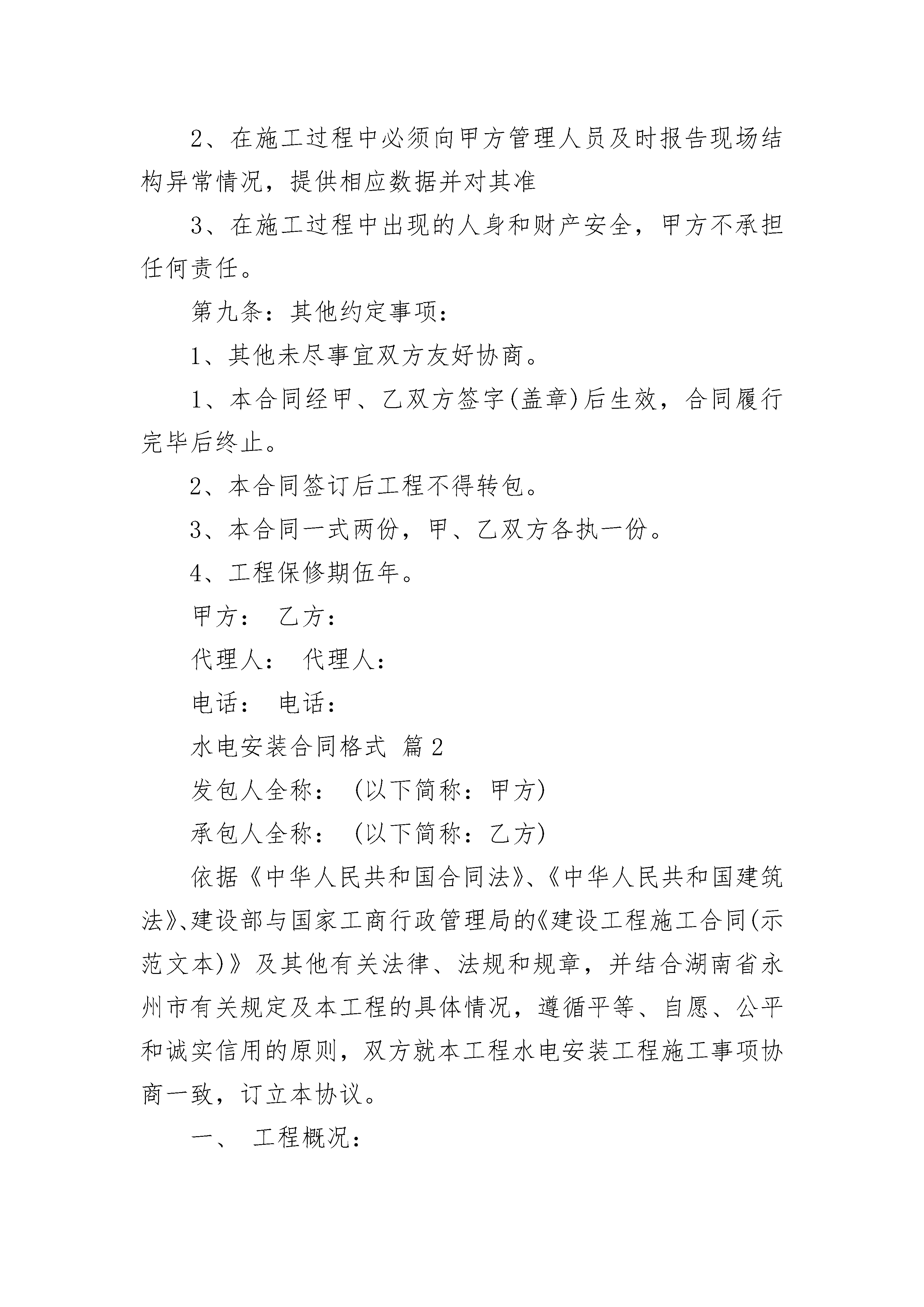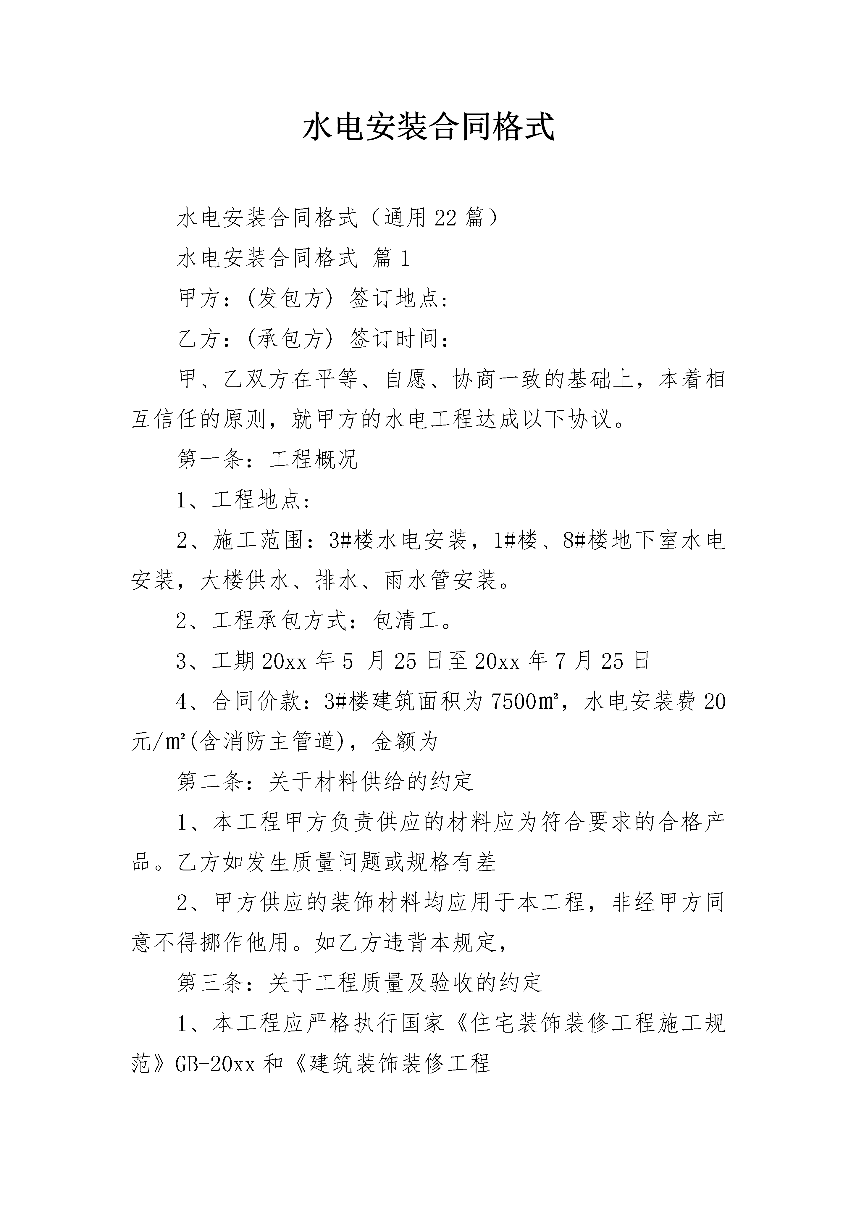 水电安装合同格式水电安装合同格式(通用22篇)水电安装合同格式篇1甲方:(发包方)签订地点:乙方:(承包方)签订时间:甲、乙双方在平等、自愿、协商一致的基础上,本着相互信任的原则,就甲方的水电工程达成以下协议。第一条:工程概况1、工程地点:2、施工范围:3#楼水电安装,1#楼、8#楼地下室水电安装,大楼供水、排水、雨水管安装。2、工程承包方式:包清工。3、工期20xx年5月25日至20xx年7月25日4、合同价款:3#楼建筑面积为7500㎡,水电安装费20元/㎡(含消防主管道),金额为第二条:关于材料供给的约定1、本工程甲方负责供应的材料应为符合要求的合格产品。乙方如发生质量问题或规格有差2、甲方供应的装饰材料均应用于本工程,非经甲方同意不得挪作他用。如乙方违背本规定,第三条:关于工程质量及验收的约定1、本工程应严格执行国家《住宅装饰装修工程施工规范》GB-20xx和《建筑装饰装修工程2、由于乙方技术差及不责任心不到位等自身原因造成质量问题,其返工费用由乙方承担。3、工程竣工:乙方应提前通知甲方验收。4、本工程由甲方设计施工方案。第四条:关于安全生产各防火的现场治理的约定1、严格遵守规定的装饰装修施工时间,降低施工噪音,减少环境污染。2、未经甲方同意,施工中不得随意拆改原建筑物结构及各种设备管线。3、保证装饰装修现场整齐,竣工前做好卫生清扫和处理工作。4、乙方应协同甲方做好施工材料保管工作,禁止闲杂人员进入现场。5、未经甲方许可,乙方不得携带任何甲方提供的装修材料出门,一经发现偷盗现象按材料价格加倍赔偿。并送当地派出所机管处理。第五条:工程付款方式、承包内容、结算的约定1、布局开槽完工后,支付工程款的30%给乙方,水电完工后支付工程款的60%,整体竣工2、本工程保修期伍年,保修期从竣工验收合格签字之日起算。3、乙方承包内容:(1)、水电开槽、布线、穿线、埋槽;(2)、所有水电施工过程的垃圾现场整理装袋;(3)、水电施工穿墙、打孔、切割;(4)、开关插座面板安装;(5)、小五金的安装;(6)后期灯具的安装;(7)、1#楼、8#楼地下室水电安装,大楼供水、排水、雨水管道,消防主管道安装。第六条:纠纷处理因工程质量双方发生争议时,双方协商解决,协商不成,在甲方所在地人民法院起诉。第七条:其它约定1、因气候、停电等不可抗力或不可预见因素造成的工期延误,经双方确认后可以顺延。2、甲方在入住前可以要求乙方来现场配合其他工种的施工。3、保修期内由于乙方的施工造成的质量问题由乙方免费维修,在接到甲方通知后12小时第八条、双方责任甲方责任:1提供现场施工用水、用电。2提供乙方现场施工人员住宿场地和材料临时周转、堆放场地。乙方责任:1、在施工过程中必须严格执行有关技术规范,质量标准,保证施工质量和施工进度,施工2、在施工过程中必须向甲方管理人员及时报告现场结构异常情况,提供相应数据并对其准3、在施工过程中出现的人身和财产安全,甲方不承担任何责任。第九条:其他约定事项:1、其他未尽事宜双方友好协商。1、本合同经甲、乙双方签字(盖章)后生效,合同履行完毕后终止。2、本合同签订后工程不得转包。3、本合同一式两份,甲、乙双方各执一份。4、工程保修期伍年。甲方:乙方:代理人:代理人:电话:电话:水电安装合同格式篇2发包人全称:(以下简称:甲方)承包人全称:(以下简称:乙方)依据《中华人民共和国合同法》、《中华人民共和国建筑法》、建设部与国家工商行政管理局的《建设工程施工合同(示范文本)》及其他有关法律、法规和规章,并结合湖南省永州市有关规定及本工程的具体情况,遵循平等、自愿、公平和诚实信用的原则,双方就本工程水电安装工程施工事项协商一致,订立本协议。一、工程概况:工程名称:工程地点:施工现场条件:以现场实际情况为准;施工部位:本合同约定乙方施工部位为:中所有的水电安装工程包含的全部内容。二、工程承包方式、承包范围及承包内容:1、承包方式:本工程甲方提供塔吊,乙方包人工、包除甲方提供的材料外的所有材料、包施工机具、包工期、包质量、包进度、包安全文明施工、包验收合格。2、承包范围:包所有基础、主体结构、装饰结构、维护性结构、各3、承包的主要内容:包施工图和施工方案中的室内水电安装工程,包括室内给排水、弱电的全部安装工程,消防、电信、电视、智能化系统、三表抄送等专业配套工程的预留孔洞、管道预埋,临时用电用水设备电器,日常安全巡查。具体如下:A、给排水部分:给水部分:自水泵房外墙1.5米(含接口)起至所有用水末端的给水工程安装及系统试压。排水部分:自室内排水起端起至小区排水管网第一个排水检查井处所有排水工程安装及排水试验。B、电气部分:从小区低压配电柜至住户的所有桥架、配管、电缆、配线等按图施工及电器元件的安装(包括弱电的预埋、预留),以及从弱电井总箱出口后到