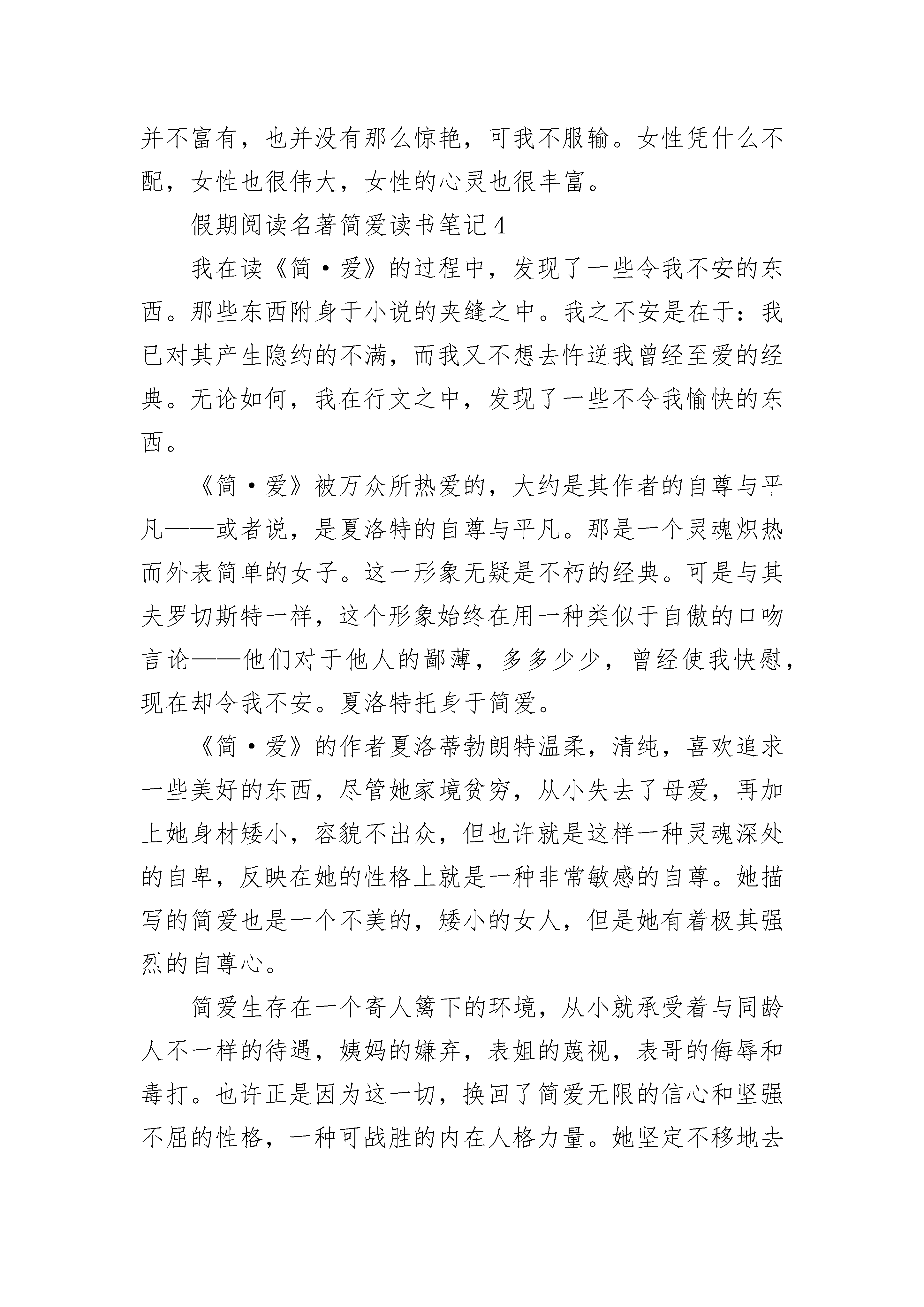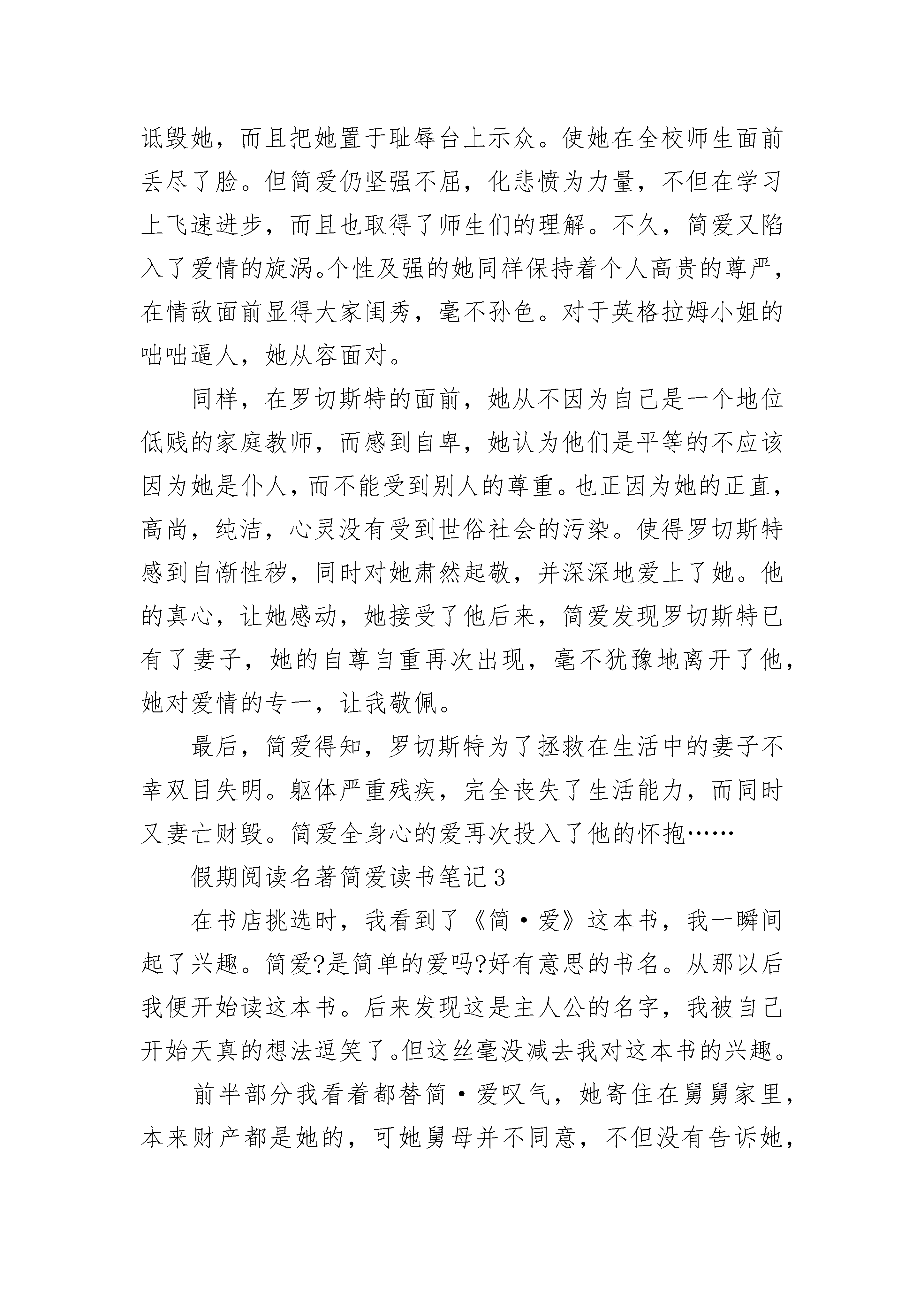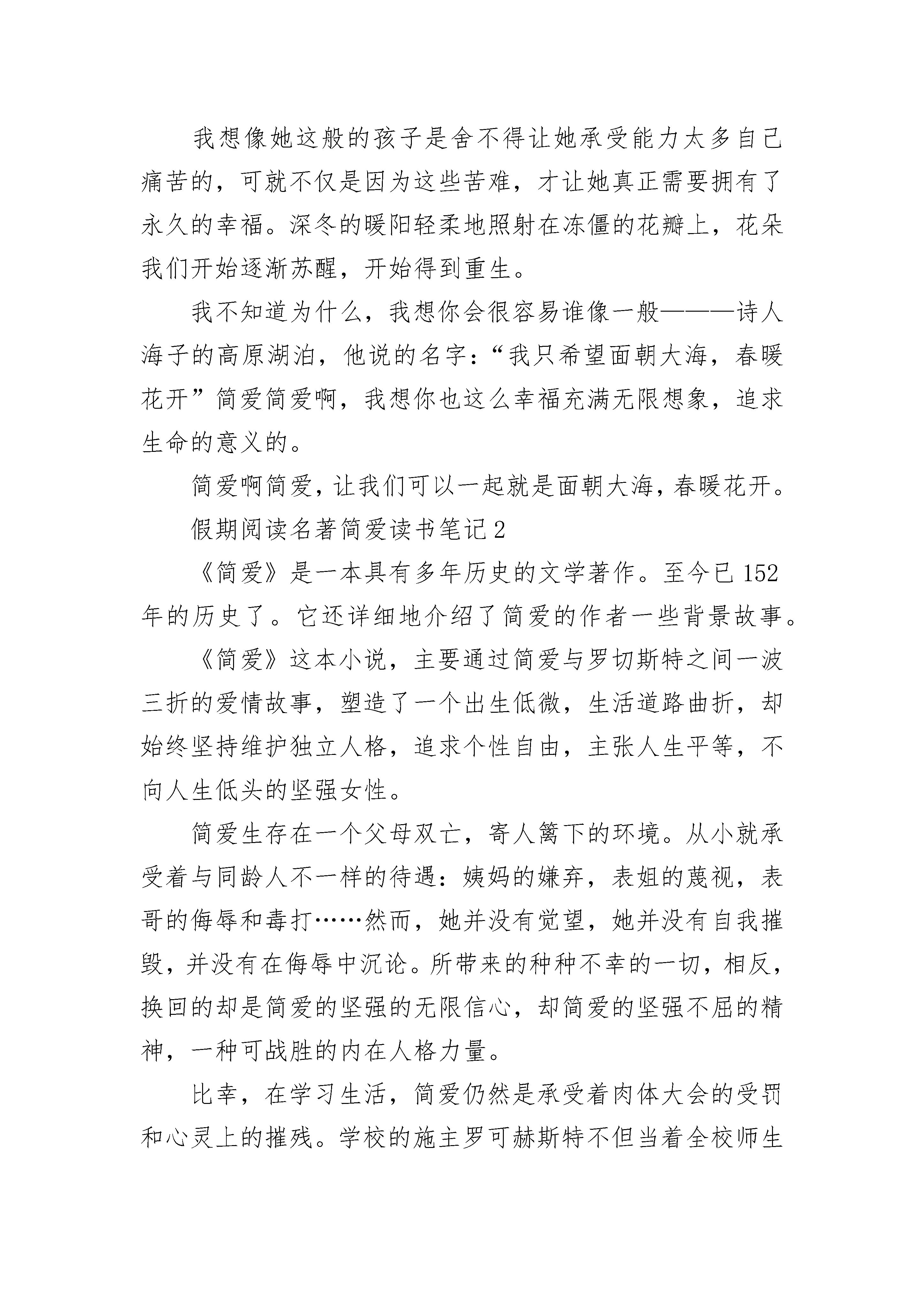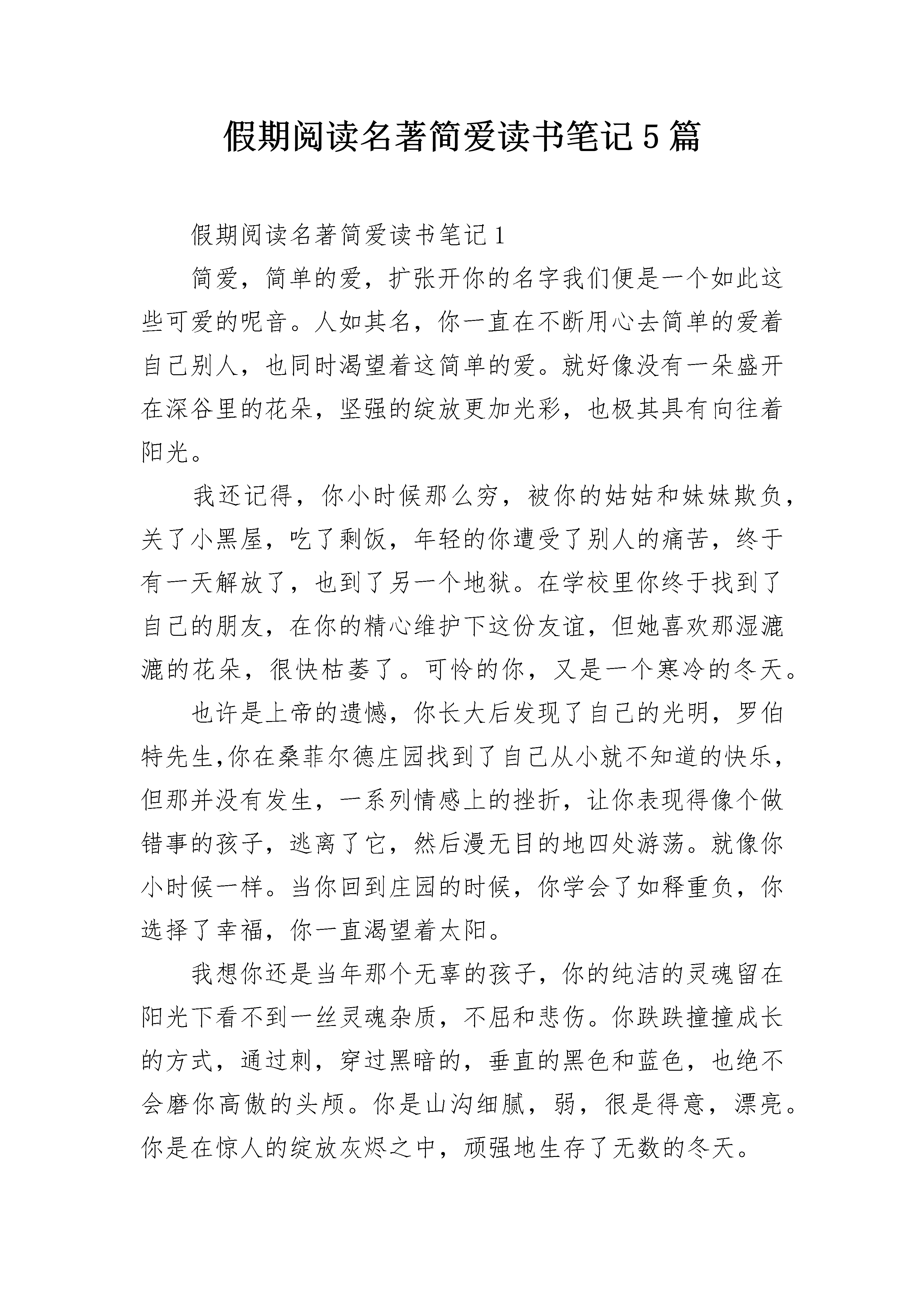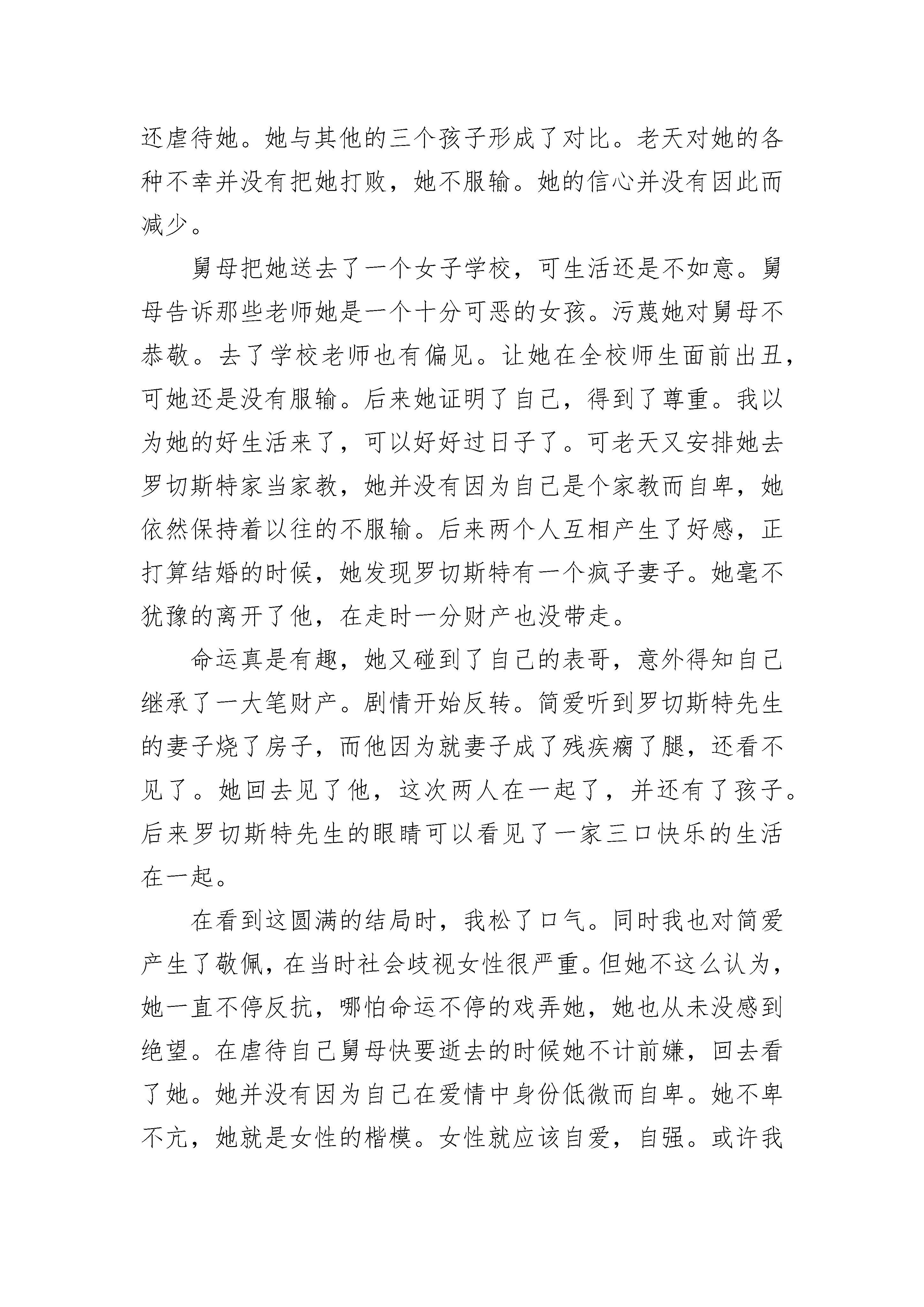 假期阅读名著简爱读书笔记5篇假期阅读名著简爱读书笔记1简爱,简单的爱,扩张开你的名字我们便是一个如此这些可爱的呢音。人如其名,你一直在不断用心去简单的爱着自己别人,也同时渴望着这简单的爱。就好像没有一朵盛开在深谷里的花朵,坚强的绽放更加光彩,也极其具有向往着阳光。我还记得,你小时候那么穷,被你的姑姑和妹妹欺负,关了小黑屋,吃了剩饭,年轻的你遭受了别人的痛苦,终于有一天解放了,也到了另一个地狱。在学校里你终于找到了自己的朋友,在你的精心维护下这份友谊,但她喜欢那湿漉漉的花朵,很快枯萎了。可怜的你,又是一个寒冷的冬天。也许是上帝的遗憾,你长大后发现了自己的光明,罗伯特先生,你在桑菲尔德庄园找到了自己从小就不知道的快乐,但那并没有发生,一系列情感上的挫折,让你表现得像个做错事的孩子,逃离了它,然后漫无目的地四处游荡。就像你小时候一样。当你回到庄园的时候,你学会了如释重负,你选择了幸福,你一直渴望着太阳。我想你还是当年那个无辜的孩子,你的纯洁的灵魂留在阳光下看不到一丝灵魂杂质,不屈和悲伤。你跌跌撞撞成长的方式,通过刺,穿过黑暗的,垂直的黑色和蓝色,也绝不会磨你高傲的头颅。你是山沟细腻,弱,很是得意,漂亮。你是在惊人的绽放灰烬之中,顽强地生存了无数的冬天。我想像她这般的孩子是舍不得让她承受能力太多自己痛苦的,可就不仅是因为这些苦难,才让她真正需要拥有了永久的幸福。深冬的暖阳轻柔地照射在冻僵的花瓣上,花朵我们开始逐渐苏醒,开始得到重生。我不知道为什么,我想你会很容易谁像一般———诗人海子的高原湖泊,他说的名字:“我只希望面朝大海,春暖花开”简爱简爱啊,我想你也这么幸福充满无限想象,追求生命的意义的。简爱啊简爱,让我们可以一起就是面朝大海,春暖花开。假期阅读名著简爱读书笔记2《简爱》是一本具有多年历史的文学著作。至今已152年的历史了。它还详细地介绍了简爱的作者一些背景故事。《简爱》这本小说,主要通过简爱与罗切斯特之间一波三折的爱情故事,塑造了一个出生低微,生活道路曲折,却始终坚持维护独立人格,追求个性自由,主张人生平等,不向人生低头的坚强女性。简爱生存在一个父母双亡,寄人篱下的环境。从小就承受着与同龄人不一样的待遇:姨妈的嫌弃,表姐的蔑视,表哥的侮辱和毒打……然而,她并没有觉望,她并没有自我摧毁,并没有在侮辱中沉论。所带来的种种不幸的一切,相反,换回的却是简爱的坚强的无限信心,却简爱的坚强不屈的精神,一种可战胜的内在人格力量。比幸,在学习生活,简爱仍然是承受着肉体大会的受罚和心灵上的摧残。学校的施主罗可赫斯特不但当着全校师生诋毁她,而且把她置于耻辱台上示众。使她在全校师生面前丢尽了脸。但简爱仍坚强不屈,化悲愤为力量,不但在学习上飞速进步,而且也取得了师生们的理解。不久,简爱又陷入了爱情的旋涡。个性及强的她同样保持着个人高贵的尊严,在情敌面前显得大家闺秀,毫不孙色。对于英格拉姆小姐的咄咄逼人,她从容面对。同样,在罗切斯特的面前,她从不因为自己是一个地位低贱的家庭教师,而感到自卑,她认为他们是平等的不应该因为她是仆人,而不能受到别人的尊重。也正因为她的正直,高尚,纯洁,心灵没有受到世俗社会的污染。使得罗切斯特感到自惭性秽,同时对她肃然起敬,并深深地爱上了她。他的真心,让她感动,她接受了他后来,简爱发现罗切斯特已有了妻子,她的自尊自重再次出现,毫不犹豫地离开了他,她对爱情的专一,让我敬佩。最后,简爱得知,罗切斯特为了拯救在生活中的妻子不幸双目失明。躯体严重残疾,完全丧失了生活能力,而同时又妻亡财毁。简爱全身心的爱再次投入了他的怀抱……假期阅读名著简爱读书笔记3在书店挑选时,我看到了《简·爱》这本书,我一瞬间起了兴趣。简爱?是简单的爱吗?好有意思的书名。从那以后我便开始读这本书。后来发现这是主人公的名字,我被自己开始天真的想法逗笑了。但这丝毫没减去我对这本书的兴趣。前半部分我看着都替简·爱叹气,她寄住在舅舅家里,本来财产都是她的,可她舅母并不同意,不但没有告诉她,还虐待她。她与其他的三个孩子形成了对比。老天对她的各种不幸并没有把她打败,她不服输。她的信心并没有因此而减少。舅母把她送去了一个女子学校,可生活还是不如意。舅母告诉那些老师她是一个十分可恶的女孩。污蔑她对舅母不恭敬。去了学校老师也有偏见。让她在全校师生面前出丑,可她还是没有服输。后来她证明了自己,得到了尊重。我以为她的好生活来了,可以好好过日子了。可老天又安排她去罗切斯特家当家教,她并没有因为自己是个家教而自卑,她依然保持着以往的不服输。后来两个人互相产生了好感,正打算结婚的时候,她发现罗切斯特有一个疯子妻子。她毫不犹豫的离开了他,在走时一分财产也没带走。命运真是有趣,她又碰到了自己的表哥,意外得知自己继承了一大笔财产。剧情开始反转。简爱听到罗切斯特先生的妻子烧了房子,而他因为就妻子