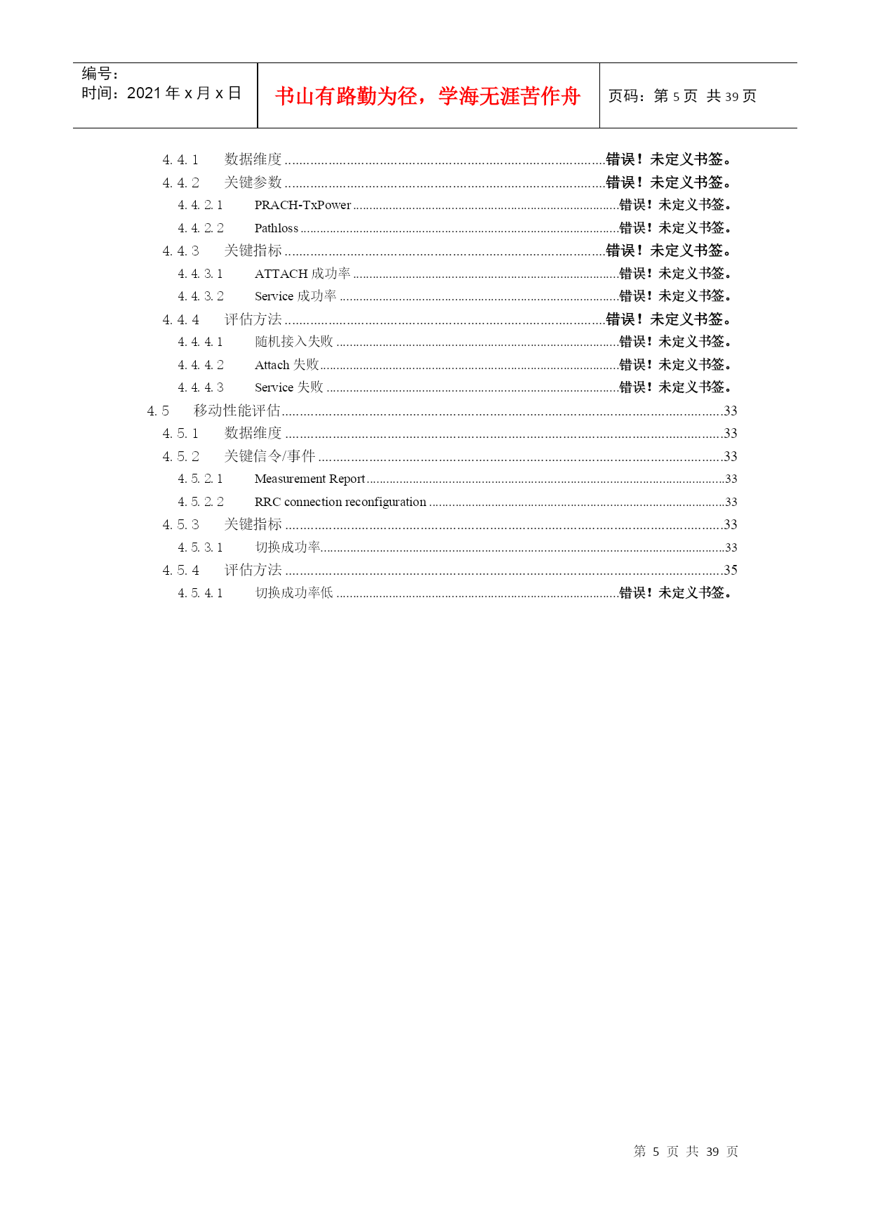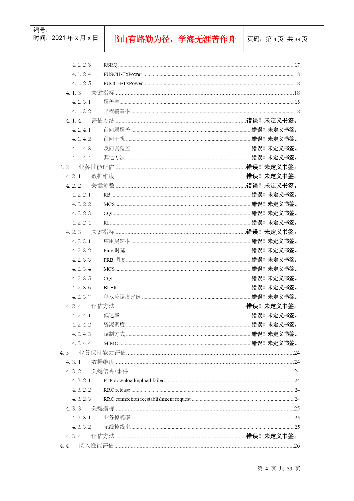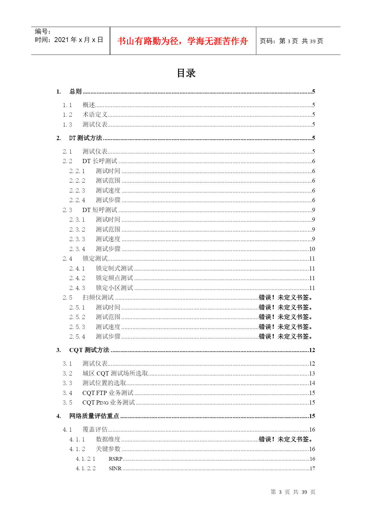 编号: 时间:2021年x月x日 书山有路勤为径,学海无涯苦作舟页码:第页共NUMPAGES39页 第PAGE\*MERGEFORMAT39页共NUMPAGES\*MERGEFORMAT39页 中国电信LTE网络质量评估测试规范 (试行稿) 中国电信集团公司 2014年2月 目录 TOC\o"1-4"\h\z\uHYPERLINK\l"_Toc372540610"1. 总则 PAGEREF_Toc372540610\h5 HYPERLINK\l"_Toc372540611"1.1 概述 PAGEREF_Toc372540611\h5 HYPERLINK\l"_Toc372540612"1.2 术语定义 PAGEREF_Toc372540612\h5 HYPERLINK\l"_Toc372540613"1.3 测试仪表 PAGEREF_Toc372540613\h5 HYPERLINK\l"_Toc372540614"2. DT测试方法 PAGEREF_Toc372540614\h5 HYPERLINK\l"_Toc372540616"2.1 测试仪表 PAGEREF_Toc372540616\h5 HYPERLINK\l"_Toc372540617"2.2 DT长呼测试 PAGEREF_Toc372540617\h6 HYPERLINK\l"_Toc372540622"2.2.1 测试时间 PAGEREF_Toc372540622\h6 HYPERLINK\l"_Toc372540623"2.2.2 测试范围 PAGEREF_Toc372540623\h6 HYPERLINK\l"_Toc372540624"2.2.3 测试速度 PAGEREF_Toc372540624\h6 HYPERLINK\l"_Toc372540625"2.2.4 测试步骤 PAGEREF_Toc372540625\h6 HYPERLINK\l"_Toc372540626"2.3 DT短呼测试 PAGEREF_Toc372540626\h9 HYPERLINK\l"_Toc372540628"2.3.1 测试时间 PAGEREF_Toc372540628\h9 HYPERLINK\l"_Toc372540629"2.3.2 测试范围 PAGEREF_Toc372540629\h9 HYPERLINK\l"_Toc372540630"2.3.3 测试速度 PAGEREF_Toc372540630\h9 HYPERLINK\l"_Toc372540631"2.3.4 测试步骤 PAGEREF_Toc372540631\h10 HYPERLINK\l"_Toc372540632"2.4 锁定测试 PAGEREF_Toc372540632\h11 HYPERLINK\l"_Toc372540634"2.4.1 锁定制式测试 PAGEREF_Toc372540634\h11 HYPERLINK\l"_Toc372540635"2.4.2 锁定频点测试 PAGEREF_Toc372540635\h11 HYPERLINK\l"_Toc372540636"2.4.3 锁定小区测试 PAGEREF_Toc372540636\h11 HYPERLINK\l"_Toc372540637"2.5 扫频仪测试 PAGEREF_Toc372540637\h错误!未定义书签。 HYPERLINK\l"_Toc372540643"2.5.1 测试时间 PAGEREF_Toc372540643\h错误!未定义书签。 HYPERLINK\l"_Toc372540644"2.5.2 测试范围 PAGEREF_Toc372540644\h错误!未定义书签。 HYPERLINK\l"_Toc372540645"2.5.3 测试速度 PAGEREF_Toc372540645\h错误!未定义书签。 HYPERLINK\l"_Toc372540646"2.5.4 测试步骤 PAGEREF_Toc372540646\h错误!未定义书签。 HYPERLINK\l"_Toc372540647"3. CQT测试方法 PAGEREF_Toc372540647\h12 HYPERLINK\l"_Toc372540649