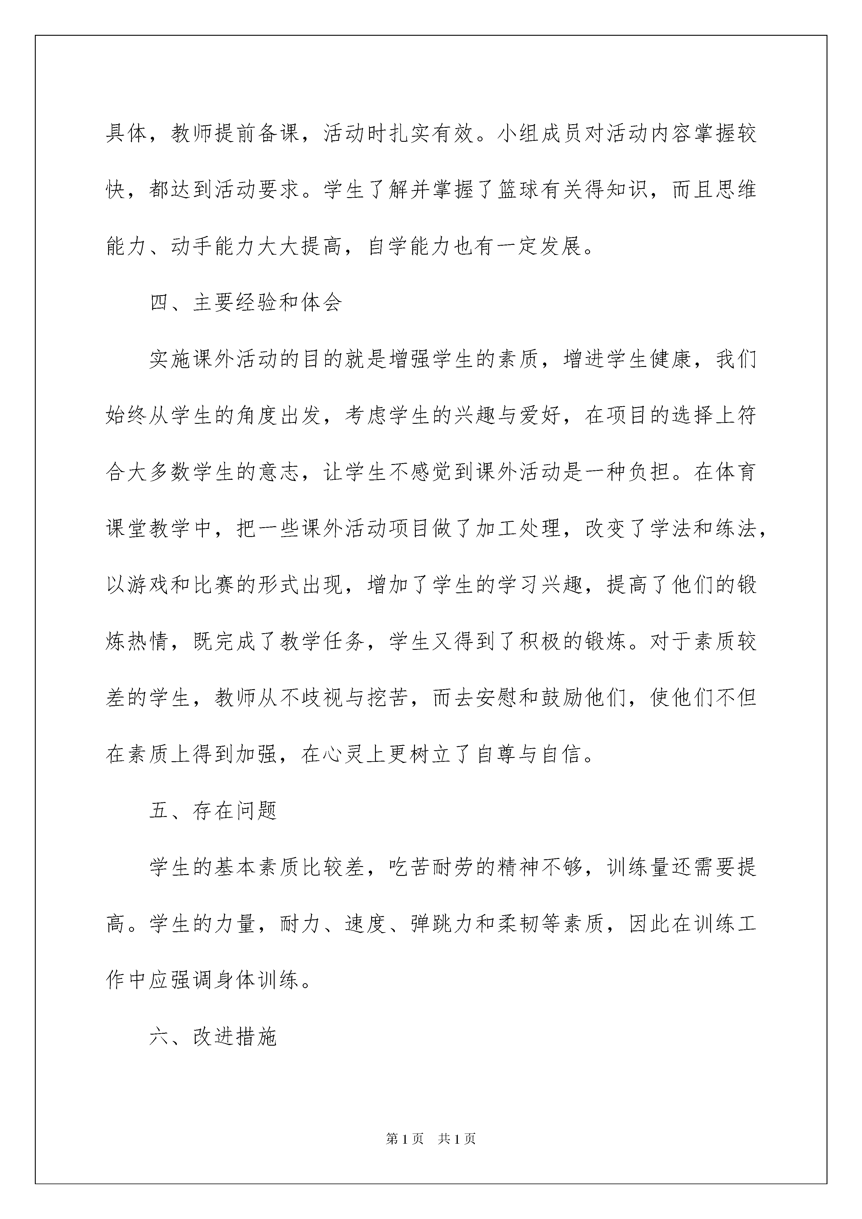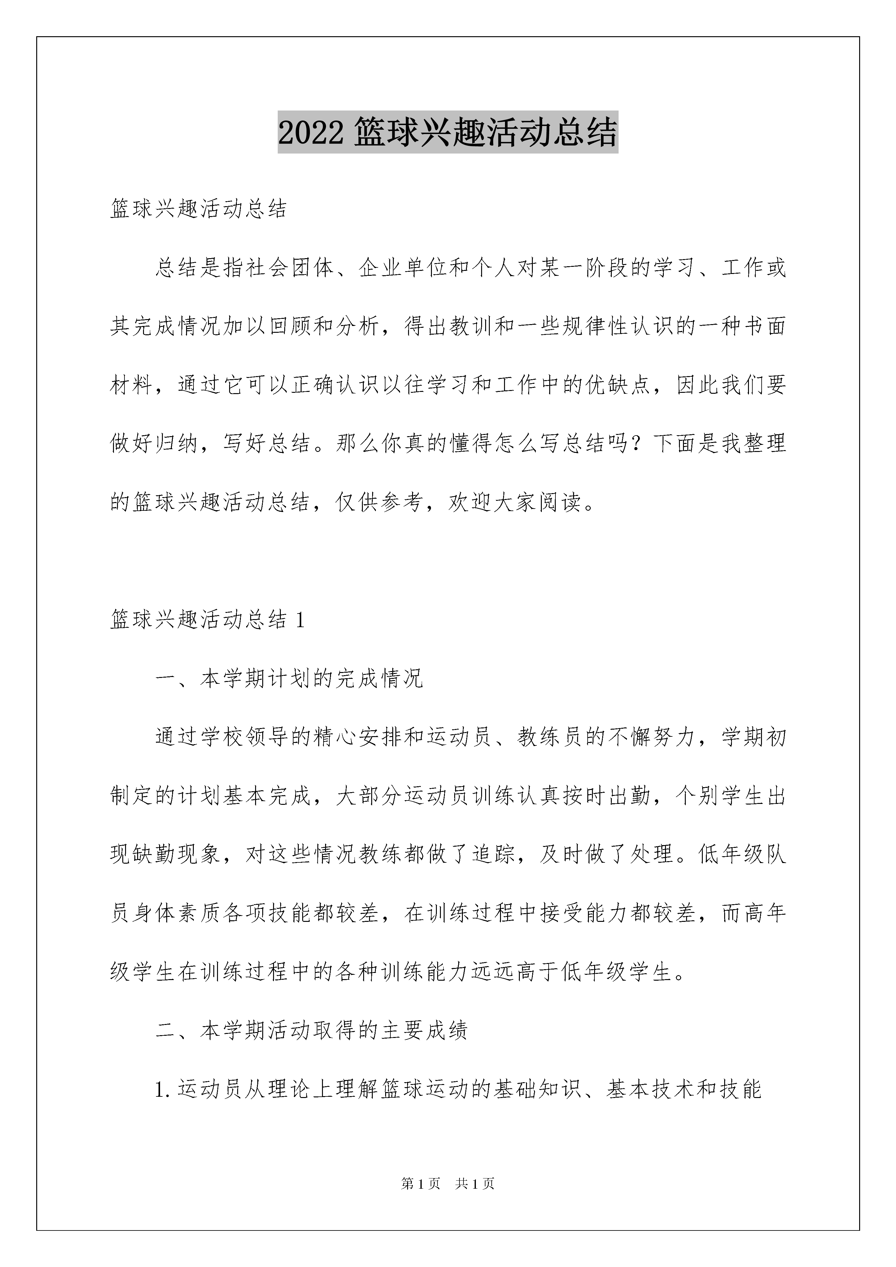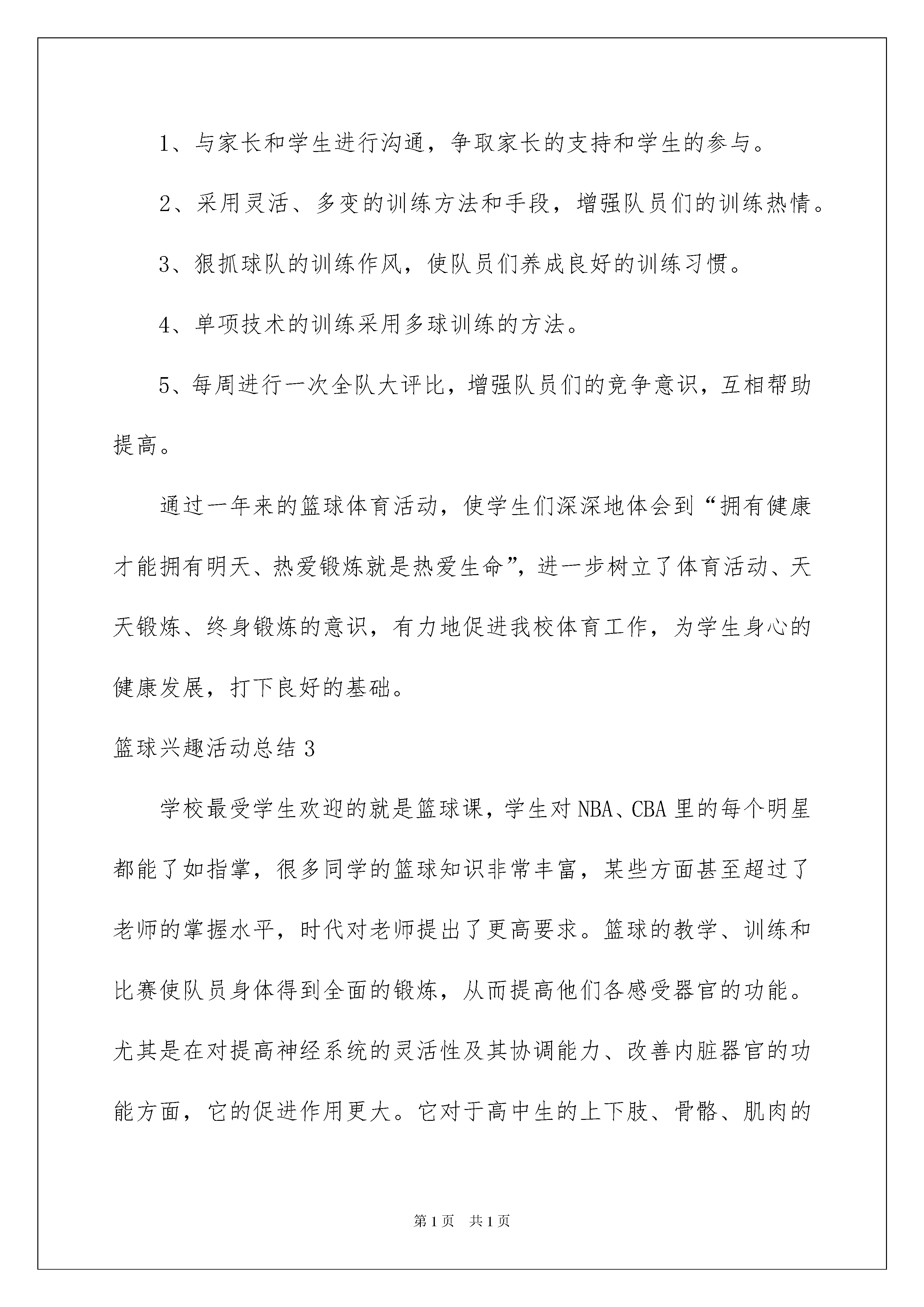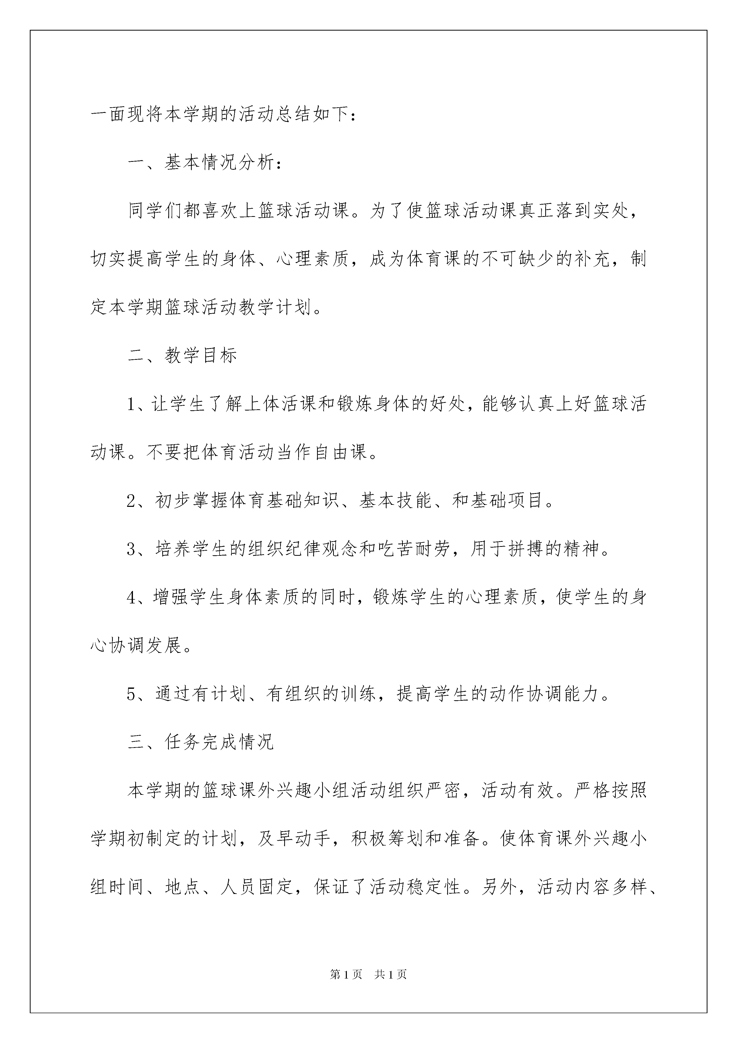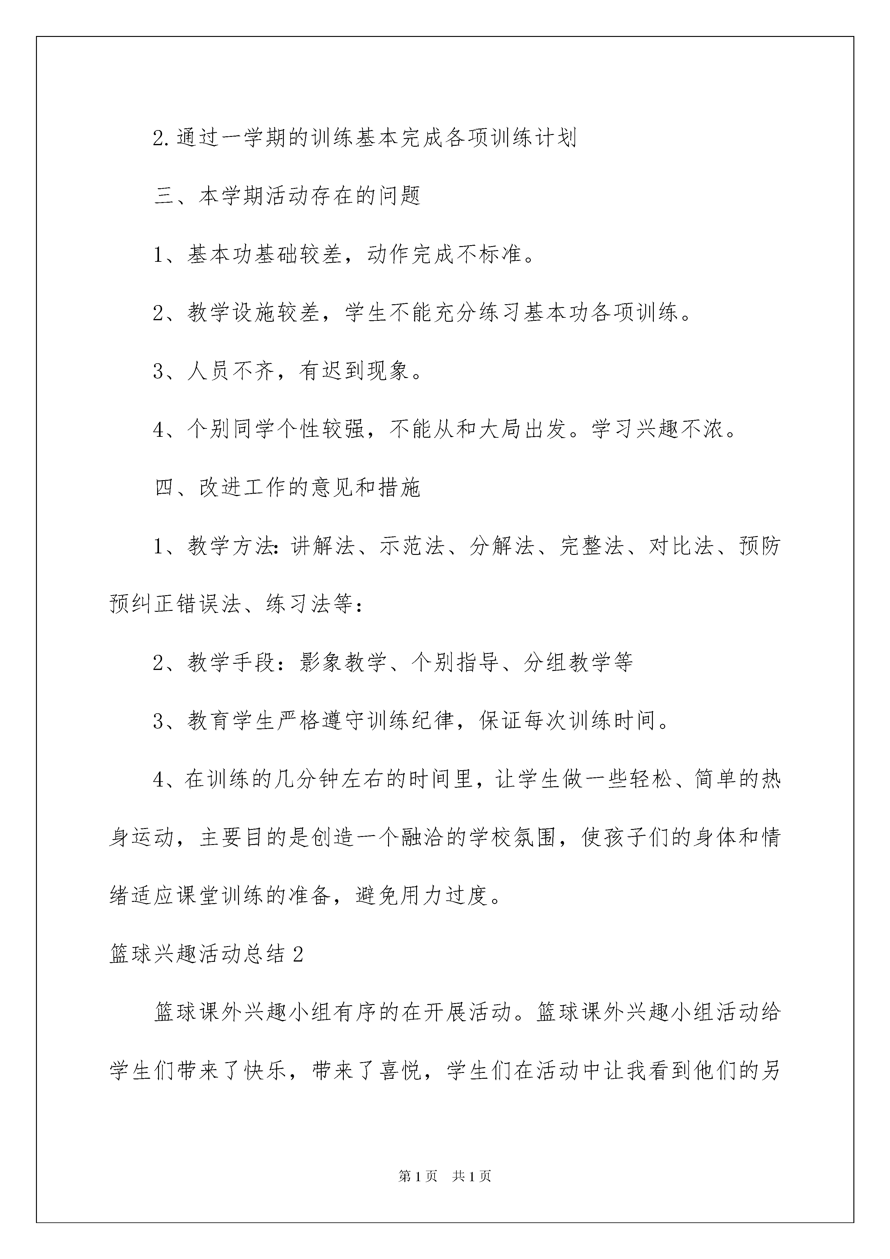 2022篮球兴趣活动总结篮球兴趣活动总结总结是指社会团体、企业单位和个人对某一阶段的学习、工作或其完成情况加以回顾和分析,得出教训和一些规律性认识的一种书面材料,通过它可以正确认识以往学习和工作中的优缺点,因此我们要做好归纳,写好总结。那么你真的懂得怎么写总结吗?下面是我整理的篮球兴趣活动总结,仅供参考,欢迎大家阅读。篮球兴趣活动总结1一、本学期计划的完成情况通过学校领导的精心安排和运动员、教练员的不懈努力,学期初制定的计划基本完成,大部分运动员训练认真按时出勤,个别学生出现缺勤现象,对这些情况教练都做了追踪,及时做了处理。低年级队员身体素质各项技能都较差,在训练过程中接受能力都较差,而高年级学生在训练过程中的各种训练能力远远高于低年级学生。二、本学期活动取得的主要成绩1.运动员从理论上理解篮球运动的基础知识、基本技术和技能2.通过一学期的训练基本完成各项训练计划三、本学期活动存在的问题1、基本功基础较差,动作完成不标准。2、教学设施较差,学生不能充分练习基本功各项训练。3、人员不齐,有迟到现象。4、个别同学个性较强,不能从和大局出发。学习兴趣不浓。四、改进工作的意见和措施1、教学方法:讲解法、示范法、分解法、完整法、对比法、预防预纠正错误法、练习法等:2、教学手段:影象教学、个别指导、分组教学等3、教育学生严格遵守训练纪律,保证每次训练时间。4、在训练的几分钟左右的时间里,让学生做一些轻松、简单的热身运动,主要目的是创造一个融洽的学校氛围,使孩子们的身体和情绪适应课堂训练的准备,避免用力过度。篮球兴趣活动总结2篮球课外兴趣小组有序的在开展活动。篮球课外兴趣小组活动给学生们带来了快乐,带来了喜悦,学生们在活动中让我看到他们的另一面现将本学期的活动总结如下:一、基本情况分析:同学们都喜欢上篮球活动课。为了使篮球活动课真正落到实处,切实提高学生的身体、心理素质,成为体育课的不可缺少的补充,制定本学期篮球活动教学计划。二、教学目标1、让学生了解上体活课和锻炼身体的好处,能够认真上好篮球活动课。不要把体育活动当作自由课。2、初步掌握体育基础知识、基本技能、和基础项目。3、培养学生的组织纪律观念和吃苦耐劳,用于拼搏的精神。4、增强学生身体素质的同时,锻炼学生的心理素质,使学生的身心协调发展。5、通过有计划、有组织的训练,提高学生的动作协调能力。三、任务完成情况本学期的篮球课外兴趣小组活动组织严密,活动有效。严格按照学期初制定的计划,及早动手,积极筹划和准备。使体育课外兴趣小组时间、地点、人员固定,保证了活动稳定性。另外,活动内容多样、具体,教师提前备课,活动时扎实有效。小组成员对活动内容掌握较快,都达到活动要求。学生了解并掌握了篮球有关得知识,而且思维能力、动手能力大大提高,自学能力也有一定发展。四、主要经验和体会实施课外活动的目的就是增强学生的素质,增进学生健康,我们始终从学生的角度出发,考虑学生的兴趣与爱好,在项目的选择上符合大多数学生的意志,让学生不感觉到课外活动是一种负担。在体育课堂教学中,把一些课外活动项目做了加工处理,改变了学法和练法,以游戏和比赛的形式出现,增加了学生的学习兴趣,提高了他们的锻炼热情,既完成了教学任务,学生又得到了积极的锻炼。对于素质较差的学生,教师从不歧视与挖苦,而去安慰和鼓励他们,使他们不但在素质上得到加强,在心灵上更树立了自尊与自信。五、存在问题学生的基本素质比较差,吃苦耐劳的精神不够,训练量还需要提高。学生的力量,耐力、速度、弹跳力和柔韧等素质,因此在训练工作中应强调身体训练。六、改进措施1、与家长和学生进行沟通,争取家长的支持和学生的参与。2、采用灵活、多变的训练方法和手段,增强队员们的训练热情。3、狠抓球队的训练作风,使队员们养成良好的训练习惯。4、单项技术的训练采用多球训练的方法。5、每周进行一次全队大评比,增强队员们的竞争意识,互相帮助提高。通过一年来的篮球体育活动,使学生们深深地体会到“拥有健康才能拥有明天、热爱锻炼就是热爱生命”,进一步树立了体育活动、天天锻炼、终身锻炼的意识,有力地促进我校体育工作,为学生身心的健康发展,打下良好的基础。篮球兴趣活动总结3学校最受学生欢迎的就是篮球课,学生对NBA、CBA里的每个明星都能了如指掌,很多同学的篮球知识非常丰富,某些方面甚至超过了老师的掌握水平,时代对老师提出了更高要求。篮球的教学、训练和比赛使队员身体得到全面的锻炼,从而提高他们各感受器官的功能。尤其是在对提高神经系统的灵活性及其协调能力、改善内脏器官的功能方面,它的促进作用更大。它对于高中生的上下肢、骨骼、肌肉的发展,提高内脏器官功能