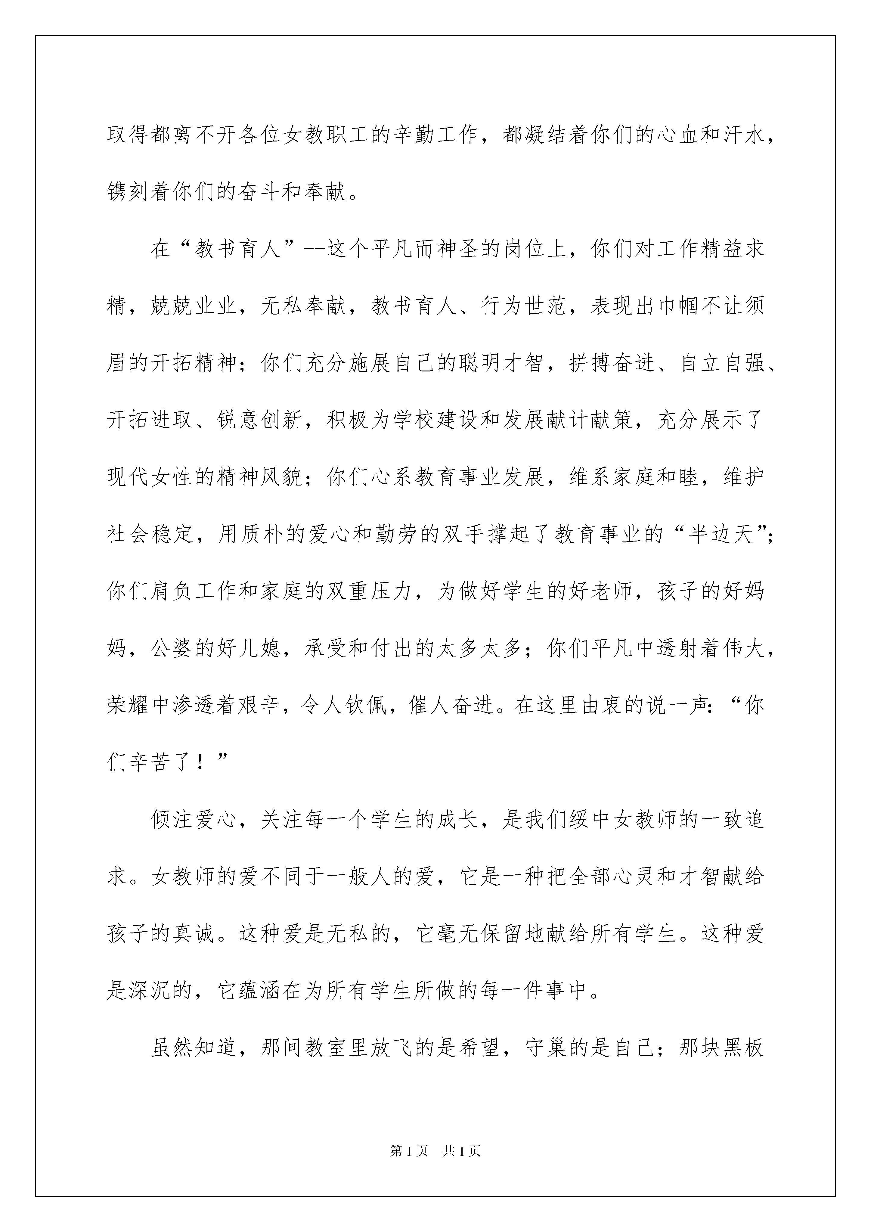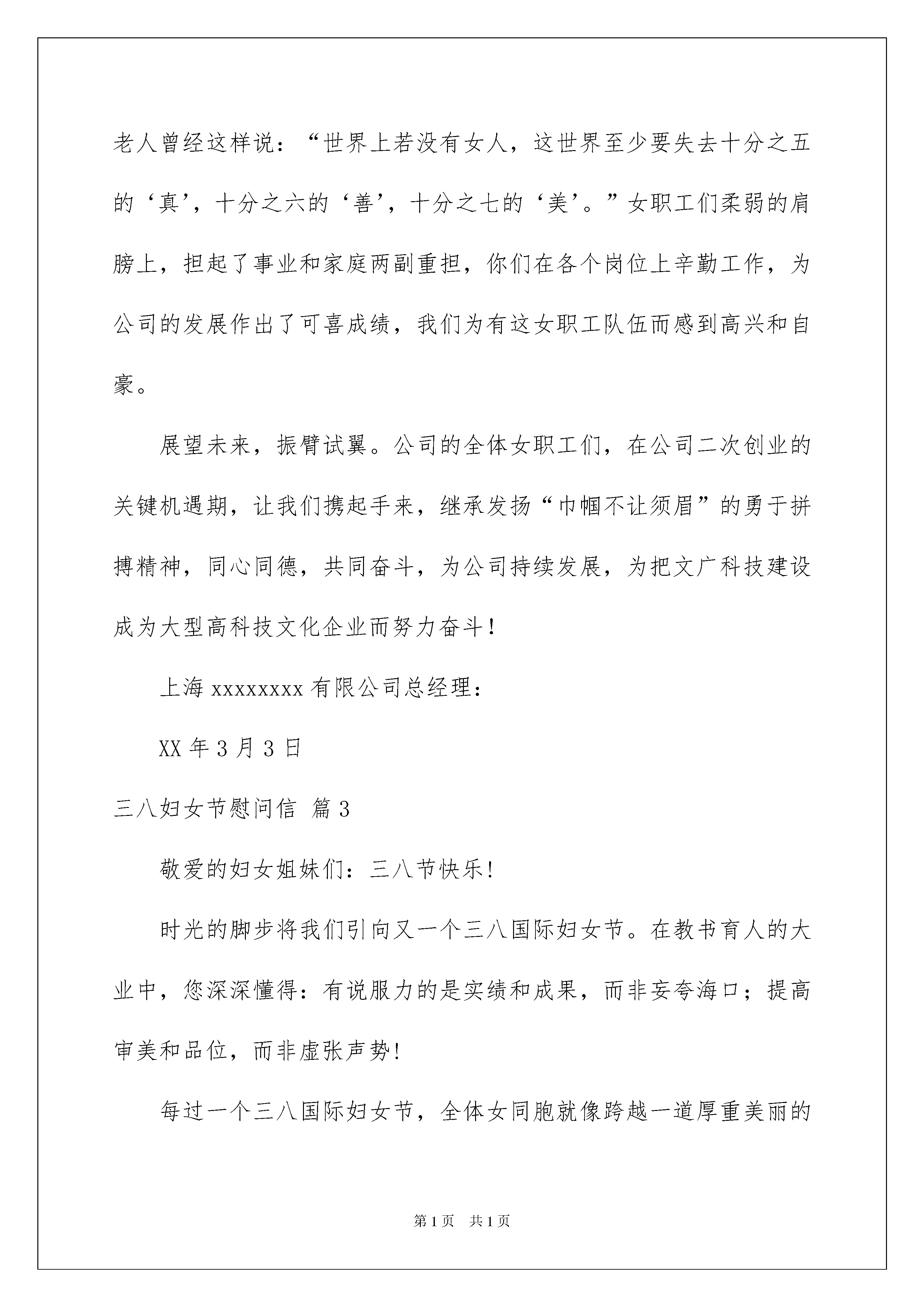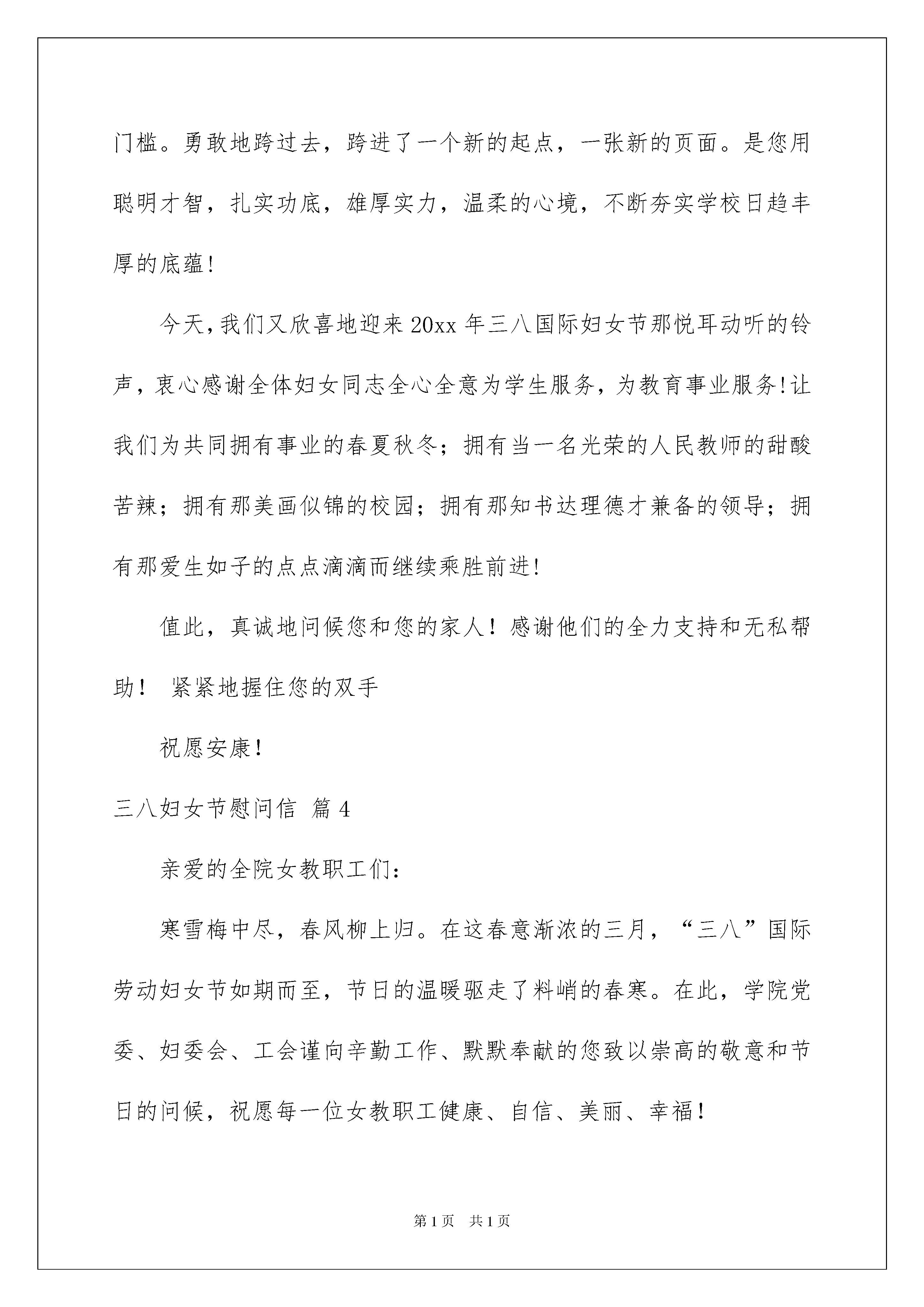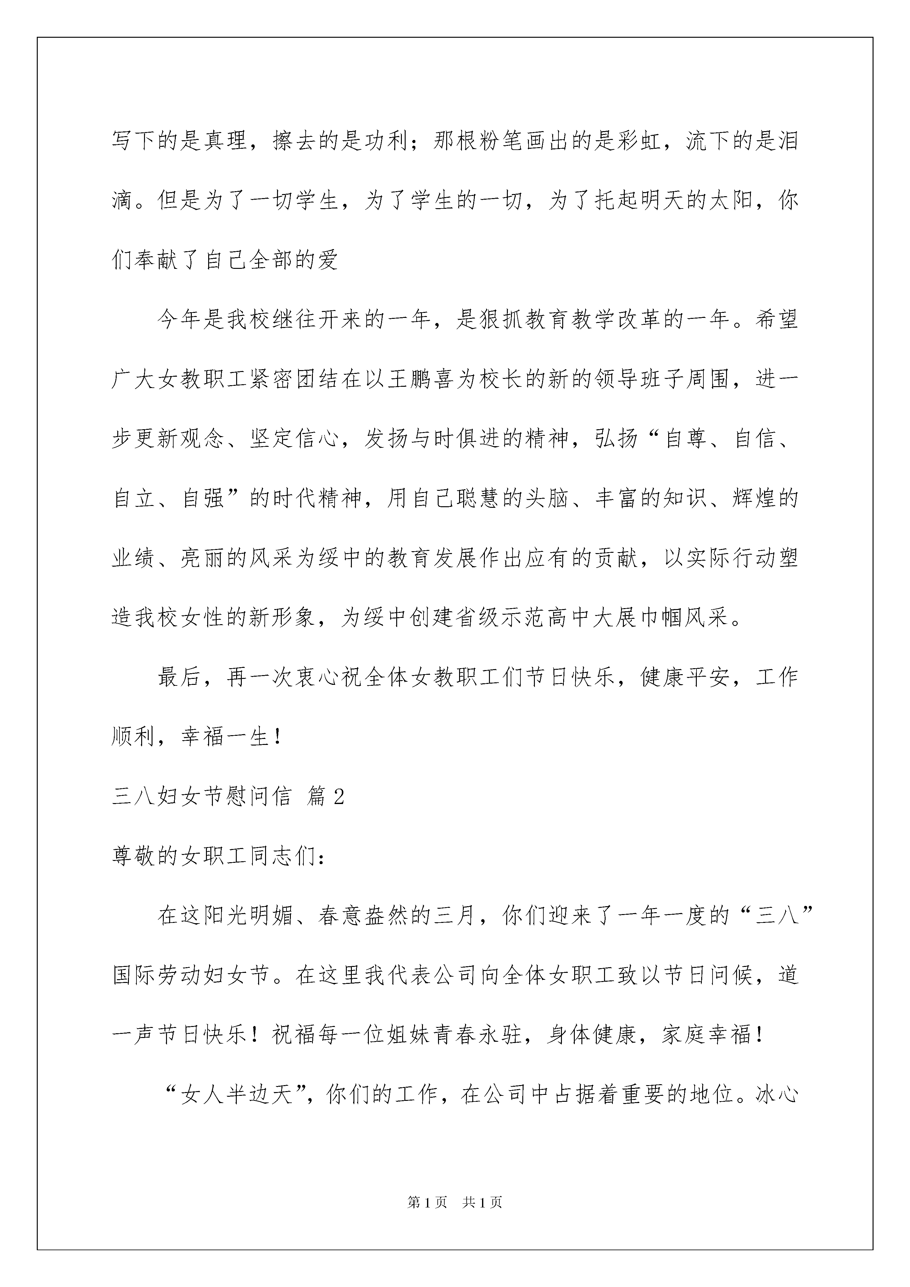 2022精选三八妇女节慰问信汇编九篇精选三八妇女节慰问信汇编九篇在现实社会中,很多慰问活动都会使用到慰问信,慰问信是对被慰问人表示关怀、慰问的信函。相信写慰问信是一个让许多人都头痛的问题,以下是我为大家收集的三八妇女节慰问信9篇,仅供参考,希望能够帮助到大家。三八妇女节慰问信篇1尊敬的全体女教职工:你们好!春节的爆竹还在耳畔回荡,喜庆的情景还在眼前晃动,在这春意愈浓的日子里,“三·八国际劳动妇女节”,如期而至。“三·八国际劳动妇女节”这是你们自己的节日,是对女性的关爱、尊重和理解;它充满了温馨,充满了体贴,充满了爱心;它带给女同胞们的是轻松愉快,自尊自信,自立自强、乐观向上的精神。在此,学校党支部、校委会、工会、妇委会向全校妇女同志表示热烈的祝贺,祝你们健康、美丽、自信、自强。过去的一年,是我校各项工作取得丰硕成果的一年。一切成绩的取得都离不开各位女教职工的辛勤工作,都凝结着你们的心血和汗水,镌刻着你们的奋斗和奉献。在“教书育人”--这个平凡而神圣的岗位上,你们对工作精益求精,兢兢业业,无私奉献,教书育人、行为世范,表现出巾帼不让须眉的开拓精神;你们充分施展自己的聪明才智,拼搏奋进、自立自强、开拓进取、锐意创新,积极为学校建设和发展献计献策,充分展示了现代女性的精神风貌;你们心系教育事业发展,维系家庭和睦,维护社会稳定,用质朴的爱心和勤劳的双手撑起了教育事业的“半边天”;你们肩负工作和家庭的双重压力,为做好学生的好老师,孩子的好妈妈,公婆的好儿媳,承受和付出的太多太多;你们平凡中透射着伟大,荣耀中渗透着艰辛,令人钦佩,催人奋进。在这里由衷的说一声:“你们辛苦了!”倾注爱心,关注每一个学生的成长,是我们绥中女教师的一致追求。女教师的爱不同于一般人的爱,它是一种把全部心灵和才智献给孩子的真诚。这种爱是无私的,它毫无保留地献给所有学生。这种爱是深沉的,它蕴涵在为所有学生所做的每一件事中。虽然知道,那间教室里放飞的是希望,守巢的是自己;那块黑板写下的是真理,擦去的是功利;那根粉笔画出的是彩虹,流下的是泪滴。但是为了一切学生,为了学生的一切,为了托起明天的太阳,你们奉献了自己全部的爱今年是我校继往开来的一年,是狠抓教育教学改革的一年。希望广大女教职工紧密团结在以王鹏喜为校长的新的领导班子周围,进一步更新观念、坚定信心,发扬与时俱进的精神,弘扬“自尊、自信、自立、自强”的时代精神,用自己聪慧的头脑、丰富的知识、辉煌的业绩、亮丽的风采为绥中的教育发展作出应有的贡献,以实际行动塑造我校女性的新形象,为绥中创建省级示范高中大展巾帼风采。最后,再一次衷心祝全体女教职工们节日快乐,健康平安,工作顺利,幸福一生!三八妇女节慰问信篇2尊敬的女职工同志们:在这阳光明媚、春意盎然的三月,你们迎来了一年一度的“三八”国际劳动妇女节。在这里我代表公司向全体女职工致以节日问候,道一声节日快乐!祝福每一位姐妹青春永驻,身体健康,家庭幸福!“女人半边天”,你们的工作,在公司中占据着重要的地位。冰心老人曾经这样说:“世界上若没有女人,这世界至少要失去十分之五的‘真’,十分之六的‘善’,十分之七的‘美’。”女职工们柔弱的肩膀上,担起了事业和家庭两副重担,你们在各个岗位上辛勤工作,为公司的发展作出了可喜成绩,我们为有这女职工队伍而感到高兴和自豪。展望未来,振臂试翼。公司的全体女职工们,在公司二次创业的关键机遇期,让我们携起手来,继承发扬“巾帼不让须眉”的勇于拼搏精神,同心同德,共同奋斗,为公司持续发展,为把文广科技建设成为大型高科技文化企业而努力奋斗!上海xxxxxxxx有限公司总经理:XX年3月3日三八妇女节慰问信篇3敬爱的妇女姐妹们:三八节快乐!时光的脚步将我们引向又一个三八国际妇女节。在教书育人的大业中,您深深懂得:有说服力的是实绩和成果,而非妄夸海口;提高审美和品位,而非虚张声势!每过一个三八国际妇女节,全体女同胞就像跨越一道厚重美丽的门槛。勇敢地跨过去,跨进了一个新的起点,一张新的页面。是您用聪明才智,扎实功底,雄厚实力,温柔的心境,不断夯实学校日趋丰厚的底蕴!今天,我们又欣喜地迎来20xx年三八国际妇女节那悦耳动听的铃声,衷心感谢全体妇女同志全心全意为学生服务,为教育事业服务!让我们为共同拥有事业的春夏秋冬;拥有当一名光荣的人民教师的甜酸苦辣;拥有那美画似锦的校园;拥有那知书达理德才兼备的领导;拥有那爱生如子的点点滴滴而继续乘胜前进!值此,真诚地问候您和您的家人!感谢他们的全力支持和无私帮助!紧紧地握住您的双手祝愿安康!三八妇女节慰问信篇4亲爱的全院女教职工们:寒雪梅中尽,春风柳上归。在这春意渐浓的三月,