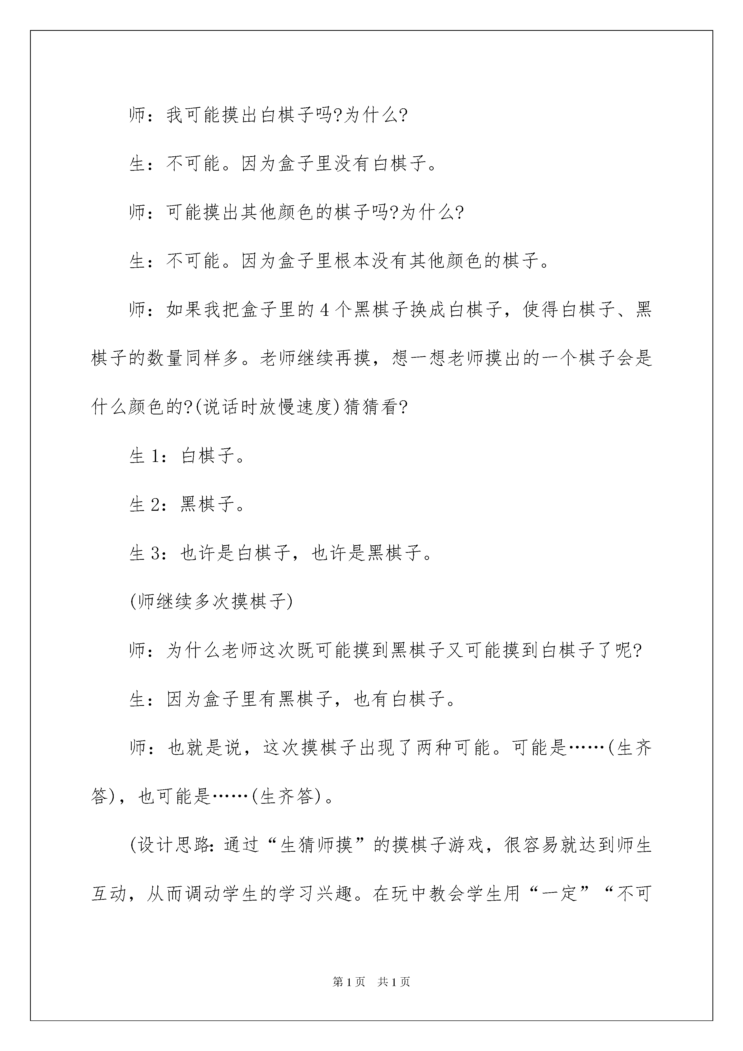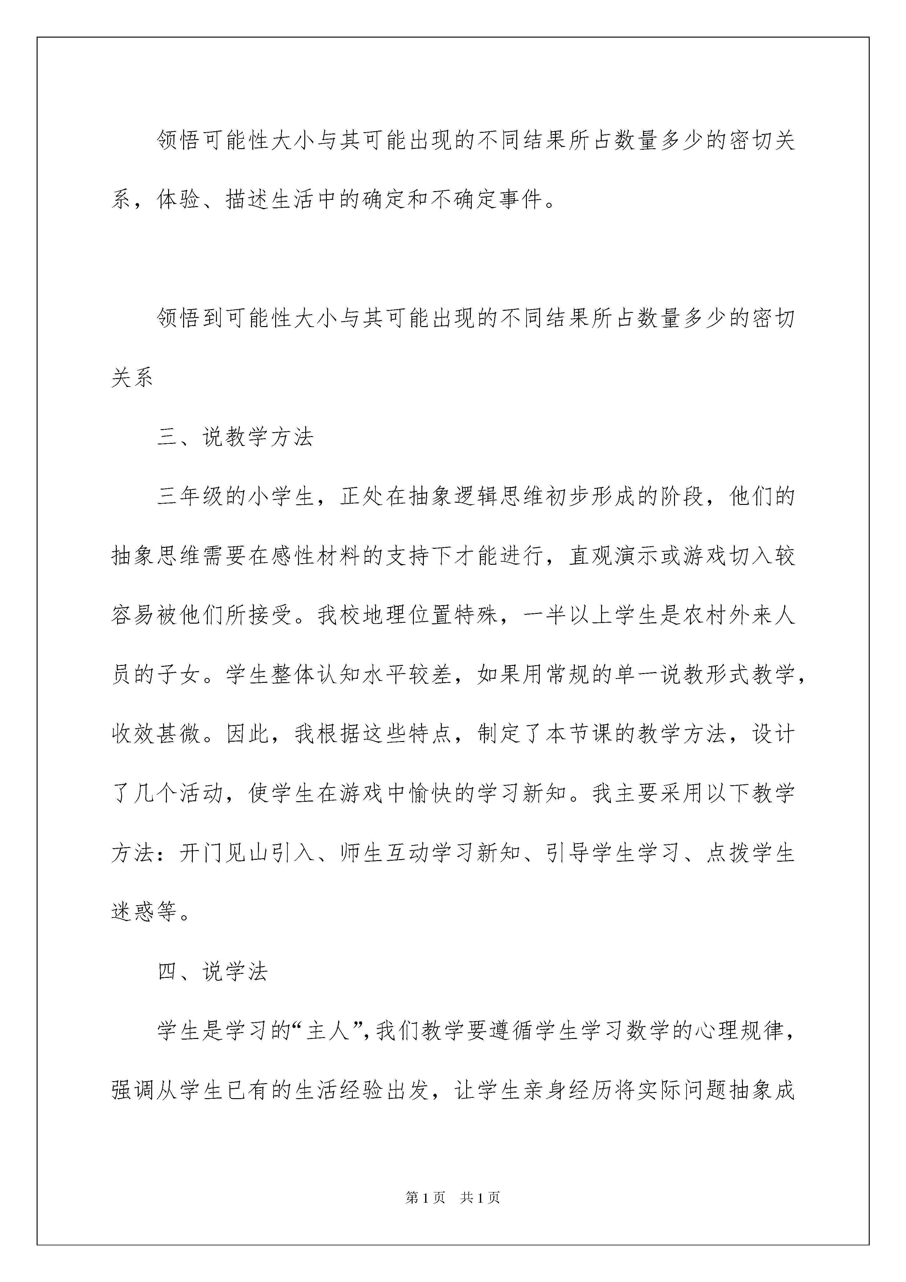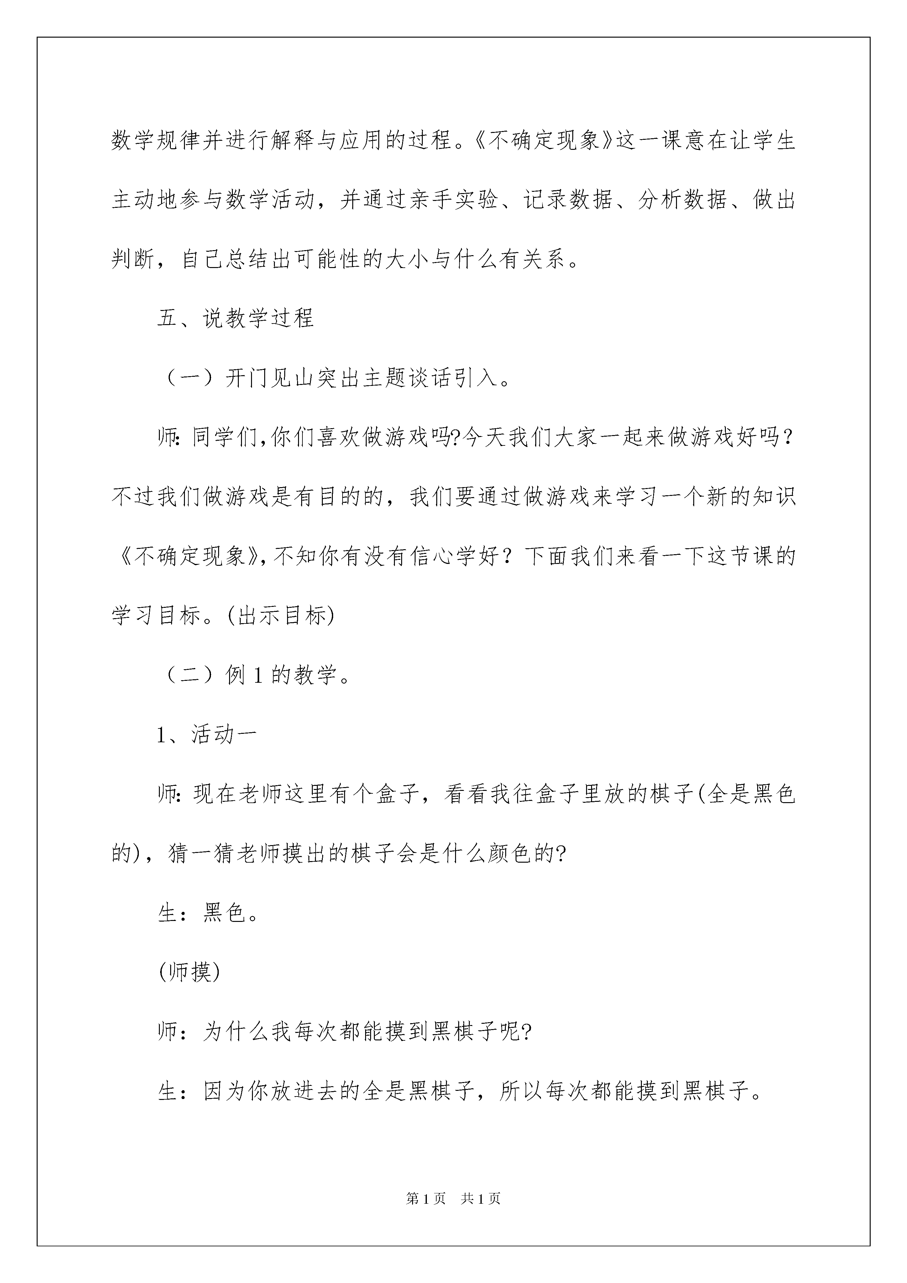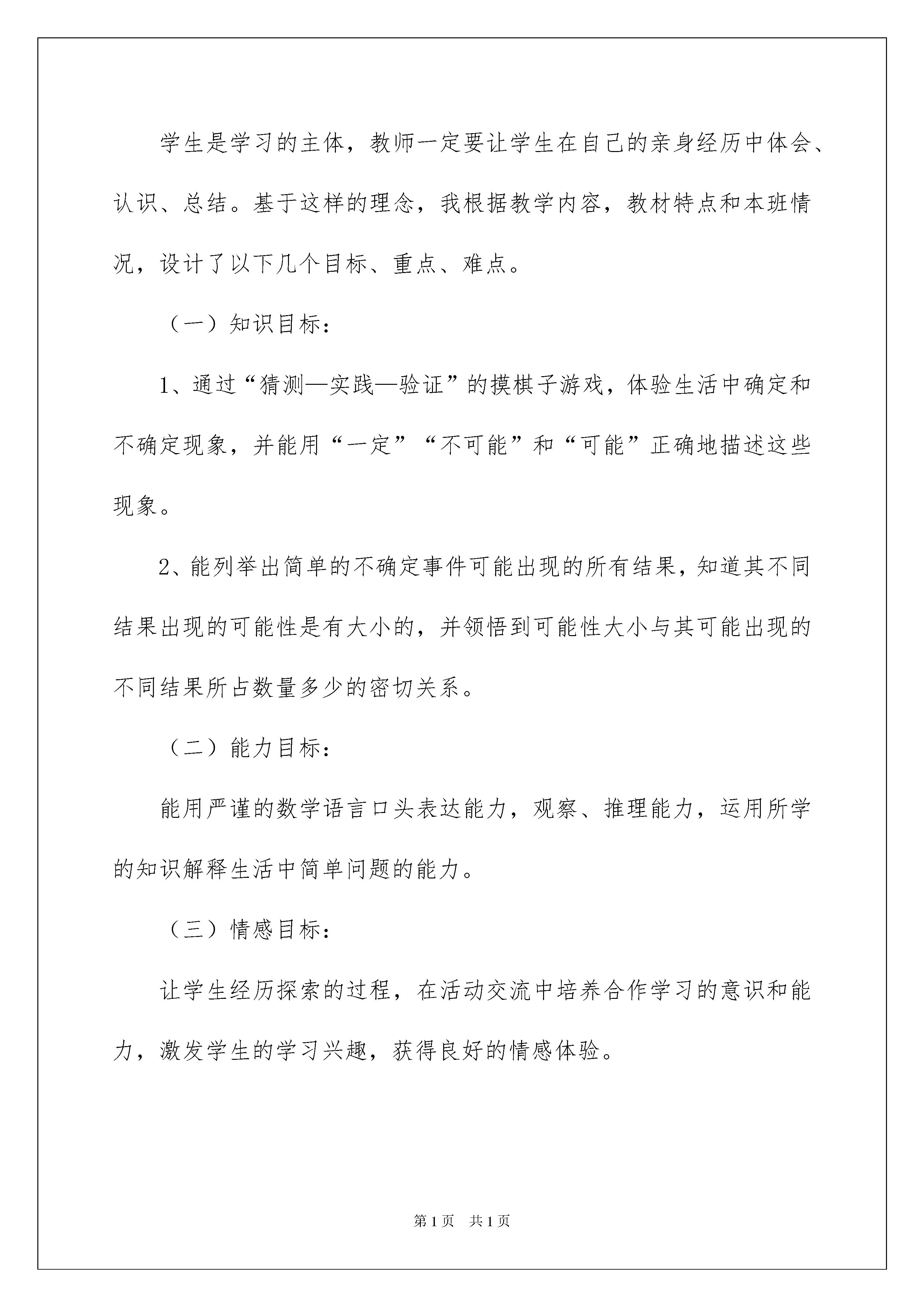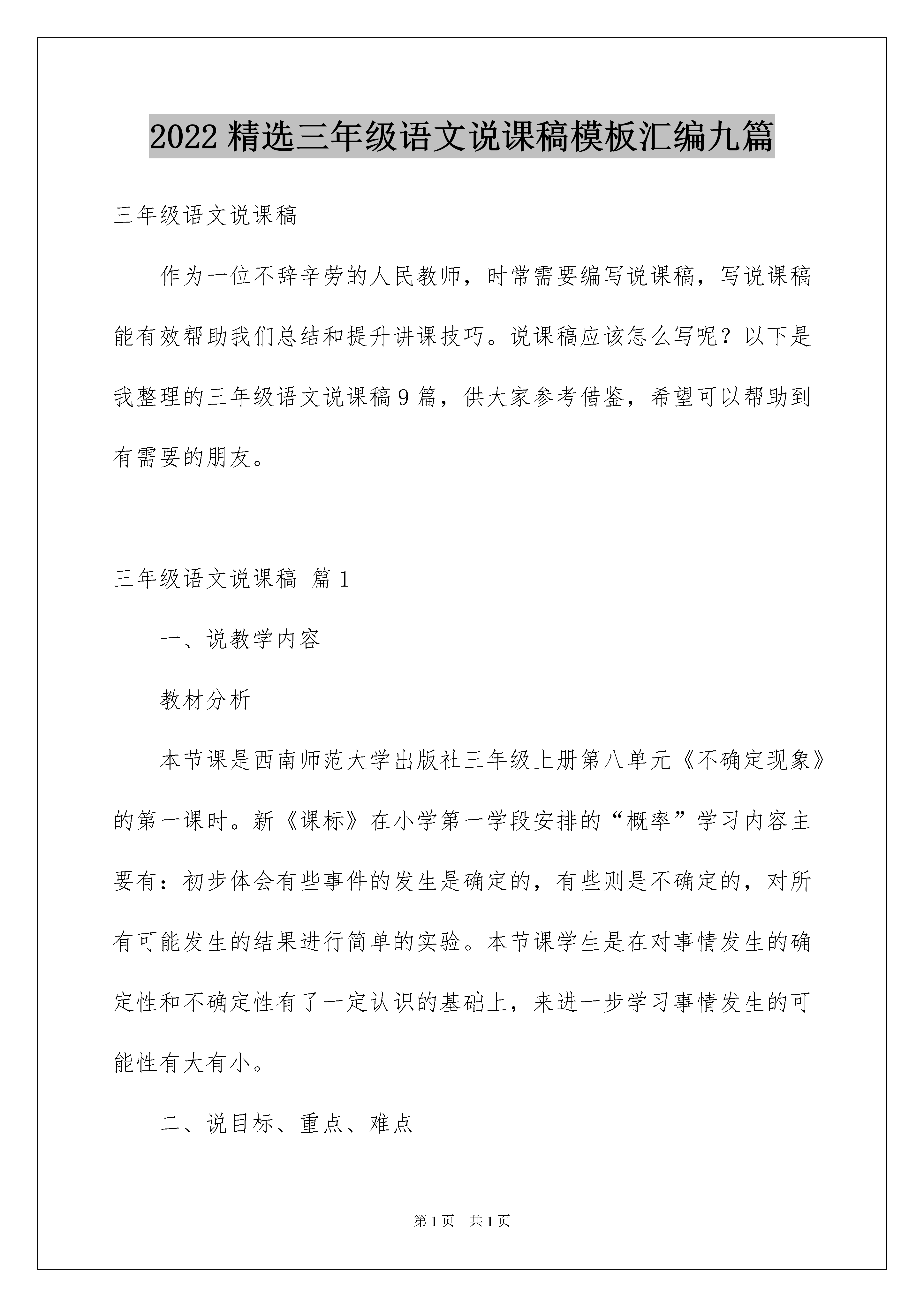 2022精选三年级语文说课稿模板汇编九篇三年级语文说课稿作为一位不辞辛劳的人民教师,时常需要编写说课稿,写说课稿能有效帮助我们总结和提升讲课技巧。说课稿应该怎么写呢?以下是我整理的三年级语文说课稿9篇,供大家参考借鉴,希望可以帮助到有需要的朋友。三年级语文说课稿篇1一、说教学内容教材分析本节课是西南师范大学出版社三年级上册第八单元《不确定现象》的第一课时。新《课标》在小学第一学段安排的“概率”学习内容主要有:初步体会有些事件的发生是确定的,有些则是不确定的,对所有可能发生的结果进行简单的实验。本节课学生是在对事情发生的确定性和不确定性有了一定认识的基础上,来进一步学习事情发生的可能性有大有小。二、说目标、重点、难点学生是学习的主体,教师一定要让学生在自己的亲身经历中体会、认识、总结。基于这样的理念,我根据教学内容,教材特点和本班情况,设计了以下几个目标、重点、难点。(一)知识目标:1、通过“猜测—实践—验证”的摸棋子游戏,体验生活中确定和不确定现象,并能用“一定”“不可能”和“可能”正确地描述这些现象。2、能列举出简单的不确定事件可能出现的所有结果,知道其不同结果出现的可能性是有大小的,并领悟到可能性大小与其可能出现的不同结果所占数量多少的密切关系。(二)能力目标:能用严谨的数学语言口头表达能力,观察、推理能力,运用所学的知识解释生活中简单问题的能力。(三)情感目标:让学生经历探索的过程,在活动交流中培养合作学习的意识和能力,激发学生的学习兴趣,获得良好的情感体验。领悟可能性大小与其可能出现的不同结果所占数量多少的密切关系,体验、描述生活中的确定和不确定事件。领悟到可能性大小与其可能出现的不同结果所占数量多少的密切关系三、说教学方法三年级的小学生,正处在抽象逻辑思维初步形成的阶段,他们的抽象思维需要在感性材料的支持下才能进行,直观演示或游戏切入较容易被他们所接受。我校地理位置特殊,一半以上学生是农村外来人员的子女。学生整体认知水平较差,如果用常规的单一说教形式教学,收效甚微。因此,我根据这些特点,制定了本节课的教学方法,设计了几个活动,使学生在游戏中愉快的学习新知。我主要采用以下教学方法:开门见山引入、师生互动学习新知、引导学生学习、点拨学生迷惑等。四、说学法学生是学习的“主人”,我们教学要遵循学生学习数学的心理规律,强调从学生已有的生活经验出发,让学生亲身经历将实际问题抽象成数学规律并进行解释与应用的过程。《不确定现象》这一课意在让学生主动地参与数学活动,并通过亲手实验、记录数据、分析数据、做出判断,自己总结出可能性的大小与什么有关系。五、说教学过程(一)开门见山突出主题谈话引入。师:同学们,你们喜欢做游戏吗?今天我们大家一起来做游戏好吗?不过我们做游戏是有目的的,我们要通过做游戏来学习一个新的知识《不确定现象》,不知你有没有信心学好?下面我们来看一下这节课的学习目标。(出示目标)(二)例1的教学。1、活动一师:现在老师这里有个盒子,看看我往盒子里放的棋子(全是黑色的),猜一猜老师摸出的棋子会是什么颜色的?生:黑色。(师摸)师:为什么我每次都能摸到黑棋子呢?生:因为你放进去的全是黑棋子,所以每次都能摸到黑棋子。师:我可能摸出白棋子吗?为什么?生:不可能。因为盒子里没有白棋子。师:可能摸出其他颜色的棋子吗?为什么?生:不可能。因为盒子里根本没有其他颜色的棋子。师:如果我把盒子里的4个黑棋子换成白棋子,使得白棋子、黑棋子的数量同样多。老师继续再摸,想一想老师摸出的一个棋子会是什么颜色的?(说话时放慢速度)猜猜看?生1:白棋子。生2:黑棋子。生3:也许是白棋子,也许是黑棋子。(师继续多次摸棋子)师:为什么老师这次既可能摸到黑棋子又可能摸到白棋子了呢?生:因为盒子里有黑棋子,也有白棋子。师:也就是说,这次摸棋子出现了两种可能。可能是……(生齐答),也可能是……(生齐答)。(设计思路:通过“生猜师摸”的摸棋子游戏,很容易就达到师生互动,从而调动学生的学习兴趣。在玩中教会学生用“一定”“不可能”“可能”来表述事件发生的确定性和不确定性。这一活动唤起了学生对旧知的记忆,为学习新知埋好伏笔。)2、活动二师:下面老师再改变盒子里黑、白棋子的数量,变为7个黑棋子、1个白棋子,我们看看,是摸中黑棋子的次数多,还是摸中白棋子的次数多?(生举手回答,进行猜测)师:想不想自己摸棋子来验证猜测?生:(几乎异口同声)想。师:那我们以“小组合作”的学习形式来完成学习任务。(出示“小组合作”的操作步骤)(各学习小组摸棋子、统计、讨论。教师巡视学生实验结果。)师:请组长汇报小组交流情况?师启发学生总结规律: