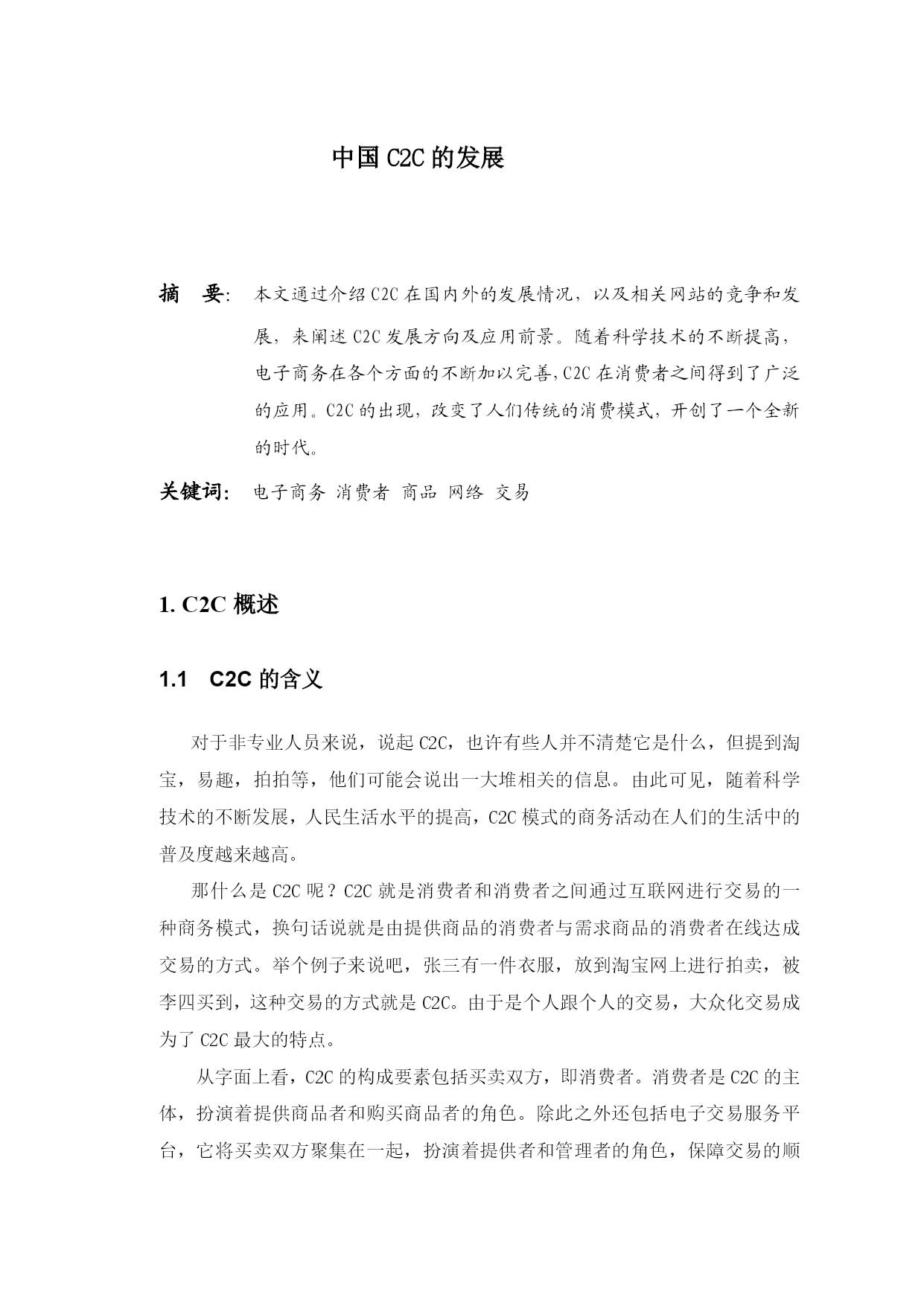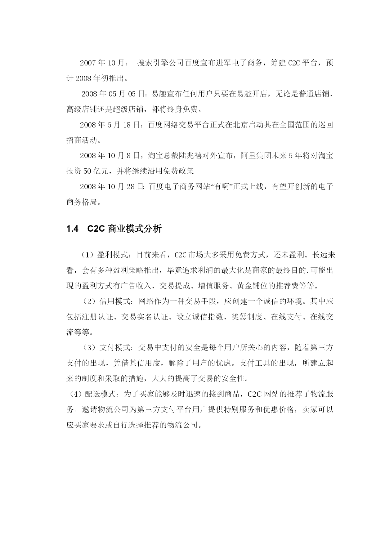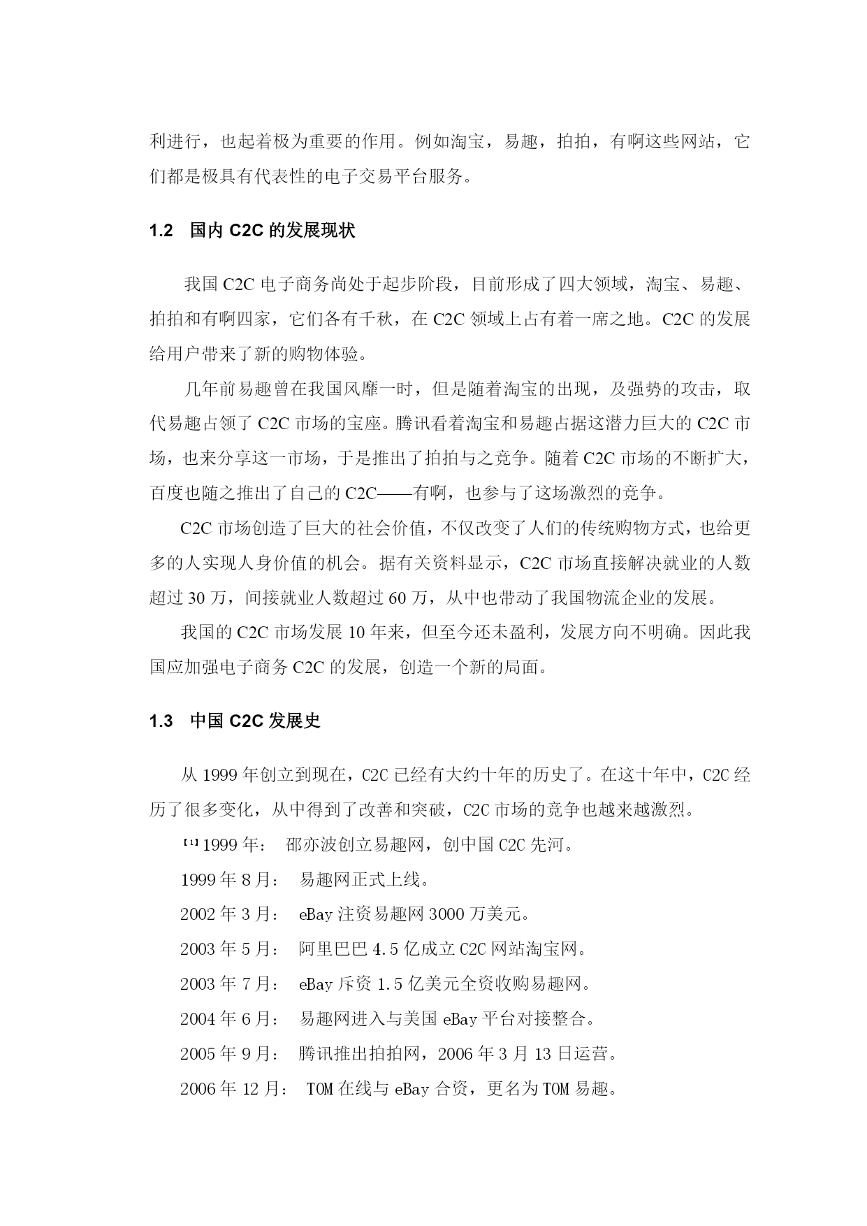 目录 TOC\o"1-3"\h\z\uHYPERLINK\l"_Toc217567634"1.C2C概述 PAGEREF_Toc217567634\h1 HYPERLINK\l"_Toc217567635"1.1C2C的含义 PAGEREF_Toc217567635\h1 HYPERLINK\l"_Toc217567636"1.2国内C2C的发展现状 PAGEREF_Toc217567636\h2 HYPERLINK\l"_Toc217567637"1.3中国C2C发展史 PAGEREF_Toc217567637\h2 HYPERLINK\l"_Toc217567638"1.4C2C商业模式分析 PAGEREF_Toc217567638\h3 HYPERLINK\l"_Toc217567639"2.网上开店、购物和安全交易 PAGEREF_Toc217567639\h3 HYPERLINK\l"_Toc217567640"2.1网上开店、购物及流程 PAGEREF_Toc217567640\h3 HYPERLINK\l"_Toc217567641"2.2保障交易安全性 PAGEREF_Toc217567641\h4 HYPERLINK\l"_Toc217567642"3.国内C2C网站 PAGEREF_Toc217567642\h5 HYPERLINK\l"_Toc217567643"3.1易趣——开创国内C2C先河 PAGEREF_Toc217567643\h5 HYPERLINK\l"_Toc217567644"3.2淘宝——领先的国内C2C网站 PAGEREF_Toc217567644\h6 HYPERLINK\l"_Toc217567645"3.3拍拍——成长最快的国内C2C PAGEREF_Toc217567645\h7 HYPERLINK\l"_Toc217567646"3.4有啊——国内C2C的后起之秀 PAGEREF_Toc217567646\h8 HYPERLINK\l"_Toc217567647"4.“四国争霸” PAGEREF_Toc217567647\h9 HYPERLINK\l"_Toc217567648"5.C2C市场发展的优势和劣势 PAGEREF_Toc217567648\h11 HYPERLINK\l"_Toc217567649"5.1C2C的优势 PAGEREF_Toc217567649\h11 HYPERLINK\l"_Toc217567650"5.2C2C的劣势 PAGEREF_Toc217567650\h11 HYPERLINK\l"_Toc217567651"6.C2C的发展前景 PAGEREF_Toc217567651\h12 HYPERLINK\l"_Toc217567652"总结 PAGEREF_Toc217567652\h12 中国C2C的发展 摘要:本文通过介绍C2C在国内外的发展情况,以及相关网站的竞争和发展,来阐述C2C发展方向及应用前景。随着科学技术的不断提高,电子商务在各个方面的不断加以完善,C2C在消费者之间得到了广泛的应用。C2C的出现,改变了人们传统的消费模式,开创了一个全新的时代。 关键词:电子商务消费者商品网络交易 1.C2C概述 1.1C2C的含义 对于非专业人员来说,说起C2C,也许有些人并不清楚它是什么,但提到淘宝,易趣,拍拍等,他们可能会说出一大堆相关的信息。由此可见,随着科学技术的不断发展,人民生活水平的提高,C2C模式的商务活动在人们的生活中的普及度越来越高。 那什么是C2C呢?C2C就是消费者和消费者之间通过互联网进行交易的一种商务模式,换句话说就是由提供商品的消费者与需求商品的消费者在线达成交易的方式。举个例子来说吧,张三有一件衣服,放到淘宝网上进行拍卖,被李四买到,这种交易的方式就是C2C。由于是个人跟个人的交易,大众化交易成为了C2C最大的特点。 从字面上看,C2C的构成要素包括买卖双方,即消费者。消费者是C2C的主体,扮演着提供商品者和购买商品者的角色。除此之外还包括电子交易服务平台,它将买卖双方聚集在一起,扮演着提供者和管理者的角色,保障交易的顺利进行,也起着极为重要的作用。例如淘宝,易趣,拍拍,有啊这些网站,它们都是极具有代表性的电子交易平台服务。 1.2国内C2C的发展现状 我国C2C电子商务尚处于起步阶段,目前形成了四大领域,淘宝、易趣、拍拍和有啊四家,它们各有千秋,在C2C领域上占有着