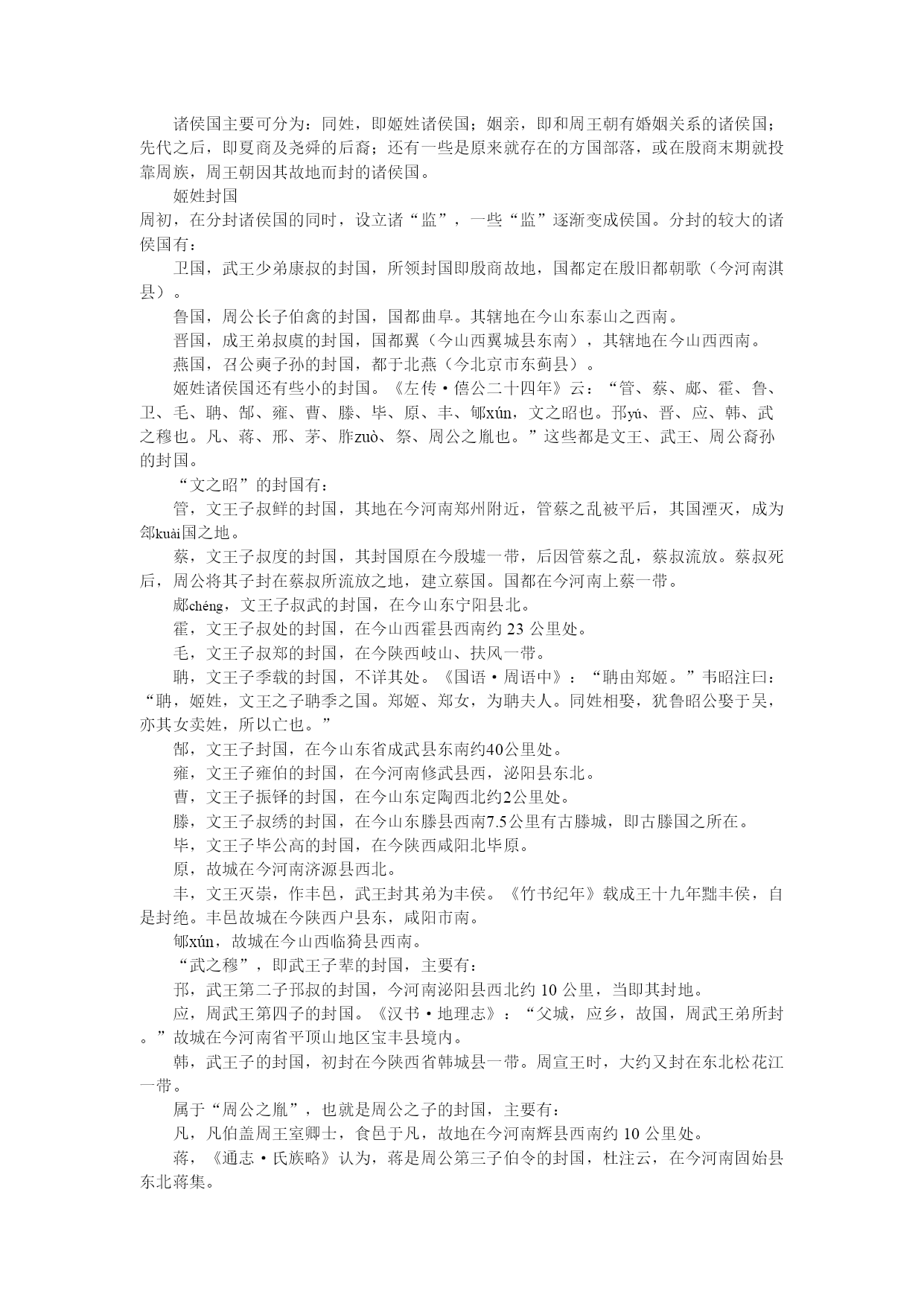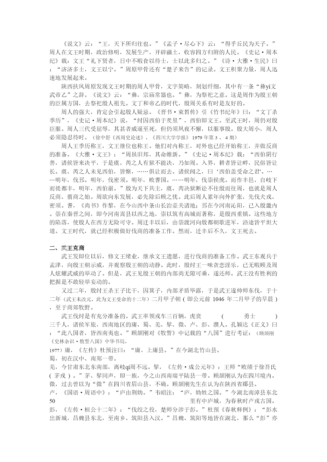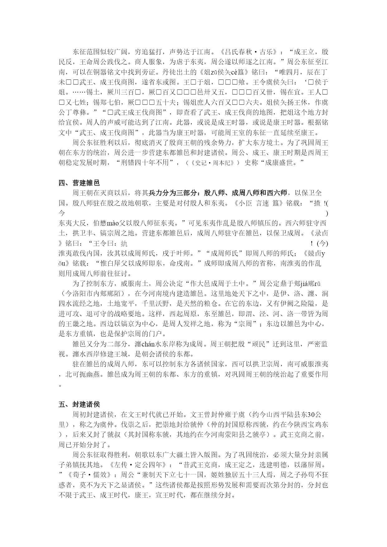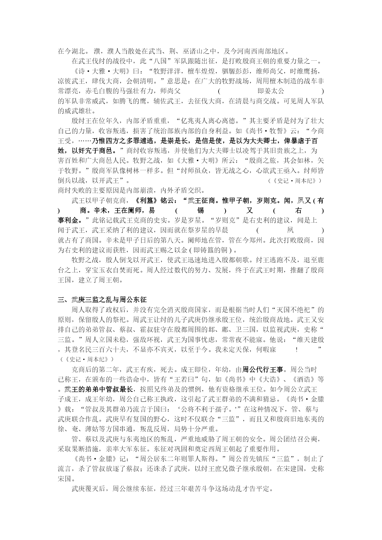 第三章西周王朝的建立与发展 教学目的:介绍西周的政治、经济、军事、民族、思想文化等方面的情况,掌握西周官僚机构与政治制度内容,正确估计西周的生产力水平,掌握华夏族形成发展的历史进程,得出对西周社会性质与我国奴隶社会特征的正确看法。 教学重点:掌握西周的官僚机构与政治制度,了解井田制、“工商食官”的含义与性质,了解西与周边各国的关系及华夏族形成的进程。 第一节西周国家的建立与强化 一、周部族的兴起与周王朝的建立 周部族是我国西部黄土高原上兴起的一个古老部族。因其所居地为周原,故号为“周。”《史记·周本纪》云:“姜原出野,见巨人迹,心忻然悦,欲践之,践之而身动如孕者。”从而产子名弃,姜原是周部族的女姓祖先。 弃长大成人后,“遂好耕农,相地之宜,宜谷者稼穑焉,民皆法则之。帝舜闻之,举弃为师,天下得其利,有功。……封弃于邰,号曰后稷,别姓姬氏。后稷之兴,在陶唐、虞、夏之际,皆有令德。”(《史记·周本纪》)邰,《正义》引《括地志》云:“一名武功城,在雍州武功县西南二十二里,古邰国,后稷所封也。有后稷及姜嫄祠。毛苌云:“邰,姜嫄国也,后稷所生。尧见天因邰而生后稷,故因封於邰也。'”后稷是周部族的男性祖先,以后稷为首的周部族是一个农业部族。周部族兴起在尧、舜之际。 后稷之后,其子不窋出曾抛弃过农业,奔于戎狄之间,大约过着渔猎生活。 其后不窋之孙公刘,“虽在戎狄之间,复修后稷之业,务耕种,行地宜,自漆、沮渡渭,取材用,行者有资,居者有畜积,民赖其庆。百姓怀之,多徙而保归焉。周道之兴自此始。”(《史记·周本纪》)公刘所居之邠,属黄土高原地带,宜于农耕。 《诗·大雅·绵》曰:“民之初生,自土沮漆。古公亶父,陶复陶穴,未有家室。”陶与窑同,古谓之陶,今谓之窑;穴是窑洞,复是半穴居。周人这时就居在邠地沮、漆二水间。古公亶父自邠地迁于岐山之下,看到这里土地肥沃,于是卜居于此。即所谓:“爰始爰谋,爰契我龟,曰止曰时(是),筑室于兹。”周人迁居周地以后,与姜姓婚嫁杂居。周人自此便逐渐成为一个比较发达的农业部族。周人自不窋居邠,至公叔祖类,传说有十一世,除公刘外,全无史迹可寻。古公亶父又称大王,说明周人已渐具国家的规模。王季历时国力有一定发展,但是比之商王朝,仍属小邦。古公亶父自邠迁于岐山,奠定了周王业的基础,王季历时,周对殷臣服。《竹书纪年》记武乙三十四年“周公季历来朝。王赐地三十县,玉十玦,马十匹。”三十五年,“周公季历伐西落鬼戎,俘二十翟(狄)王。”这时季历已见于史册,《竹书纪年》又称大丁(文丁)四年“周公季历伐余无之戎,克之,命为牧师。”牧师即后来的方伯,为一方诸侯之长。王季历伐西落鬼戎应是接受殷王之命。《易·未济》:“震用伐鬼方,三年有赏于大国”;鬼方是一个强大的部落联盟,所以季历初伐鬼方时还有震恐之心,经过三年的艰苦斗争,最后取得胜利,因而受到大国殷王的赏赐,命为牧师。季历为了与殷王朝搞好关系,又娶殷女为妻。《诗·大雅·大明》曰:“挚仲氏任,自彼殷商,来嫁于周。”挚仲氏是殷之臣属方国,任姓。殷周在政治上结合起来。《孟子·公孙丑上》曰:“文王以百里。”文王时期,周还是一个方圆百里的小国,所以周初人还自称“小邦周。”(《尚书·大诰》)春秋时人还说“商周之不敌。”(《左传·桓公十一年》)周初的文化,包括文字在内,皆效法殷人,周原出土的甲骨文字也与殷墟基本无异。当初,周只是臣服于殷商王朝的小国。 《说文》云:“王,天下所归往也。”《孟子·尽心下》云:“得乎丘民为天子。”周人在文王时期,政治修明,发展生产,开辟疆土,收容四方归附的人民。《史记·周本纪》载:文王“礼下贤者,日中不暇食以待士,士以此多归之。”《诗·大雅·生民》曰:“济济多士,文王以宁。”周原甲骨还有“楚子来告”的记录。文王积聚力量,周人迅速地发展起来。 陕西扶风周原发现文王时期的周人甲骨,文字简略,刻划纤细,其中有一条“彝yí文武帝乙”之辞。《说文》云:“彝,宗庙常器也。”彝,为祭祀之意。这是周作为殷王朝的臣属方国,去祭祀殷人祖先。文丁和帝乙的时代,殷周关系有时是友好的。 周人的强大,肯定会引起殷人疑忌。《晋书·束皙传》引《竹书纪年》曰:“文丁杀季历”,《史记·周本纪》说,“纣囚西伯于羑里”,西伯即文王。至武王时,周仍对殷臣服。周人三代受屈辱,其甚者威逼至死,但仍须夙夜不懈,以服事殷。殷大周小,周人必须隐忍待时。(徐中舒《西周史论述》,《四川大学学报》1979年第3、4期) 周人王季历称王,文王继位也称王。他们对内称王,对外也已经开始称王,并做反商的准备。《大雅·文王》:“周虽旧邦,其命维新。”《史记·周本纪》载:“西伯阴行善,诸侯皆来决平,于是虞、芮之人有狱不能决,乃如周。入界,耕者皆让畔,民俗皆让长。虞、芮之人未见西伯,皆惭,……俱让而去。诸侯闻之,曰‘西伯盖受命之君'。……明年,伐邘。