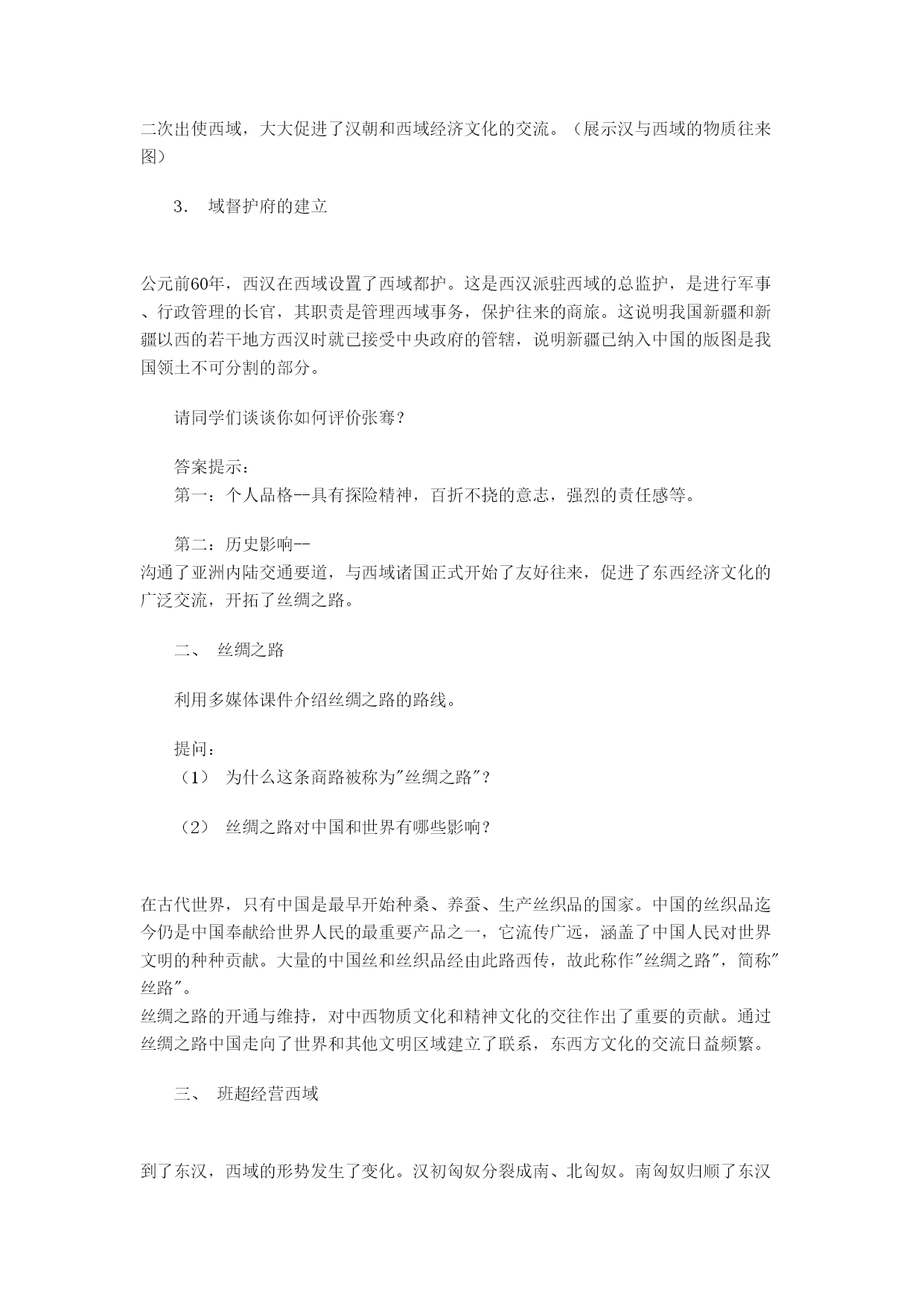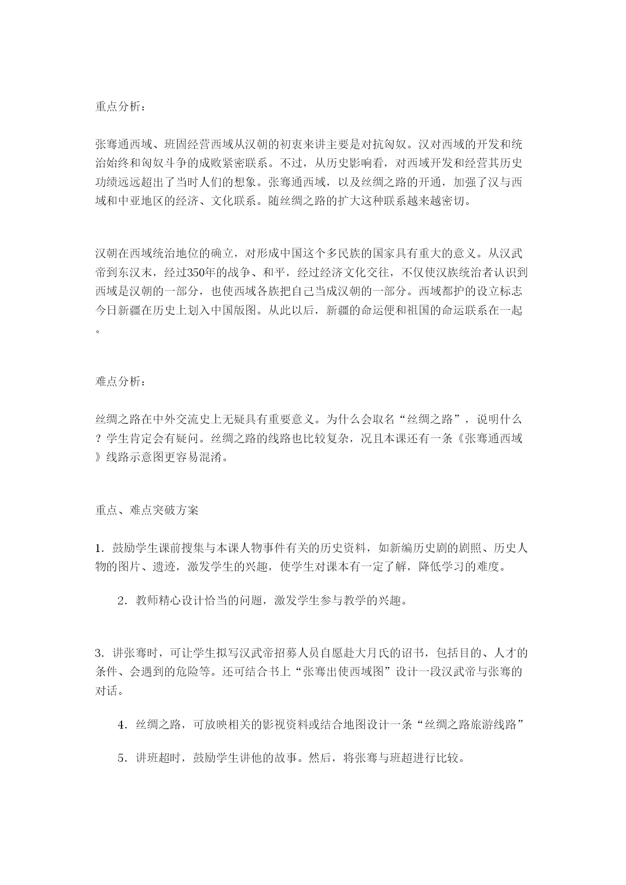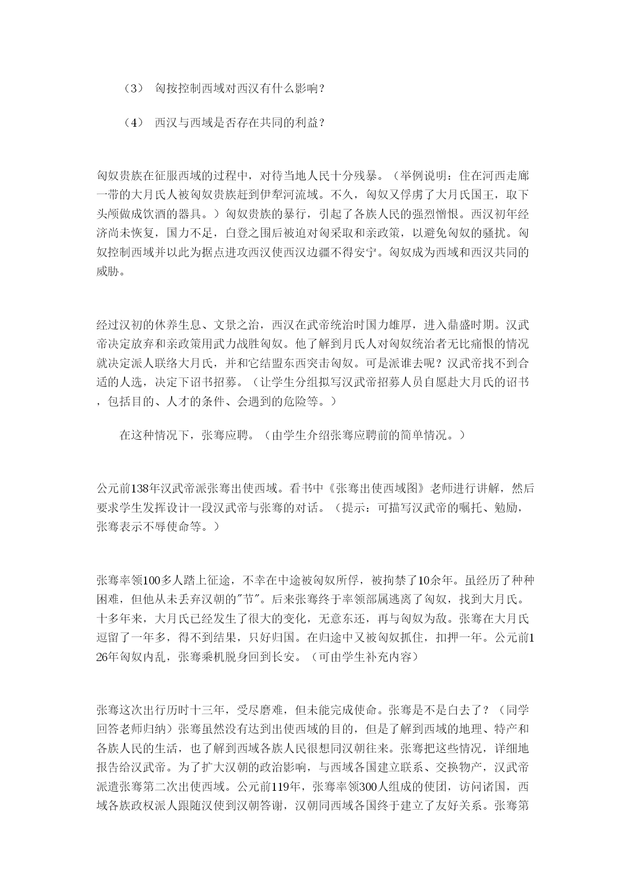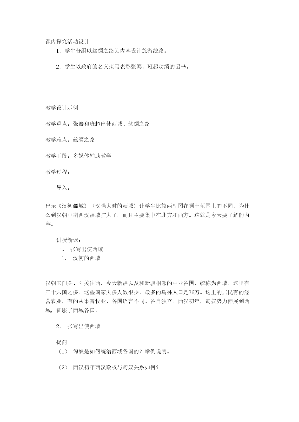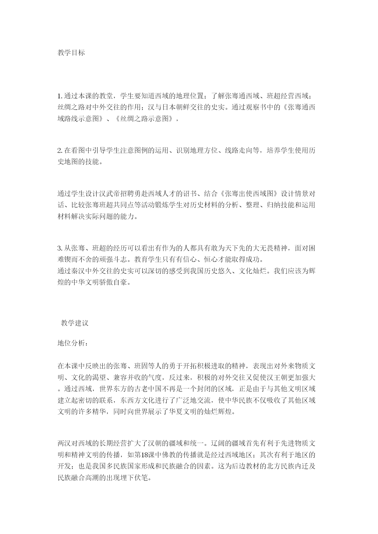 教学目标 1.通过本课的教堂,学生要知道西域的地理位置;了解张骞通西域、班超经营西域;丝绸之路对中外交往的作用;汉与日本朝鲜交往的史实。通过观察书中的《张骞通西域路线示意图》、《丝绸之路示意图》, 2.在看图中引导学生注意图例的运用、识别地理方位、线路走向等,培养学生使用历史地图的技能。 通过学生设计汉武帝招聘勇赴西域人才的诏书、结合《张骞出使西域图》设计情景对话、比较张骞班超共同点等活动锻炼学生对历史材料的分析、整理、归纳技能和运用材料解决实际问题的能力。 3.从张骞、班超的经历可以看出有作为的人都具有敢为天下先的大无畏精神,面对困难锲而不舍的顽强斗志。教育学生只有有信心、恒心才能取得成功。通过秦汉中外交往的史实可以深切的感受到我国历史悠久、文化灿烂。我们应该为辉煌的中华文明骄傲自豪。 教学建议 地位分析:在本课中反映出的张骞、班固等人的勇于开拓积极进取的精神,表现出对外来物质文明、文化的渴望、兼容并收的气度,反过来,积极的对外交往又促使汉王朝更加强大。通过西域,世界东方的古老中国不再是一个封闭的区域,正是由于与其他文明区域建立起密切的联系,东西方文化进行了广泛地交流,使中华民族不仅吸收了其他区域文明的许多精华,同时向世界展示了华夏文明的灿烂辉煌。 两汉对西域的长期经营扩大了汉朝的疆域和统一。辽阔的疆域首先有利于先进物质文明和精神文明的传播,如第18课中佛教的传播就是经过西域地区;其次有利于地区的开发;也是我国多民族国家形成和民族融合的因素。这为后边教材的北方民族内迁及民族融合高潮的出现埋下伏笔。 重点分析:张骞通西域、班固经营西域从汉朝的初衷来讲主要是对抗匈奴。汉对西域的开发和统治始终和匈奴斗争的成败紧密联系。不过,从历史影响看,对西域开发和经营其历史功绩远远超出了当时人们的想象。张骞通西域,以及丝绸之路的开通,加强了汉与西域和中亚地区的经济、文化联系。随丝绸之路的扩大这种联系越来越密切。 汉朝在西域统治地位的确立,对形成中国这个多民族的国家具有重大的意义。从汉武帝到东汉末,经过350年的战争、和平,经过经济文化交往,不仅使汉族统治者认识到西域是汉朝的一部分,也使西域各族把自己当成汉朝的一部分。西域都护的设立标志今日新疆在历史上划入中国版图。从此以后,新疆的命运便和祖国的命运联系在一起。 难点分析:丝绸之路在中外交流史上无疑具有重要意义。为什么会取名“丝绸之路”,说明什么?学生肯定会有疑问。丝绸之路的线路也比较复杂,况且本课还有一条《张骞通西域》线路示意图更容易混淆。 重点、难点突破方案1.鼓励学生课前搜集与本课人物事件有关的历史资料,如新编历史剧的剧照、历史人物的图片、遗迹,激发学生的兴趣,使学生对课本有一定了解,降低学习的难度。 2.教师精心设计恰当的问题,激发学生参与教学的兴趣。 3.讲张骞时,可让学生拟写汉武帝招募人员自愿赴大月氏的诏书,包括目的、人才的条件、会遇到的危险等。还可结合书上“张骞出使西域图”设计一段汉武帝与张骞的对话。 4.丝绸之路,可放映相关的影视资料或结合地图设计一条“丝绸之路旅游线路” 5.讲班超时,鼓励学生讲他的故事。然后,将张骞与班超进行比较。 课内探究活动设计1.学生分组以丝绸之路为内容设计旅游线路。 2.学生以政府的名义拟写表彰张骞、班超功绩的诏书。 教学设计示例 教学重点:张骞和班超出使西域、丝绸之路 教学难点:丝绸之路 教学手段:多媒体辅助教学 教学过程: 导入:出示《汉初疆域》〈汉强大时的疆域〉让学生比较两副图在领土范围上的不同。为什么到汉朝中期西汉疆域扩大了,而且主要集中在北方和西方。这就是今天要了解的内容。 讲授新课:一、张骞出使西域1.汉初的西域 汉朝玉门关、阳关往西,今天新疆以及和新疆相邻的中亚各国,统称为西域。这里有三十六国之多。这些国家大多人数很少,最多的乌孙人口是36万。这里的居民有的经营农业,有的从事畜牧业、各国语言不同、各自独立。西汉初年,匈奴势力伸展到西域,征服了西域各国。 2.张骞出使西域 提问(1)匈奴是如何统治西域各国的?举例说明。 (2)西汉初年西汉政权与匈奴关系如何? (3)匈按控制西域对西汉有什么影响? (4)西汉与西域是否存在共同的利益? 匈奴贵族在征服西域的过程中,对待当地人民十分残暴。(举例说明:住在河西走廊一带的大月氏人被匈奴贵族赶到伊犁河流域。不久,匈奴又俘虏了大月氏国王,取下头颅做成饮酒的器具。)匈奴贵族的暴行,引起了各族人民的强烈憎恨。西汉初年经济尚未恢复,国力不足,白登之围后被迫对匈采取和亲政策,以避免匈奴的骚扰。匈奴控制西域并以此为据点进攻西汉使西汉边疆不得安宁。匈奴成为西域和西汉共同的威胁。 经过汉初的休养生息、文景之治,西汉在武帝统治时国力雄厚,进入鼎盛时期。汉武帝决定放弃和亲政策用武力战胜匈奴。他了解到月氏人对匈奴统治者无