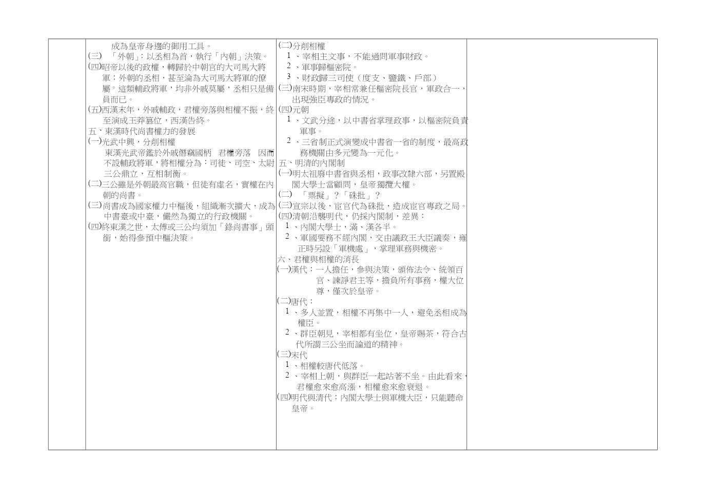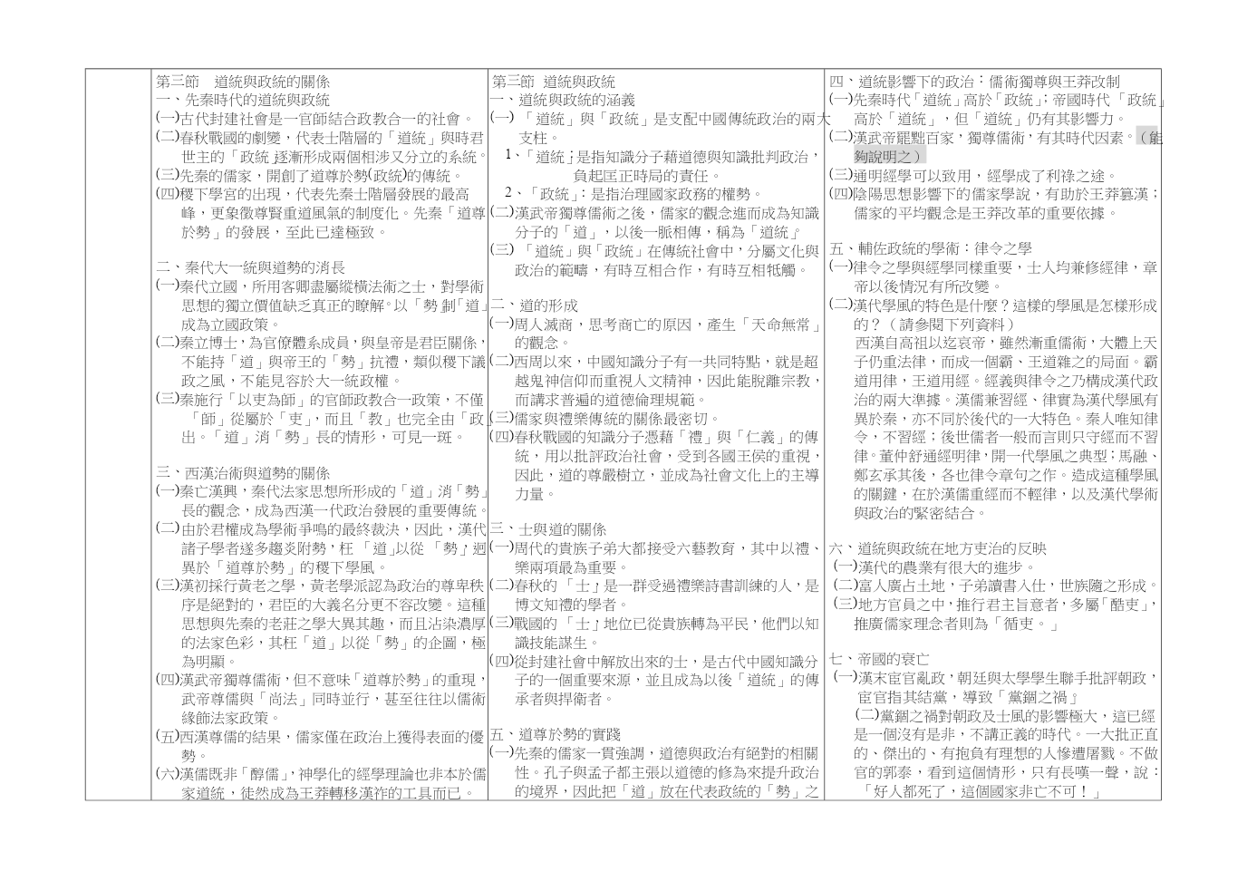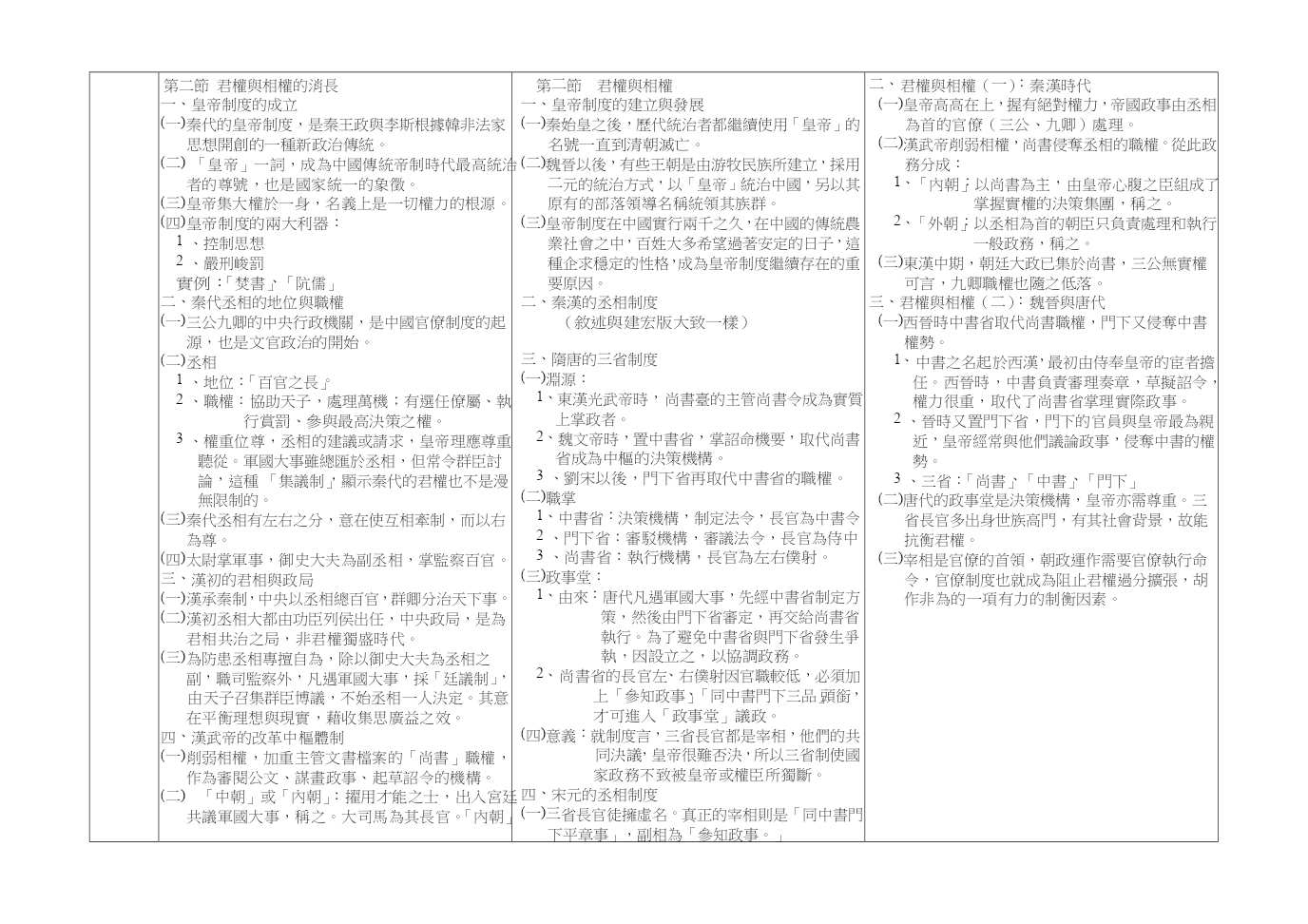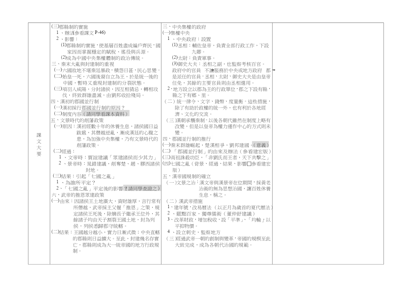 第四章大一統帝國的規模與運作 版本建宏南一龍騰 第一節封建與郡縣制度的演變第一節從封建到郡縣一、郡縣制的確立 第二節君權與相權的消長第二節君權與相權二、君權與相權(一):秦漢時代 第三節道統與政統的關係第三節道統與政統三、君權與相權(二):魏晉與唐代 章 四、道統影響下的政治:儒術獨尊與王莽改制 節 五、輔佐政統的學術:律令之學 六、道統與政統在地方吏治的反映 七、帝國的衰亡 前言前言課前引導 (一)秦漢(西元前221∼西元220年)大一統帝國的一、秦始皇統一中國後,一方面建立中央集權政治制一、秦帝國建立,開啟了二千年的帝制時代。 規制與運作,是中國歷史發展上的一個關鍵時代度,一方面進行對周邊外族的征討,確立了中國二、帝國的運作?權力中心?君權與相權關係? 的版圖。三、學說思想與實際政治之間的關係: (二)秦漢之後二千餘年,雖然朝代更迭頻繁,天下分二、漢朝建國規制大多沿襲秦朝,歷代在中央與地方1、漢武帝獨尊儒術? 合無常,但是整個政治社會的結構,大致是維持行政制度方面或有改變,但是在維護皇權與削弱2、王莽竄漢與改革的思想依據? 秦漢的基本體制不變,直至清末鴉片戰爭後才逐相權方面的觀念,卻相當一致。3、漢代士人要通明經學,也要懂得律學。 漸動搖解體。三、以「道統」自承的知識分子,在帝國的運作之中,四、「黨錮之禍」? 扮演了監督「政統」的力量。 第一節封建與郡縣制度的演變第一節從封建到郡縣一、郡縣制的確立 一、春秋戰國時代郡縣的出現一、秦國的變法及帝國的建立(一)秦始皇採李斯建議,決定不再行封建,在地方設 (一)春秋以前的封建體制,是一種化整為零的分散統(一)秦國的變法圖強置郡縣。 治,其主要根據就是禮樂宗法與井田制度。所以1、秦孝公採商鞅變法:打破傳統,推行新政。(二)秦分天下為三十六郡,郡下設縣。 課王朝實際上是由許多大小不一的獨立封國所組2、變法內容:(三)秦始皇要掌控全國,也勤於為政,但是絕對尊君 文成,並非真正統一的國家。(1)制定連坐法的觀念卻使他拒絕批評,另外人民勞役負擔很 大(二)東周以後,封建體制崩解,加上農工商業的發達,(2)提倡軍功,禁止私鬥重,生活極苦。 要國君能夠掌握可觀的財富,可聘僱官僚取代世襲(3)重農抑商,獎勵耕織(四)項羽再行封建,不得民心;劉邦與民約法三章, 的貴族,因此兼併新占的土地,往往設置郡縣直(4)廢封建,開阡陌獲得支持。 接統治,而不再分封給貴族作封邑。(5)推行縣制。(五)漢初存在著中央集權與封建割據兩股力量的對 (三)春秋時期,晉國是最早設置郡縣的國家,其後楚3、結果:變法之後,秦國無論在政治、經濟、社抗,直到七國之亂的敉平,方告結束。 與秦國也先後實施。會各方面都得到全面的革新,君主的權力 (四)商鞅變法,廢分封制,以縣為地方行政單位,後擴大,建立了中央集權的政權。 來秦在新占地區設郡,成為秦的郡縣制度。(二)秦帝國的建立 1、商鞅變法後,國勢強盛,積極東侵。 二、秦始皇的廢封建行郡縣2、昭襄王時期,採范睢的「遠交近攻」策略,積 (一)秦統一中國後,封建與郡縣制的爭議,仍是新帝極東侵。 國面臨的重大問題。3、秦王政親政後,採李斯建議,以威脅利誘手段 (二)秦始皇採李斯之議,廢封建行郡縣,郡縣制自是分化各國,在位第廿六年,統一天下,建立中國 確立其不可動搖的政治基礎。歷史上第一個統一的帝國。(措施?疆域規模?) (三)郡縣制的實施三、中央集權的政府 1、辦法(參看課文P-46)(一)集權中央 2、影響:1、中央政府:設置 (1)郡縣制的實施,使基層百姓盡成編戶齊民,國(1)丞相:輔佐皇帝,負責全部行政工作,下設 家因而掌握穩定的賦稅、徭役與兵源。九卿。 (2)成為中國中央集權體制的政治傳統。(2)太尉:負責軍事。 三、秦末大亂與封建制的重視(3)御史大夫:丞相之副,也監察考核百官。 (一)六國故地不堪秦廷暴政,積怨日甚,民心思變。政府中的官員,不論服務於中央或地方政府,都 (二)始皇一死,六國後裔自立為王,於是統一後的是派任的官員。丞相、太尉、御史大夫是由皇帝 中國,暫時又重現封建制的分裂狀態。任免,其餘的主要官員則由丞相選用。 (三)項羽入咸陽,分封諸侯,因互相猜忌,轉相攻2、地方設立以郡為主的行政單位,郡之下設有縣, 伐,終致群雄盡滅,由劉邦收拾殘局。縣之下有鄉、里。 四、漢初的郡國並行制(二)統一律令、文字、錢幣、度量衡。這些措施, (一)漢初採行郡國並行制的原因?除了有助於政權的統一外,也有利於各地經 (二)制度內容(請同學看課本資料)濟、文化的交流。 五、文景時代的削藩政策(三)漢朝承襲秦制。以後各朝代雖然在制度上略有 (一)原因:漢初經數十年的休養生息,諸侯國日益改變,但是以皇帝為權力運作中心的方式則未 跋扈,其僭越逆亂,漸成漢廷的心腹之變。 課 患,為加強中央集權