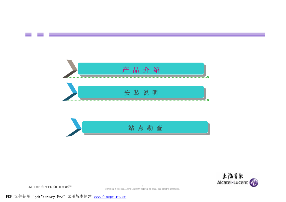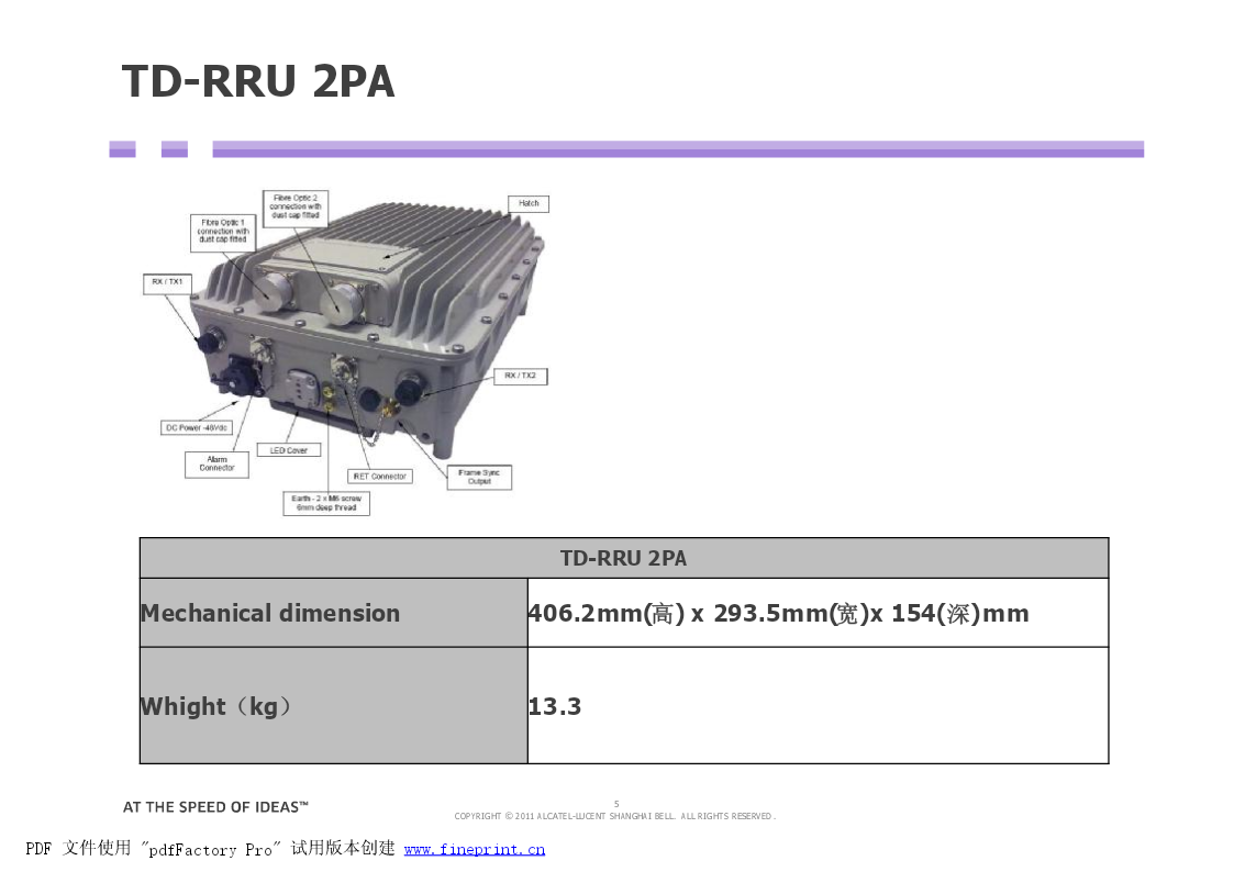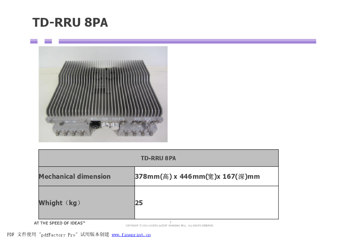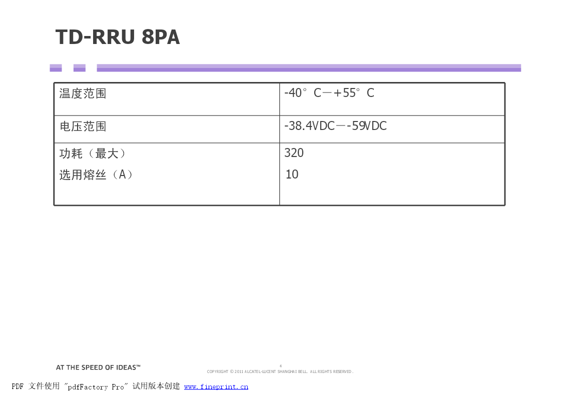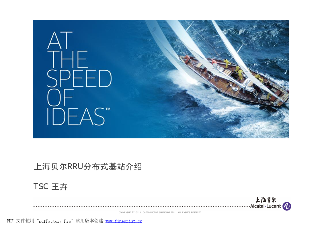 上海贝尔RRU分布式基站介绍 TSC王卉 COPYRIGHT©2011ALCATEL-LUCENTSHANGHAIBELL.ALLRIGHTSRESERVED. PDF文件使用"pdfFactoryPro"试用版本创建www.fineprint.cn 目录 1产品介绍 2安装说明 3 2 3站点勘查 2 COPYRIGHT©2011ALCATEL-LUCENTSHANGHAIBELL.ALLRIGHTSRESERVED. PDF文件使用"pdfFactoryPro"试用版本创建www.fineprint.cn TD-RRU8PA TD-RRU8PA Mechanicaldimension378mm(高)x446mm(宽)x167(深)mm Whight(kg)25 3 COPYRIGHT©2011ALCATEL-LUCENTSHANGHAIBELL.ALLRIGHTSRESERVED. PDF文件使用"pdfFactoryPro"试用版本创建www.fineprint.cn TD-RRU8PA 温度范围-40°C-+55°C 电压范围-38.4VDC--59VDC 功耗(最大)320 选用熔丝(A)10 4 COPYRIGHT©2011ALCATEL-LUCENTSHANGHAIBELL.ALLRIGHTSRESERVED. PDF文件使用"pdfFactoryPro"试用版本创建www.fineprint.cn TD-RRU2PA TD-RRU2PA Mechanicaldimension406.2mm(高)x293.5mm(宽)x154(深)mm Whight(kg)13.3 5 COPYRIGHT©2011ALCATEL-LUCENTSHANGHAIBELL.ALLRIGHTSRESERVED. PDF文件使用"pdfFactoryPro"试用版本创建www.fineprint.cn TD-RRU2PA 温度范围-40°C-+50°C 电压范围-38.4VDC--59VDC 功耗(最大)320W 选用熔丝(A)10 6 COPYRIGHT©2011ALCATEL-LUCENTSHANGHAIBELL.ALLRIGHTSRESERVED. PDF文件使用"pdfFactoryPro"试用版本创建www.fineprint.cn 9926BBUD2U TD-RRU2×20W Mechanicaldimension88.1mm(高)x300mm(宽)x482.6(深)mm Whight(kg)11.13 7 COPYRIGHT©2011ALCATEL-LUCENTSHANGHAIBELL.ALLRIGHTSRESERVED. PDF文件使用"pdfFactoryPro"试用版本创建www.fineprint.cn 9926BBUD2U 温度范围-5°C-+65°C 相对湿度8%-100% 电压范围-40.5VDC--57VDC 功耗(最大)620(V5Fan+eCCM+3bCEM) 选用熔丝(A)16 8 COPYRIGHT©2011ALCATEL-LUCENTSHANGHAIBELL.ALLRIGHTSRESERVED. PDF文件使用"pdfFactoryPro"试用版本创建www.fineprint.cn 目录 1产品介绍 2安装说明 3 2 3站点勘查 9 COPYRIGHT©2011ALCATEL-LUCENTSHANGHAIBELL.ALLRIGHTSRESERVED. PDF文件使用"pdfFactoryPro"试用版本创建www.fineprint.cn RRU安装方式 RRU基站安装有以下几种场景: Ø抱杆和对墙安装;安装件不同 Ø室内和室外: a)室外安装:标准的宏基站,要求安装遮阳罩 b)室内安装:室内分布,不要求安装遮阳罩 ØAC和DC供电: a)AC供电需要AC/DC转换器、AC防雷箱和AC电源线(往用户侧) b)DC供电需要DC防雷箱和DC电源线(往用户侧) 10 COPYRIGHT©2011ALCATEL-LUCENTSHANGHAIBELL.ALLRIGHTSRESERVED. PDF文件使用"pdfFactoryPro"试用版本创建www.fineprint.cn RRU的安装方式 RRU安装空间 Ø根据RRU的散热要求,在安装RRU的时候 ,要注意设备的间隔距离 ØRRU的上方需要保持20cm的空间位置 ØRRU的下方需要保持50cm的空间位置 ØRRU的左、右侧需要保持20cm的空间位 置 ØRRU的正面需要保持80cm的空间位置