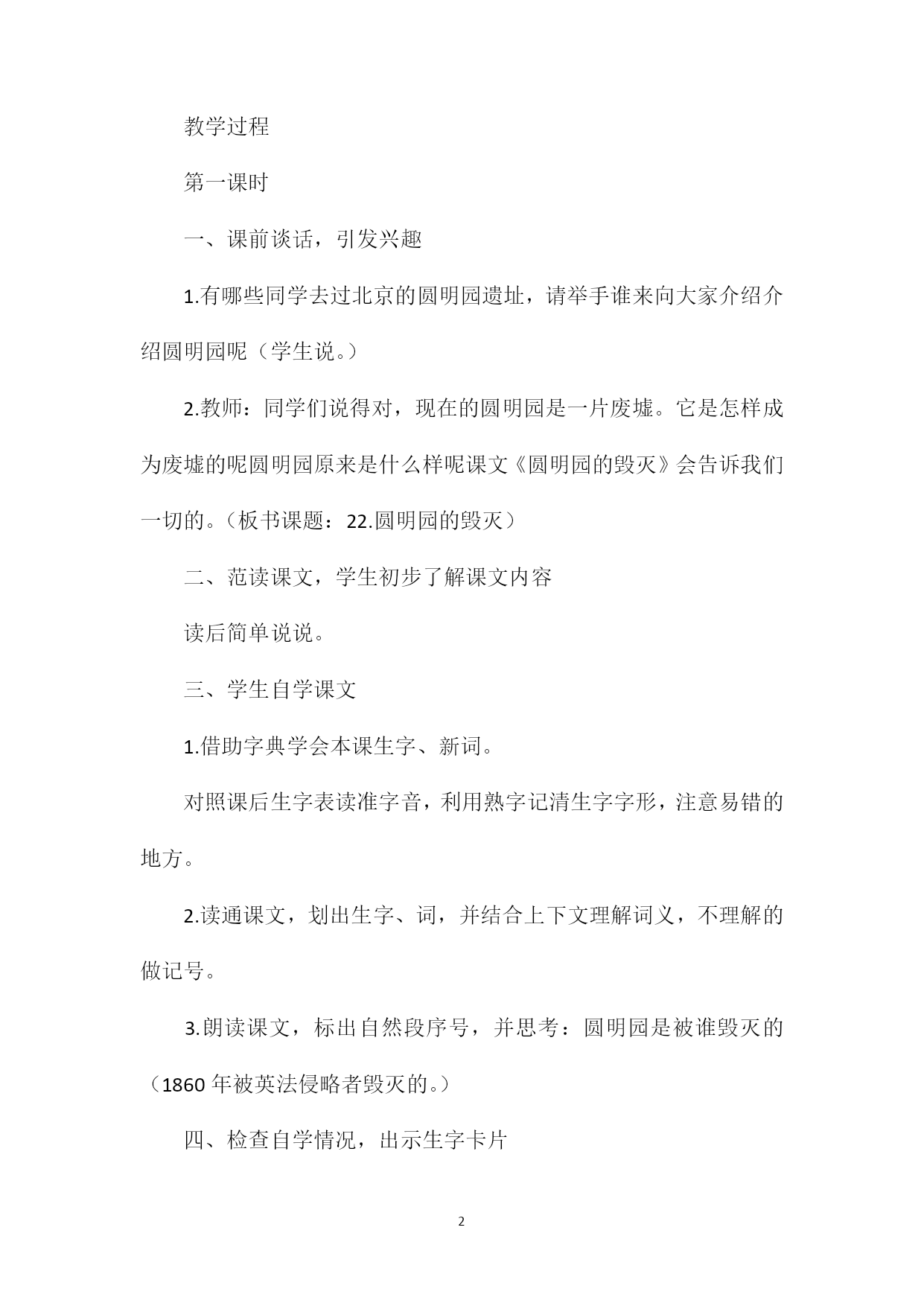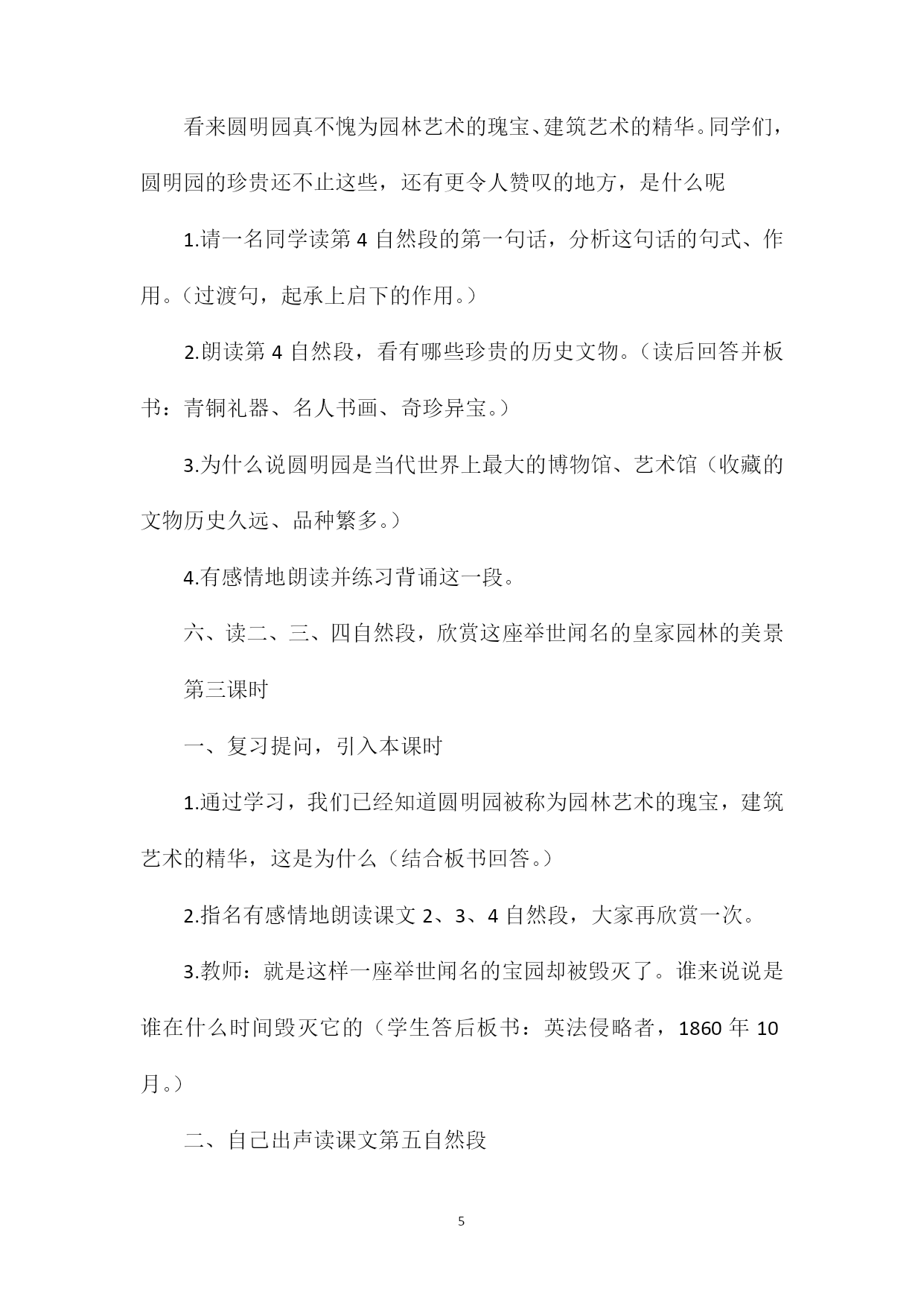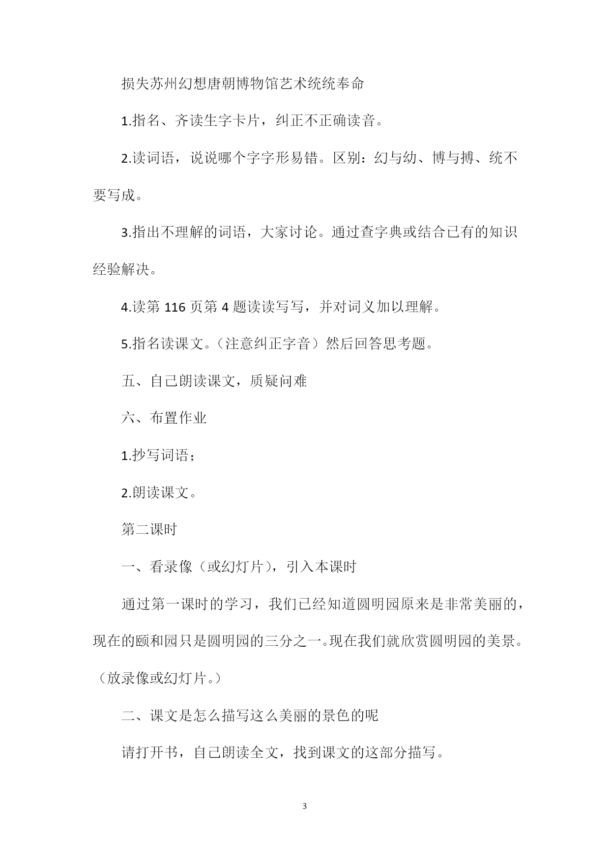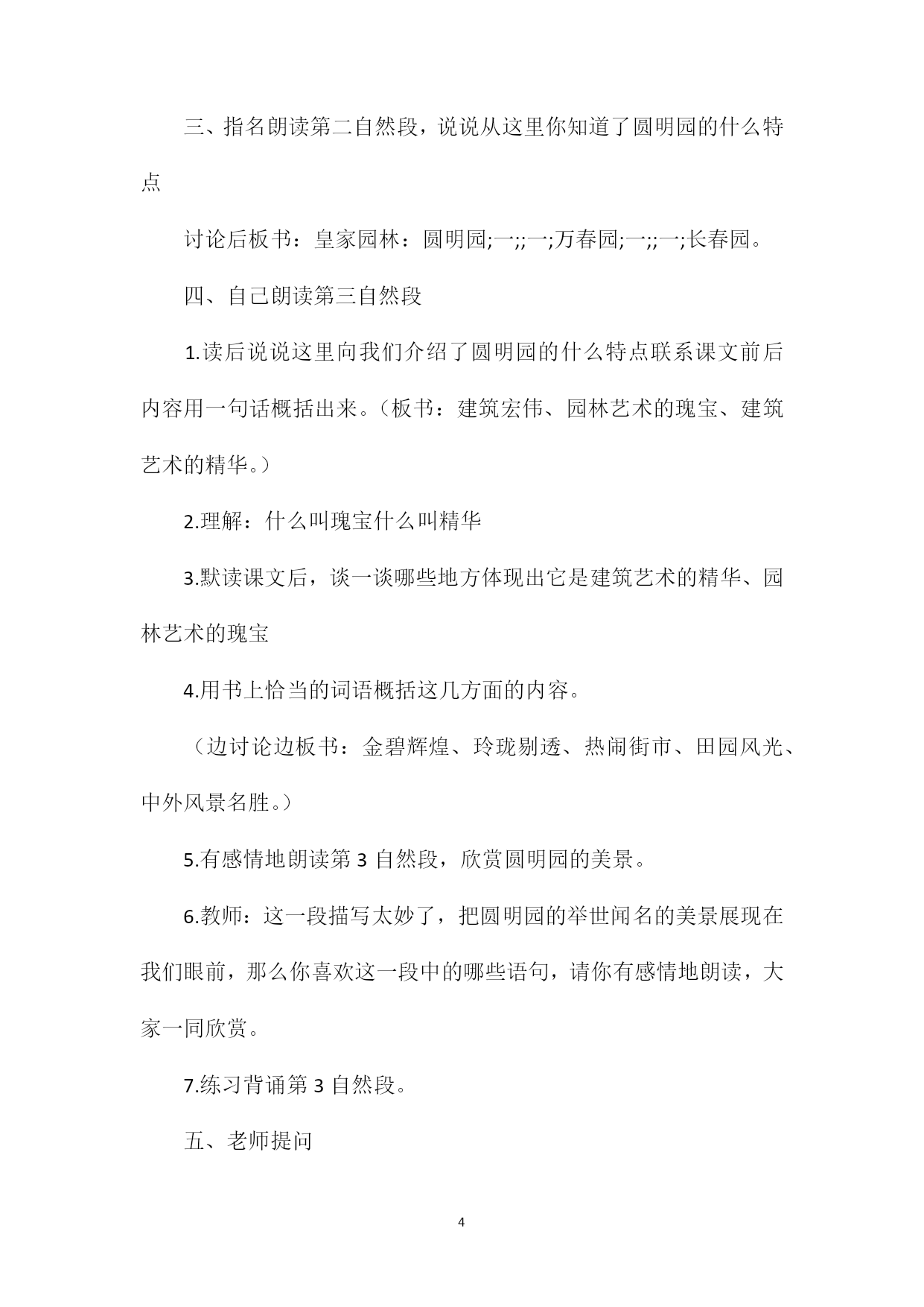 圆明园的毁灭2 教学要求 1.使学生了解圆明园的毁灭是祖国文化史上和世界文化史上不可估量的损失,是我国近代屈辱历史的见证,从而唤起学生捍卫祖国神圣尊严的责任感。 2.理解重点词语和句子的深刻含义,体会并概括课文的中心思想。 3.学会本课生字、新词,并结合课文理解词义。 4.有感情地朗读课文。背诵第3、4自然段。 教学重点 理解课文中重点词语和句子的深刻含义,体会圆明园的建造和毁灭反映祖国的强盛与衰败,唤起学生捍卫祖国神圣尊严的责任感。 教学难点 理解重点语句:圆明园的毁灭是祖国文化史上不可估量的损失,也是世界文化史上不可估量的损失。这句话的深刻含义及与中心思想的关系。 教学时间3课时。 教学准备 圆明园园景的录像带(或幻灯片)、胶片、投影仪、生字卡片。 教学过程 第一课时 一、课前谈话,引发兴趣 1.有哪些同学去过北京的圆明园遗址,请举手谁来向大家介绍介绍圆明园呢(学生说。) 2.教师:同学们说得对,现在的圆明园是一片废墟。它是怎样成为废墟的呢圆明园原来是什么样呢课文《圆明园的毁灭》会告诉我们一切的。(板书课题:22.圆明园的毁灭) 二、范读课文,学生初步了解课文内容 读后简单说说。 三、学生自学课文 1.借助字典学会本课生字、新词。 对照课后生字表读准字音,利用熟字记清生字字形,注意易错的地方。 2.读通课文,划出生字、词,并结合上下文理解词义,不理解的做记号。 3.朗读课文,标出自然段序号,并思考:圆明园是被谁毁灭的(1860年被英法侵略者毁灭的。) 四、检查自学情况,出示生字卡片 损失苏州幻想唐朝博物馆艺术统统奉命 1.指名、齐读生字卡片,纠正不正确读音。 2.读词语,说说哪个字字形易错。区别:幻与幼、博与搏、统不要写成。 3.指出不理解的词语,大家讨论。通过查字典或结合已有的知识经验解决。 4.读第4题读读写写,并对词义加以理解。 5.指名读课文。(注意纠正字音)然后回答思考题。 五、自己朗读课文,质疑问难 六、布置作业 1.抄写词语; 2.朗读课文。 第二课时 一、看录像(或幻灯片),引入本课时 通过第一课时的学习,我们已经知道圆明园原来是非常美丽的,现在的颐和园只是圆明园的三分之一。现在我们就欣赏圆明园的美景。(放录像或幻灯片。) 二、课文是怎么描写这么美丽的景色的呢 请打开书,自己朗读全文,找到课文的这部分描写。 三、指名朗读第二自然段,说说从这里你知道了圆明园的什么特点 讨论后板书:皇家园林:圆明园;一;;一;万春园;一;;一;长春园。 四、自己朗读第三自然段 1.读后说说这里向我们介绍了圆明园的什么特点联系课文前后内容用一句话概括出来。(板书:建筑宏伟、园林艺术的瑰宝、建筑艺术的精华。) 2.理解:什么叫瑰宝什么叫精华 3.默读课文后,谈一谈哪些地方体现出它是建筑艺术的精华、园林艺术的瑰宝 4.用书上恰当的词语概括这几方面的内容。 (边讨论边板书:金碧辉煌、玲珑剔透、热闹街市、田园风光、中外风景名胜。) 5.有感情地朗读第3自然段,欣赏圆明园的美景。 6.教师:这一段描写太妙了,把圆明园的举世闻名的美景展现在我们眼前,那么你喜欢这一段中的哪些语句,请你有感情地朗读,大家一同欣赏。 7.练习背诵第3自然段。 五、老师提问 看来圆明园真不愧为园林艺术的瑰宝、建筑艺术的精华。同学们,圆明园的珍贵还不止这些,还有更令人赞叹的地方,是什么呢 1.请一名同学读第4自然段的第一句话,分析这句话的句式、作用。(过渡句,起承上启下的作用。) 2.朗读第4自然段,看有哪些珍贵的历史文物。(读后回答并板书:青铜礼器、名人书画、奇珍异宝。) 3.为什么说圆明园是当代世界上最大的博物馆、艺术馆(收藏的文物历史久远、品种繁多。) 4.有感情地朗读并练习背诵这一段。 六、读二、三、四自然段,欣赏这座举世闻名的皇家园林的美景 第三课时 一、复习提问,引入本课时 1.通过学习,我们已经知道圆明园被称为园林艺术的瑰宝,建筑艺术的精华,这是为什么(结合板书回答。) 2.指名有感情地朗读课文2、3、4自然段,大家再欣赏一次。 3.教师:就是这样一座举世闻名的宝园却被毁灭了。谁来说说是谁在什么时间毁灭它的(学生答后板书:英法侵略者,1860年10月。) 二、自己出声读课文第五自然段 1.把描写圆明园被毁灭的句子划出来。 2.指名朗读这些句子,讨论分析,问:你从中体会到了什么(体会到了侵略者的罪大恶极;清朝统治者的腐败无能。) (投影出示卡片)读一读,联系上下文说说带点词语的意思,再说说从带点词语中体会到了什么。 (1)1860年10月6日,英、法联军侵入北京,闯进圆明园。他们把园内凡是能拿走的东西,统统掠走,拿不动的,就用大车或牲口搬运。实在运不走的,就任意破坏、毁掉。 (2)圆明园的毁灭是祖国文化史上不可估量的损失,也是世界