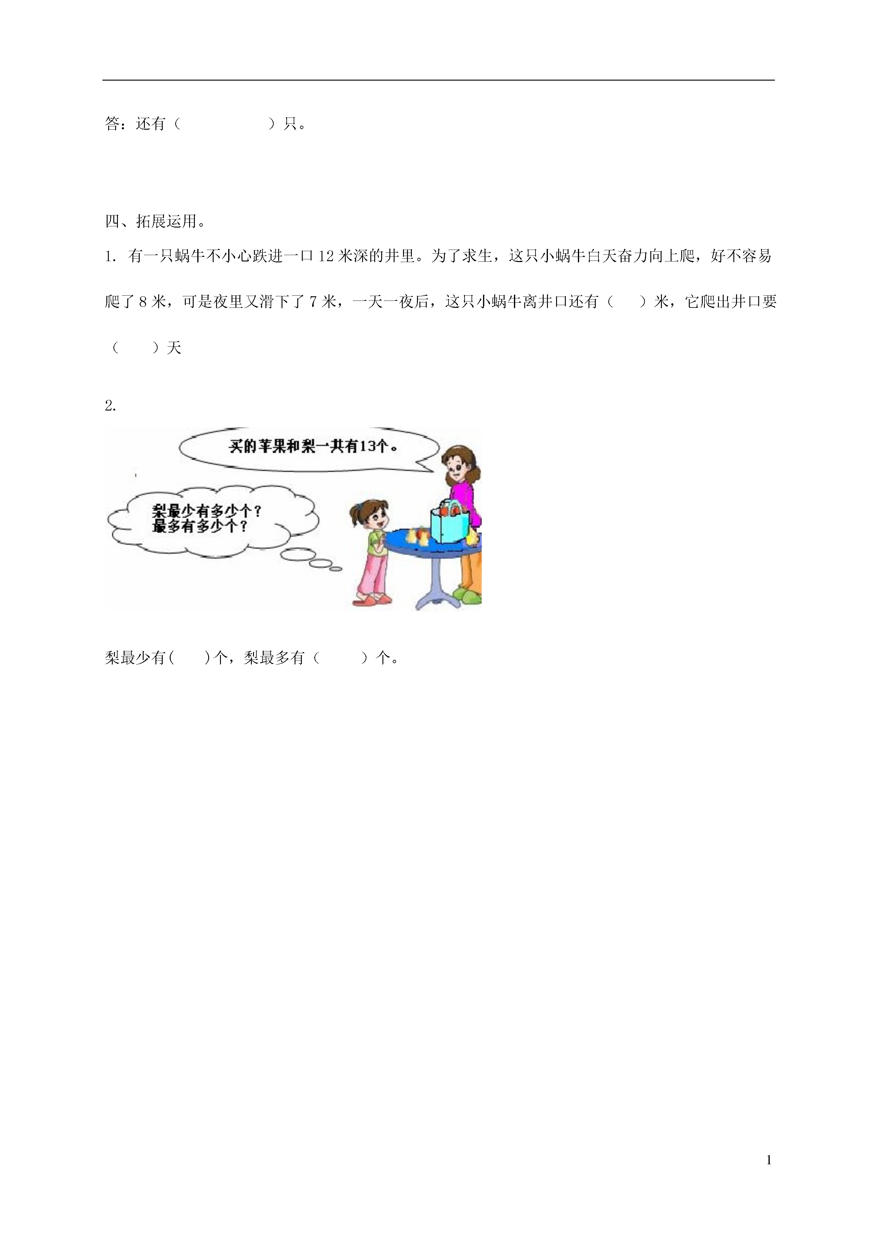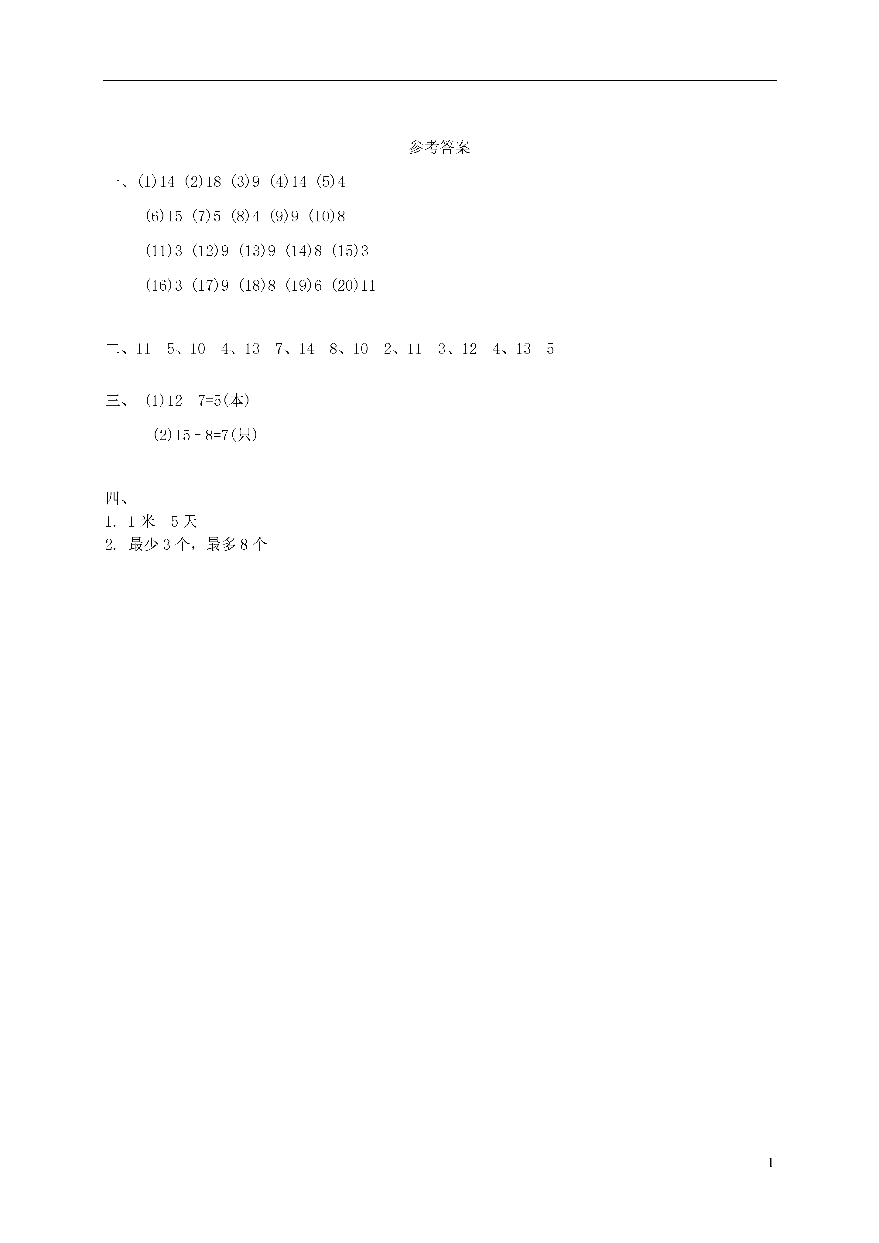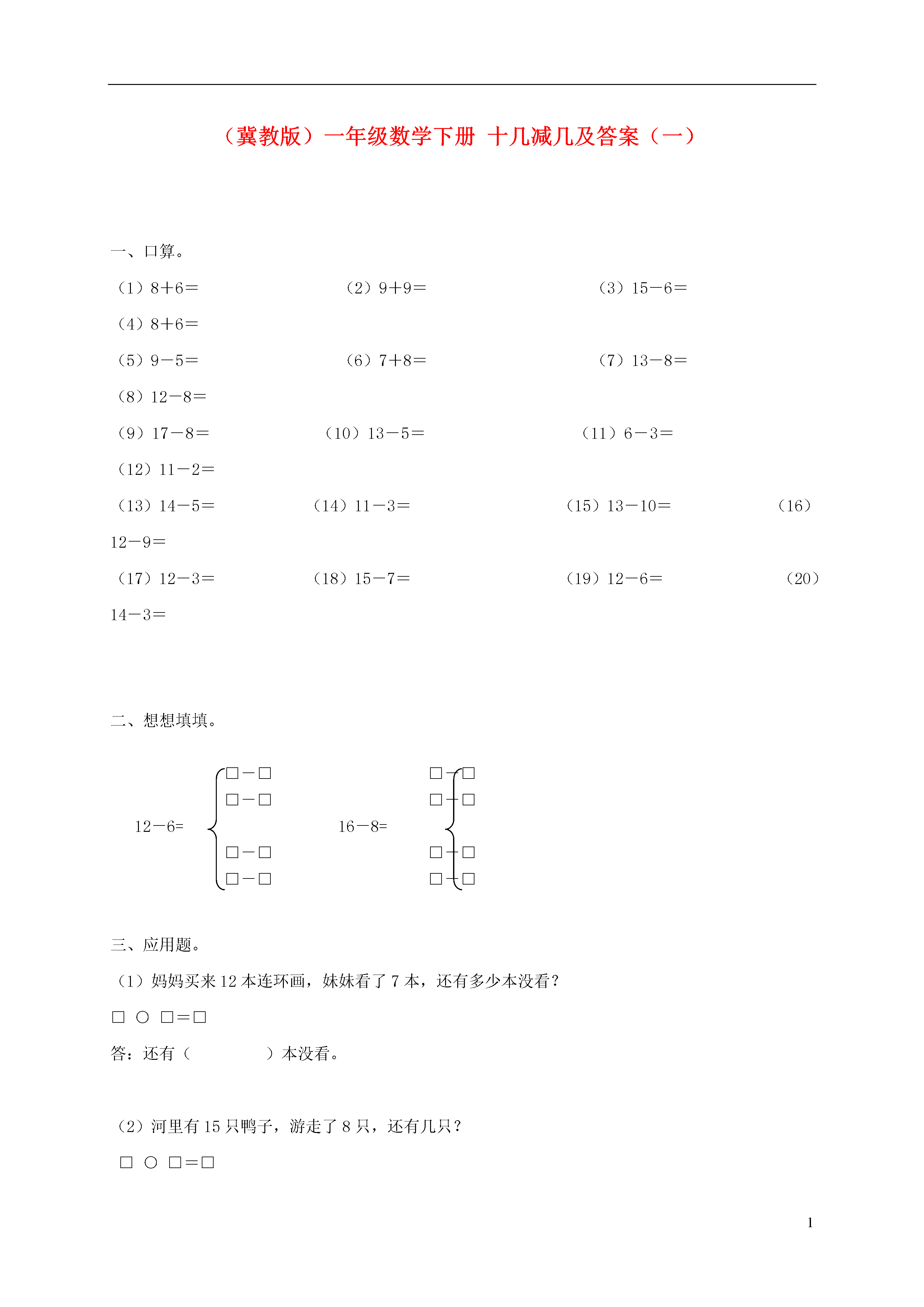1(冀教版)一年级数学下册十几减几及答案(一)一、口算。(1)8+6=(2)9+9=(3)15-6=(4)8+6=(5)9-5=(6)7+8=(7)13-8=(8)12-8=(9)17-8=(10)13-5=(11)6-3=(12)11-2=(13)14-5=(14)11-3=(15)13-10=(16)12-9=(17)12-3=(18)15-7=(19)12-6=(20)14-3=二、想想填填。□-□□-□□-□□-□12-6=16-8=□-□□-□□-□□-□三、应用题。(1)妈妈买来12本连环画,妹妹看了7本,还有多少本没看?□○□=□答:还有()本没看。(2)河里有15只鸭子,游走了8只,还有几只?□○□=□答:还有()只。四、拓展运用。1.有一只蜗牛不小心跌进一口12米深的井里。为了求生,这只小蜗牛白天奋力向上爬,好不容易爬了8米,可是夜里又滑下了7米,一天一夜后,这只小蜗牛离井口还有()米,它爬出井口要()天2.梨最少有()个,梨最多有()个。参考答案一、(1)14(2)18(3)9(4)14(5)4(6)15(7)5(8)4(9)9(10)8(11)3(12)9(13)9(14)8(15)3(16)3(17)9(18)8(19)6(20)11二、11-5、10-4、13-7、14-8、10-2、11-3、12-4、13-5三、(1)12–7=5(本)(2)15–8=7(只)四、1.1米5天2.最少3个,最多8个