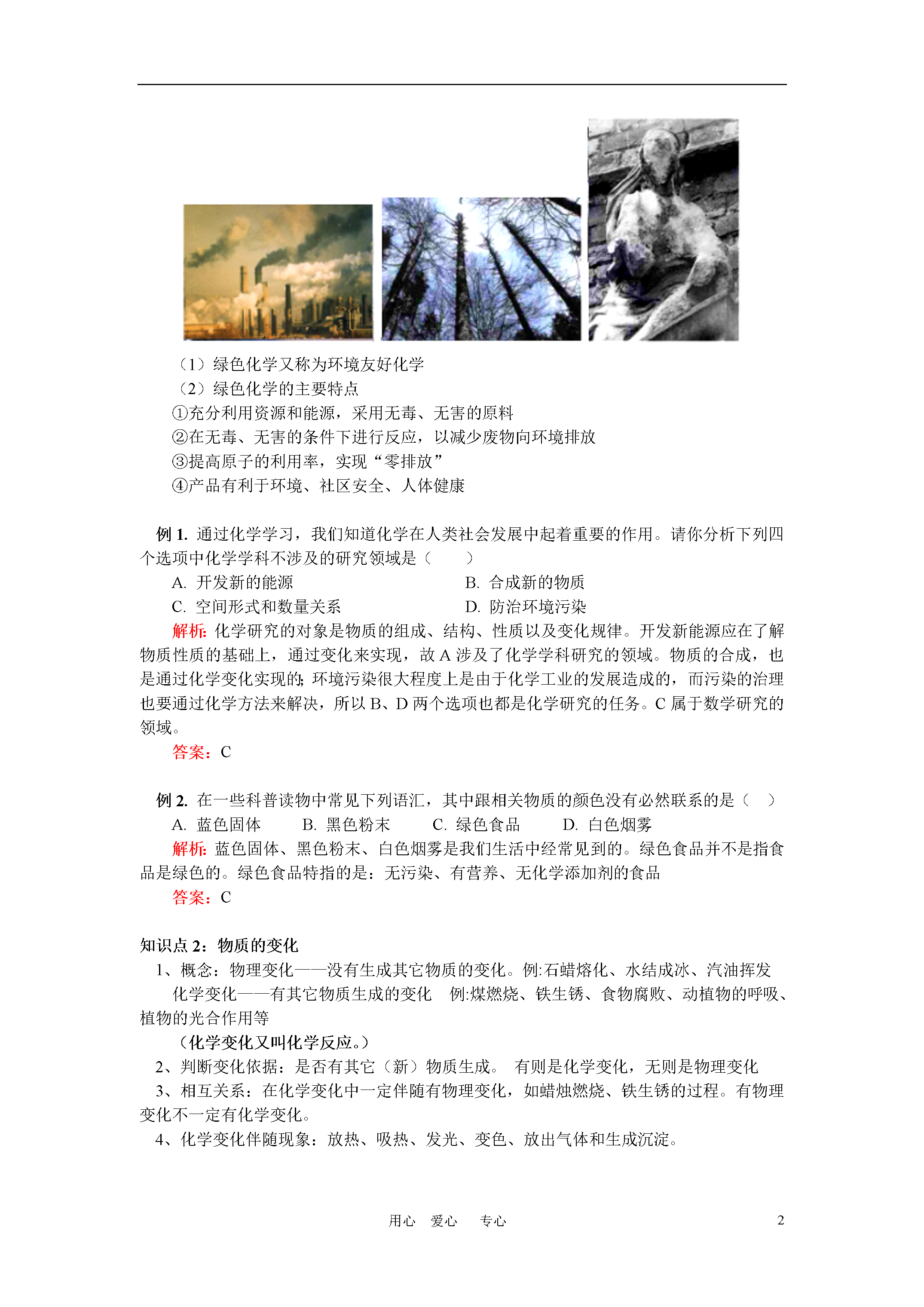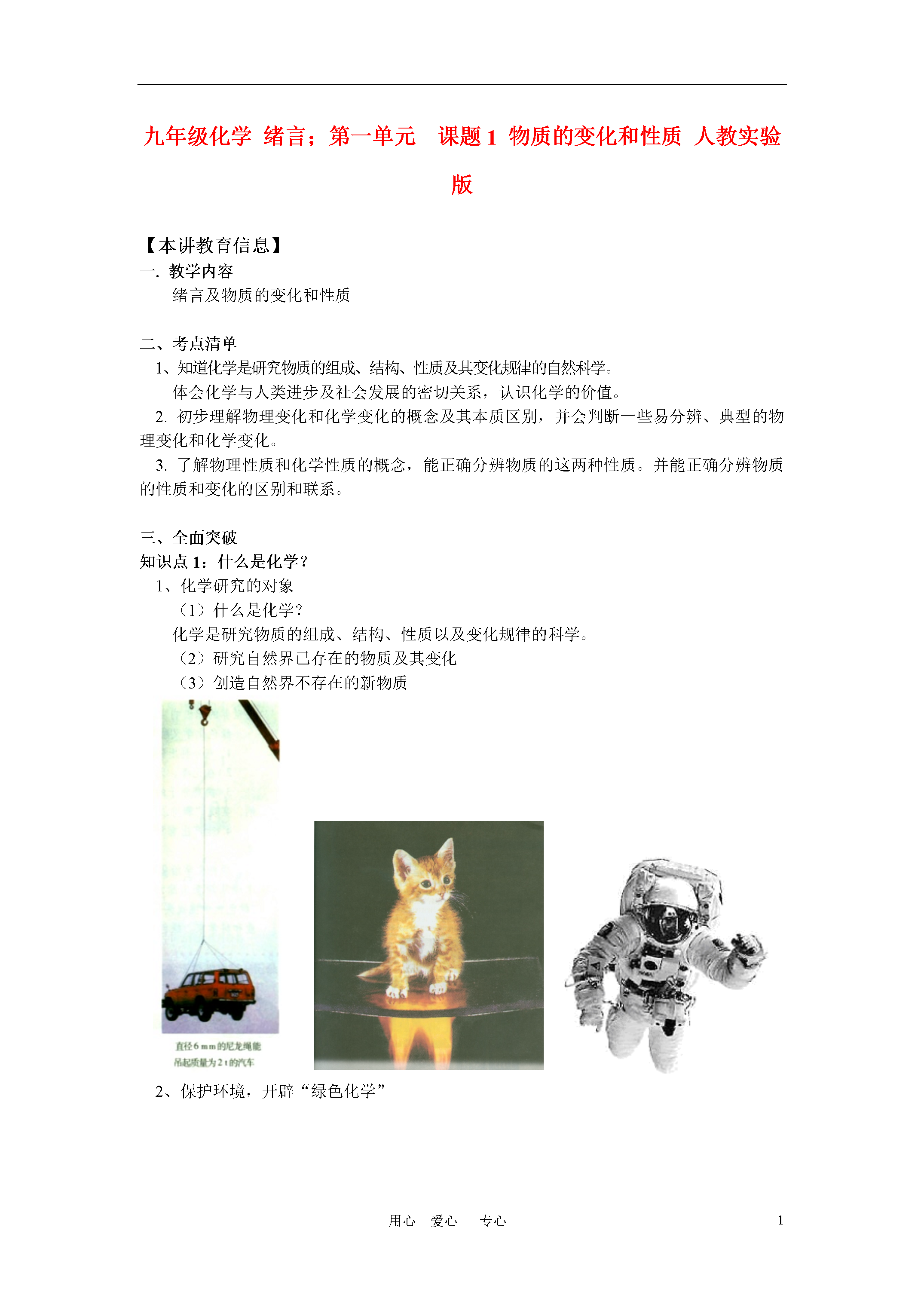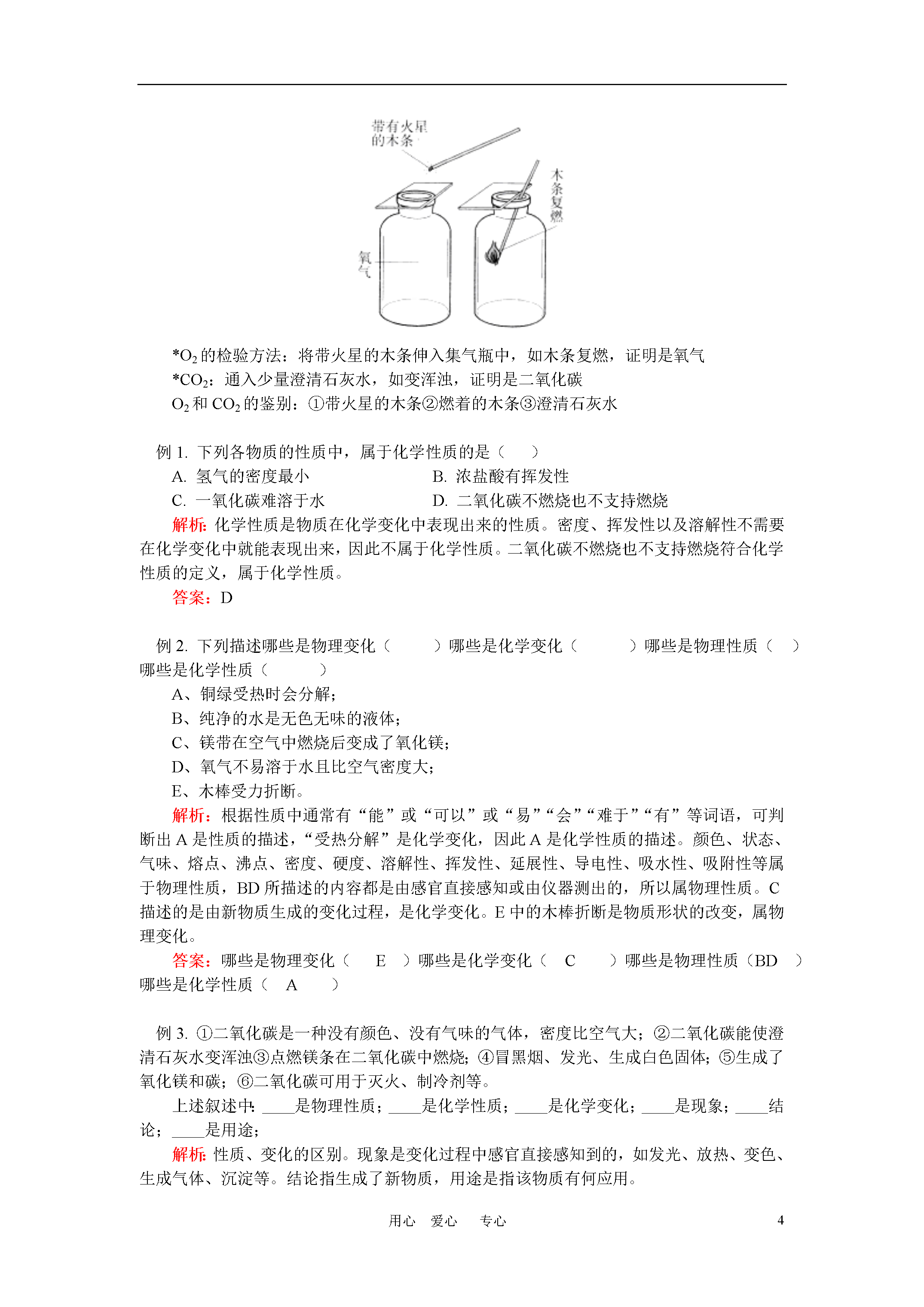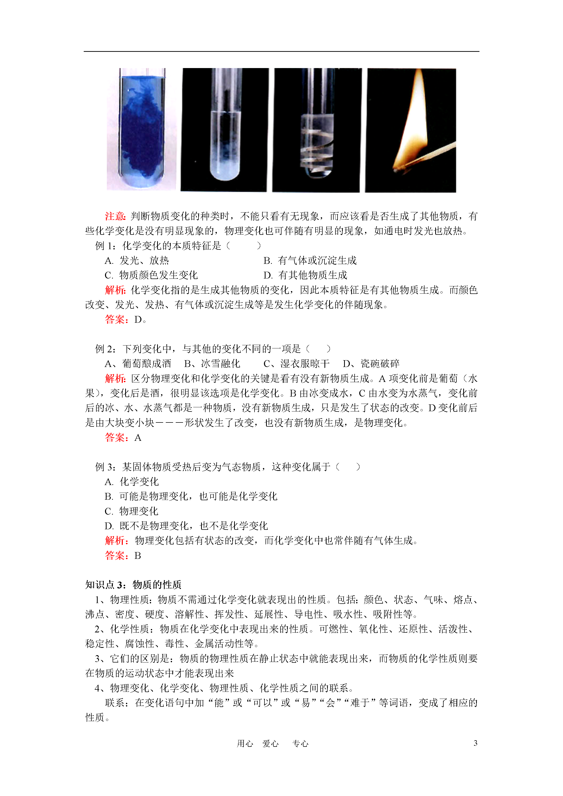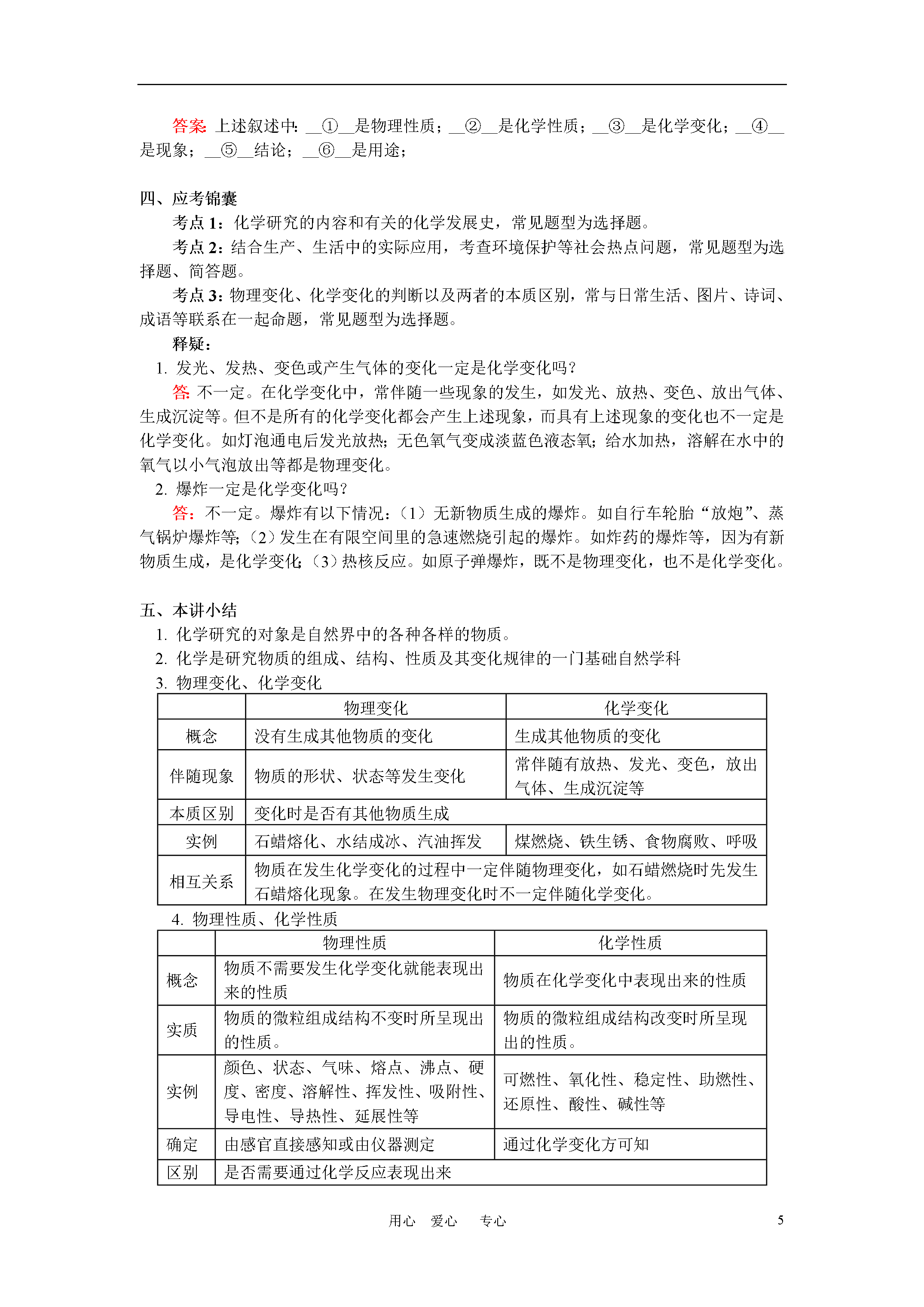 10用心爱心专心九年级化学绪言;第一单元课题1物质的变化和性质人教实验版【本讲教育信息】一.教学内容绪言及物质的变化和性质二、考点清单1、知道化学是研究物质的组成、结构、性质及其变化规律的自然科学。体会化学与人类进步及社会发展的密切关系,认识化学的价值。2.初步理解物理变化和化学变化的概念及其本质区别,并会判断一些易分辨、典型的物理变化和化学变化。3.了解物理性质和化学性质的概念,能正确分辨物质的这两种性质。并能正确分辨物质的性质和变化的区别和联系。三、全面突破知识点1:什么是化学?1、化学研究的对象(1)什么是化学?化学是研究物质的组成、结构、性质以及变化规律的科学。(2)研究自然界已存在的物质及其变化(3)创造自然界不存在的新物质2、保护环境,开辟“绿色化学”(1)绿色化学又称为环境友好化学(2)绿色化学的主要特点①充分利用资源和能源,采用无毒、无害的原料②在无毒、无害的条件下进行反应,以减少废物向环境排放③提高原子的利用率,实现“零排放”④产品有利于环境、社区安全、人体健康例1.通过化学学习,我们知道化学在人类社会发展中起着重要的作用。请你分析下列四个选项中化学学科不涉及的研究领域是()A.开发新的能源B.合成新的物质C.空间形式和数量关系D.防治环境污染解析:化学研究的对象是物质的组成、结构、性质以及变化规律。开发新能源应在了解物质性质的基础上,通过变化来实现,故A涉及了化学学科研究的领域。物质的合成,也是通过化学变化实现的;环境污染很大程度上是由于化学工业的发展造成的,而污染的治理也要通过化学方法来解决,所以B、D两个选项也都是化学研究的任务。C属于数学研究的领域。答案:C例2.在一些科普读物中常见下列语汇,其中跟相关物质的颜色没有必然联系的是()A.蓝色固体B.黑色粉末C.绿色食品D.白色烟雾解析:蓝色固体、黑色粉末、白色烟雾是我们生活中经常见到的。绿色食品并不是指食品是绿色的。绿色食品特指的是:无污染、有营养、无化学添加剂的食品答案:C知识点2:物质的变化1、概念:物理变化——没有生成其它物质的变化。例:石蜡熔化、水结成冰、汽油挥发化学变化——有其它物质生成的变化例:煤燃烧、铁生锈、食物腐败、动植物的呼吸、植物的光合作用等(化学变化又叫化学反应。)2、判断变化依据:是否有其它(新)物质生成。有则是化学变化,无则是物理变化3、相互关系:在化学变化中一定伴随有物理变化,如蜡烛燃烧、铁生锈的过程。有物理变化不一定有化学变化。4、化学变化伴随现象:放热、吸热、发光、变色、放出气体和生成沉淀。注意:判断物质变化的种类时,不能只看有无现象,而应该看是否生成了其他物质,有些化学变化是没有明显现象的,物理变化也可伴随有明显的现象,如通电时发光也放热。例1:化学变化的本质特征是()A.发光、放热B.有气体或沉淀生成C.物质颜色发生变化D.有其他物质生成解析:化学变化指的是生成其他物质的变化,因此本质特征是有其他物质生成。而颜色改变、发光、发热、有气体或沉淀生成等是发生化学变化的伴随现象。答案:D。例2:下列变化中,与其他的变化不同的一项是()A、葡萄酿成酒B、冰雪融化C、湿衣服晾干D、瓷碗破碎解析:区分物理变化和化学变化的关键是看有没有新物质生成。A项变化前是葡萄(水果),变化后是酒,很明显该选项是化学变化。B由冰变成水,C由水变为水蒸气,变化前后的冰、水、水蒸气都是一种物质,没有新物质生成,只是发生了状态的改变。D变化前后是由大块变小块---形状发生了改变,也没有新物质生成,是物理变化。答案:A例3:某固体物质受热后变为气态物质,这种变化属于()A.化学变化B.可能是物理变化,也可能是化学变化C.物理变化D.既不是物理变化,也不是化学变化解析:物理变化包括有状态的改变,而化学变化中也常伴随有气体生成。答案:B知识点3:物质的性质1、物理性质:物质不需通过化学变化就表现出的性质。包括:颜色、状态、气味、熔点、沸点、密度、硬度、溶解性、挥发性、延展性、导电性、吸水性、吸附性等。2、化学性质:物质在化学变化中表现出来的性质。可燃性、氧化性、还原性、活泼性、稳定性、腐蚀性、毒性、金属活动性等。3、它们的区别是:物质的物理性质在静止状态中就能表现出来,而物质的化学性质则要在物质的运动状态中才能表现出来4、物理变化、化学变化、物理性质、化学性质之间的联系。联系:在变化语句中加“能”或“可以”或“易”“会”“难于”等词语,变成了相应的性质。*O2的检验方法:将带火星的木条伸入集气瓶中,如木条复燃,证明是氧气*CO2:通入少量澄清石灰水,如变浑浊,证明是二氧化碳O2和CO2的鉴别:①带火星的木条②燃着的木条③澄清石灰水例1.下列各物质的性质中,属于化学性质的是()A.氢气的密度最小B.浓盐酸有挥发性C.一氧化碳难溶于水D.二氧化碳不燃烧也不支持