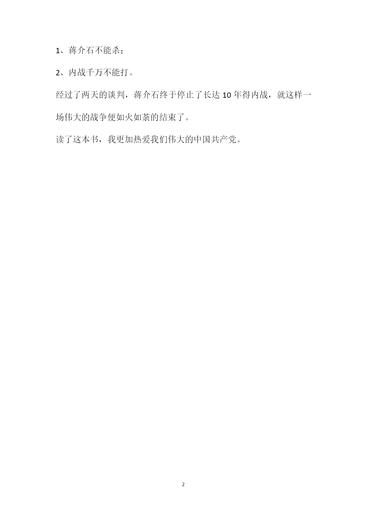 纪念西安事变_《我爱中国共产党》读后感500字 前几天,我读了《我爱中国共产党》这本书,里面分为两辑,第一辑没有共产党就没有新中国;第二辑从今走向繁荣富强。 这本书中使我感触深刻的是上辑中的西安事变 西安事变是于1936年12月14日凌晨。开始直到1936年12月22日才终于,结束了的战争。 蒋介石用了攘外必先安内的政策,在1936年10月下旬,蒋介石调遣嫡系部队30个师,准备开入陕甘,一面围剿红军,一面防范东北军与17路军。 结束,是想都不用想,战败,而且还将张学良,杨虎城二人送给了红军,做红军战士,是因为这样的: 1936年12月4日那天,蒋介石飞到了西安亲自督战,他给张学良,杨虎城施加压力,要求他们服从剿共的命令。张、杨二人被逼到了绝境,终于痛下决心,实行兵谏。所以他们才投靠了共产党。 西安事变爆发后,张学良的卫队营营队包围了华清池,在骊山半腰山洞中扣留了蒋介石。周恩来被派到西安,协助张、杨二人处理事变。临行前,毛泽东毛爷爷叮嘱道:在谈判中务必要把握住两点: 1、蒋介石不能杀; 2、内战千万不能打。 经过了两天的谈判,蒋介石终于停止了长达10年得内战,就这样一场伟大的战争便如火如荼的结束了。 读了这本书,我更加热爱我们伟大的中国共产党。