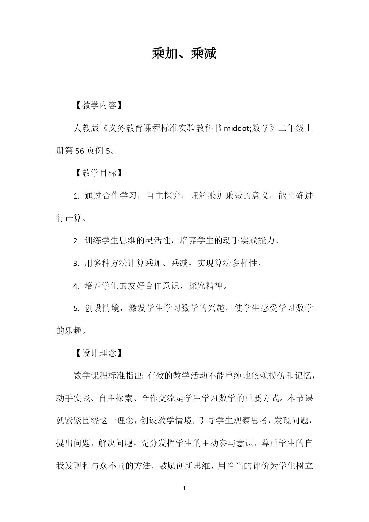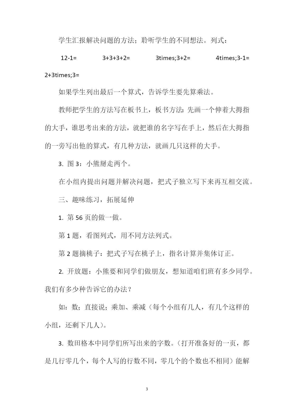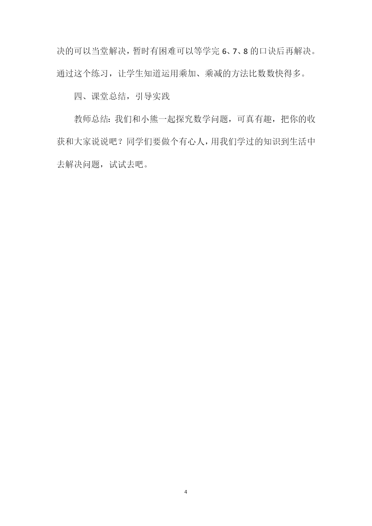 乘加、乘减 【教学内容】 人教版《义务教育课程标准实验教科书middot;数学》二年级上册例5。 【教学目标】 1.通过合作学习,自主探究,理解乘加乘减的意义,能正确进行计算。 2.训练学生思维的灵活性,培养学生的动手实践能力。 3.用多种方法计算乘加、乘减,实现算法多样性。 4.培养学生的友好合作意识、探究精神。 5.创设情境,激发学生学习数学的兴趣,使学生感受学习数学的乐趣。 【设计理念】 数学课程标准指出:有效的数学活动不能单纯地依赖模仿和记忆,动手实践、自主探索、合作交流是学生学习数学的重要方式。本节课就紧紧围绕这一理念,创设教学情境,引导学生观察思考,发现问题,提出问题,解决问题。充分发挥学生的主动参与意识,尊重学生的自我发现和与众不同的方法,鼓励创新思维,用恰当的评价为学生树立学好数学的信心,促进学生生动活泼、全面和谐地发展。 一、激趣引入,巩固旧知 教师出示小熊图片并贴到黑板上,亲切地说:瞧,多可爱的小熊啊,今天就和小熊一起走进数学乐园吧!来,先和小熊做个对口令的游戏。 1.对口令:2、3、4、5的乘法口诀。(有节奏地进行对口令:师生对、生生对) 小熊还想用几道题来了解一下咱们班谁是聪明孩子呢。 2.口算:3times;3=4times;2=(计算前两题时,要说说用的是哪句口诀。) 2+3=5times;4=1times;4=3times;4= 二、合作学习,探究新知 我们和小熊到它的农庄科技园去参观。 1.图1(在板书上画简笔画):(4棵玉米,每棵结3个)请学生观察,你发现了什么?能提出什么数学问题?列式:3times;4=4times;3=3+3+3+3= 2.图2:小熊掰走了一个。 请学生结合图意提出问题:还剩几个玉米? 怎样解决?小组商量讨论。可以借助学具。 学生汇报解决问题的方法;聆听学生的不同想法。列式: 12-1=3+3+3+2=3times;3+2=4times;3-1=2+3times;3= 如果学生列出最后一个算式,告诉学生要先算乘法。 教师把学生的方法写在板书上,板书方法:先画一个伸着大拇指的大手,谁思考出来的方法,就把谁的名字写在手上,然后在大拇指的一旁写出他的算式,有几种方法,就画几只这样的大手。 3.图3:小熊掰走两个。 在小组内提出问题并解决问题,把式子独立写下来再互相交流。 三、趣味练习,拓展延伸 1.的做一做。 第1题,看图列式,用不同方法列式。 第2题摘桃子:把式子写在桃子上,指名计算并集体订正。 2.开放题:小熊要和同学们做朋友,想知道咱们班有多少同学。我们有多少种告诉它的办法? 如:数;直接说;乘加、乘减(每个小组有几人,有几个这样的小组,还剩下几人)。 3.数田格本中同学们所写出来的字数。(打开准备好的一页,都是几行零几个,每个人写的行数不同,零几个的个数也不相同)能解决的可以当堂解决,暂时有困难可以等学完6、7、8的口诀后再解决。通过这个练习,让学生知道运用乘加、乘减的方法比数数快得多。 四、课堂总结,引导实践 教师总结:我们和小熊一起探究数学问题,可真有趣,把你的收获和大家说说吧?同学们要做个有心人,用我们学过的知识到生活中去解决问题,试试去吧。