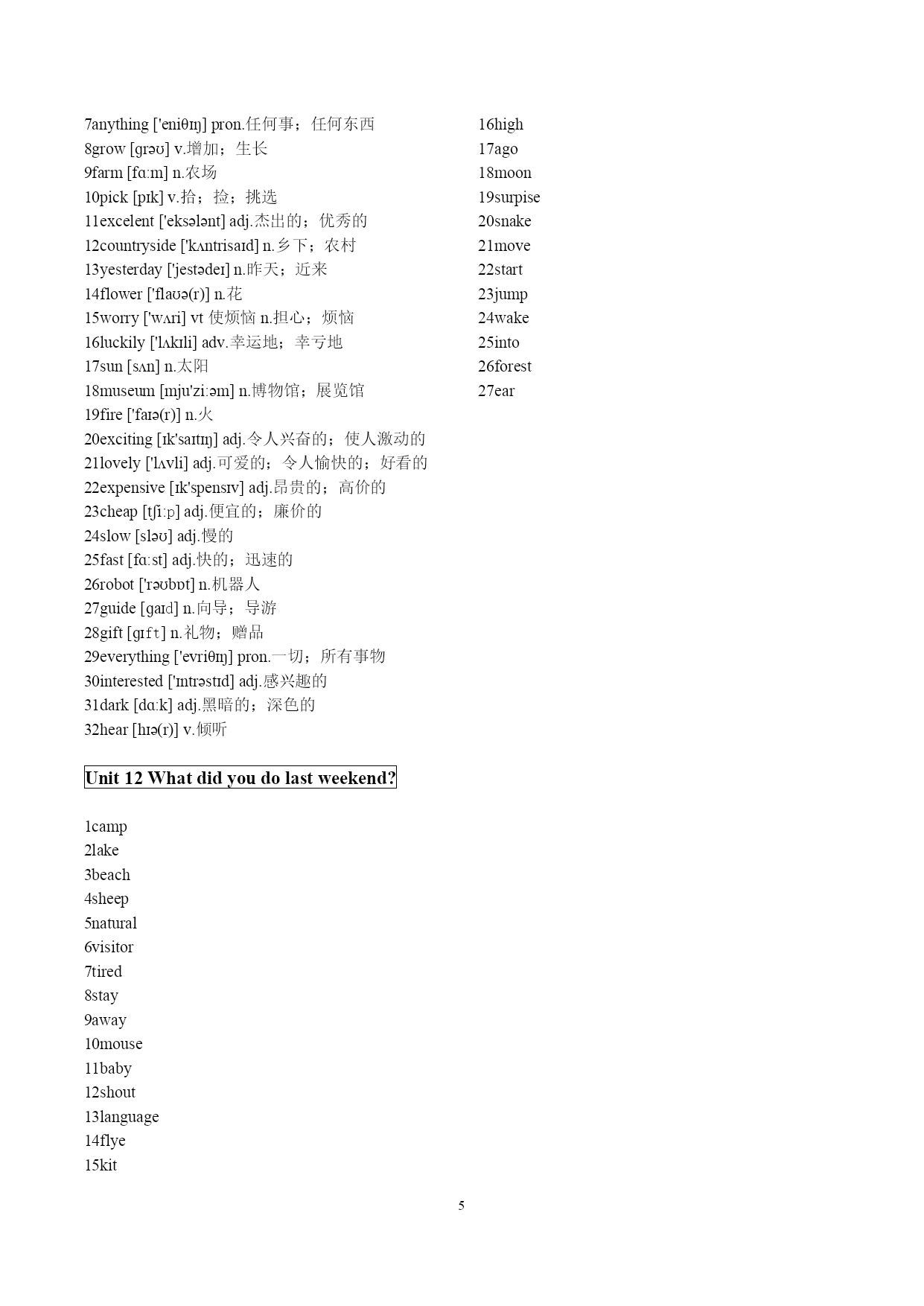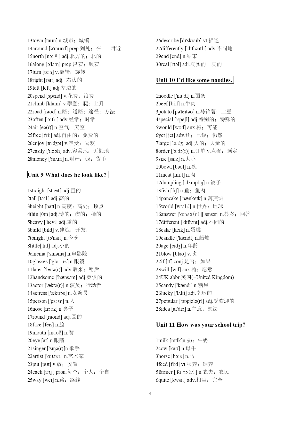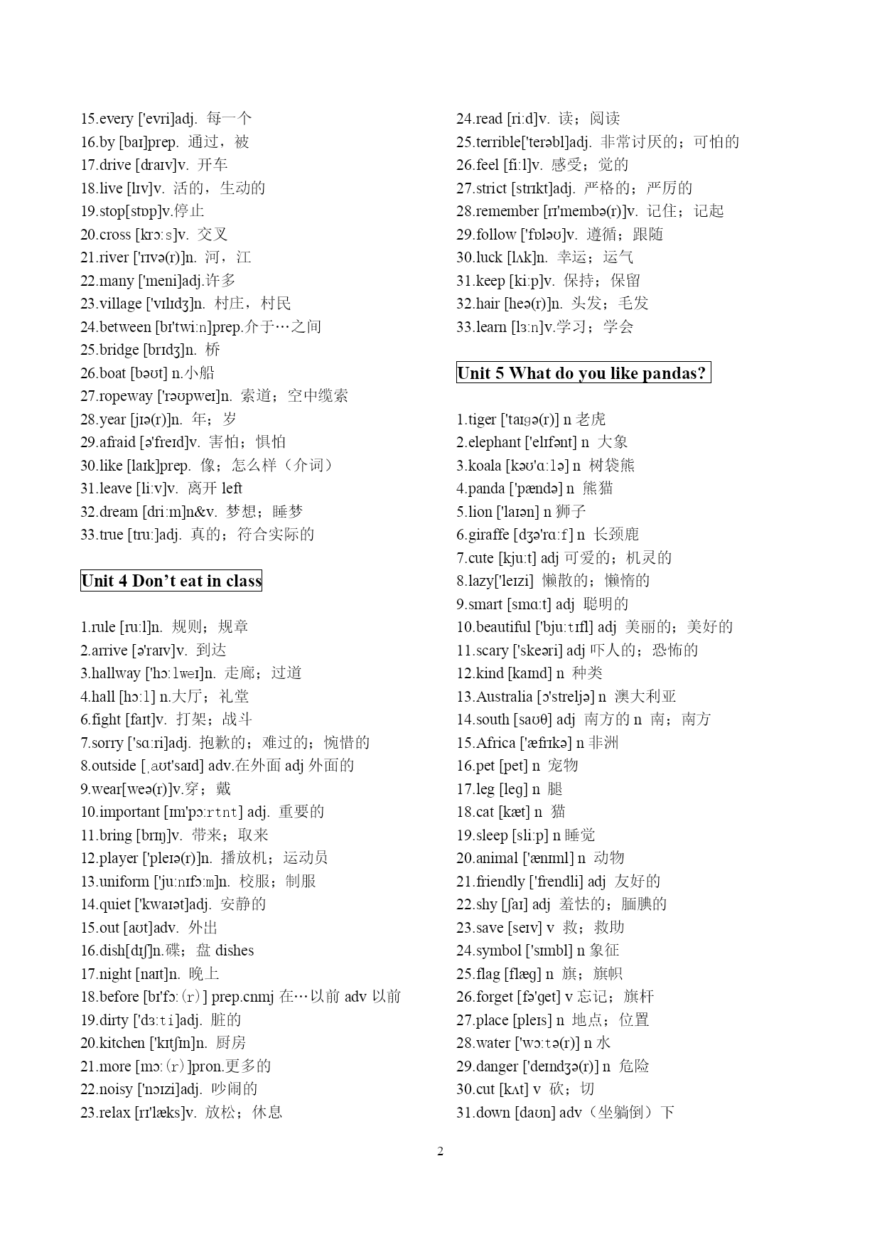 PAGE\*MERGEFORMAT5 新目标人教版七年级下册英语单词表 Unit1Canyouplaytheguitar? 1.guitar[ɡɪ'tɑːr]n.吉他 2.join[dʒɔɪn]v.参加;加入 3.dance[dɑːns][dæns]v.跳舞;舞蹈 4.swim[swɪm]v.游泳 5.sing[sɪŋ]v.唱;唱歌 6.chess[tʃes]n.国际象棋 7.paint[peint][pent]v.画画 8.speak[spi:k][spik]v.说;说话 9.piano['pjɑːnəʊ]n.钢琴 10.drum[drʌm]n.喇叭 11.violin[ˌvaɪə'lɪn]n.小提琴 12.or[ɔːr]conj.或者 13.musician[mju'zɪʃn]n.音乐家 14.show[ʃəʊ]n.演出;表演v.展示;给..看 15.draw[drɔː]v.画 16.story['stɔːri]故事、事迹、小说 17.tell[tel]v.告诉;讲述 18.write[rait]v.书写 19.talk[tɔːk]谈话、谈论 20.also['ɔːlsəʊ]也;亦;而且adv. 21.people['piːpl]人;人民n. 22.center['sɛntɚ]HYPERLINK"http://dict.youdao.com/search?q=center++&keyfrom=dict.index"\o"真人发音"中央、中心 23.home[həʊm]adv.家 24.today[tə'deɪ]n.&adv.今天;今日 25.make[meik]使、促使、迫使 26.weekend['wiːkend]n.周末;星期六和星期日 27teach[tiːtʃ]教、讲授 28club[klʌb]社团;俱乐部n. 29show[ʃəʊ]n.演出;表演v.展示;给..看 Unit2Whattimedoyougotoschool? 1up[ʌp]prep.向上 2dressed[drest]adj.打扮好的;穿着衣服的 动词dress的过去式和过去分词. 3brush[brʌʃ]v.刷 4showe['ʃaʊə(r)]v.淋浴;淋浴器 5usually['juːʒuəli]adv.通常 6forty['fɔːrti]num.四十 7never['nevə(r)]adv.永不;绝不;从不;未曾 8early['ɜːli]adv.早adj.早 9fifty['fɪfti]num.五十 10job[dʒɑːb]HYPERLINK"http://dict.youdao.com/search?q=job+&keyfrom=dict.index"\o"真人发音"n.工作;零工;任务;职位 13o'clock(=oftheclock)adv.…点钟(只用于正点) 14.station['steɪʃn]n.电视台;车站 15.funny['fʌni]adj奇怪的滑稽好笑的 16.exercise['eksərsaɪz]v.n锻炼;练习 17.group[ɡruːp]n.组群 18.takeashower淋浴;洗澡 19.work[wɜːrk]n.&v.工作 20.teeth[tiːθ]n.(tooth的复数形式)牙齿 21.best[best]adj.&adv.(good,well的比较级)(地) 22.half[hɑːf][hæf]一半,半数 23.past[pɑːst][pæst]过去,往事 24.quarter['kwɔːtə(r)]n.一刻钟;四分之一 25.homework['həʊmwɜːk]n.家庭作业 26.run[rʌn]v跑;奔 27.walk[wɔːk]v.行走;步行 28.clean[kliːn]v打扫;弄干净;adj干净的 29.quickly['kwɪkli]adv很快的 30.either['aɪðər]adv或者;也 31.lotlɒt]pron大量;许多 32.taste[teɪst]v.有…的味道;品尝n.味道;滋味 33.life[laɪf]n.生活 unit3Howdoyougettoschool 1.train[treɪn]n.火车 2.bus[bʌs]n.公交车 3.subway['sʌbweɪ]n.地铁 4.ride[raɪd]v骑n旅行rode.ridden 5.bike[baɪk]n.自行车 6.sixty['sɪksti]num.六十 7.seventy['sevnti]num.七十 8.eighty['eɪti]num.八十 9.ninety['naɪnti]num.九十 10.hundred['hʌndrəd]num.一百 11.far[fɑː