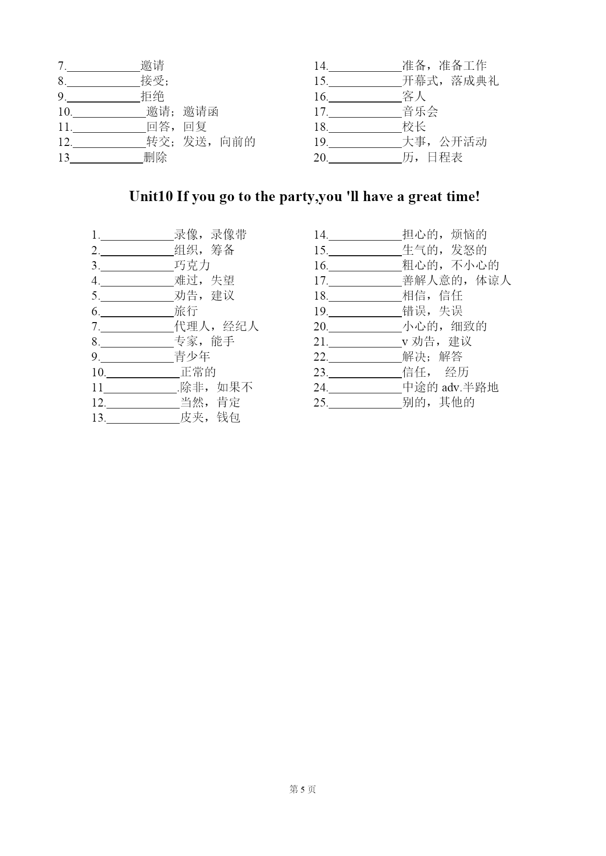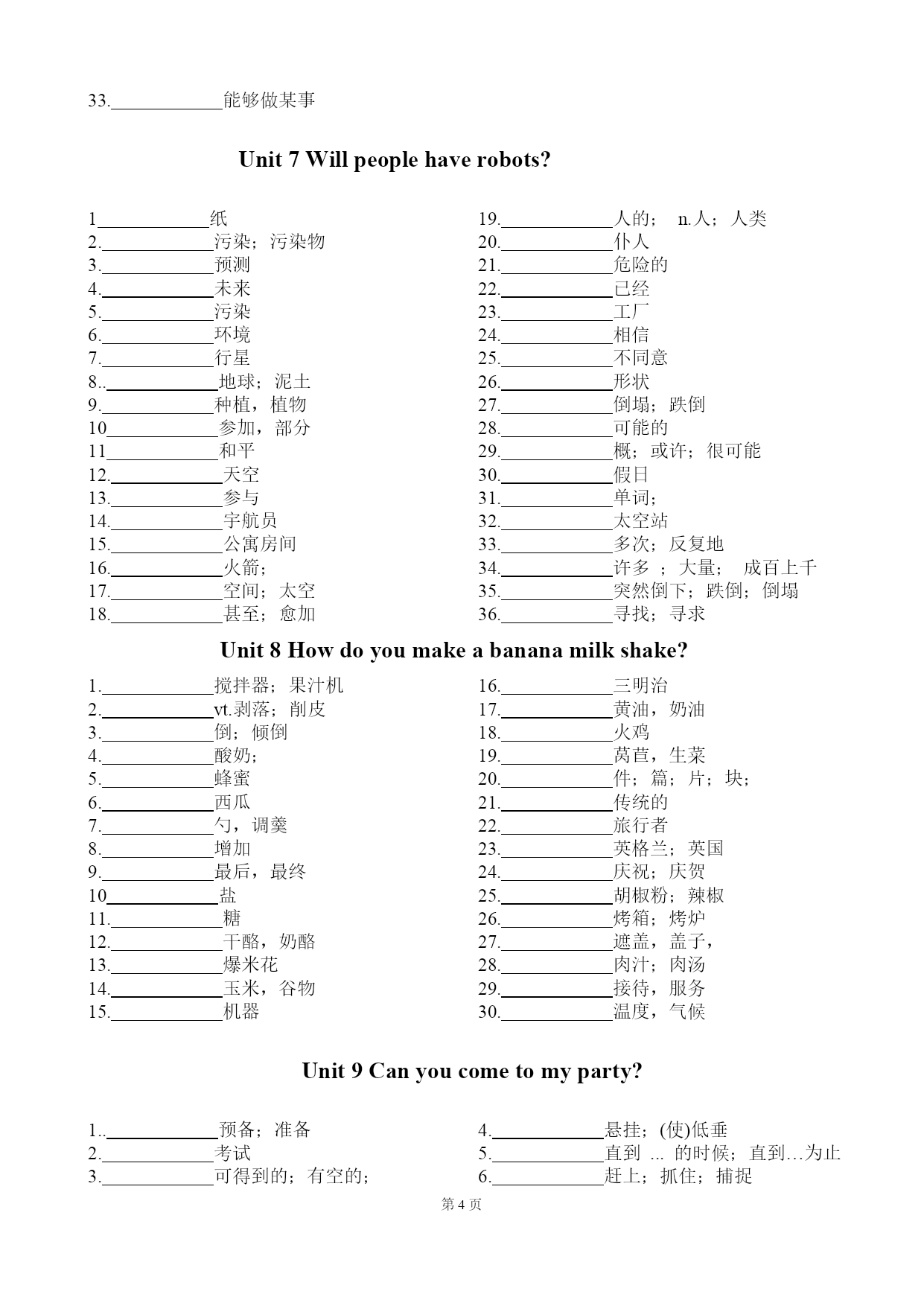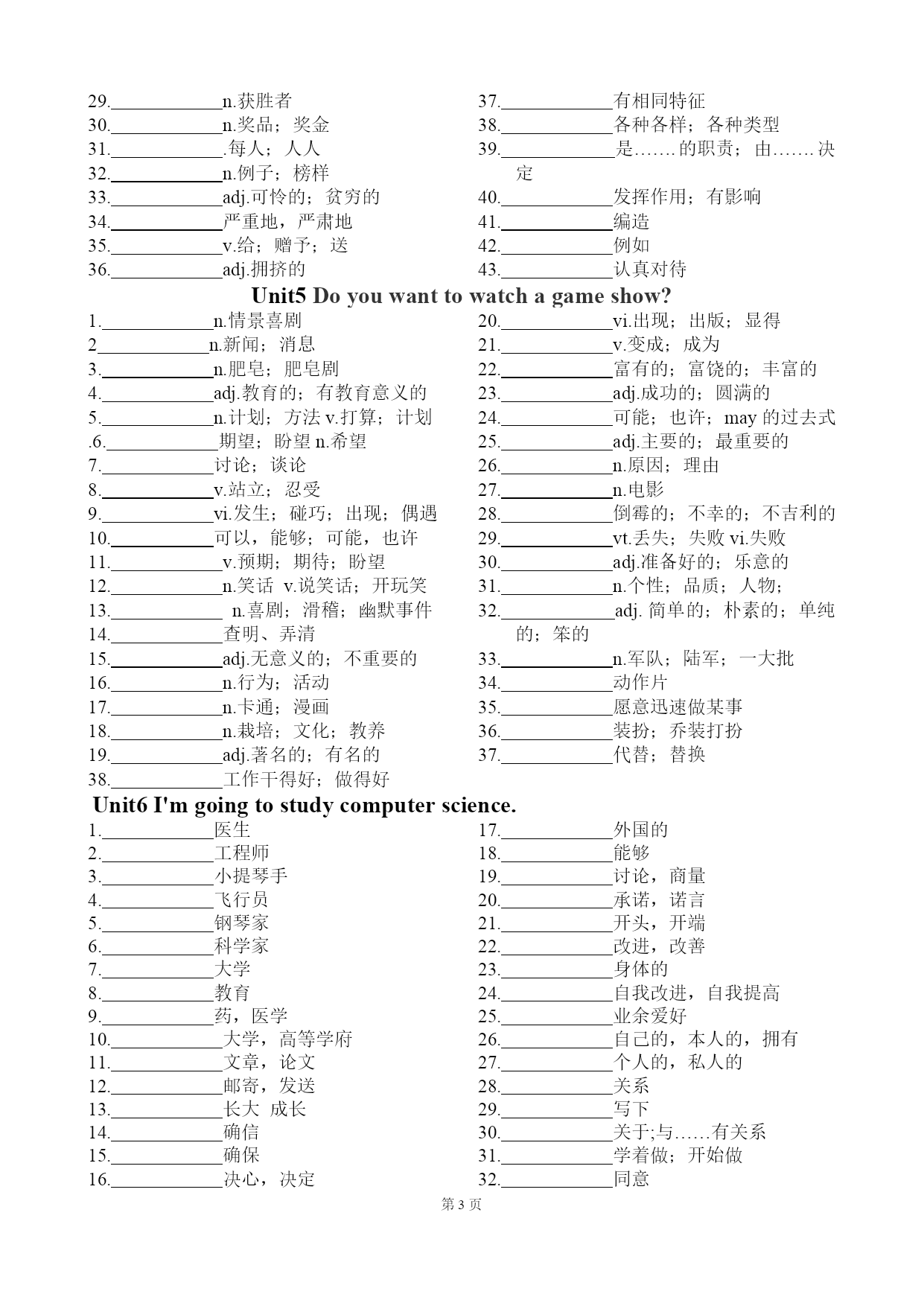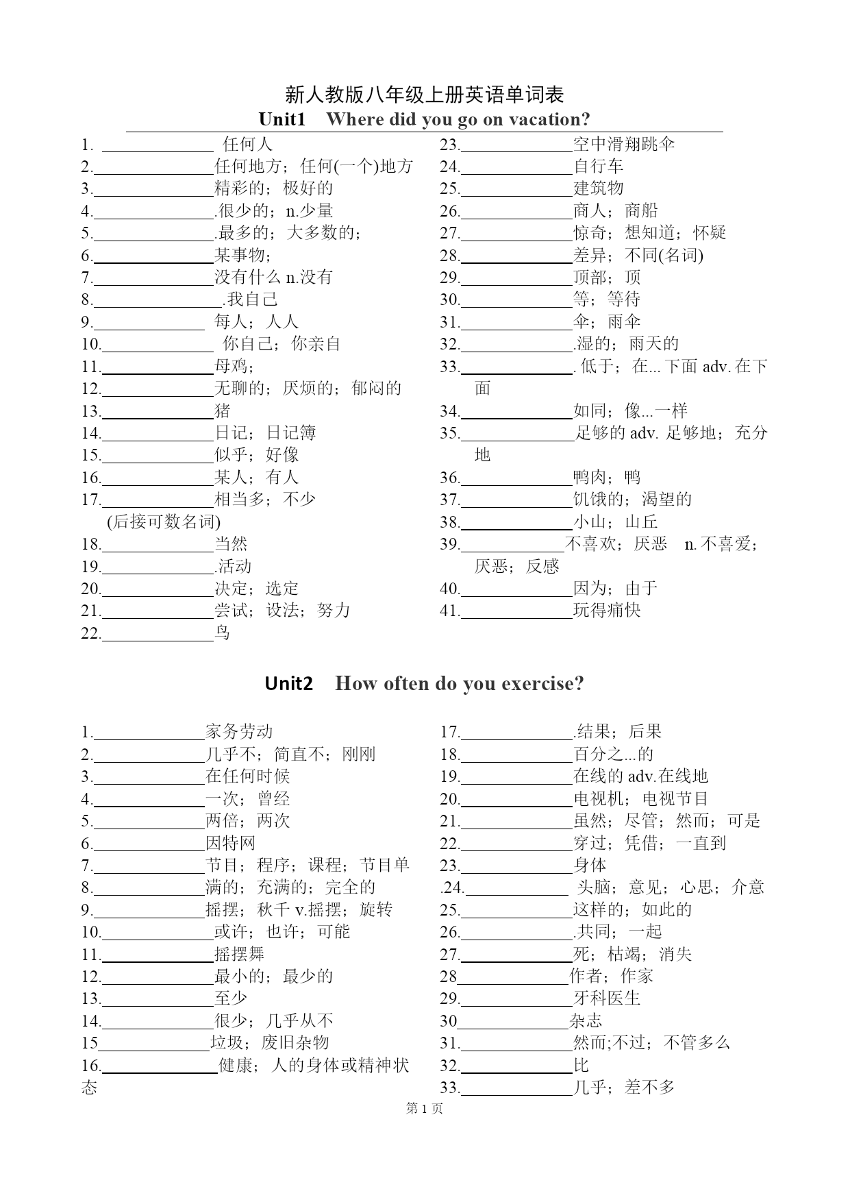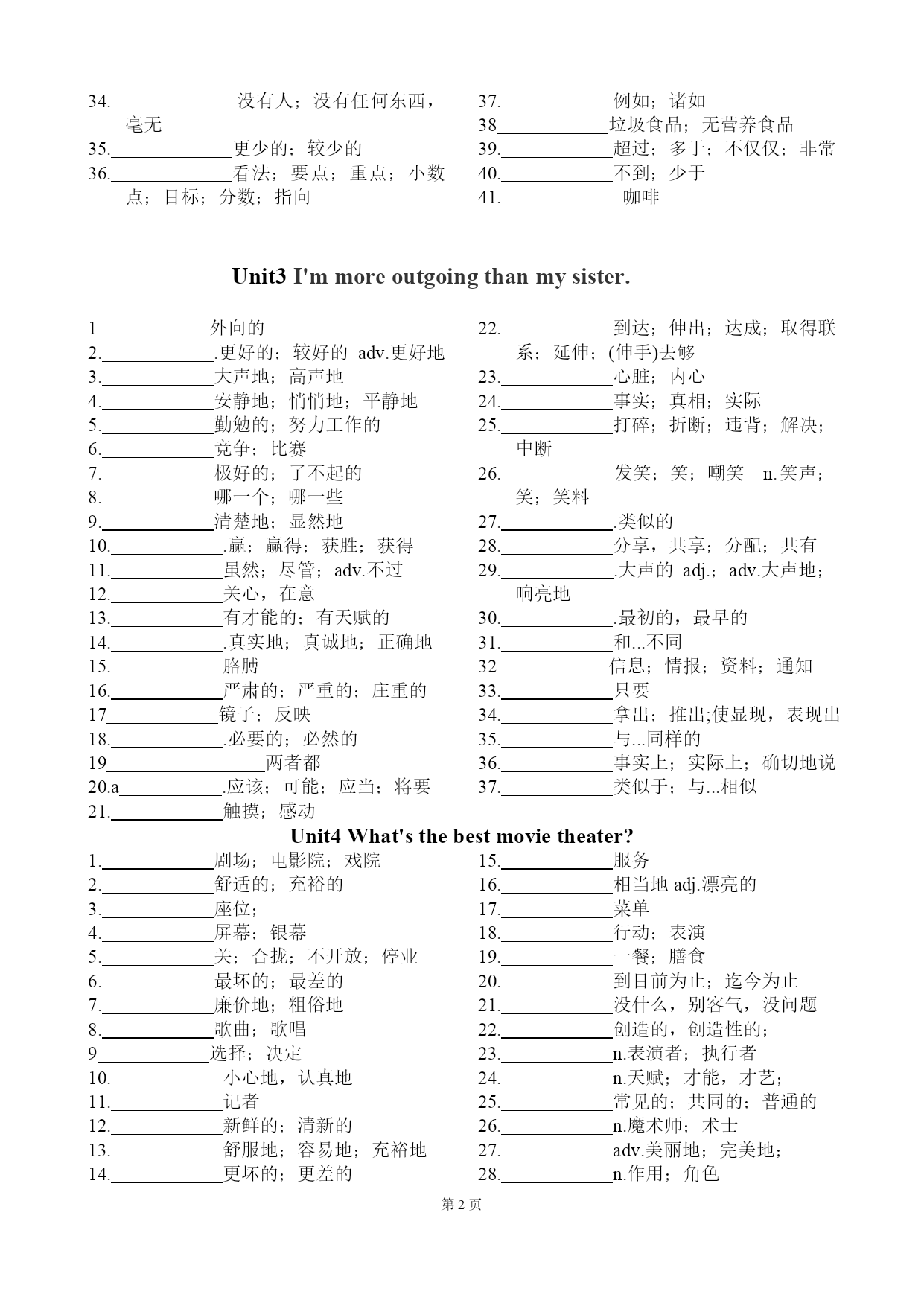 第PAGE\*MERGEFORMAT5页 新人教版八年级上册英语单词表 Unit1Wheredidyougoonvacation? 1.任何人 2.任何地方;任何(一个)地方 3.精彩的;极好的 4..很少的;n.少量 5..最多的;大多数的; 6.某事物; 7.没有什么n.没有 8..我自己 9.每人;人人 10.你自己;你亲自 11.母鸡; 12.无聊的;厌烦的;郁闷的 13.猪 14.日记;日记簿 15.似乎;好像 16.某人;有人 17.相当多;不少 (后接可数名词) 18.当然 19..活动 20.决定;选定 21.尝试;设法;努力 22.鸟 23.空中滑翔跳伞 24.自行车 25.建筑物 26.商人;商船 27.惊奇;想知道;怀疑 28.差异;不同(名词) 29.顶部;顶 30.等;等待 31.伞;雨伞 32..湿的;雨天的 33..低于;在...下面adv.在下面 34.如同;像...一样 35.足够的adv.足够地;充分地 36.鸭肉;鸭 37.饥饿的;渴望的 38.小山;山丘 39.不喜欢;厌恶n.不喜爱;厌恶;反感 40.因为;由于 41.玩得痛快 Unit2Howoftendoyouexercise? 1.家务劳动 2.几乎不;简直不;刚刚 3.在任何时候 4.一次;曾经 5.两倍;两次 6.因特网 7.节目;程序;课程;节目单 8.满的;充满的;完全的 9.摇摆;秋千v.摇摆;旋转 10.或许;也许;可能 11.摇摆舞 12.最小的;最少的 13.至少 14.很少;几乎从不 15垃圾;废旧杂物 16.健康;人的身体或精神状态 17..结果;后果 18.百分之...的 19.在线的adv.在线地 20.电视机;电视节目 21.虽然;尽管;然而;可是 22.穿过;凭借;一直到 23.身体 .24.头脑;意见;心思;介意 25.这样的;如此的 26..共同;一起 27.死;枯竭;消失 28作者;作家 29.牙科医生 30杂志 31.然而;不过;不管多么 32.比 33.几乎;差不多 34.没有人;没有任何东西,毫无 35.更少的;较少的 36.看法;要点;重点;小数点;目标;分数;指向 37.例如;诸如 38垃圾食品;无营养食品 39.超过;多于;不仅仅;非常 40.不到;少于 41.咖啡 Unit3I'mmoreoutgoingthanmysister. 1外向的 2..更好的;较好的adv.更好地 3.大声地;高声地 4.安静地;悄悄地;平静地 5.勤勉的;努力工作的 6.竞争;比赛 7.极好的;了不起的 8.哪一个;哪一些 9.清楚地;显然地 10..赢;赢得;获胜;获得 11.虽然;尽管;adv.不过 12.关心,在意 13.有才能的;有天赋的 14..真实地;真诚地;正确地 15.胳膊 16.严肃的;严重的;庄重的 17镜子;反映 18..必要的;必然的 19两者都 20.a.应该;可能;应当;将要 21.触摸;感动 22.到达;伸出;达成;取得联系;延伸;(伸手)去够 23.心脏;内心 24.事实;真相;实际 25.打碎;折断;违背;解决;中断 26.发笑;笑;嘲笑n.笑声;笑;笑料 27..类似的 28.分享,共享;分配;共有 29..大声的adj.;adv.大声地;响亮地 30..最初的,最早的 31.和...不同 32信息;情报;资料;通知 33.只要 34.拿出;推出;使显现,表现出 35.与...同样的 36.事实上;实际上;确切地说 37.类似于;与...相似 Unit4What'sthebestmovietheater? 1.剧场;电影院;戏院 2.舒适的;充裕的 3.座位; 4.屏幕;银幕 5.关;合拢;不开放;停业 6.最坏的;最差的 7.廉价地;粗俗地 8.歌曲;歌唱 9选择;决定 10.小心地,认真地 11.记者 12.新鲜的;清新的 13.舒服地;容易地;充裕地 14.更坏的;更差的 15.服务 16.相当地adj.漂亮的 17.菜单 18.行动;表演 19.一餐;膳食 20.到目前为止;迄今为止 21.没什么,别客气,没问题 22.创造的,创造性的; 23.n.表演者;执行者 24.n.天赋;才能,才艺; 25.常见的;共同的;普通的 26.n.魔术师;术士 27.adv.美丽地;完美地; 28.n.作用;角色 29.n.获胜者 30.n.奖品;奖金 31..每人;人人 32.n.例子;榜样 33.adj.可怜的;贫穷的 34.严重地,严肃地 35.v.给;赠予;送 36.adj.拥挤的 37.有相同特征 38.各种各样;各种类型 39.是…….的职责;由…….决定 40.发挥作用;有影响 41.编造 42.例如 43.认真对待 Unit5Do