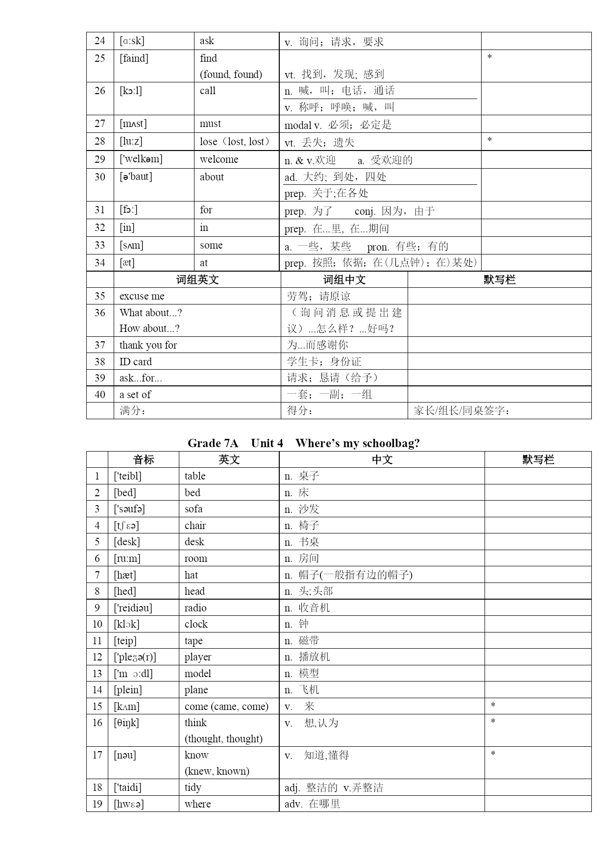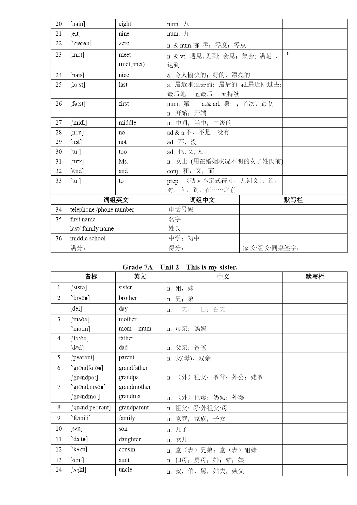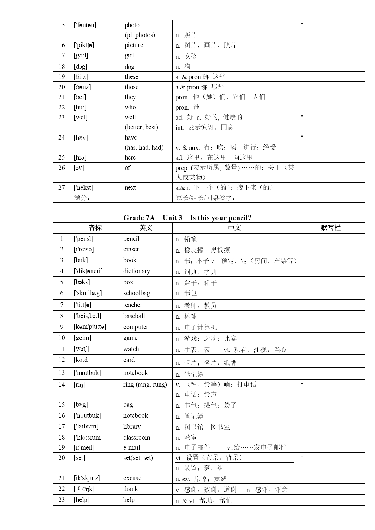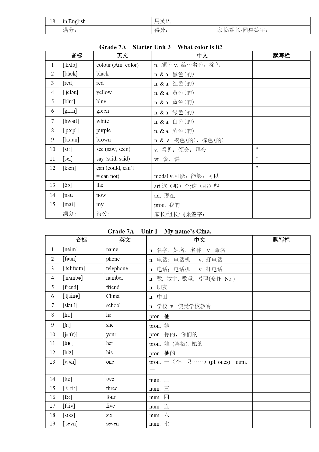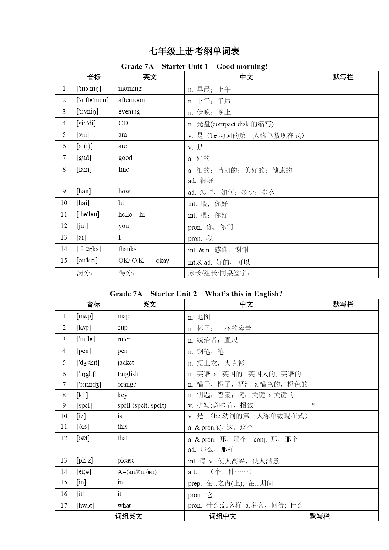 七年级上册考纲单词表 Grade7AStarterUnit1Goodmorning! 音标英文中文默写栏1['mɔ:niŋ]morningn.早晨;上午2['ɑ:ftə'nu:n]afternoonn.下午;午后3['i:vniŋ]eveningn.傍晚;晚上4[si:'di]CDn.光盘(compactdisk的缩写)5[æm]amv.是(be动词的第一人称单数现在式)6[a:(r)]arev.是7[gud]gooda.好的8[fain]finea.细的;晴朗的;美好的;健康的 ad.很好9[hau]howad.怎样,如何;多少;多么10[hai]hiint.喂;你好11[hə'ləu]hello=hiint.喂;你好12[ju:]youpron.你,你们13[ai]Ipron.我14[θæŋks]thanksint.&n.感谢,谢谢15[əu'kei]OK/O.K=okayint.&ad.好的,可以满分:得分:家长/组长/同桌签字: Grade7AStarterUnit2What’sthisinEnglish? 音标英文中文默写栏1[mæp]mapn.地图2[kʌp]cupn.杯子;一杯的容量3['ru:lə]rulern.统治者;直尺4[pen]penn.钢笔,笔5['dʒækit]jacketn.短上衣,夹克衫6['iŋgliʃ]Englishn.英语a.英国的;英国人的;英语的7['ɔ:rindʒ]orangen.橘子,橙子,橘汁a.橘色的,橙色的8[ki:]keyn.钥匙;答案;键;关键a.关键的9[spel]spell(spelt,spelt)v.拼写;意味着,招致*10[iz]isv.是(be动词的第三人称单数现在式)11[ðis]thisa.&pron.这,这个12[ðæt]thata.&pron.那,那个conj.那,那个 ad.那么,那样13[pli:z]pleaseint请v.使人高兴,使人满意14[ei;ə]A=(an/æn;/ən)art.一(个、件……)15[in]inprep.在...之内(上),在...期间16[it]itpron.它17[hwɔt]whatpron.什么;怎么样a.多么,何等;什么词组英文词组中文默写栏18inEnglish用英语满分:得分:家长/组长/同桌签字: Grade7AStarterUnit3Whatcolorisit? 音标英文中文默写栏1['kʌlə]colour(Am.color)n.颜色v.给…着色,涂色2[blæk]blackn.&a.黑色(的)3[red]redn.&a.红色(的)4['jeləu]yellown.&a.黄色(的)5[blu:]bluen.&a.蓝色(的)6[gri:n]greenn.&a.绿色(的)7[hwait]whiten.&a.白色(的)8['pə:pl]purplen.&a.紫色(的)9[braun]brownn.&a.褐色(的),棕色(的)10[si:]see(saw,seen)v.看见;领会;拜会*11[sei]say(said,said)vt.说,讲*12[kæn]can(could,can’t =cannot)modalv.可能;能够;可以*13[ðə]theart.这(那)个;这(那)些14[nau]nowad.现在15[mai]mypron.我的满分:得分:家长/组长/同桌签字: Grade7AUnit1Myname’sGina. 音标英文中文默写栏1[neim]namen.名字,姓名,名称v.命名2[fəun]phonen.电话;电话机v.打电话3['telifəun]telephonen.电话;电话机v.打电话4['nʌmbə]numbern.数,数字,数量;号码(略作No.)5[frend]friendn.朋友6['tʃainə]Chinan.中国7[sku:l]schooln.学校v.使受学校教育8[hi:]hepron.他9[ʃi:]shepron.她10[jɔ:(r)]yourpron.你的,你们的11[hə:]herpron.她(宾格),她的12[hiz]hispron.他的13[wʌn]onepron.一(个,只……)(pl.ones)num.一14[tu:]twonum.二15[θri:]threenum.三16[fɔ:]fournum.四17[faiv]fivenum.五18[siks]sixnum.六19['sevn]sevennum.七20[nain]eightnum.八21[eit]ninenum.九22['ziərəu]zeron.&num.零;零度;零点23[mi:t]meet (met,met)n.&vt.遇见,见到;会见;集会;满足,达到*24[nais]nicea.令人愉快的