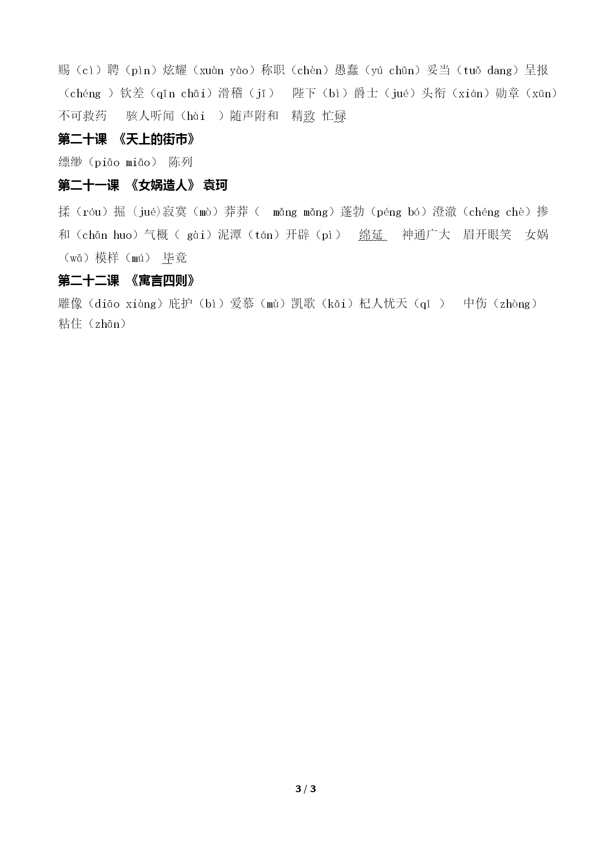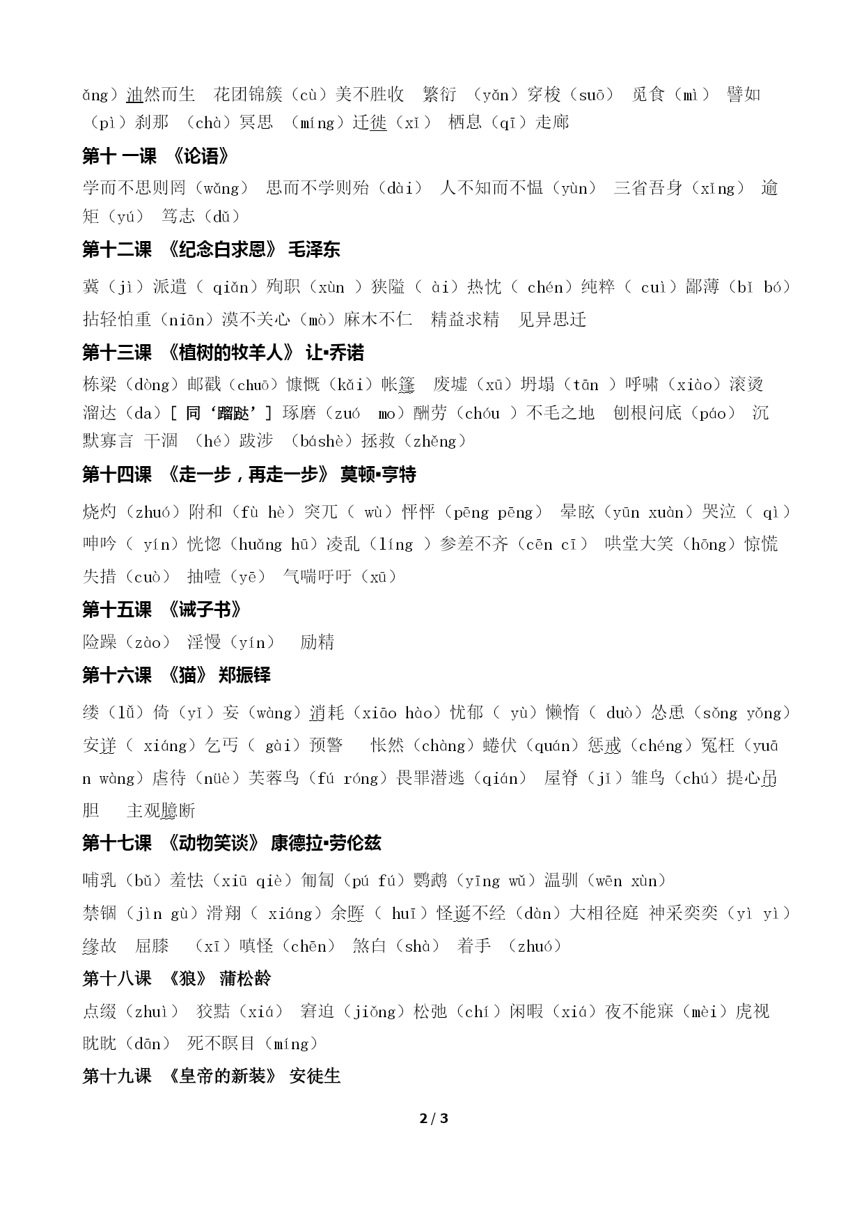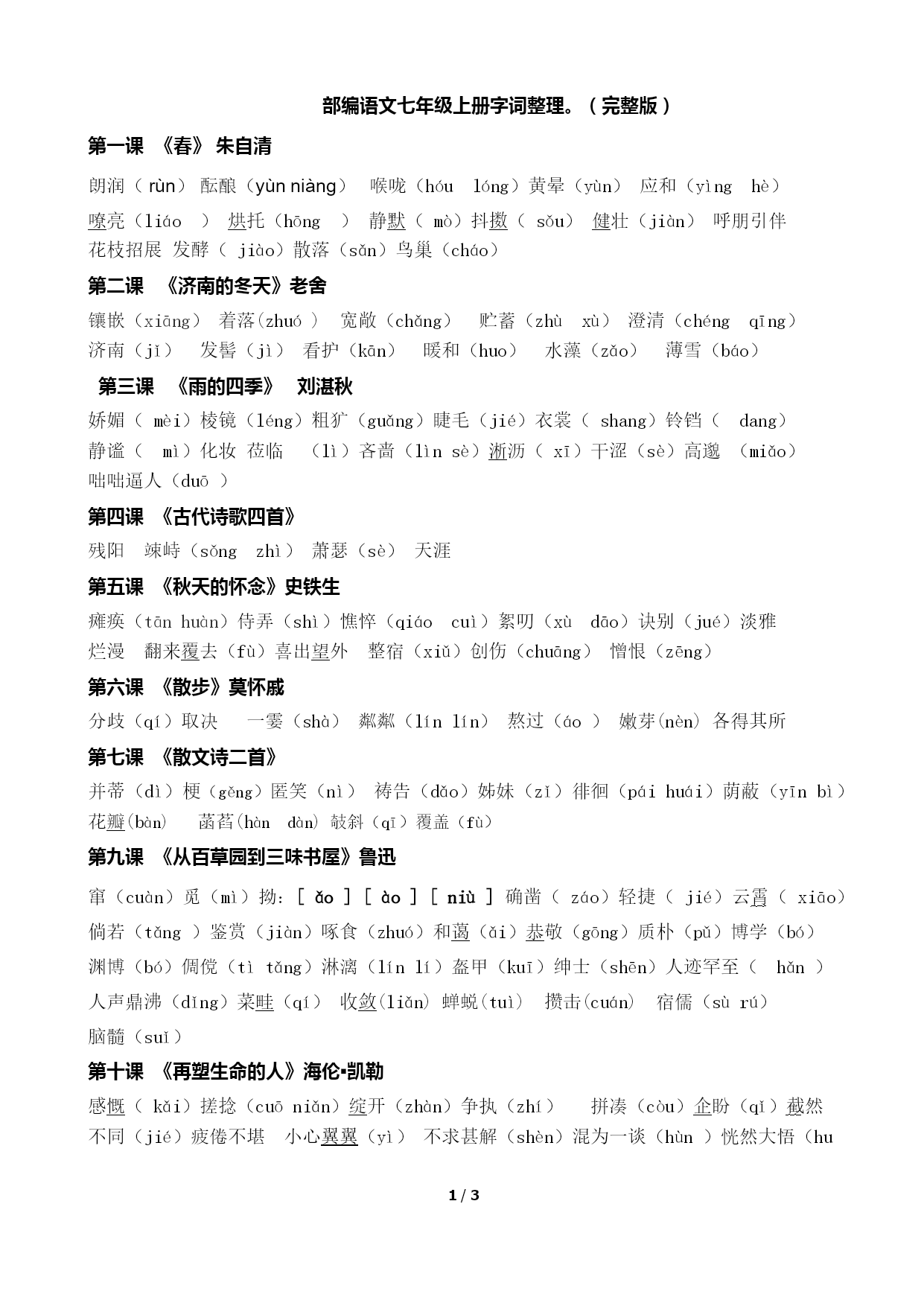 /NUMPAGES3 部编语文七年级上册字词整理。(完整版) 第一课《春》朱自清 朗润(rùn)酝酿(yùnniàng)喉咙(hóulóng)黄晕(yùn)应和(yìnghè) 嘹亮(liáo)烘托(hōng)静默(mò)抖擞(sǒu)健壮(jiàn)呼朋引伴 花枝招展发酵(jiào)散落(sǎn)鸟巢(cháo) 第二课《济南的冬天》老舍 镶嵌(xiāng)着落(zhuó)宽敞(chǎng)贮蓄(zhùxù)澄清(chéngqīng)济南(jǐ)发髻(jì)看护(kān)暖和(huo)水藻(zǎo)薄雪(báo) 第三课《雨的四季》刘湛秋 娇媚(mèi)棱镜(léng)粗犷(guǎng)睫毛(jié)衣裳(shang)铃铛(dang) 静谧(mì)化妆莅临(lì)吝啬(lìnsè)淅沥(xī)干涩(sè)高邈(miǎo) 咄咄逼人(duō) 第四课《古代诗歌四首》 残阳竦峙(sǒngzhì)萧瑟(sè)天涯 第五课《秋天的怀念》史铁生 瘫痪(tānhuàn)侍弄(shì)憔悴(qiáocuì)絮叨(xùdāo)诀别(jué)淡雅 烂漫翻来覆去(fù)喜出望外整宿(xiǔ)创伤(chuāng)憎恨(zēng) 第六课《散步》莫怀戚 分歧(qí)取决一霎(shà)粼粼(línlín)熬过(áo)嫩芽(nèn)各得其所 第七课《散文诗二首》 并蒂(dì)梗(gěng)匿笑(nì)祷告(dǎo)姊妹(zǐ)徘徊(páihuái)荫蔽(yīnbì) 花瓣(bàn)菡萏(hàndàn)攲斜(qī)覆盖(fù) 第九课《从百草园到三味书屋》鲁迅 窜(cuàn)觅(mì)拗:[ǎo][ào][niù]确凿(záo)轻捷(jié)云霄(xiāo)倘若(tǎng)鉴赏(jiàn)啄食(zhuó)和蔼(ǎi)恭敬(gōng)质朴(pǔ)博学(bó)渊博(bó)倜傥(tìtǎng)淋漓(línlí)盔甲(kuī)绅士(shēn)人迹罕至(hǎn)人声鼎沸(dǐng)菜畦(qí)收敛(liǎn)蝉蜕(tuì)攒击(cuán)宿儒(sùrú) 脑髓(suǐ) 第十课《再塑生命的人》海伦▪凯勒 感慨(kǎi)搓捻(cuōniǎn)绽开(zhàn)争执(zhí)拼凑(còu)企盼(qǐ)截然不同(jié)疲倦不堪小心翼翼(yì)不求甚解(shèn)混为一谈(hùn)恍然大悟(huǎng)油然而生花团锦簇(cù)美不胜收繁衍(yǎn)穿梭(suō)觅食(mì)譬如(pì)刹那(chà)冥思(míng)迁徙(xǐ)栖息(qī)走廊 第十一课《论语》 学而不思则罔(wǎng)思而不学则殆(dài)人不知而不愠(yùn)三省吾身(xǐng)逾矩(yú)笃志(dǔ) 第十二课《纪念白求恩》毛泽东 冀(jì)派遣(qiǎn)殉职(xùn)狭隘(ài)热忱(chén)纯粹(cuì)鄙薄(bǐbó)拈轻怕重(niān)漠不关心(mò)麻木不仁精益求精见异思迁 第十三课《植树的牧羊人》让▪乔诺 栋梁(dòng)邮戳(chuō)慷慨(kǎi)帐篷废墟(xū)坍塌(tān)呼啸(xiào)滚烫溜达(da)[同‘蹓跶’]琢磨(zuómo)酬劳(chóu)不毛之地刨根问底(páo)沉默寡言干涸(hé)跋涉(báshè)拯救(zhěng) 第十四课《走一步,再走一步》莫顿▪亨特 烧灼(zhuó)附和(fùhè)突兀(wù)怦怦(pēngpēng)晕眩(yūnxuàn)哭泣(qì)呻吟(yín)恍惚(huǎnghū)凌乱(líng)参差不齐(cēncī)哄堂大笑(hōng)惊慌失措(cuò)抽噎(yē)气喘吁吁(xū) 第十五课《诫子书》 险躁(zào)淫慢(yín)励精 第十六课《猫》郑振铎 缕(lǚ)倚(yǐ)妄(wàng)消耗(xiāohào)忧郁(yù)懒惰(duò)怂恿(sǒngyǒng)安详(xiáng)乞丐(gài)预警怅然(chàng)蜷伏(quán)惩戒(chéng)冤枉(yuānwàng)虐待(nüè)芙蓉鸟(fúróng)畏罪潜逃(qián)屋脊(jǐ)雏鸟(chú)提心吊胆主观臆断 第十七课《动物笑谈》康德拉▪劳伦兹 哺乳(bǔ)羞怯(xiūqiè)匍匐(púfú)鹦鹉(yīngwǔ)温驯(wēnxùn) 禁锢(jìngù)滑翔(xiáng)余晖(huī)怪诞不经(dàn)大相径庭神采奕奕(yìyì)缘故屈膝(xī)嗔怪(chēn)煞白(shà)着手(zhuó) 第十八课《狼》蒲松龄 点缀(zhuì)狡黠(xiá)窘迫(jiǒng)松弛(chí)闲暇(xiá)夜不能寐(mèi)虎视眈眈(dān)死不瞑目(míng) 第十九课《皇帝的新装》安徒生 赐(cì)聘(pìn)炫耀(xuànyào)称职(chèn)愚蠢(yúchǔn)妥当(tuǒdang)呈报(c