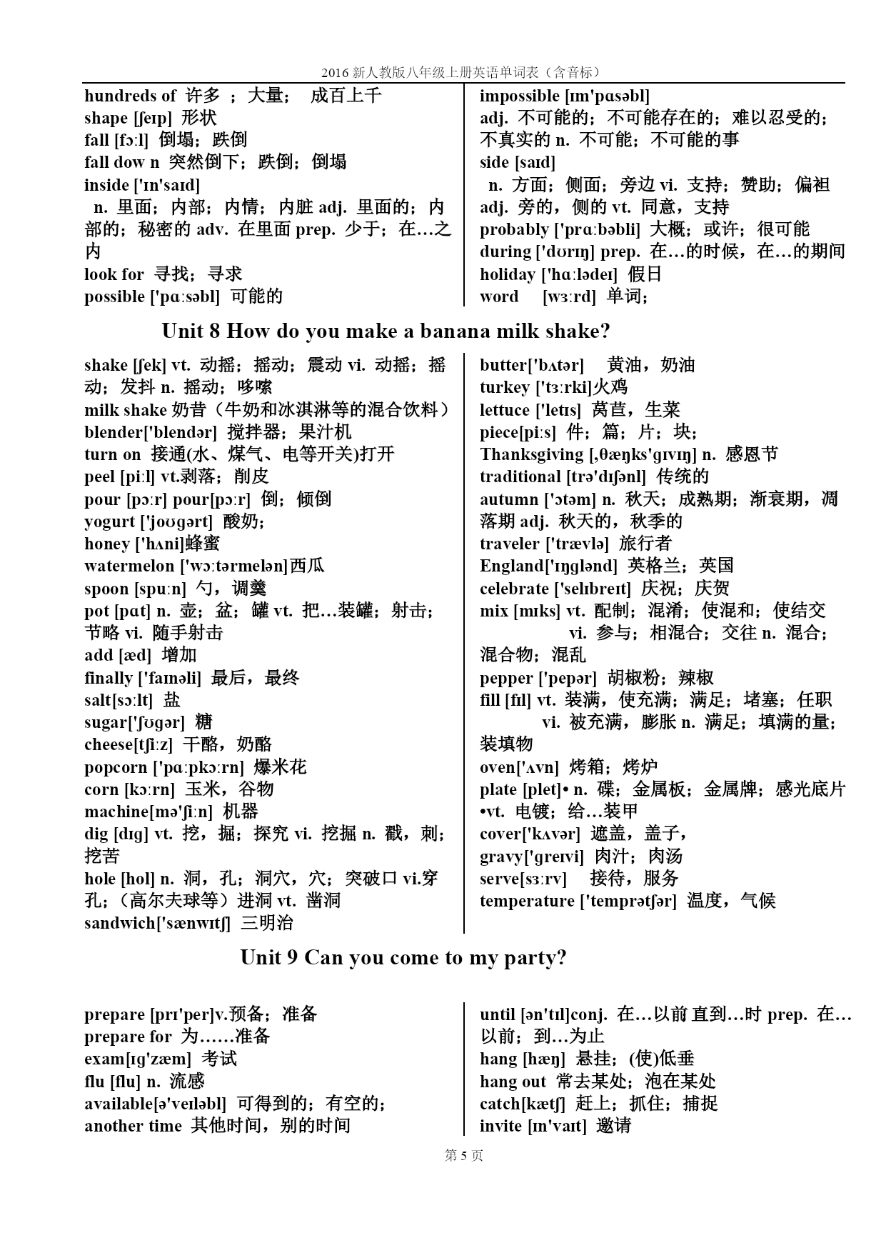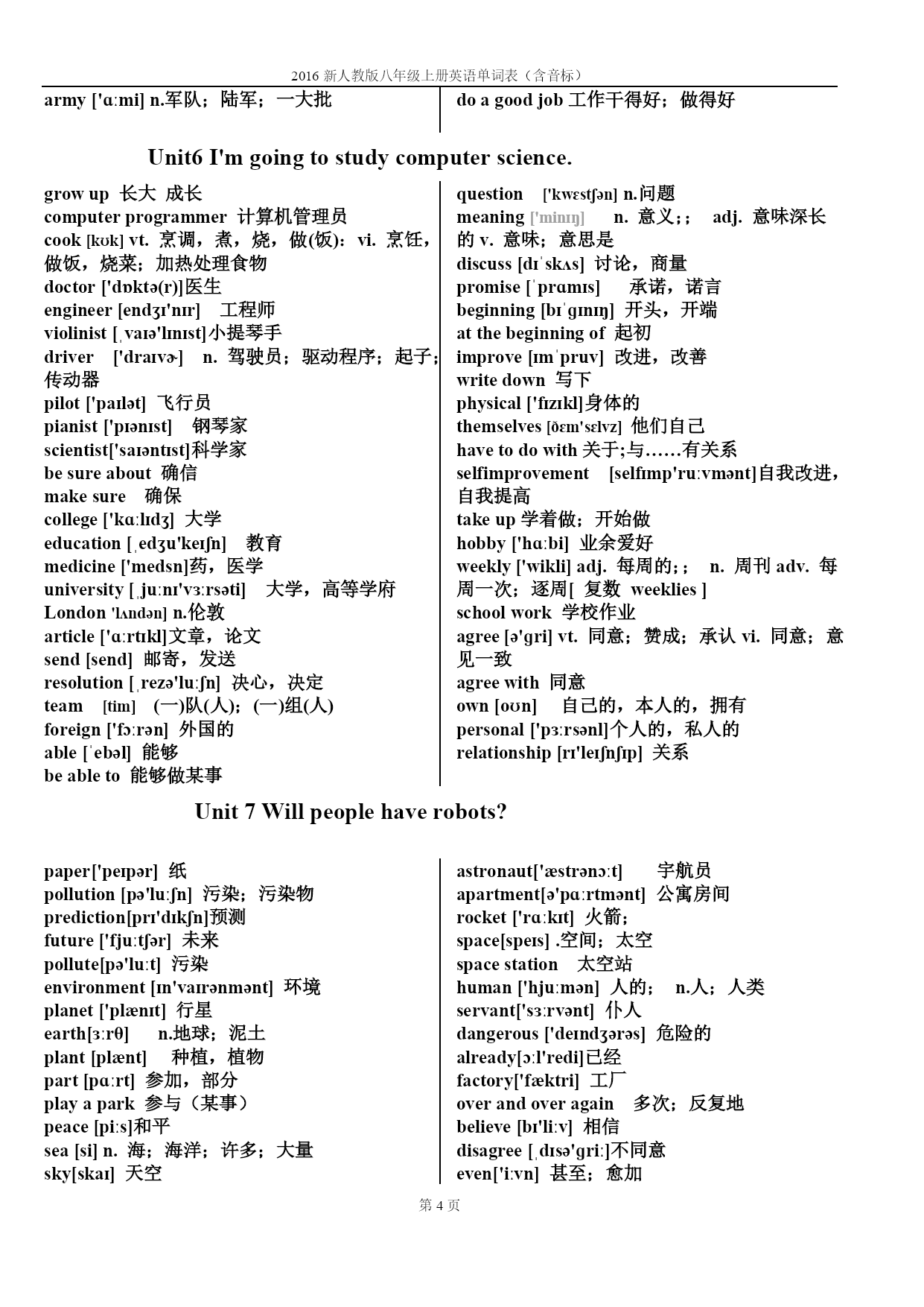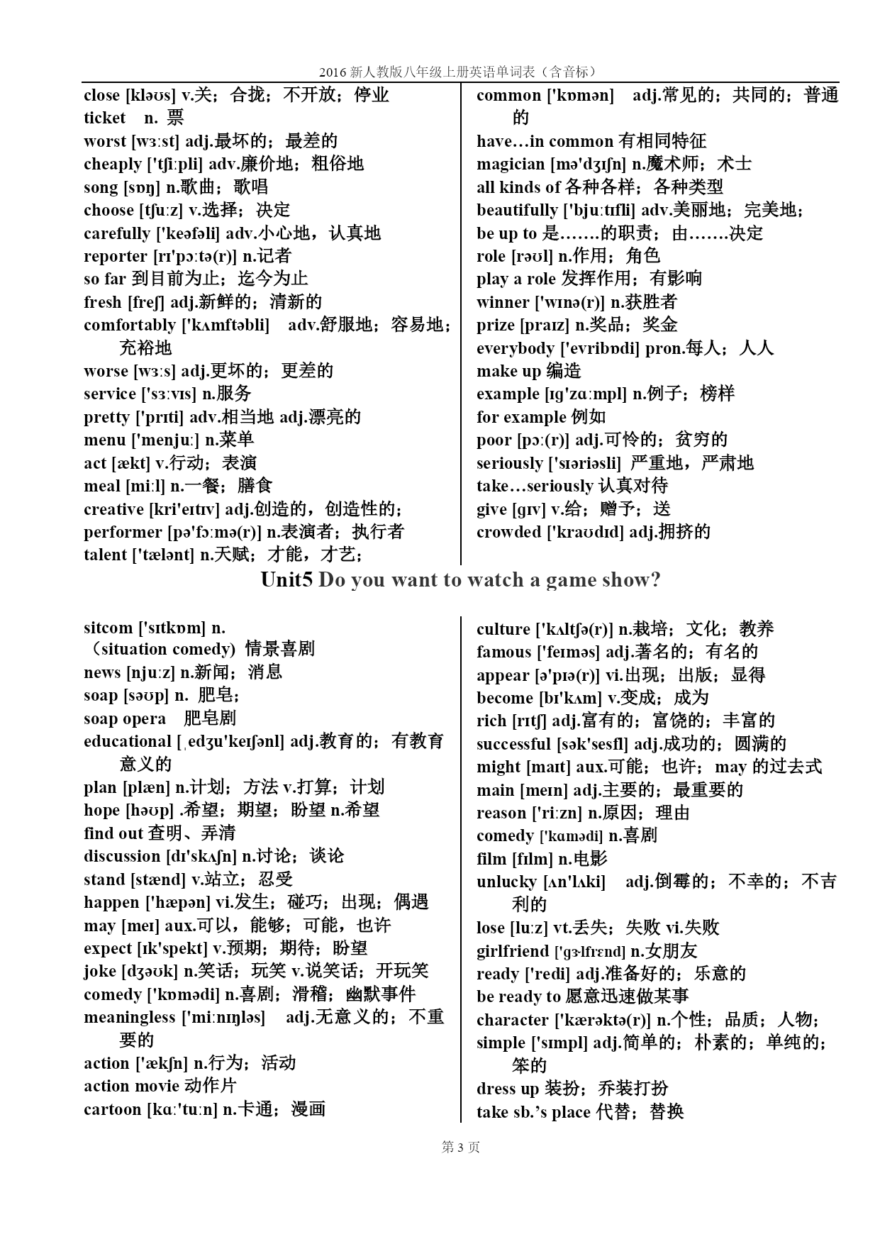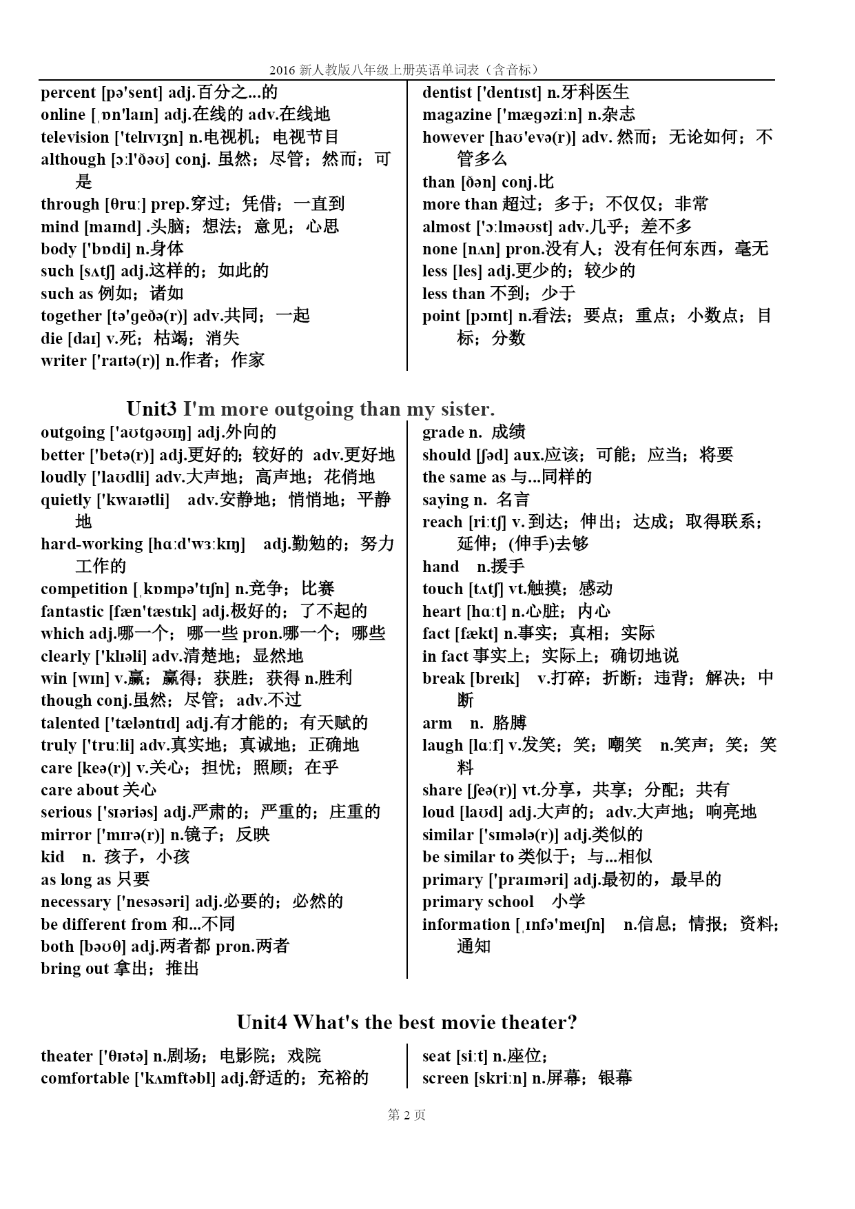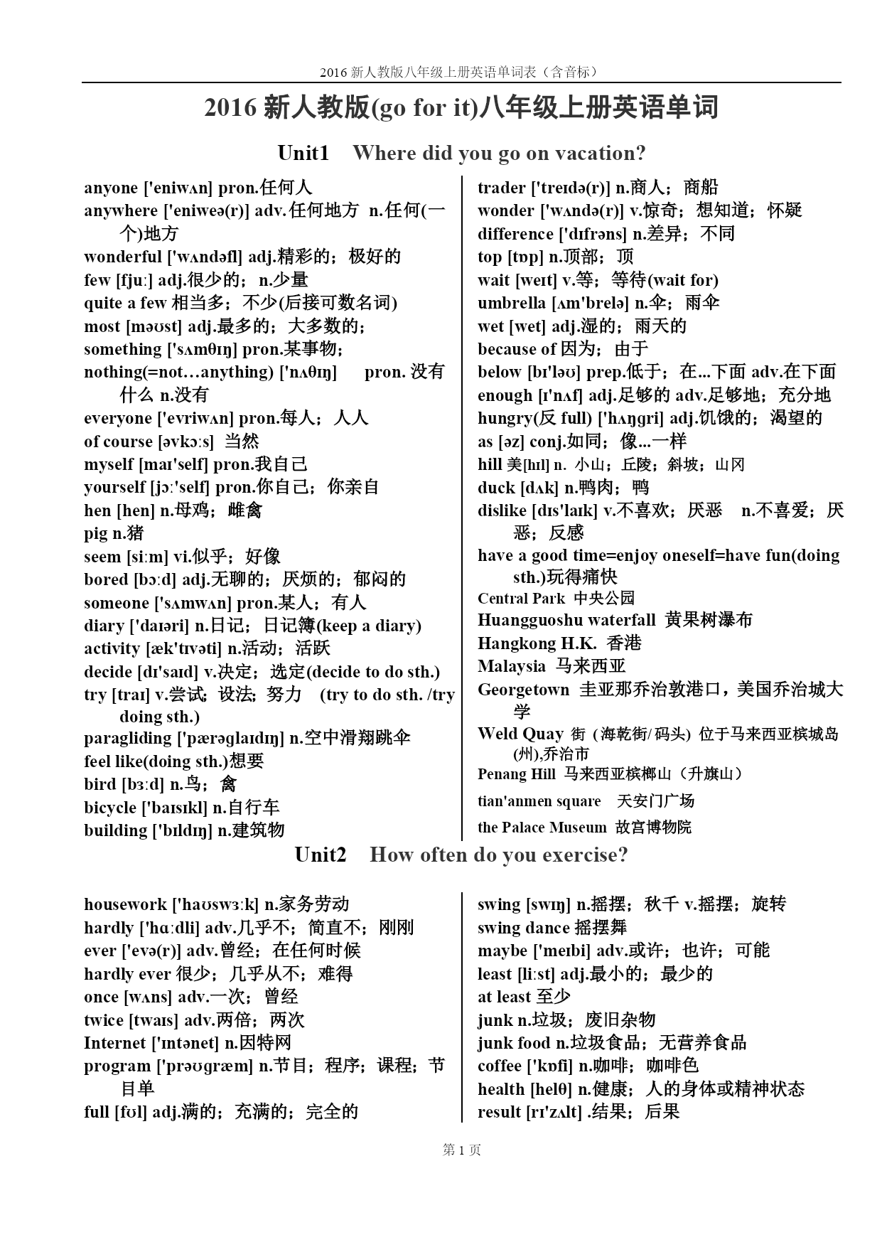 2016新人教版八年级上册英语单词表(含音标) 第PAGE\*MERGEFORMAT6页 2016新人教版(goforit)八年级上册英语单词 Unit1Wheredidyougoonvacation? anyone['eniwʌn]pron.任何人 anywhere['eniweə(r)]adv.任何地方n.任何(一个)地方 wonderful['wʌndəfl]adj.精彩的;极好的 few[fjuː]adj.很少的;n.少量 quiteafew相当多;不少(后接可数名词) most[məʊst]adj.最多的;大多数的; something['sʌmθɪŋ]pron.某事物; nothing(=not…anything)['nʌθɪŋ]pron.没有什么n.没有 everyone['evriwʌn]pron.每人;人人 ofcourse[əvkɔːs]当然 myself[maɪ'self]pron.我自己 yourself[jɔː'self]pron.你自己;你亲自 hen[hen]n.母鸡;雌禽 pign.猪 seem[siːm]vi.似乎;好像 bored[bɔːd]adj.无聊的;厌烦的;郁闷的 someone['sʌmwʌn]pron.某人;有人 diary['daɪəri]n.日记;日记簿(keepadiary) activity[æk'tɪvəti]n.活动;活跃 decide[dɪ'saɪd]v.决定;选定(decidetodosth.) try[traɪ]v.尝试;设法;努力(trytodosth./trydoingsth.) paragliding['pærəɡlaɪdɪŋ]n.空中滑翔跳伞 feellike(doingsth.)想要 bird[bɜːd]n.鸟;禽 bicycle['baɪsɪkl]n.自行车 building['bɪldɪŋ]n.建筑物 trader['treɪdə(r)]n.商人;商船 wonder['wʌndə(r)]v.惊奇;想知道;怀疑 difference['dɪfrəns]n.差异;不同 top[tɒp]n.顶部;顶 wait[weɪt]v.等;等待(waitfor) umbrella[ʌm'brelə]n.伞;雨伞 wet[wet]adj.湿的;雨天的 becauseof因为;由于 below[bɪ'ləʊ]prep.低于;在...下面adv.在下面 enough[ɪ'nʌf]adj.足够的adv.足够地;充分地 hungry(反full)['hʌŋɡri]adj.饥饿的;渴望的 as[əz]conj.如同;像...一样 hill美[hɪl]n.小山;丘陵;斜坡;山冈 duck[dʌk]n.鸭肉;鸭 dislike[dɪs'laɪk]v.不喜欢;厌恶n.不喜爱;厌恶;反感 haveagoodtime=enjoyoneself=havefun(doingsth.)玩得痛快 CentralPark中央公园 Huangguoshuwaterfall黄果树瀑布 HangkongH.K.香港 Malaysia马来西亚 Georgetown圭亚那乔治敦港口,美国乔治城大学 WeldQuay街(海乾街/码头)位于马来西亚槟城岛(州),乔治市 PenangHill马来西亚槟榔山(升旗山) tian'anmensquare天安门广场 thePalaceMuseum故宫博物院 Unit2Howoftendoyouexercise? housework['haʊswɜːk]n.家务劳动 hardly['hɑːdli]adv.几乎不;简直不;刚刚 ever['evə(r)]adv.曾经;在任何时候 hardlyever很少;几乎从不;难得 once[wʌns]adv.一次;曾经 twice[twaɪs]adv.两倍;两次 Internet['ɪntənet]n.因特网 program['prəʊɡræm]n.节目;程序;课程;节目单 full[fʊl]adj.满的;充满的;完全的 swing[swɪŋ]n.摇摆;秋千v.摇摆;旋转 swingdance摇摆舞 maybe['meɪbi]adv.或许;也许;可能 least[liːst]adj.最小的;最少的 atleast至少 junkn.垃圾;废旧杂物 junkfoodn.垃圾食品;无营养食品 coffee['kɒfi]n.咖啡;咖啡色 health[helθ]n.健康;人的身体或精神状态 result[rɪ'zʌlt].结果;后果 percent[pə'sent]adj.百分之...的 online[ˌɒn'laɪn]adj.在线的adv.在线地 television['telɪvɪʒn]n.电视机;电视节目 although[ɔ