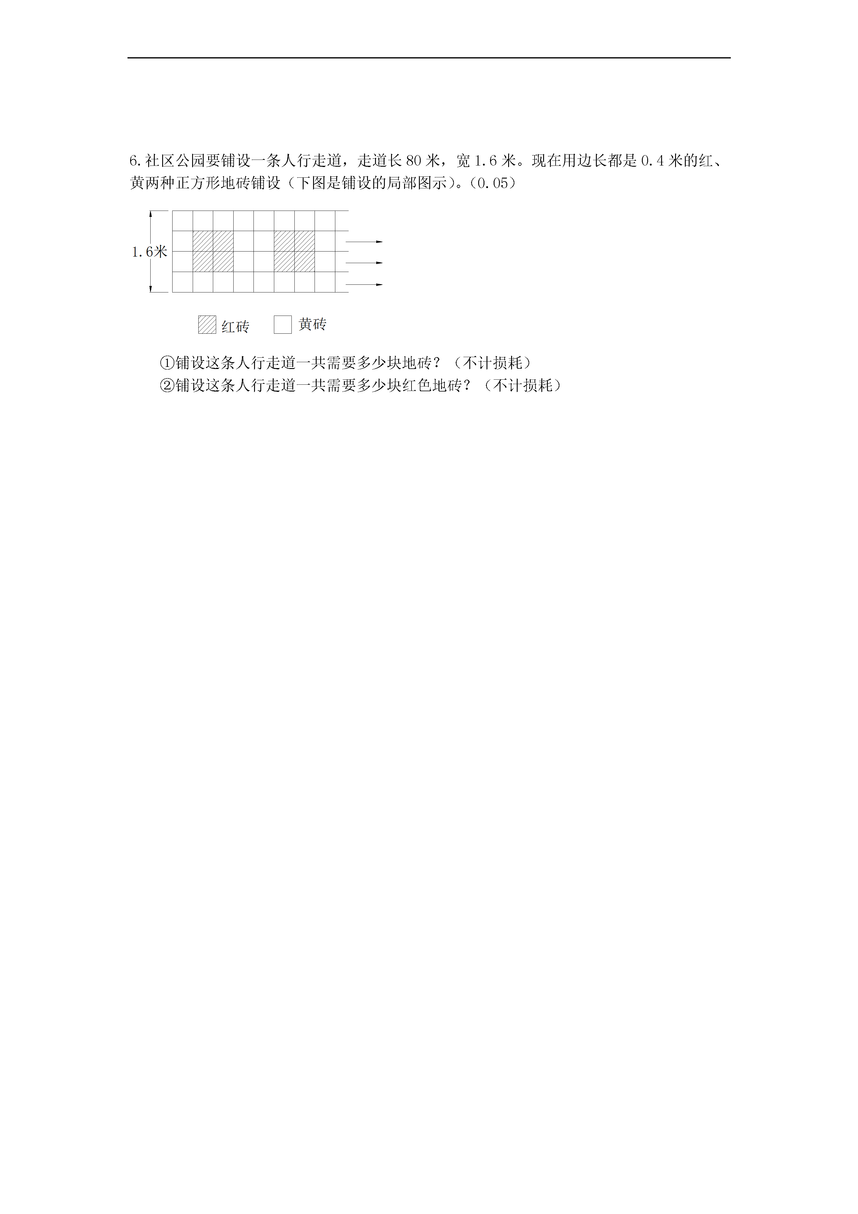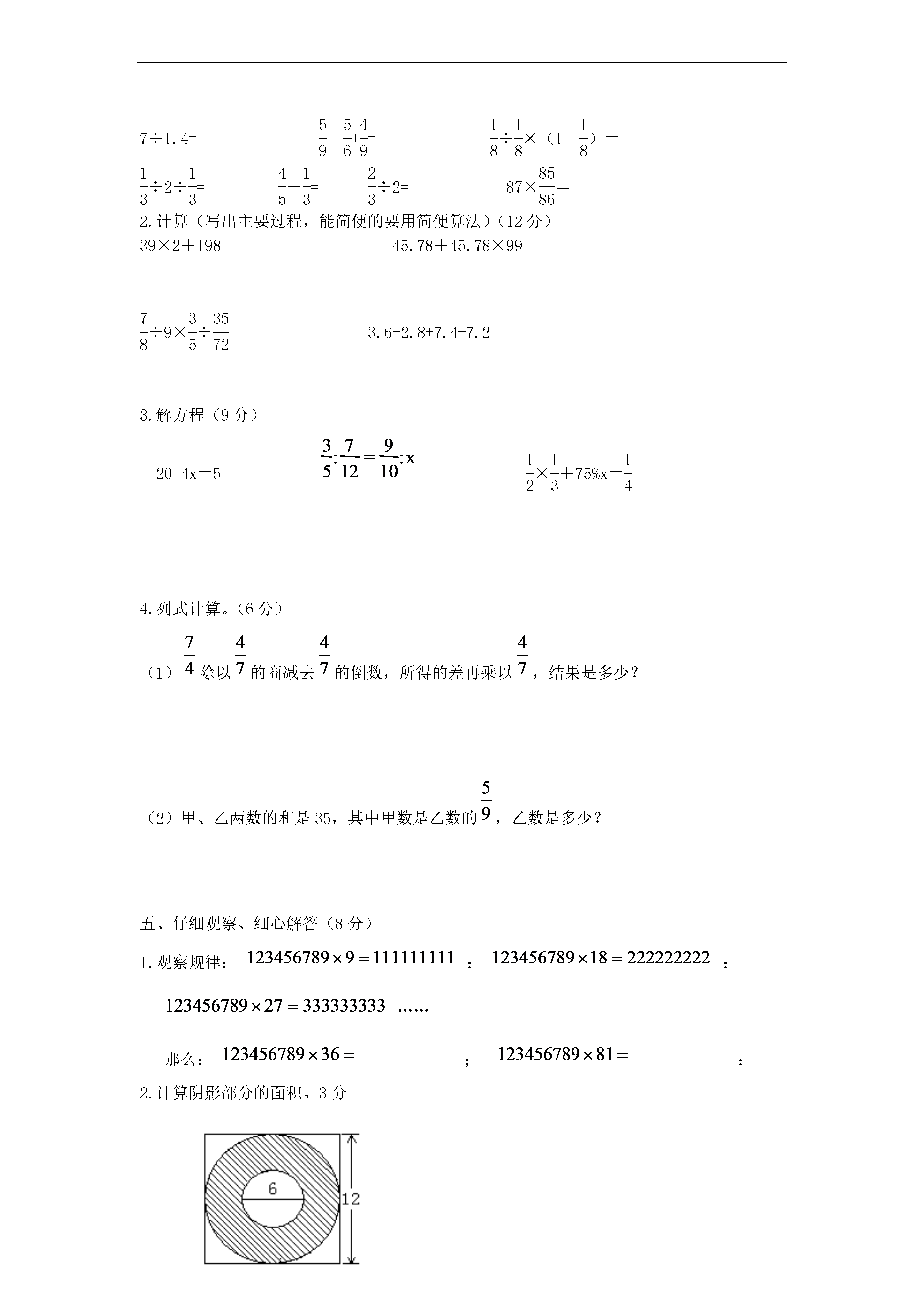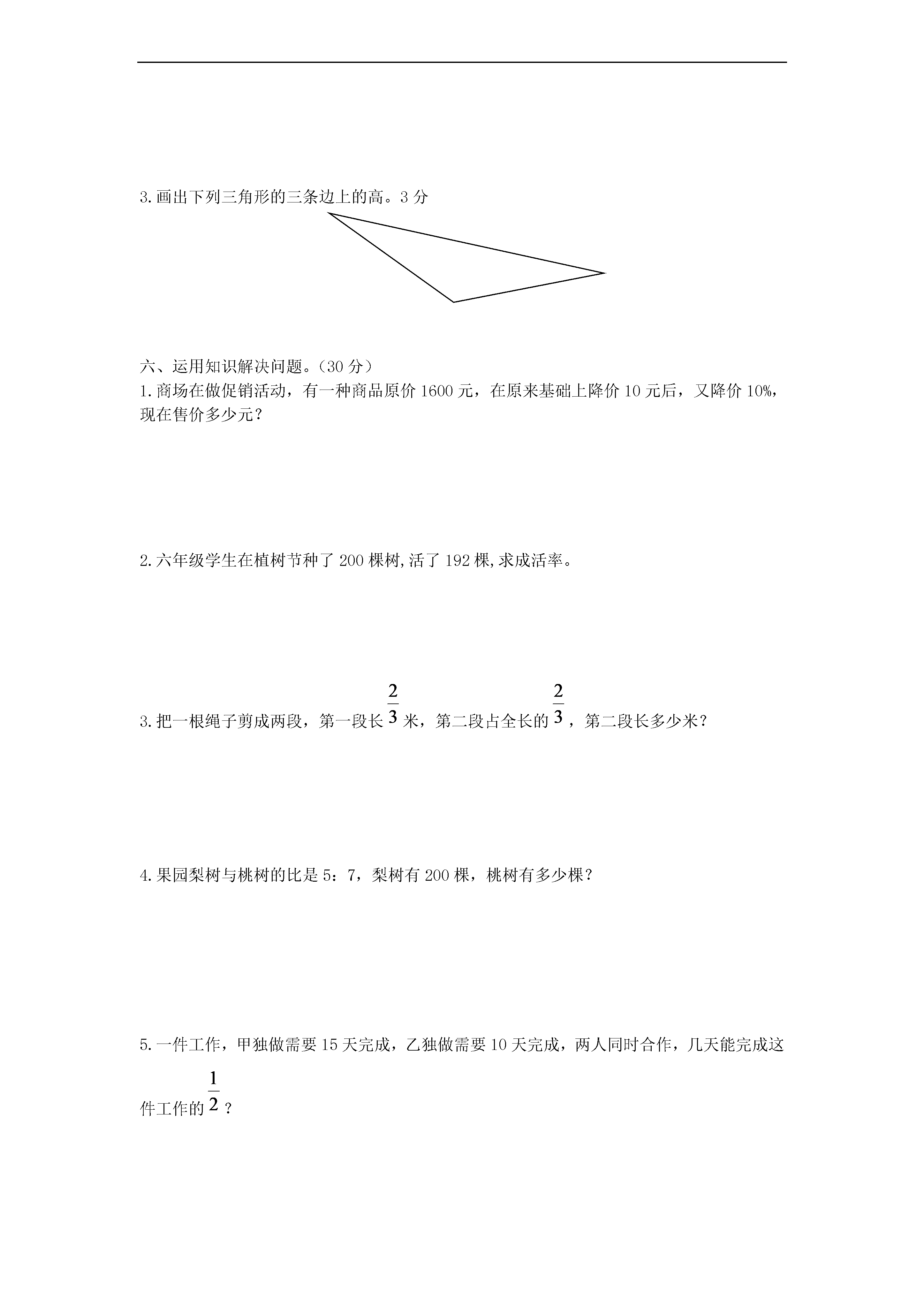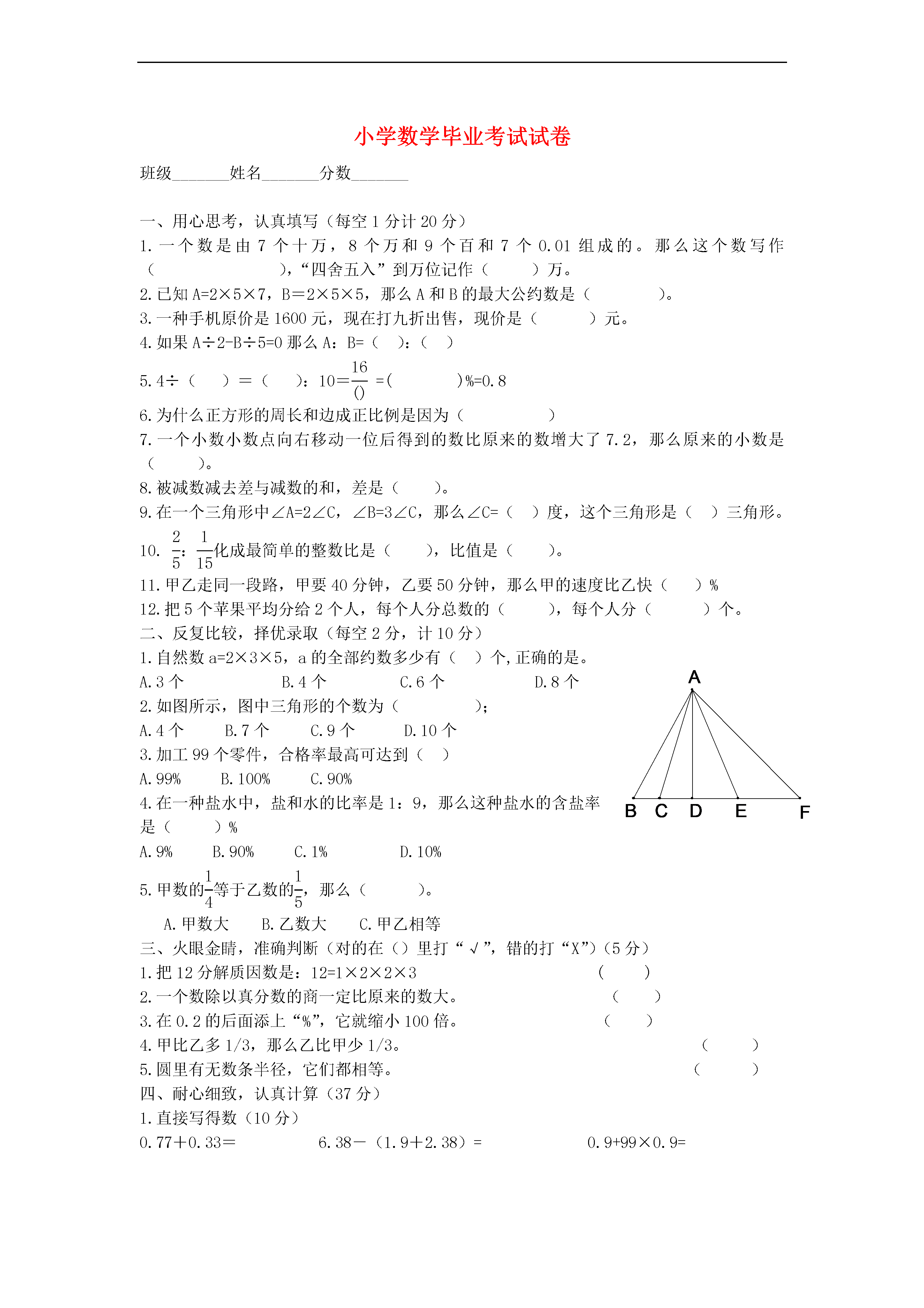 小学数学毕业考试试卷班级_______姓名_______分数_______一、用心思考,认真填写(每空1分计20分)1.一个数是由7个十万,8个万和9个百和7个0.01组成的。那么这个数写作(),“四舍五入”到万位记作()万。2.已知A=2×5×7,B=2×5×5,那么A和B的最大公约数是()。3.一种手机原价是1600元,现在打九折出售,现价是()元。4.如果A÷2-B÷5=0那么A:B=():()5.4÷()=():10=eq\f(16,())=()%=0.86.为什么正方形的周长和边成正比例是因为()7.一个小数小数点向右移动一位后得到的数比原来的数增大了7.2,那么原来的小数是()。8.被减数减去差与减数的和,差是()。9.在一个三角形中∠A=2∠C,∠B=3∠C,那么∠C=()度,这个三角形是()三角形。10.eq\f(2,5):eq\f(1,15)化成最简单的整数比是(),比值是()。11.甲乙走同一段路,甲要40分钟,乙要50分钟,那么甲的速度比乙快()%12.把5个苹果平均分给2个人,每个人分总数的(),每个人分()个。二、反复比较,择优录取(每空2分,计10分)1.自然数a=2×3×5,a的全部约数多少有()个,正确的是。A.3个B.4个C.6个D.8个2.如图所示,图中三角形的个数为();A.4个B.7个C.9个D.10个3.加工99个零件,合格率最高可达到()A.99%B.100%C.90%4.在一种盐水中,盐和水的比率是1:9,那么这种盐水的含盐率是()%A.9%B.90%C.1%D.10%5.甲数的EQ\F(1,4)等于乙数的EQ\F(1,5),那么()。A.甲数大B.乙数大C.甲乙相等三、火眼金睛,准确判断(对的在()里打“√”,错的打“X”)(5分)1.把12分解质因数是:12=1×2×2×3()2.一个数除以真分数的商一定比原来的数大。()3.在0.2的后面添上“%”,它就缩小100倍。()4.甲比乙多1/3,那么乙比甲少1/3。()5.圆里有无数条半径,它们都相等。()四、耐心细致,认真计算(37分)1.直接写得数(10分)0.77+0.33=6.38-(1.9+2.38)=0.9+99×0.9=7÷1.4=EQ\F(5,9)-EQ\F(5,6)+EQ\F(4,9)=EQ\F(1,8)÷EQ\F(1,8)×(1-EQ\F(1,8))=EQ\F(1,3)÷2÷EQ\F(1,3)=EQ\F(4,5)-EQ\F(1,3)=EQ\F(2,3)÷2=87×EQ\F(85,86)=2.计算(写出主要过程,能简便的要用简便算法)(12分)39×2+19845.78+45.78×99EQ\F(7,8)÷9×EQ\F(3,5)÷EQ\F(35,72)3.6-2.8+7.4-7.23.解方程(9分)20-4x=5EQ\F(1,2)×EQ\F(1,3)+75%x=EQ\F(1,4)4.列式计算。(6分)(1)除以的商减去的倒数,所得的差再乘以,结果是多少?(2)甲、乙两数的和是35,其中甲数是乙数的,乙数是多少?五、仔细观察、细心解答(8分)1.观察规律:;;……那么:;;2.计算阴影部分的面积。3分3.画出下列三角形的三条边上的高。3分六、运用知识解决问题。(30分)1.商场在做促销活动,有一种商品原价1600元,在原来基础上降价10元后,又降价10%,现在售价多少元?2.六年级学生在植树节种了200棵树,活了192棵,求成活率。3.把一根绳子剪成两段,第一段长米,第二段占全长的,第二段长多少米?4.果园梨树与桃树的比是5:7,梨树有200棵,桃树有多少棵?5.一件工作,甲独做需要15天完成,乙独做需要10天完成,两人同时合作,几天能完成这件工作的?6.社区公园要铺设一条人行走道,走道长80米,宽1.6米。现在用边长都是0.4米的红、黄两种正方形地砖铺设(下图是铺设的局部图示)。(0.05)①铺设这条人行走道一共需要多少块地砖?(不计损耗)②铺设这条人行走道一共需要多少块红色地砖?(不计损耗)