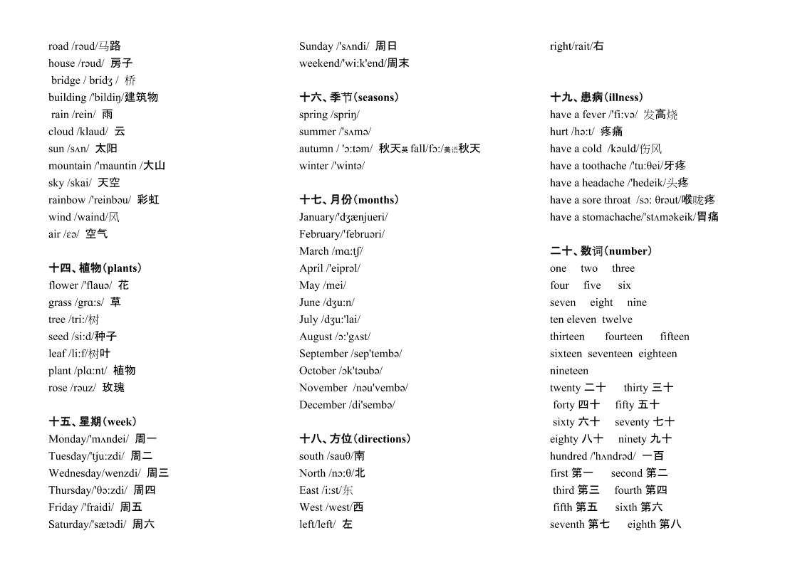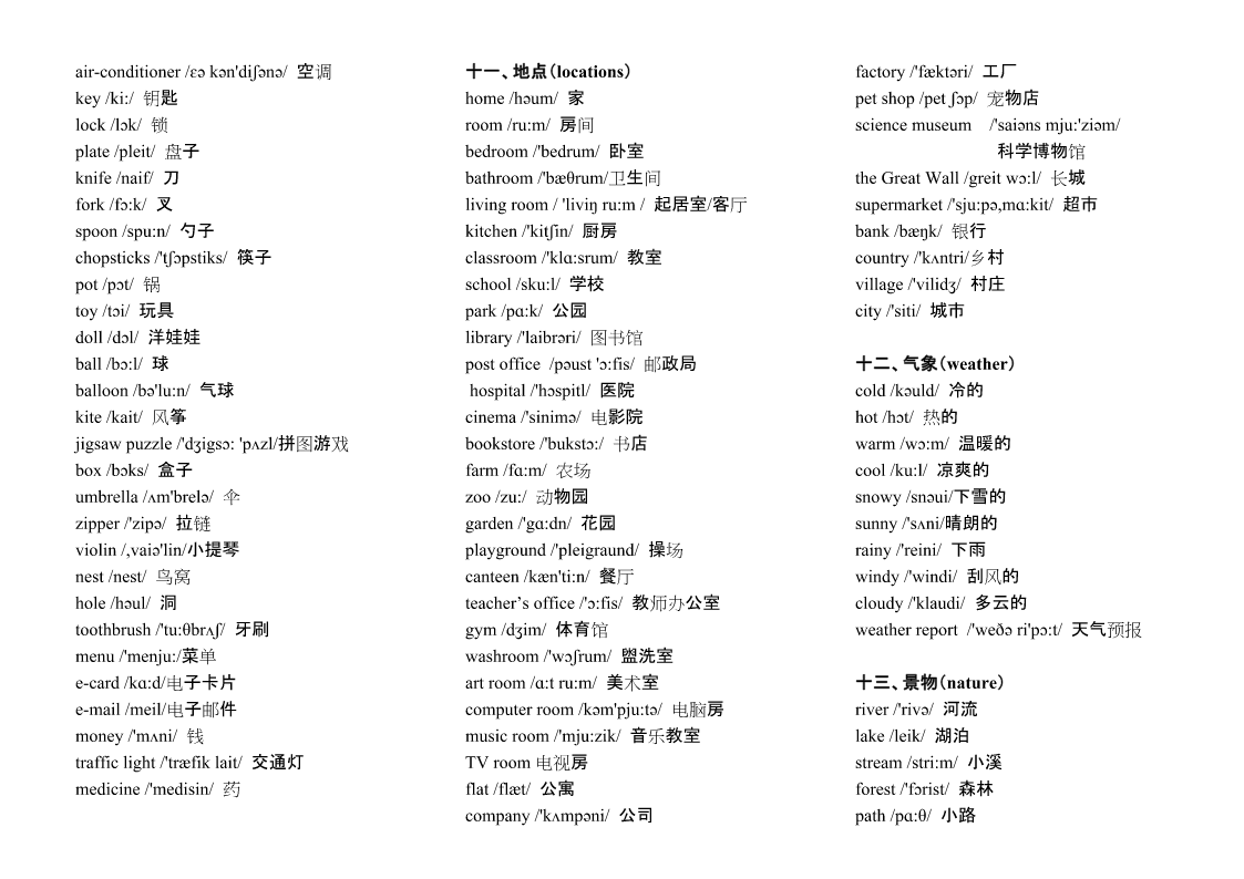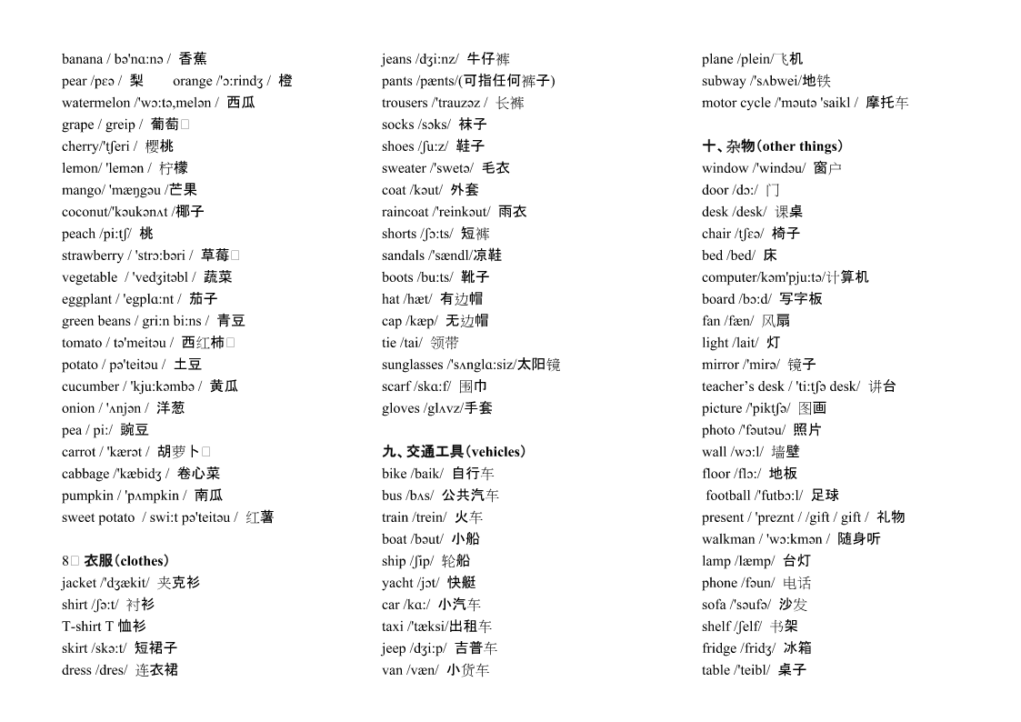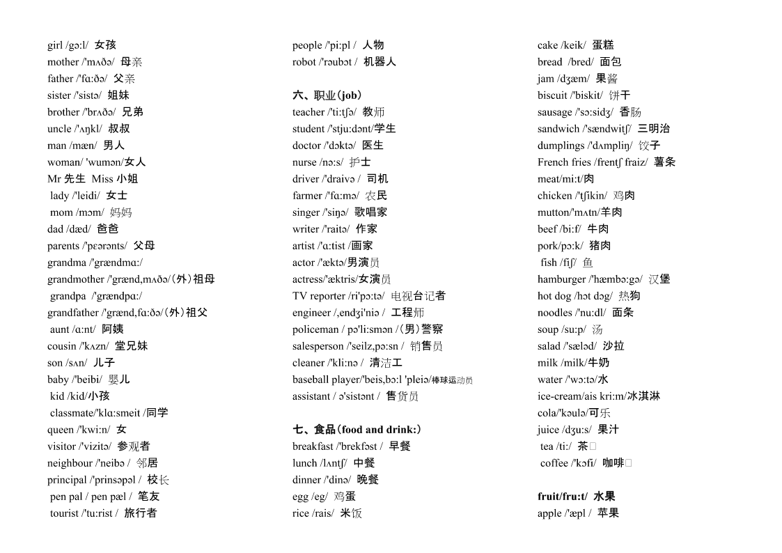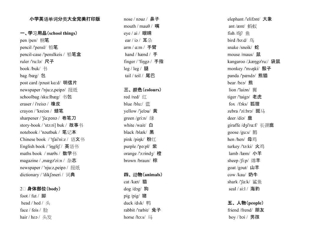 小学英语单词分类大全完美打印版nose/nəuz/鼻子elephant/'elifənt/大象 mouth/mauθ/嘴ant/ænt/蚂蚁 一、学习用品(schoolthings)eye/ai/眼睛fish/fiʃ/鱼 pen/pen/钢笔ear/iə/耳朵bird/bə:d/鸟 pencil/'pensl/铅笔arm/ɑ:m/手臂snake/sneik/蛇 pencil-case/'penslkeis/铅笔盒hand/hænd/手mouse/maus/鼠 ruler/'ru:lə/尺子finger/'fiŋgə/手指kangaroo/,kæŋgə'ru:/袋鼠 book/buk/书leg/leg/腿monkey/'mʌŋki/猴子 bag/bæg/包tail/teil/尾巴panda/'pændə/熊猫 postcard/pəustkɑ:d/明信片bear/bɛə/熊 newspaper/'nju:z,peipə/报纸三、颜色(colours)lion/'laiən/狮 schoolbag/sku:lbæg/书包red/red/红tiger/'taigə/老虎 eraser/i'reisə/橡皮blue/blu:/蓝fox/fɔks/狐狸 crayon/'kreiən/蜡笔yellow/'jeləu/黄zebra/'zi:brə/斑马 sharpener/'ʃɑ:pənə/卷笔刀green/gri:n/绿deer/diə/鹿 story-book/'stɔ:ri]buk/故事书white/wait/白giraffe/dʒi'rɑ:f/长颈鹿 notebook/'nəutbuk/笔记本black/blæk/黑goose/gu:s/鹅 Chinesebook/'tʃai'ni:z/语文书pink/piŋk/粉红hen/hen/母鸡 Englishbook/'iŋgliʃ/英语书purple/'pə:pl/紫turkey/'tə:ki/火鸡 mathsbook/mæθs/数学书orange/'ɔ:rindʒ/橙lamb/læm/小羊 magazine/,mægə'zi:n/杂志brown/braun/棕sheep/ʃi:p/绵羊 newspaper/'nju:z,peipə/报纸goat/gəut/山羊 dictionary/'dikʃəneri/词典四、动物(animals)cow/kau/奶牛 cat/kæt/猫shark/'ʃɑ:k/鲨鱼 2身体部位(body)dog/dɔg/狗seal/si:l/海豹 foot/fut/脚pig/pig/猪 head/hed/头duck/dʌk/鸭五、人物(people) face/feis/脸rabbit/'ræbit/兔子friend/frend/朋友 hair/hɛə/头发horse/hɔ:s/马boy/bɔi/男孩 girl/gə:l/女孩people/'pi:pl/人物cake/keik/蛋糕 mother/'mʌðə/母亲robot/'rəubɔt/机器人bread/bred/面包 father/'fɑ:ðə/父亲jam/dʒæm/果酱 sister/'sistə/姐妹六、职业(job)biscuit/'biskit/饼干 brother/'brʌðə/兄弟teacher/'ti:tʃə/教师sausage/'sɔ:sidʒ/香肠 uncle/'ʌŋkl/叔叔student/'stju:dənt/学生sandwich/'sændwitʃ/三明治 man/mæn/男人doctor/'dɔktə/医生dumplings/'dʌmpliŋ/饺子 woman/'wumən/女人nurse/nə:s/护士Frenchfries/frentʃfraiz/薯条 Mr先生Miss小姐driver/'draivə/司机meat/mi:t/肉 lady/'leidi/女士farmer/'fɑ:mə/农民chicken/'tʃikin/鸡肉 mom/mɔm/妈妈singer/'siŋə/歌唱家mutton/'mʌtn/羊肉 dad/dæd/爸爸writer/'raitə/作家beef/bi:f/牛肉 parents/'pɛərənts/父母artist/'ɑ:tist/画家pork/pɔ:k/猪肉 grandma/'grændmɑ:/actor/'æktə/男演员fish/fiʃ/鱼 grandmother/'grænd,mʌðə/(外)祖母actress/'æktris/女演员hamburger/'hæmbə:gə/汉堡 grandpa/'grændpɑ:/TVreporter/ri'pɔ:tə/电视台记者hotdog/hɔtdɔg/热狗 grandfather/'grænd,fɑ:ðə/(外