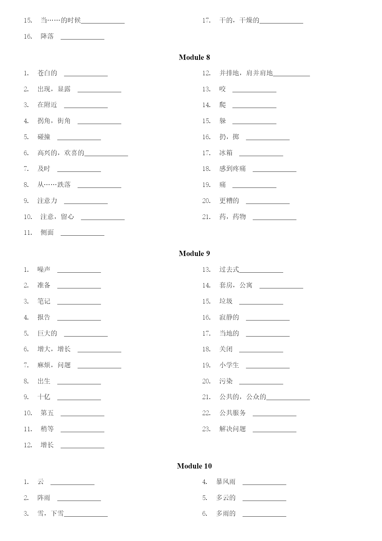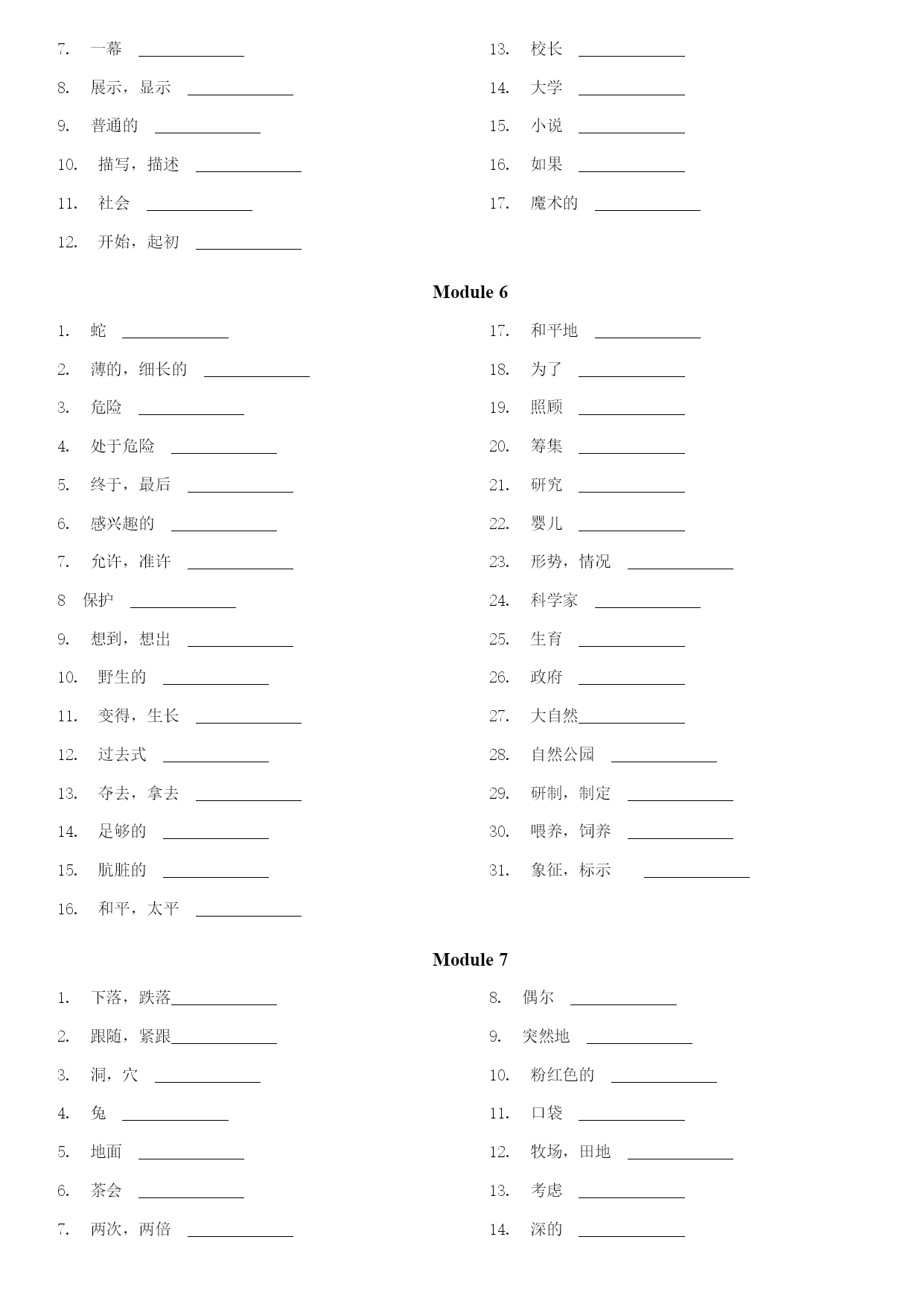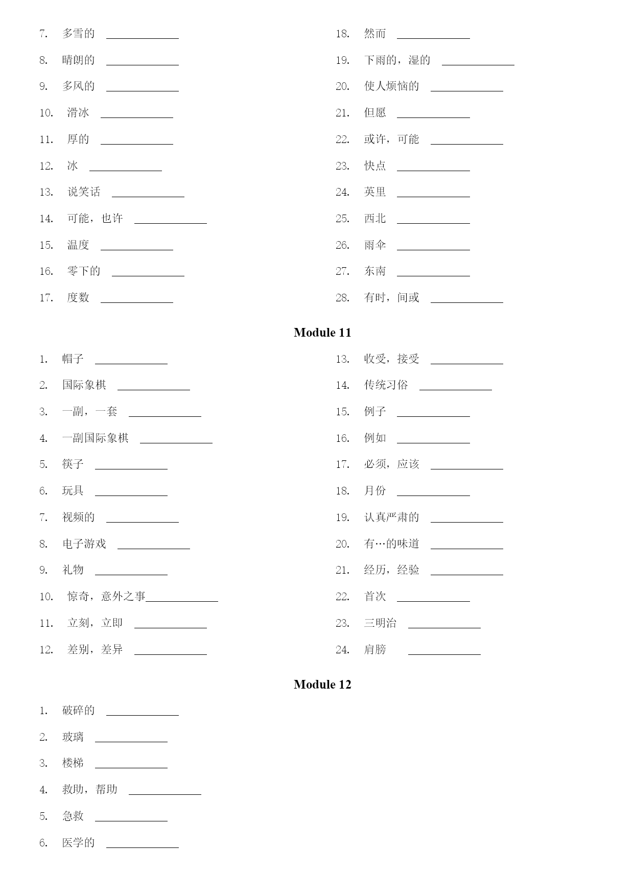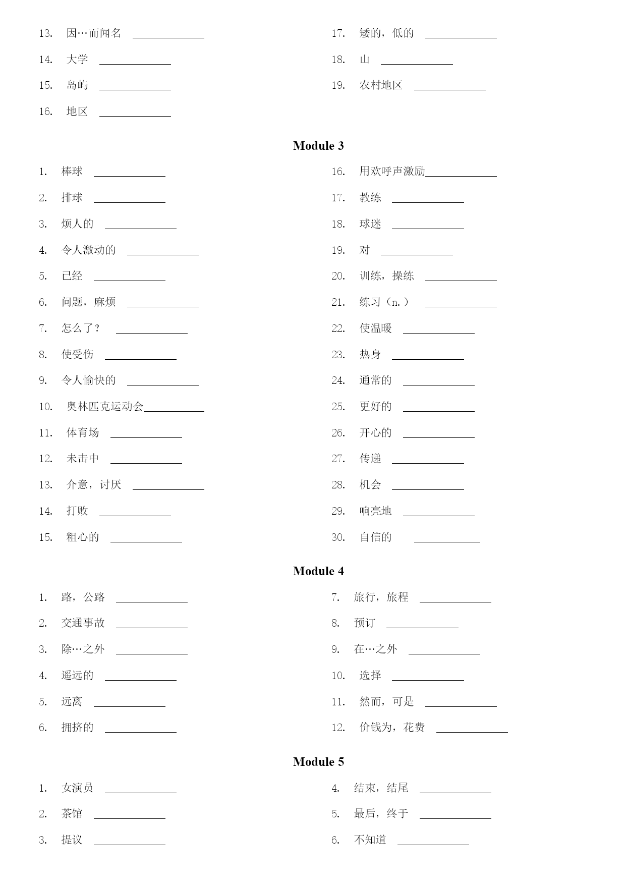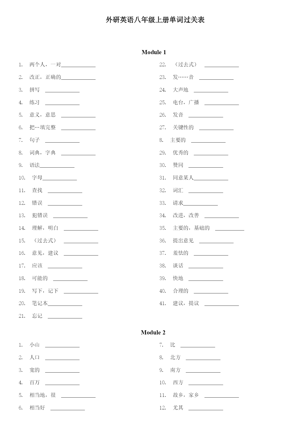 外研英语八年级上册单词过关表Module1 1.两个人,一对_____________ 2.改正,正确的_____________ 3.拼写_____________ 4.练习_____________ 5.意义,意思_____________ 6.把…填完整_____________ 7.句子_____________ 8.词典,字典_____________ 9.语法_____________ 10.字母_____________ 11.查找_____________ 12.错误_____________ 13.犯错误_____________ 14.理解,明白_____________ 15.(过去式)_____________ 16.意见,建议_____________ 17.应该_____________ 18.可能的_____________ 19.写下,记下_____________ 20.笔记本_____________ 21.忘记_____________ 22.(过去式)_____________ 23.发……音_____________ 24.大声地_____________ 25.电台,广播_____________ 26.发音_____________ 27.关键性的_____________ 8.主要的_____________ 29.优秀的_____________ 30.赞同_____________ 31.同意某人_____________ 32.词汇_____________ 33.请求_____________ 34.改进,改善_____________ 35.主要的,基础的___________ 36.提出意见_____________ 37.羞怯的_____________ 38.谈话_____________ 39.快地_____________ 40.合理的_____________ 41.建议,提议_____________Module2 1.小山_____________ 2.人口_____________ 3.宽的_____________ 4.百万_____________ 5.相当地,很_____________ 6.相当好_____________ 7.比_____________ 8.北方_____________ 9.南方_____________ 10.西方_____________ 11.故乡,家乡_____________ 12.尤其_____________ 13.因…而闻名_____________ 14.大学_____________ 15.岛屿_____________ 16.地区_____________ 17.矮的,低的_____________ 18.山_____________ 19.农村地区_____________ Module3 1.棒球_____________ 2.排球_____________ 3.烦人的_____________ 4.令人激动的_____________ 5.已经_____________ 6.问题,麻烦_____________ 7.怎么了?_____________ 8.使受伤_____________ 9.令人愉快的_____________ 10.奥林匹克运动会___________ 11.体育场_____________ 12.未击中_____________ 13.介意,讨厌_____________ 14.打败_____________ 15.粗心的_____________ 16.用欢呼声激励_____________ 17.教练_____________ 18.球迷_____________ 19.对_____________ 20.训练,操练_____________ 21.练习(n.)_____________ 22.使温暖_____________ 23.热身_____________ 24.通常的_____________ 25.更好的_____________ 26.开心的_____________ 27.传递_____________ 28.机会_____________ 29.响亮地_____________ 30.自信的____________Module4 1.路,公路_____________ 2.交通事故_____________ 3.除…之外_____________ 4.遥远的_____________ 5.远离_____________ 6.拥挤的_____________ 7.旅行,旅程_____________ 8.预订_____________ 9.在…之外___