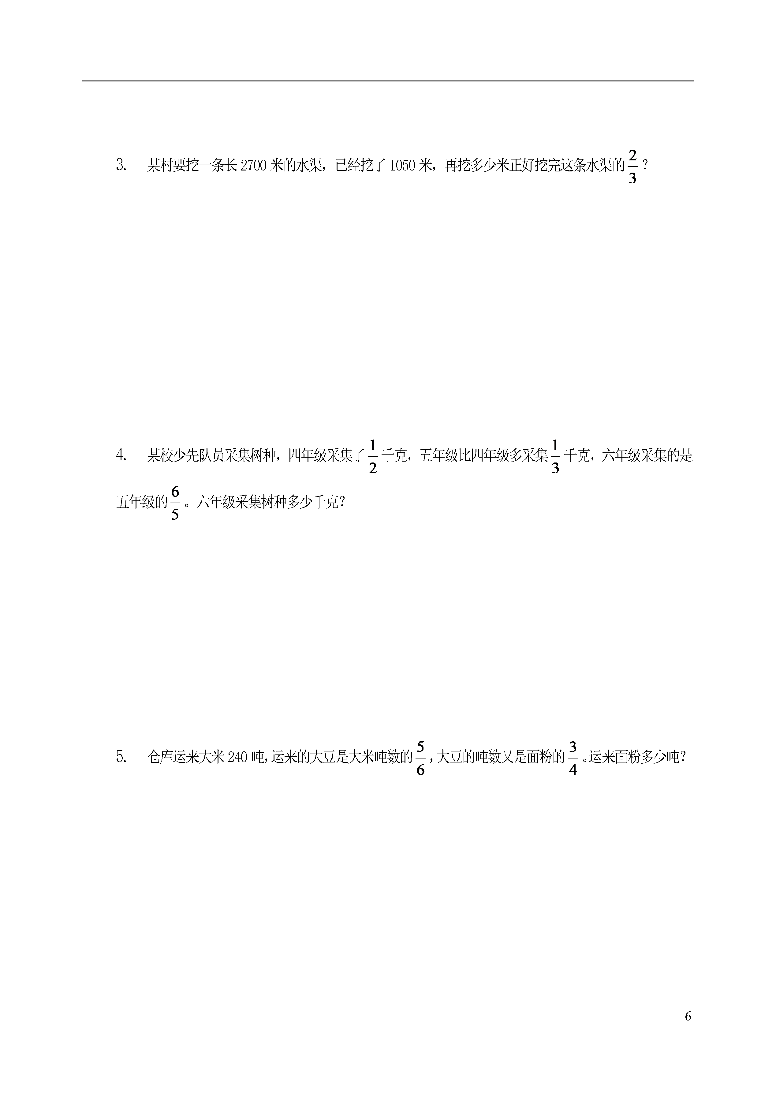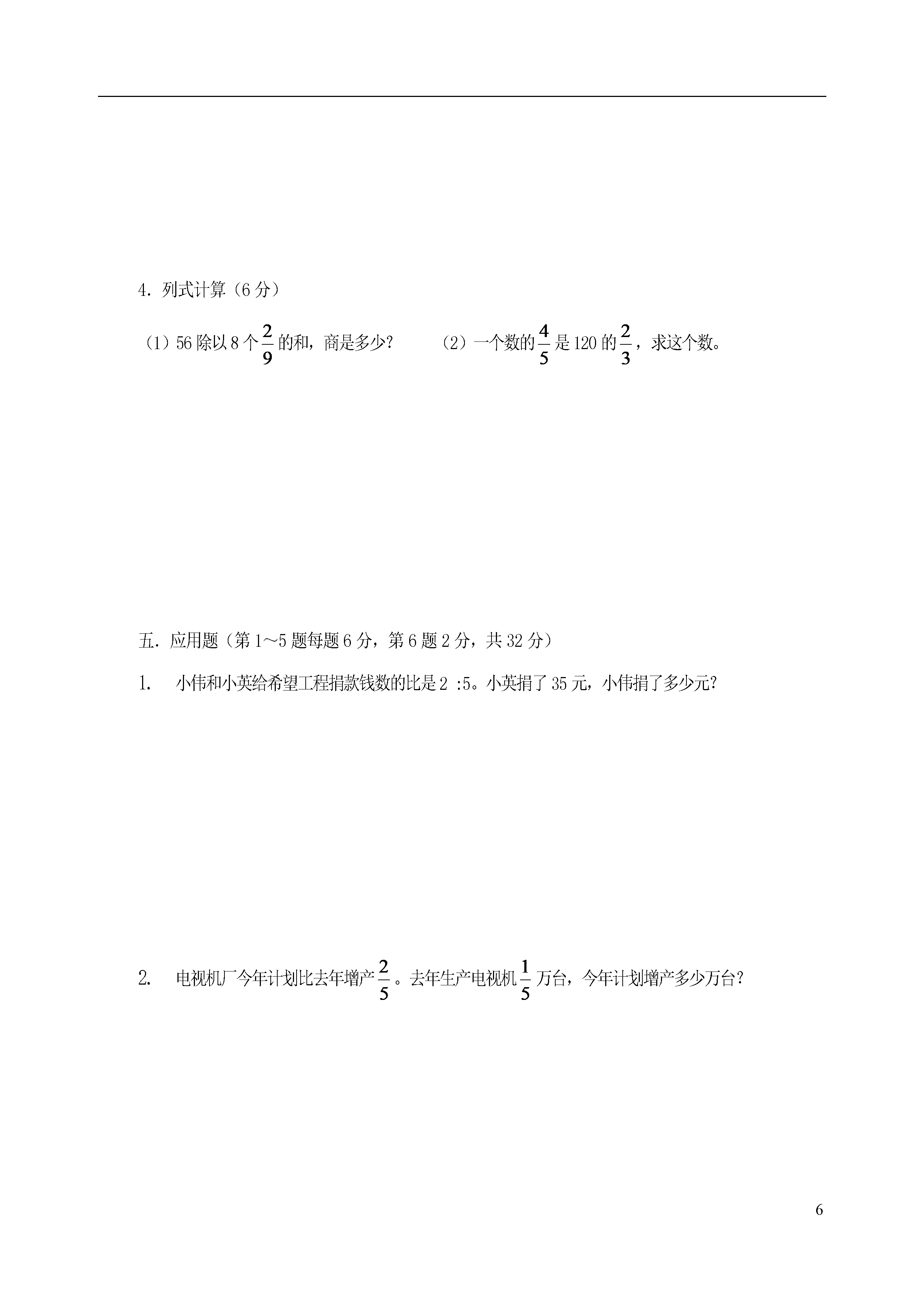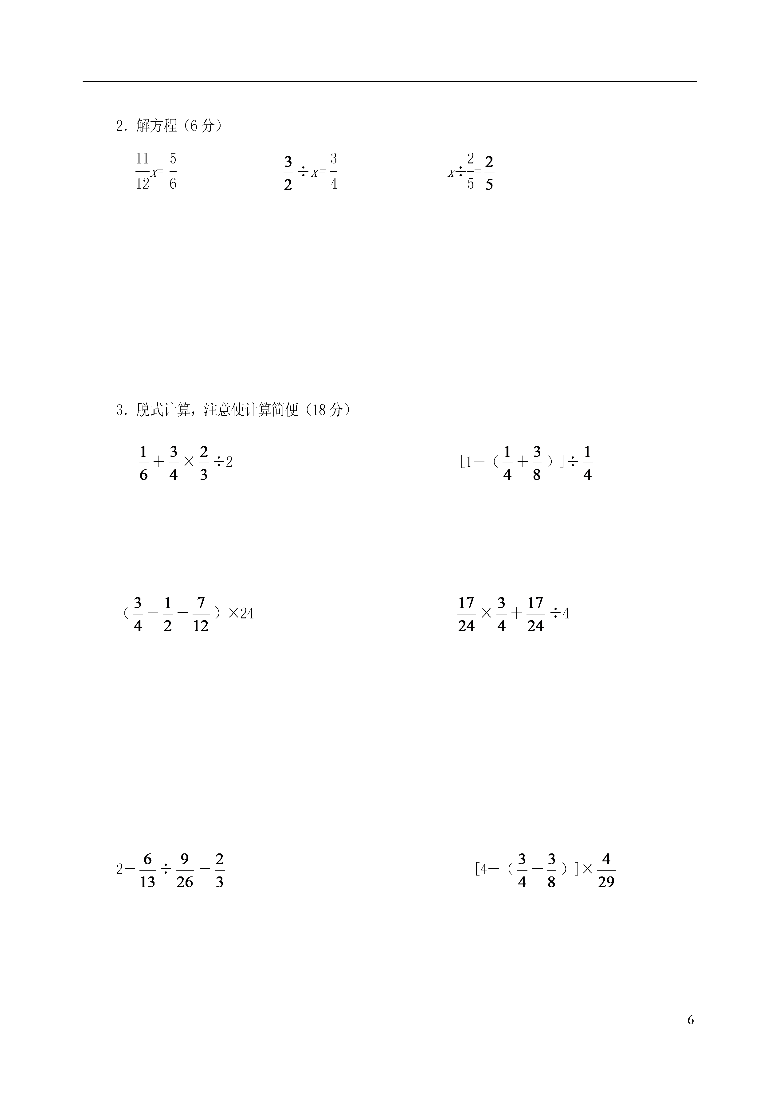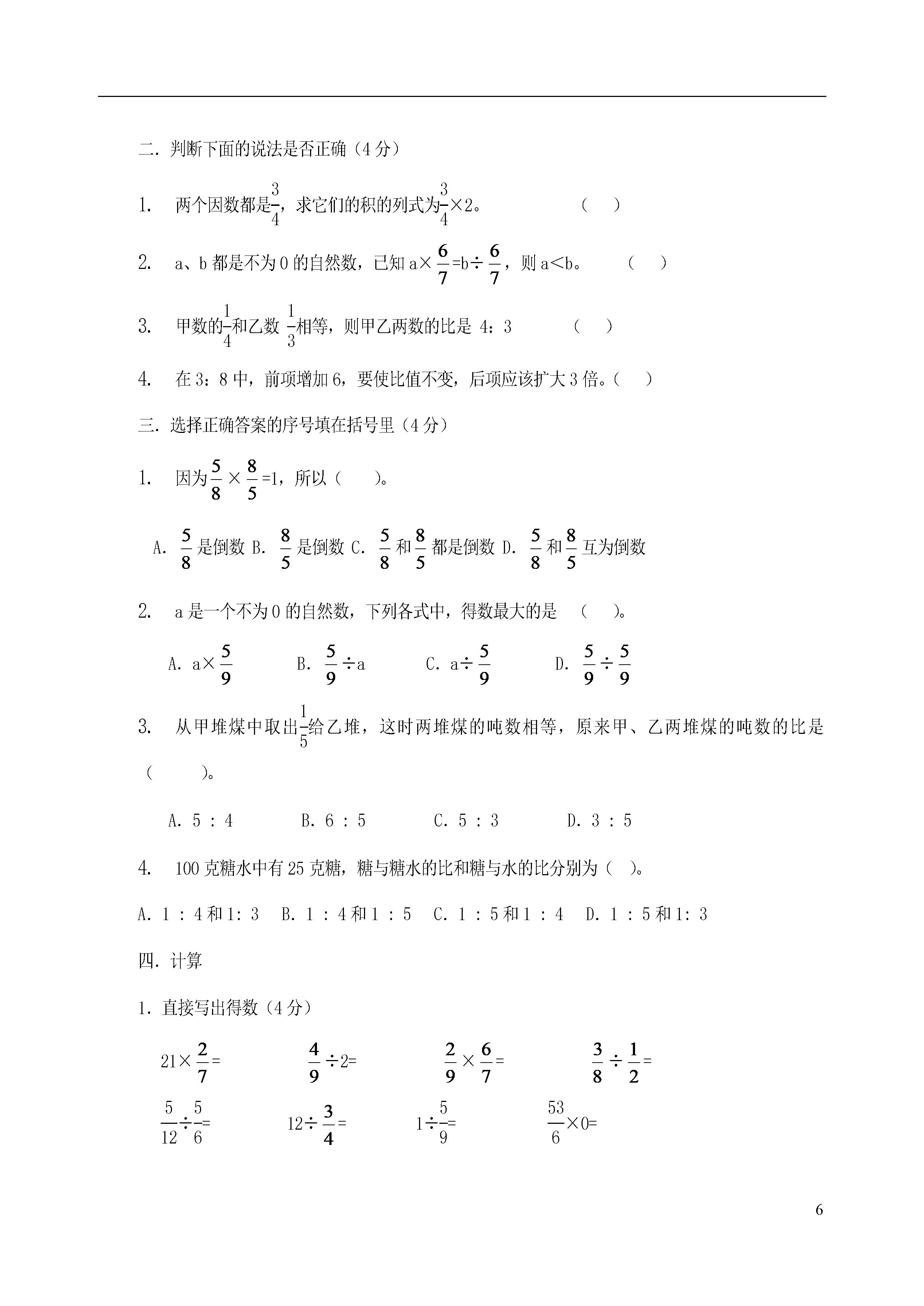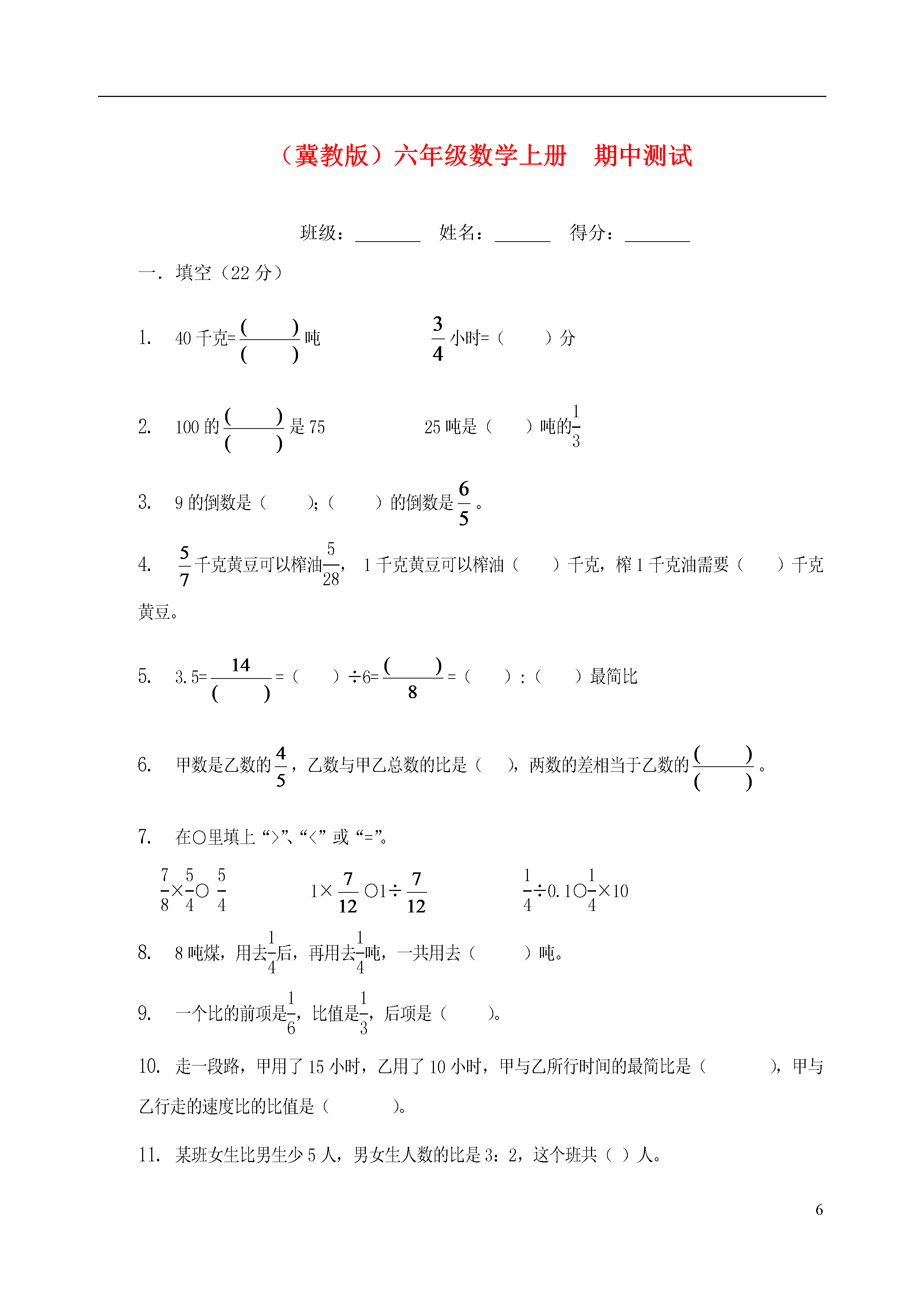 6(冀教版)六年级数学上册期中测试班级:姓名:得分:一.填空(22分)40千克=吨小时=()分100的是7525吨是()吨的EQ\F(1,3)9的倒数是();()的倒数是。千克黄豆可以榨油EQ\F(5,28),1千克黄豆可以榨油()千克,榨1千克油需要()千克黄豆。3.5==()÷6==():()最简比甲数是乙数的,乙数与甲乙总数的比是(),两数的差相当于乙数的。在○里填上“>”、“<”或“=”。EQ\F(7,8)×EQ\F(5,4)○EQ\F(5,4)1×○1÷EQ\F(1,4)÷0.1○EQ\F(1,4)×108吨煤,用去EQ\F(1,4)后,再用去EQ\F(1,4)吨,一共用去()吨。一个比的前项是EQ\F(1,6),比值是EQ\F(1,3),后项是()。走一段路,甲用了15小时,乙用了10小时,甲与乙所行时间的最简比是(),甲与乙行走的速度比的比值是()。某班女生比男生少5人,男女生人数的比是3:2,这个班共()人。二.判断下面的说法是否正确(4分)两个因数都是EQ\F(3,4),求它们的积的列式为EQ\F(3,4)×2。()a、b都是不为0的自然数,已知a×=b÷,则a<b。()甲数的EQ\F(1,4)和乙数EQ\F(1,3)相等,则甲乙两数的比是4:3()在3:8中,前项增加6,要使比值不变,后项应该扩大3倍。()三.选择正确答案的序号填在括号里(4分)因为×=1,所以()。A.是倒数B.是倒数C.和都是倒数D.和互为倒数a是一个不为0的自然数,下列各式中,得数最大的是()。A.a×B.÷aC.a÷D.÷从甲堆煤中取出EQ\F(1,5)给乙堆,这时两堆煤的吨数相等,原来甲、乙两堆煤的吨数的比是()。A.5:4B.6:5C.5:3D.3:5100克糖水中有25克糖,糖与糖水的比和糖与水的比分别为()。A.1:4和1:3B.1:4和1:5C.1:5和1:4D.1:5和1:3四.计算1.直接写出得数(4分)21×=÷2=×=÷=EQ\F(5,12)÷EQ\F(5,6)=12÷=1÷EQ\F(5,9)=EQ\F(53,6)×0=2.解方程(6分)EQ\F(11,12)x=EQ\F(5,6)÷x=EQ\F(3,4)x÷EQ\F(2,5)=3.脱式计算,注意使计算简便(18分)+×÷2[1-(+)]÷(+-)×24×+÷42-÷-[4-(-)]×4.列式计算(6分)(1)56除以8个的和,商是多少?(2)一个数的是120的,求这个数。五.应用题(第1~5题每题6分,第6题2分,共32分)小伟和小英给希望工程捐款钱数的比是2:5。小英捐了35元,小伟捐了多少元?电视机厂今年计划比去年增产。去年生产电视机万台,今年计划增产多少万台?某村要挖一条长2700米的水渠,已经挖了1050米,再挖多少米正好挖完这条水渠的?某校少先队员采集树种,四年级采集了千克,五年级比四年级多采集千克,六年级采集的是五年级的。六年级采集树种多少千克?仓库运来大米240吨,运来的大豆是大米吨数的,大豆的吨数又是面粉的。运来面粉多少吨?把一批货物按5:3分给甲、乙两队运,甲队完成本队任务的,剩下的给乙队运,乙队共运了48吨。这批货物一共有多少吨?