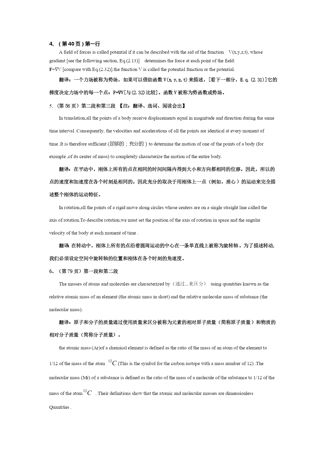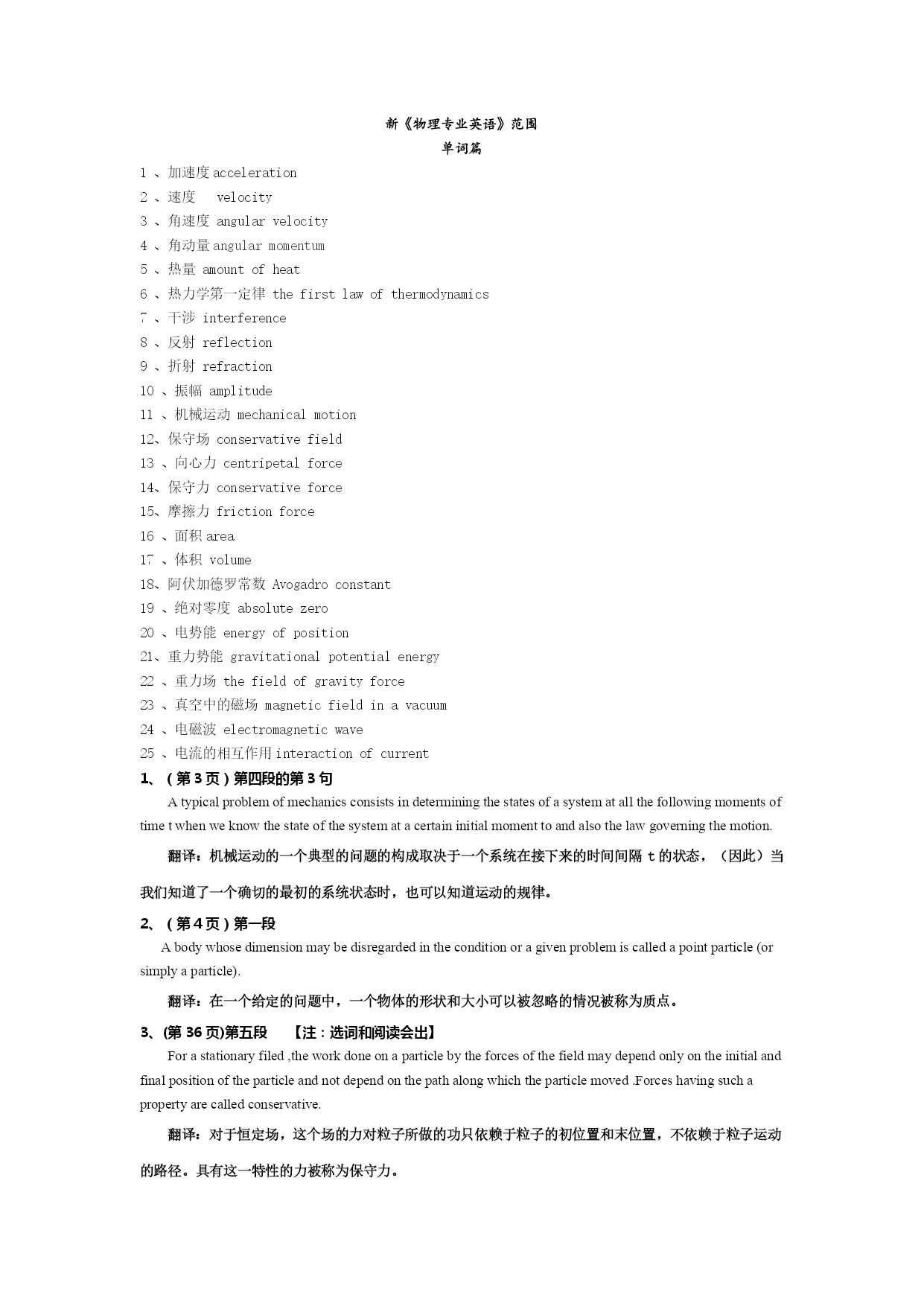 新《物理专业英语》范围 单词篇 1、加速度acceleration 2、速度velocity 3、角速度angularvelocity 4、角动量angularmomentum 5、热量amountofheat 6、热力学第一定律thefirstlawofthermodynamics 7、干涉interference 8、反射reflection 9、折射refraction 10、振幅amplitude 11、机械运动mechanicalmotion 12、保守场conservativefield 13、向心力centripetalforce 14、保守力conservativeforce 15、摩擦力frictionforce 16、面积area 17、体积volume 18、阿伏加德罗常数Avogadroconstant 19、绝对零度absolutezero 20、电势能energyofposition 21、重力势能gravitationalpotentialenergy 22、重力场thefieldofgravityforce 23、真空中的磁场magneticfieldinavacuum 24、电磁波electromagneticwave 25、电流的相互作用interactionofcurrent ()第四段的第3句 Atypicalproblemofmechanicsconsistsindeterminingthestatesofasystematallthefollowingmomentsoftimetwhenweknowthestateofthesystematacertaininitialmomenttoandalsothelawgoverningthemotion. 翻译:机械运动的一个典型的问题的构成取决于一个系统在接下来的时间间隔t的状态,(因此)当我们知道了一个确切的最初的系统状态时,也可以知道运动的规律。 ()第一段 Abodywhosedimensionmaybedisregardedintheconditionoragivenproblemiscalledapointparticle(orsimplyaparticle). 翻译:在一个给定的问题中,一个物体的形状和大小可以被忽略的情况被称为质点。 3、()第五段【注:选词和阅读会出】 Forastationaryfiled,theworkdoneonaparticlebytheforcesofthefieldmaydependonlyontheinitialandfinalpositionoftheparticleandnotdependonthepathalongwhichtheparticlemoved.Forceshavingsuchapropertyarecalledconservative. 翻译:对于恒定场,这个场的力对粒子所做的功只依赖于粒子的初位置和末位置,不依赖于粒子运动的路径。具有这一特性的力被称为保守力。 4、()第一行 AfieldofforcesiscalledpotentialifitcanbedescribedwiththeaidofthefunctionV(x,y,z,t),whosegradient[seethefollowingsection,Eq.(2.13)]determinestheforceateachpointofthefield:F=∇V[comparewithEq.(2.32)].thefunctionViscalledthepotentialfunctionorthepotential. 翻译:一个力场被称为势场,如果可以借助函数V(x,y,z,t)来描述,[看下一部分,E.q.(2.31)]它的梯度决定力场中的每一个点:F=∇V[与(2.32)比较]。函数V被称为势函数或势场。 ()第二段和第三段【注:翻译、选词、阅读会出】 Intranslation,allthepointsofabodyreceivedisplacementsequalinmagnitudeanddirectionduringthesametimeinterval.Consequently,thevelocitiesandaccelerationsofallthepointsareidenticalateverymomentoftime.Itisthereforesufficient(足够的;充分的)todeterminethemotionofoneofthepointsofabody(forexample,ofitscenterofmass)tocompletelycharacterizethemotionoft