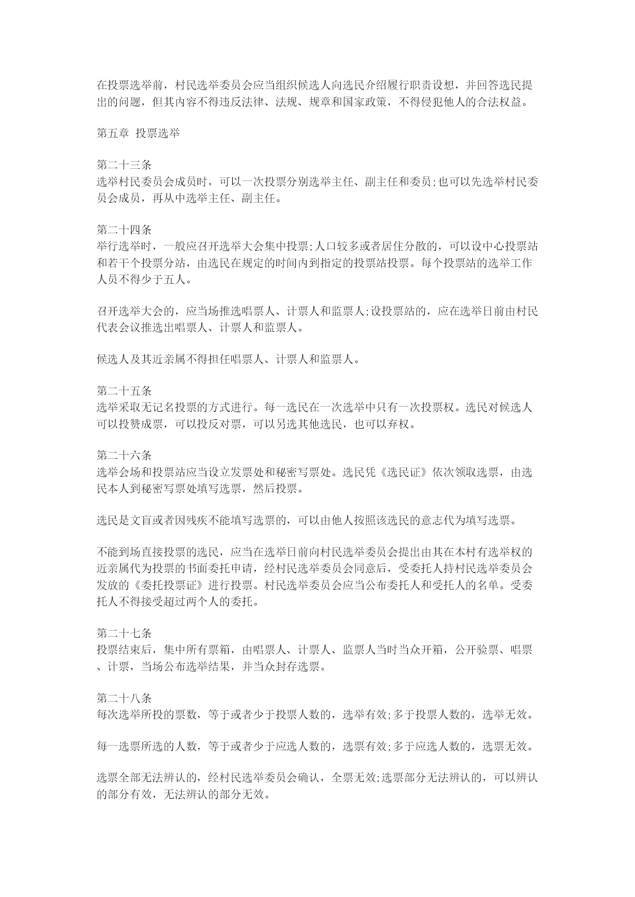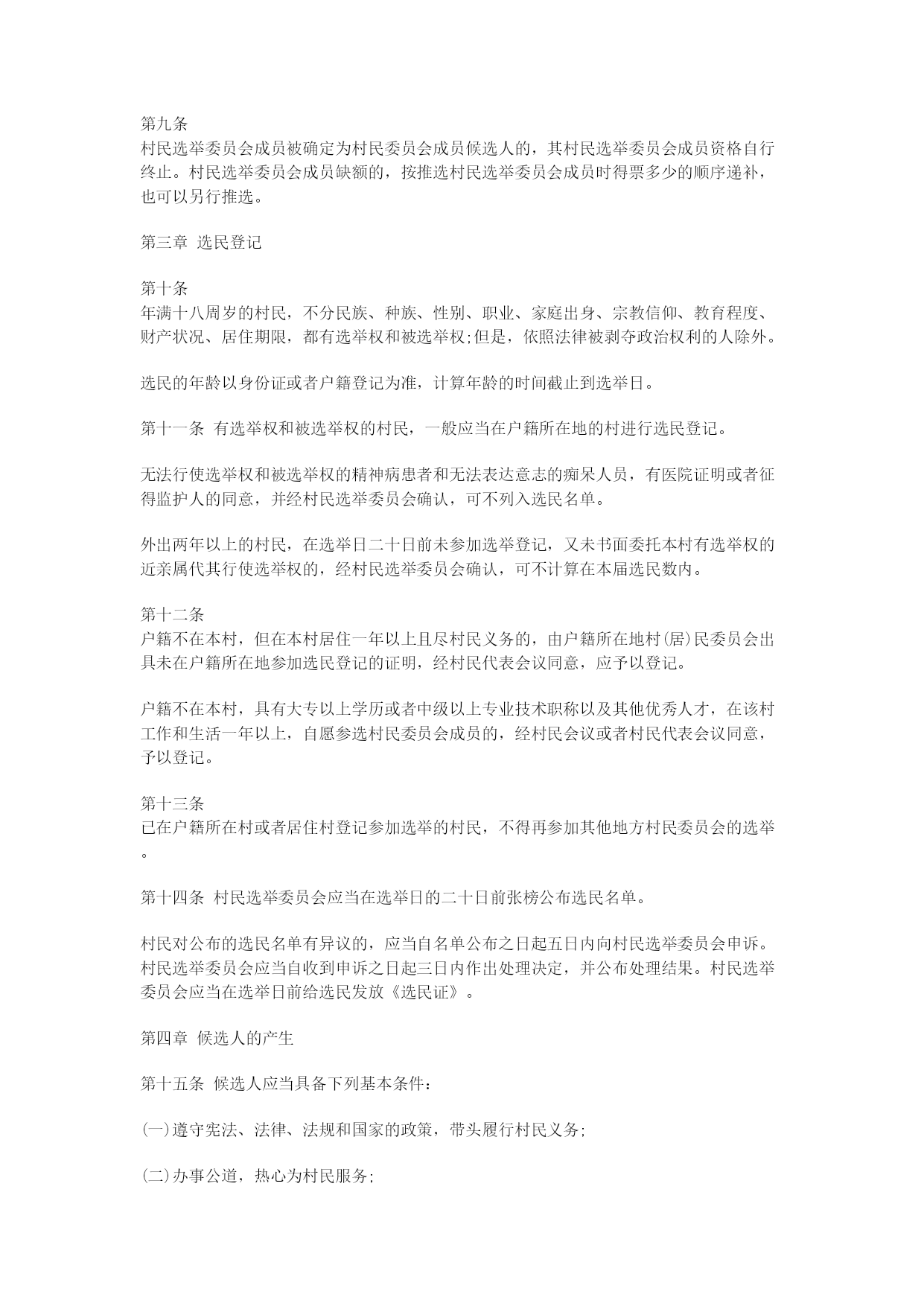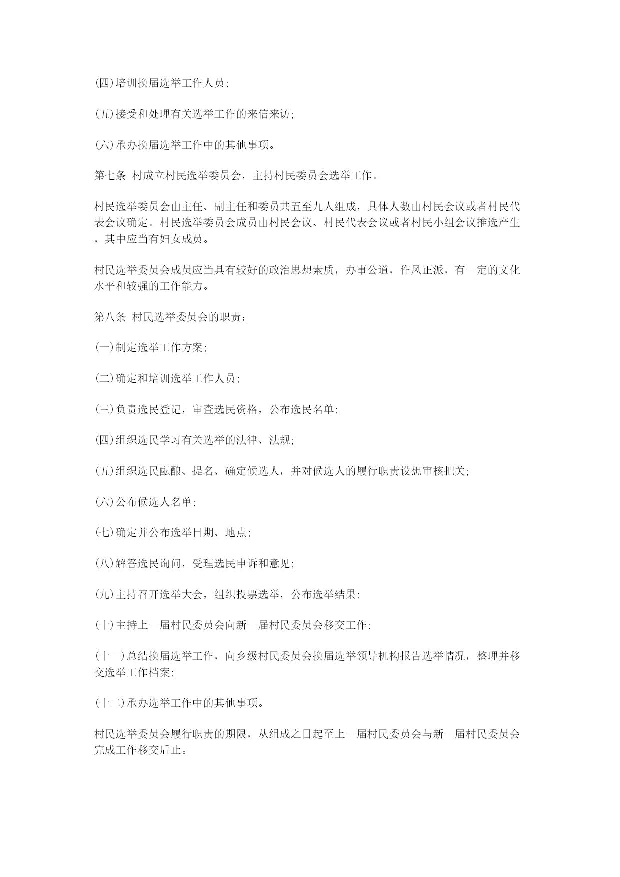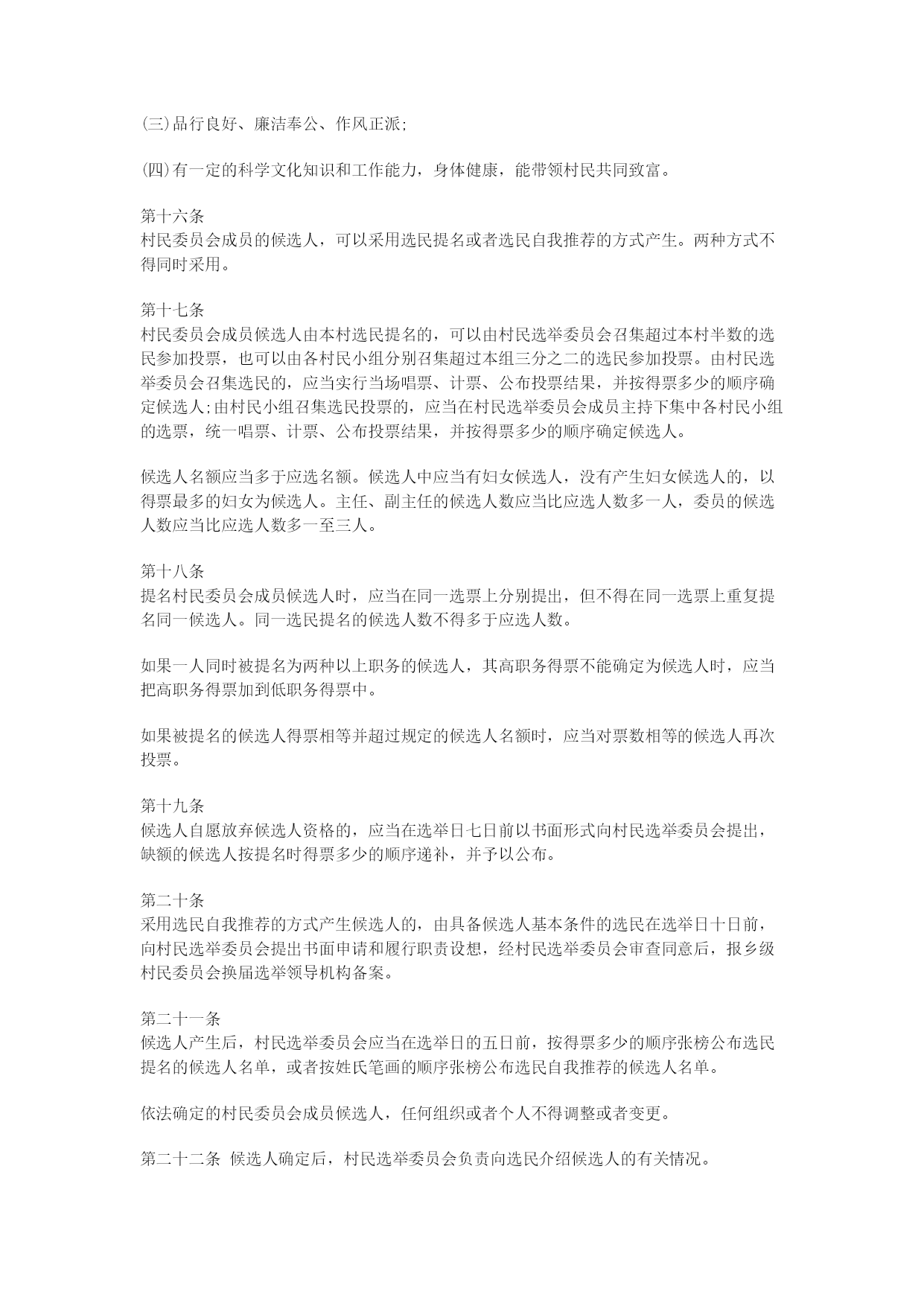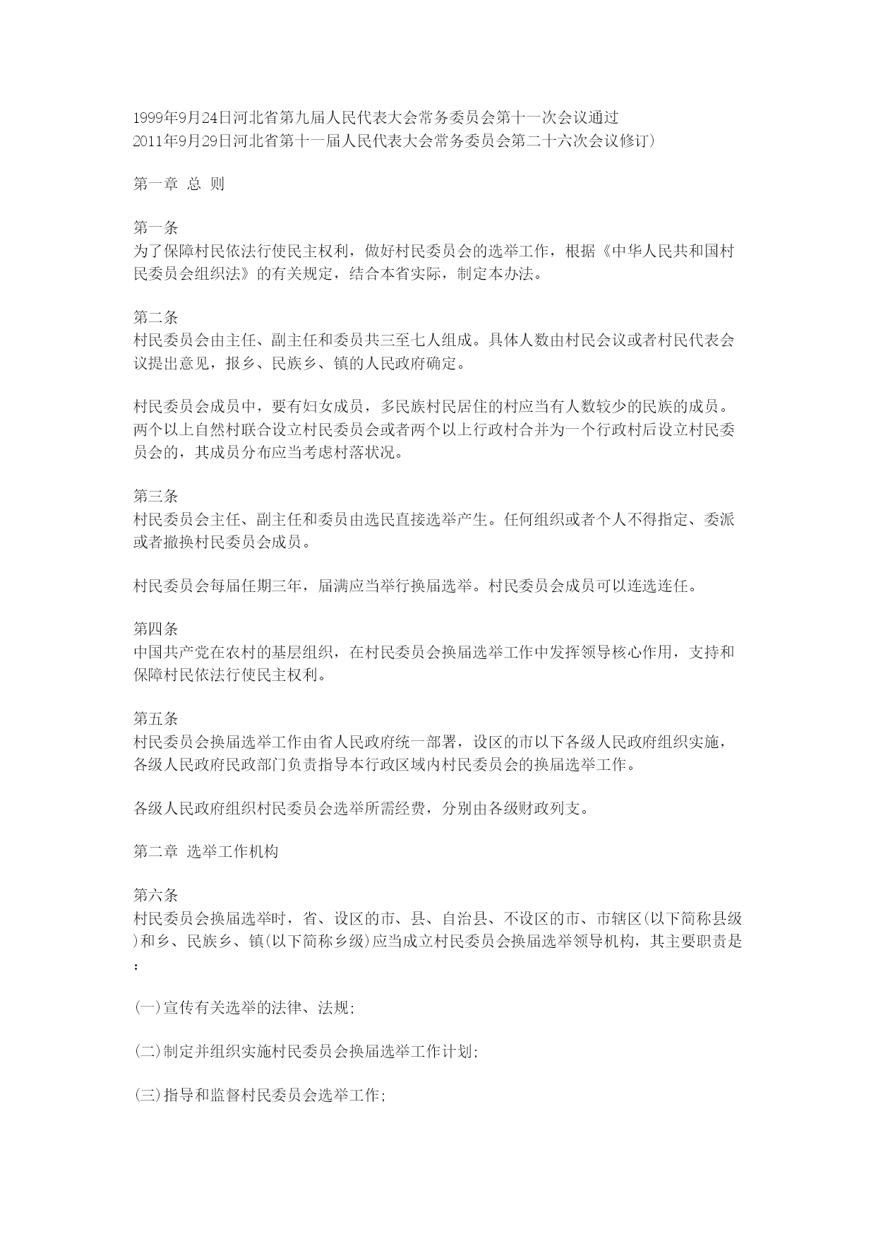 1999年9月24日河北省第九届人民代表大会常务委员会第十一次会议通过2011年9月29日河北省第十一届人民代表大会常务委员会第二十六次会议修订) 第一章总则 第一条为了保障村民依法行使民主权利,做好村民委员会的选举工作,根据《中华人民共和国村民委员会组织法》的有关规定,结合本省实际,制定本办法。 第二条村民委员会由主任、副主任和委员共三至七人组成。具体人数由村民会议或者村民代表会议提出意见,报乡、民族乡、镇的人民政府确定。 村民委员会成员中,要有妇女成员,多民族村民居住的村应当有人数较少的民族的成员。两个以上自然村联合设立村民委员会或者两个以上行政村合并为一个行政村后设立村民委员会的,其成员分布应当考虑村落状况。 第三条村民委员会主任、副主任和委员由选民直接选举产生。任何组织或者个人不得指定、委派或者撤换村民委员会成员。 村民委员会每届任期三年,届满应当举行换届选举。村民委员会成员可以连选连任。 第四条中国共产党在农村的基层组织,在村民委员会换届选举工作中发挥领导核心作用,支持和保障村民依法行使民主权利。 第五条村民委员会换届选举工作由省人民政府统一部署,设区的市以下各级人民政府组织实施,各级人民政府民政部门负责指导本行政区域内村民委员会的换届选举工作。 各级人民政府组织村民委员会选举所需经费,分别由各级财政列支。 第二章选举工作机构 第六条村民委员会换届选举时,省、设区的市、县、自治县、不设区的市、市辖区(以下简称县级)和乡、民族乡、镇(以下简称乡级)应当成立村民委员会换届选举领导机构,其主要职责是: (一)宣传有关选举的法律、法规; (二)制定并组织实施村民委员会换届选举工作计划; (三)指导和监督村民委员会选举工作; (四)培训换届选举工作人员; (五)接受和处理有关选举工作的来信来访; (六)承办换届选举工作中的其他事项。 第七条村成立村民选举委员会,主持村民委员会选举工作。 村民选举委员会由主任、副主任和委员共五至九人组成,具体人数由村民会议或者村民代表会议确定。村民选举委员会成员由村民会议、村民代表会议或者村民小组会议推选产生,其中应当有妇女成员。 村民选举委员会成员应当具有较好的政治思想素质,办事公道,作风正派,有一定的文化水平和较强的工作能力。 第八条村民选举委员会的职责: (一)制定选举工作方案; (二)确定和培训选举工作人员; (三)负责选民登记,审查选民资格,公布选民名单; (四)组织选民学习有关选举的法律、法规; (五)组织选民酝酿、提名、确定候选人,并对候选人的履行职责设想审核把关; (六)公布候选人名单; (七)确定并公布选举日期、地点; (八)解答选民询问,受理选民申诉和意见; (九)主持召开选举大会,组织投票选举,公布选举结果; (十)主持上一届村民委员会向新一届村民委员会移交工作; (十一)总结换届选举工作,向乡级村民委员会换届选举领导机构报告选举情况,整理并移交选举工作档案; (十二)承办选举工作中的其他事项。 村民选举委员会履行职责的期限,从组成之日起至上一届村民委员会与新一届村民委员会完成工作移交后止。 第九条村民选举委员会成员被确定为村民委员会成员候选人的,其村民选举委员会成员资格自行终止。村民选举委员会成员缺额的,按推选村民选举委员会成员时得票多少的顺序递补,也可以另行推选。 第三章选民登记 第十条年满十八周岁的村民,不分民族、种族、性别、职业、家庭出身、宗教信仰、教育程度、财产状况、居住期限,都有选举权和被选举权;但是,依照法律被剥夺政治权利的人除外。 选民的年龄以身份证或者户籍登记为准,计算年龄的时间截止到选举日。 第十一条有选举权和被选举权的村民,一般应当在户籍所在地的村进行选民登记。 无法行使选举权和被选举权的精神病患者和无法表达意志的痴呆人员,有医院证明或者征得监护人的同意,并经村民选举委员会确认,可不列入选民名单。 外出两年以上的村民,在选举日二十日前未参加选举登记,又未书面委托本村有选举权的近亲属代其行使选举权的,经村民选举委员会确认,可不计算在本届选民数内。 第十二条户籍不在本村,但在本村居住一年以上且尽村民义务的,由户籍所在地村(居)民委员会出具未在户籍所在地参加选民登记的证明,经村民代表会议同意,应予以登记。 户籍不在本村,具有大专以上学历或者中级以上专业技术职称以及其他优秀人才,在该村工作和生活一年以上,自愿参选村民委员会成员的,经村民会议或者村民代表会议同意,予以登记。 第十三条已在户籍所在村或者居住村登记参加选举的村民,不得再参加其他地方村民委员会的选举。 第十四条村民选举委员会应当在选举日的二十日前张榜公布选民名单。 村民对公布的选民名单有异议的,应当自名单公布之日起五日内向村民选举委员会申诉。村民选举委员会应当自收到申诉之日起三日内作出处理决定,并公布