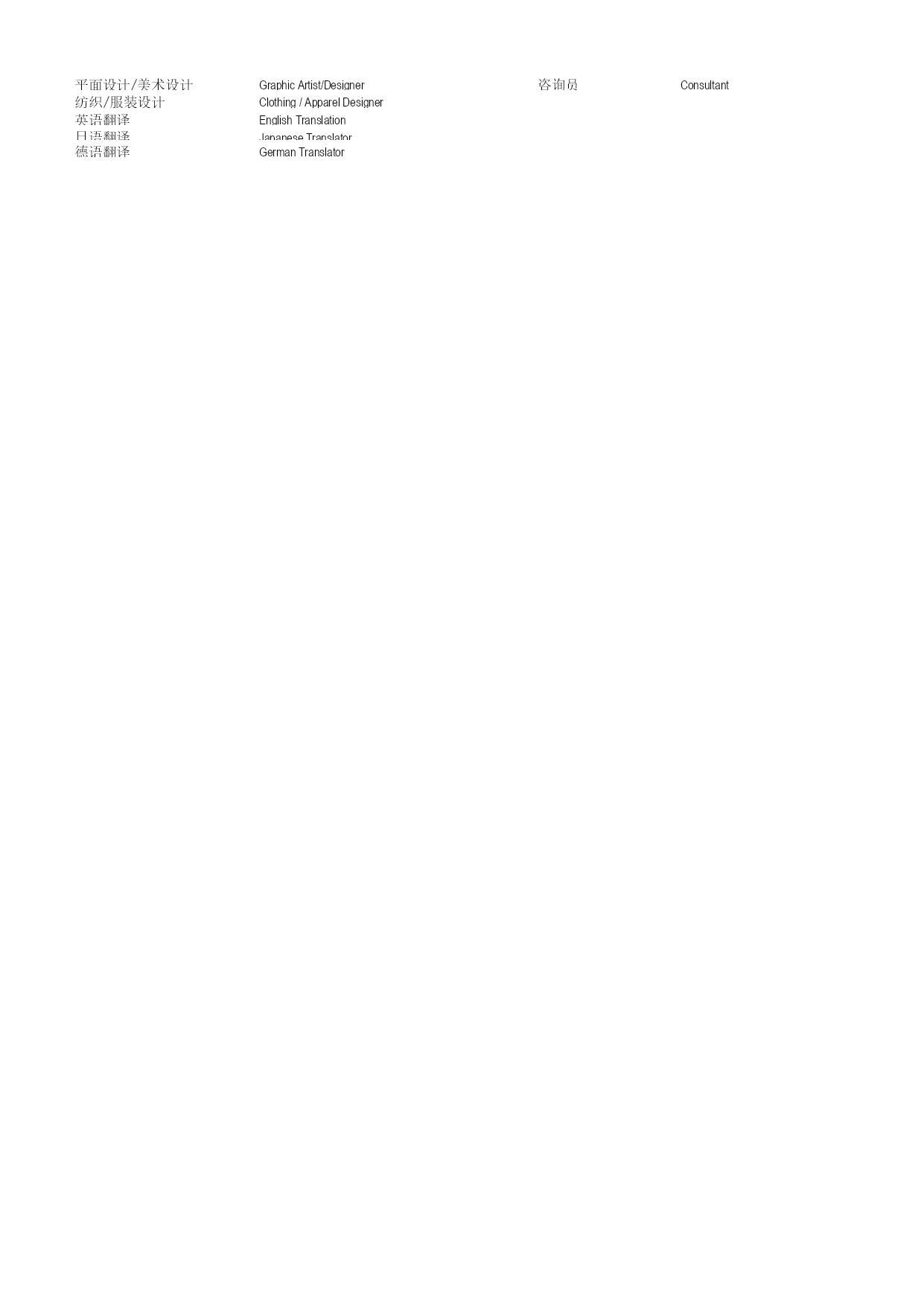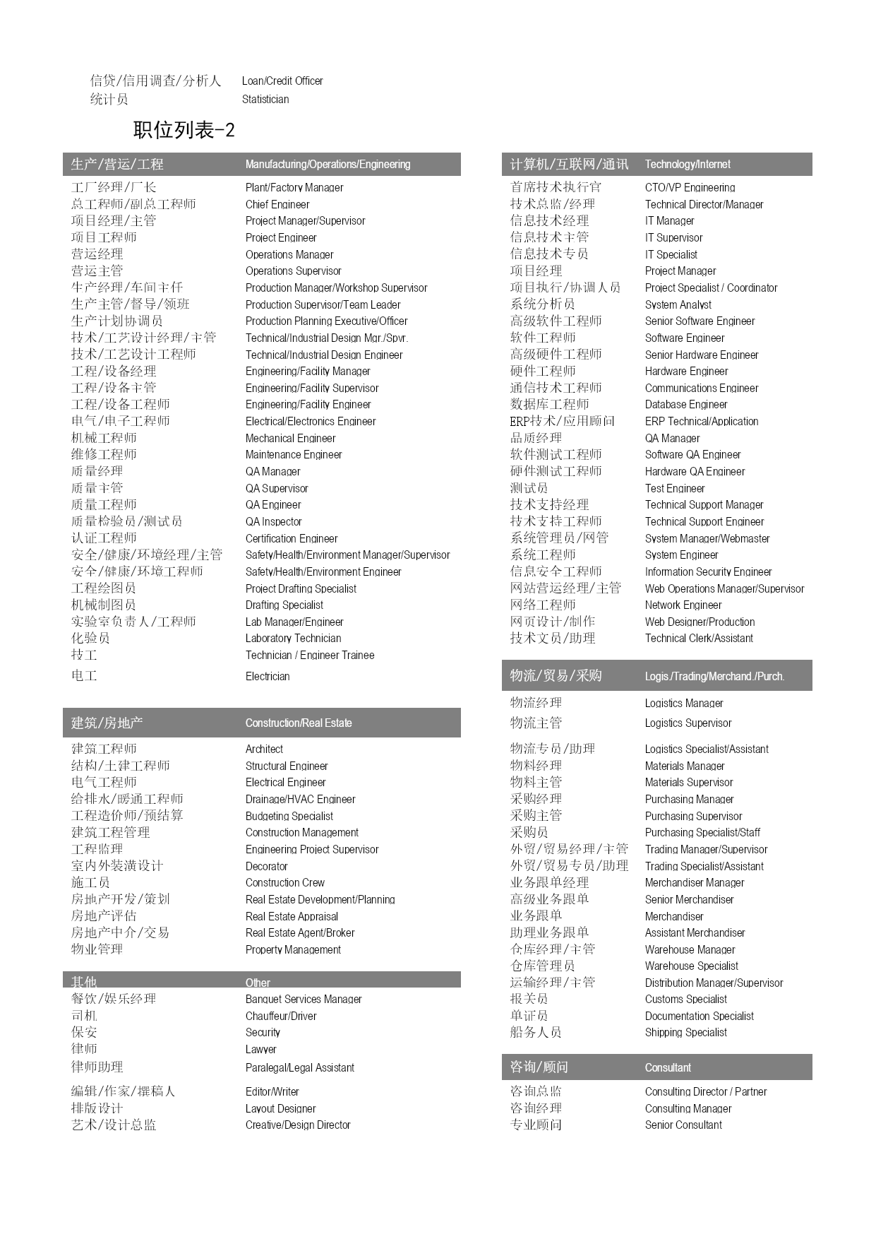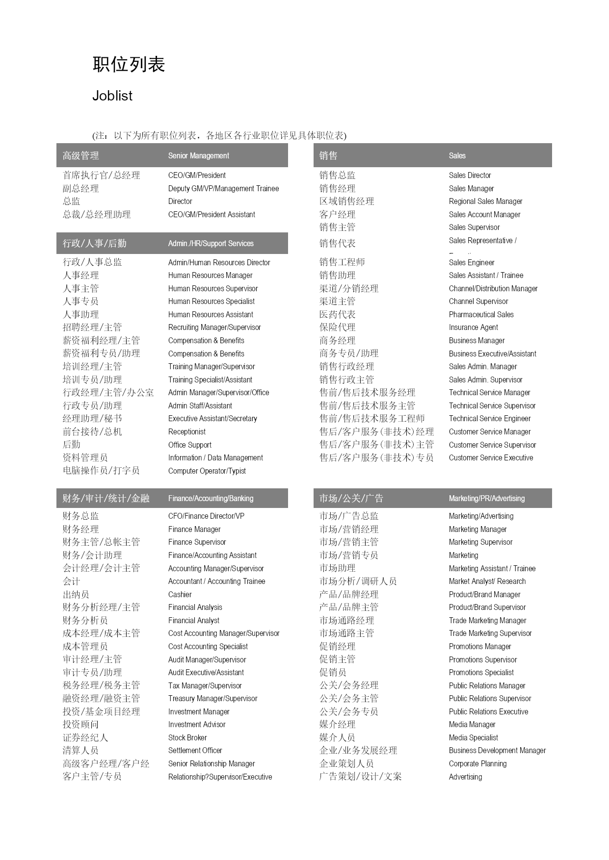 职位列表 Joblist (注:以下为所有职位列表,各地区各行业职位详见具体职位表) 高级管理SeniorManagement销售Sales首席执行官/总经理CEO/GM/President销售总监SalesDirector副总经理DeputyGM/VP/ManagementTrainee销售经理SalesManager总监Director区域销售经理RegionalSalesManager总裁/总经理助理CEO/GM/PresidentAssistant客户经理SalesAccountManager销售主管SalesSupervisor行政/人事/后勤Admin./HR/SupportServices销售代表SalesRepresentative/Executive行政/人事总监Admin/HumanResourcesDirector销售工程师SalesEngineer人事经理HumanResourcesManager销售助理SalesAssistant/Trainee人事主管HumanResourcesSupervisor渠道/分销经理Channel/DistributionManager人事专员HumanResourcesSpecialist渠道主管ChannelSupervisor人事助理HumanResourcesAssistant医药代表PharmaceuticalSalesRepresentative招聘经理/主管RecruitingManager/Supervisor保险代理InsuranceAgent薪资福利经理/主管Compensation&BenefitsMgr./Supervisor商务经理BusinessManager薪资福利专员/助理Compensation&BenefitsSpecialist/Assistant商务专员/助理BusinessExecutive/Assistant培训经理/主管TrainingManager/Supervisor销售行政经理SalesAdmin.Manager培训专员/助理TrainingSpecialist/Assistant销售行政主管SalesAdmin.Supervisor行政经理/主管/办公室主任AdminManager/Supervisor/OfficeManager售前/售后技术服务经理TechnicalServiceManager行政专员/助理AdminStaff/Assistant售前/售后技术服务主管TechnicalServiceSupervisor经理助理/秘书ExecutiveAssistant/Secretary售前/售后技术服务工程师TechnicalServiceEngineer前台接待/总机Receptionist售后/客户服务(非技术)经理CustomerServiceManager后勤OfficeSupport售后/客户服务(非技术)主管CustomerServiceSupervisor资料管理员Information/DataManagementSpecialist售后/客户服务(非技术)专员CustomerServiceExecutive电脑操作员/打字员ComputerOperator/Typist财务/审计/统计/金融Finance/Accounting/Banking市场/公关/广告Marketing/PR/Advertising财务总监CFO/FinanceDirector/VP市场/广告总监Marketing/AdvertisingDirector/VP财务经理FinanceManager市场/营销经理MarketingManager财务主管/总帐主管FinanceSupervisor市场/营销主管MarketingSupervisor财务/会计助理Finance/AccountingAssistant市场/营销专员MarketingExecutive/Communication会计经理/会计主管AccountingManager/Supervisor市场助理MarketingAssistant/Trainee会计Accountant/AccountingTrainee市场分析/调研人员MarketAnalyst/ResearchAnalyst出纳员Cashier产品/品牌经理Product/BrandManager财务分析经理/主管FinancialAnalysisManager/Supervisor产品/品牌主管Product/BrandSupervisor财务分析员FinancialAnalyst市场通路经理TradeMarketingManager成本经理/成本主管CostAccountingManage