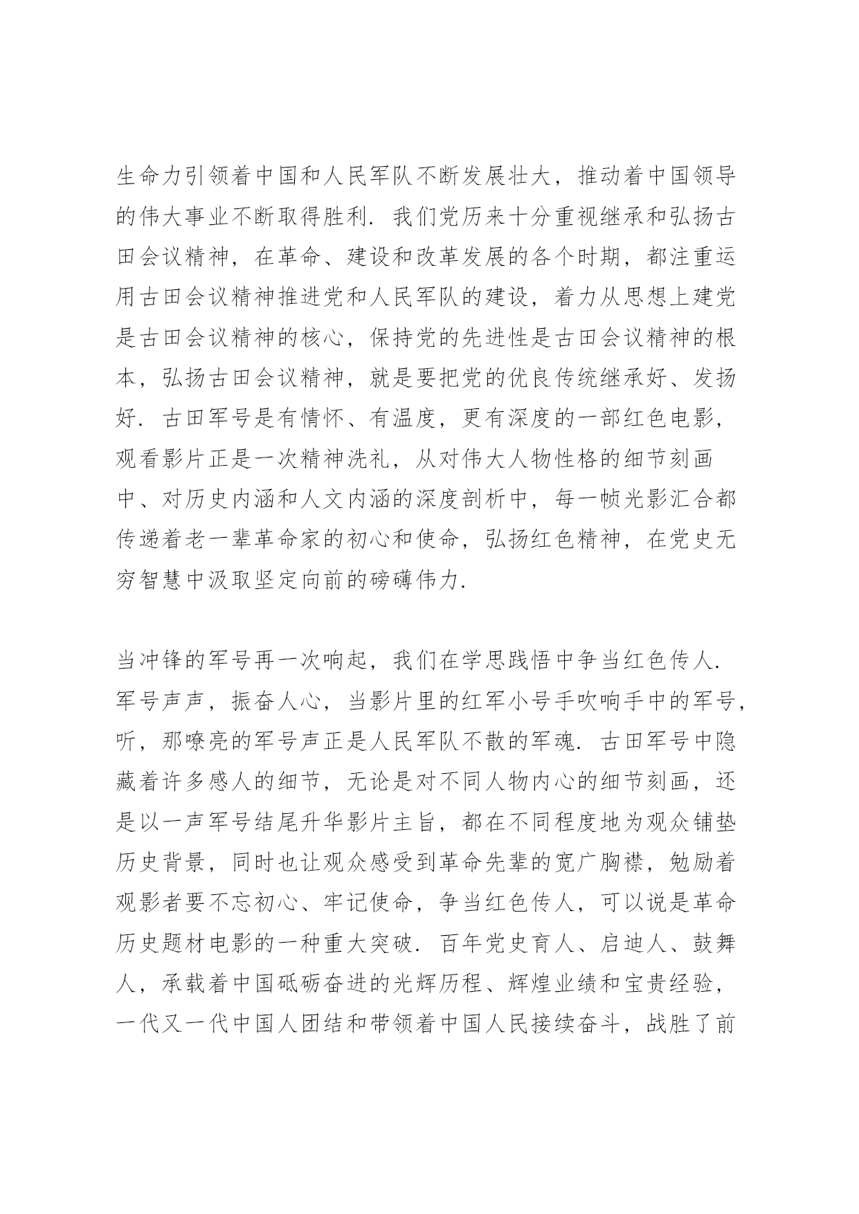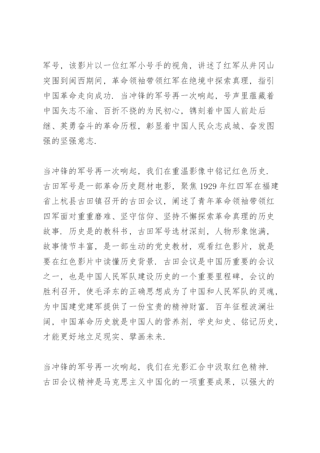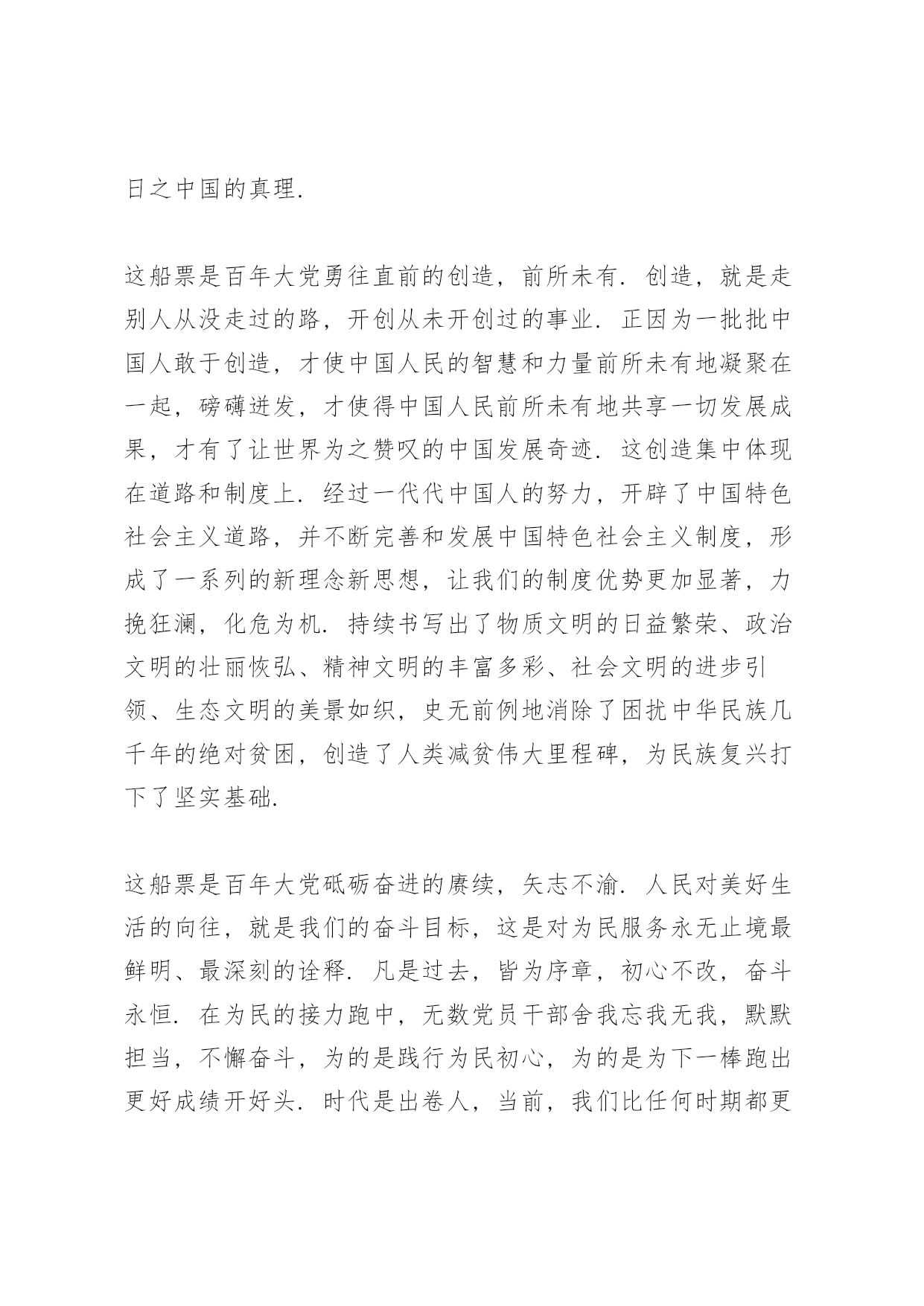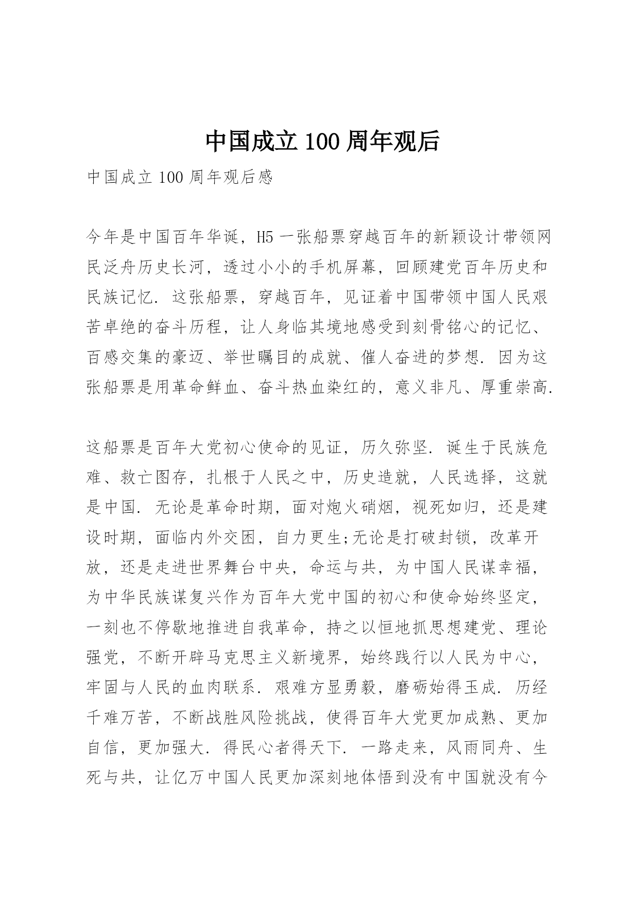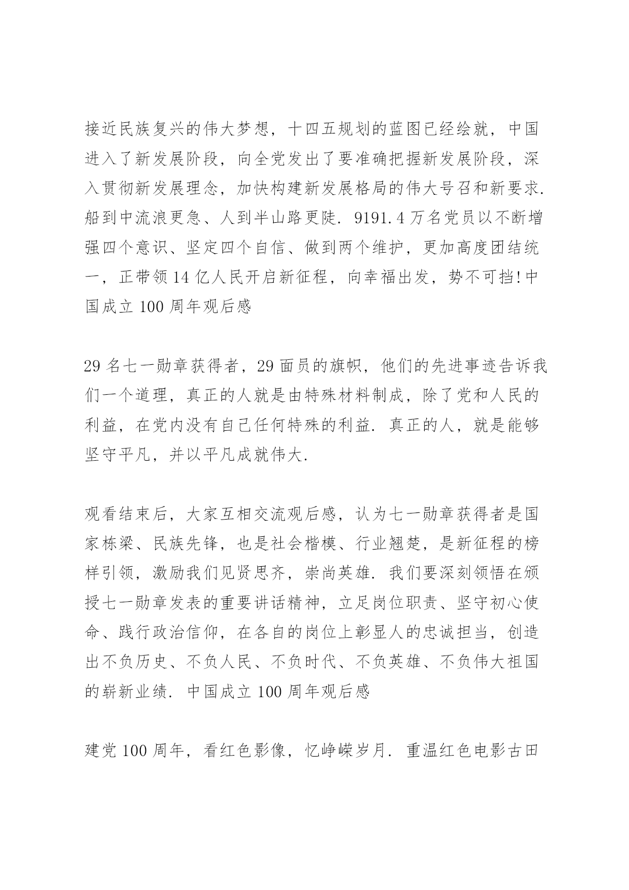 中国成立100周年观后 中国成立100周年观后感今年是中国百年华诞,H5一张船票穿越百年的新颖设计带领网民泛舟历史长河,透过小小的手机屏幕,回顾建党百年历史和民族记忆.这张船票,穿越百年,见证着中国带领中国人民艰苦卓绝的奋斗历程,让人身临其境地感受到刻骨铭心的记忆、百感交集的豪迈、举世瞩目的成就、催人奋进的梦想.因为这张船票是用革命鲜血、奋斗热血染红的,意义非凡、厚重崇高.这船票是百年大党初心使命的见证,历久弥坚.诞生于民族危难、救亡图存,扎根于人民之中,历史造就,人民选择,这就是中国.无论是革命时期,面对炮火硝烟,视死如归,还是建设时期,面临内外交困,自力更生;无论是打破封锁,改革开放,还是走进世界舞台中央,命运与共,为中国人民谋幸福,为中华民族谋复兴作为百年大党中国的初心和使命始终坚定,一刻也不停歇地推进自我革命,持之以恒地抓思想建党、理论强党,不断开辟马克思主义新境界,始终践行以人民为中心,牢固与人民的血肉联系.艰难方显勇毅,磨砺始得玉成.历经千难万苦,不断战胜风险挑战,使得百年大党更加成熟、更加自信,更加强大.得民心者得天下.一路走来,风雨同舟、生死与共,让亿万中国人民更加深刻地体悟到没有中国就没有今日之中国的真理.这船票是百年大党勇往直前的创造,前所未有.创造,就是走别人从没走过的路,开创从未开创过的事业.正因为一批批中国人敢于创造,才使中国人民的智慧和力量前所未有地凝聚在一起,磅礴迸发,才使得中国人民前所未有地共享一切发展成果,才有了让世界为之赞叹的中国发展奇迹.这创造集中体现在道路和制度上.经过一代代中国人的努力,开辟了中国特色社会主义道路,并不断完善和发展中国特色社会主义制度,形成了一系列的新理念新思想,让我们的制度优势更加显著,力挽狂澜,化危为机.持续书写出了物质文明的日益繁荣、政治文明的壮丽恢弘、精神文明的丰富多彩、社会文明的进步引领、生态文明的美景如织,史无前例地消除了困扰中华民族几千年的绝对贫困,创造了人类减贫伟大里程碑,为民族复兴打下了坚实基础.这船票是百年大党砥砺奋进的赓续,矢志不渝.人民对美好生活的向往,就是我们的奋斗目标,这是对为民服务永无止境最鲜明、最深刻的诠释.凡是过去,皆为序章,初心不改,奋斗永恒.在为民的接力跑中,无数党员干部舍我忘我无我,默默担当,不懈奋斗,为的是践行为民初心,为的是为下一棒跑出更好成绩开好头.时代是出卷人,当前,我们比任何时期都更接近民族复兴的伟大梦想,十四五规划的蓝图已经绘就,中国进入了新发展阶段,向全党发出了要准确把握新发展阶段,深入贯彻新发展理念,加快构建新发展格局的伟大号召和新要求.船到中流浪更急、人到半山路更陡.9191.4万名党员以不断增强四个意识、坚定四个自信、做到两个维护,更加高度团结统一,正带领14亿人民开启新征程,向幸福出发,势不可挡!中国成立100周年观后感29名七一勋章获得者,29面员的旗帜,他们的先进事迹告诉我们一个道理,真正的人就是由特殊材料制成,除了党和人民的利益,在党内没有自己任何特殊的利益.真正的人,就是能够坚守平凡,并以平凡成就伟大.观看结束后,大家互相交流观后感,认为七一勋章获得者是国家栋梁、民族先锋,也是社会楷模、行业翘楚,是新征程的榜样引领,激励我们见贤思齐,崇尚英雄.我们要深刻领悟在颁授七一勋章发表的重要讲话精神,立足岗位职责、坚守初心使命、践行政治信仰,在各自的岗位上彰显人的忠诚担当,创造出不负历史、不负人民、不负时代、不负英雄、不负伟大祖国的崭新业绩.中国成立100周年观后感建党100周年,看红色影像,忆峥嵘岁月.重温红色电影古田军号,该影片以一位红军小号手的视角,讲述了红军从井冈山突围到闽西期间,革命领袖带领红军在绝境中探索真理,指引中国革命走向成功.当冲锋的军号再一次响起,号声里蕴藏着中国矢志不渝、百折不挠的为民初心,镌刻着中国人前赴后继、英勇奋斗的革命历程,彰显着中国人民众志成城、奋发图强的坚强意志.当冲锋的军号再一次响起,我们在重温影像中铭记红色历史.古田军号是一部革命历史题材电影,聚焦1929年红四军在福建省上杭县古田镇召开的古田会议,阐述了青年革命领袖带领红四军面对重重磨难、坚守信仰、坚持不懈探索革命真理的历史故事.历史是的教科书,古田军号选材深刻,人物形象饱满,故事情节丰富,是一部生动的党史教材,观看红色影片,就是要在红色影片中读懂历史背景.古田会议是中国历重要的会议之一,也是中国人民军队建设历史的一个重要里程碑,会议的胜利召开,使毛泽东的正确思想成为了中国和人民军队的灵魂,为中国建党建军提供了一份宝贵的精神财富.百年征程波澜壮阔,中国革命历史就是中国人的营养剂,学史知史、铭记历史,才能更好地立足现实、擘画未来.当冲锋的军号再一次响起,我们在光影汇合中汲取红色精神.古田会议精神是马克思主义中国化的一项重要成