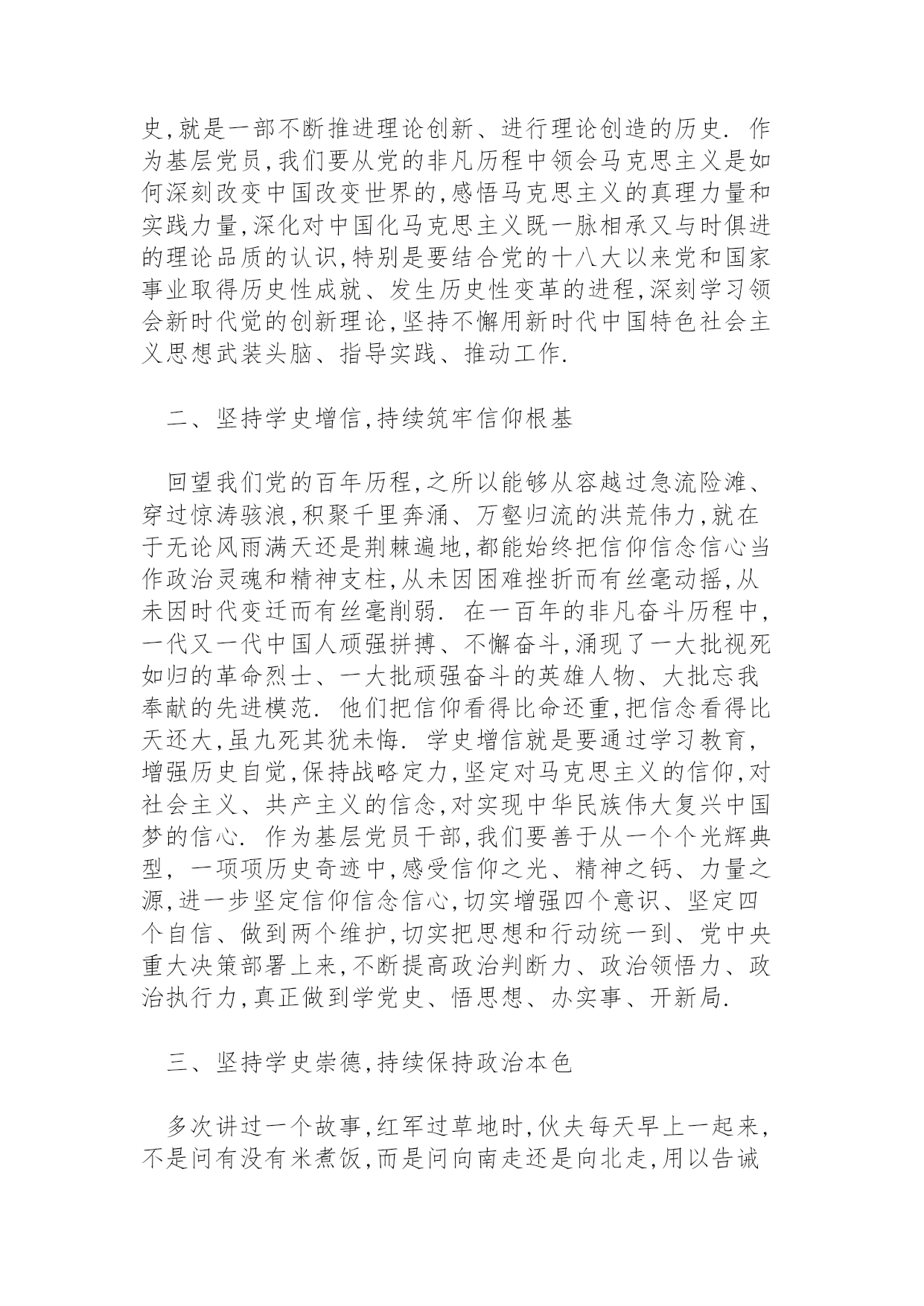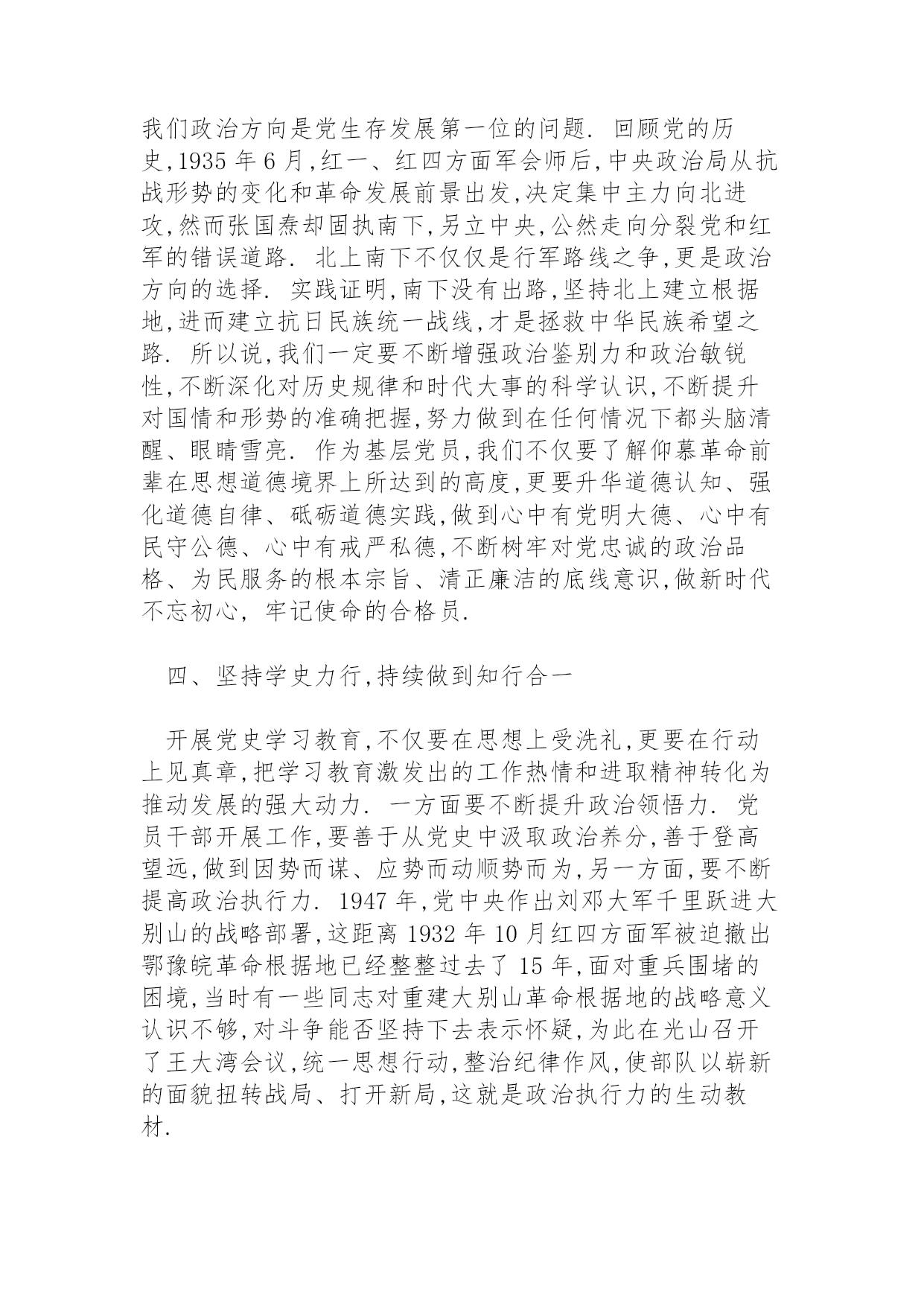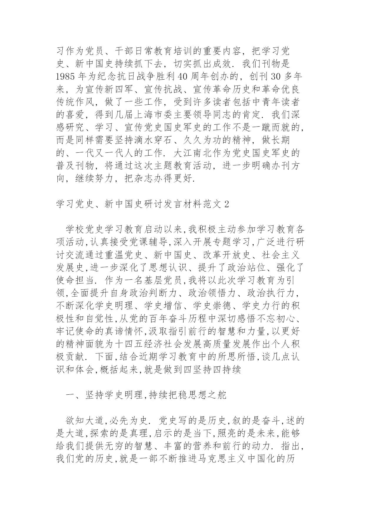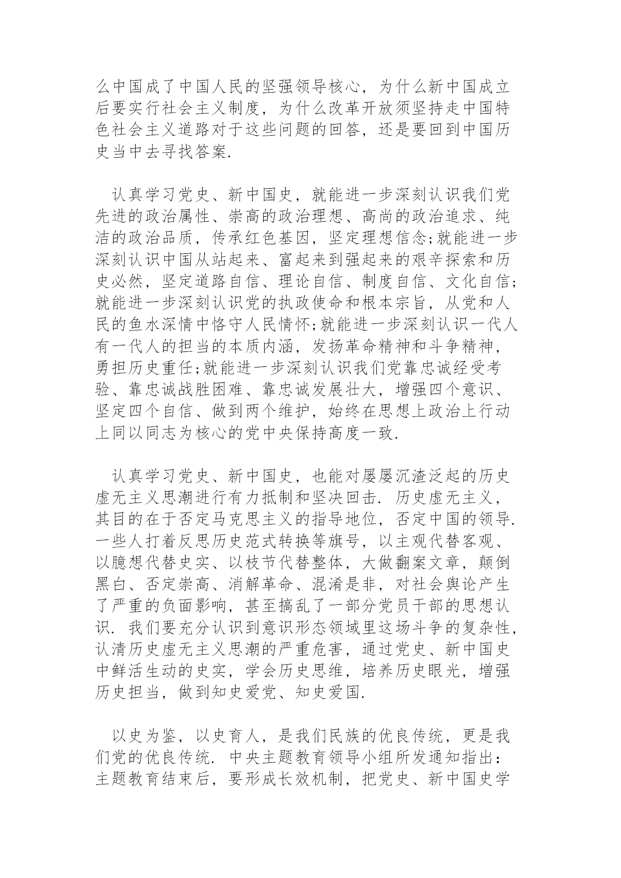 学习党史、新中国史研讨发言材料范文三篇 历史是最好的教科书.学习党史、新中国史,是坚持和发展中国特色社会主义、把党和国家各项事业继续推向前进的必修课.下面是小编为您推荐学习党史、新中国史研讨发言材料范文三篇.学习党史、新中国史研讨发言材料范文1不忘初心、牢记使命主题教育正在扎扎实实地推进.近日,中央不忘初心、牢记使命主题教育领导小组印发关于在不忘初心、牢记使命主题教育中认真学习党史、新中国史的通知,要求各地区各部门各单位把学习党史、新中国史作为主题教育重要内容,不断增强守初心、担使命的思想和行动自觉.这是将主题教育推向深入的重要措施.历来重视学习党史国史,他曾反复强调:历史是最好的教科书.学习党史、国史,是坚持和发展中国特色社会主义、把党和国家各项事业继续推向前进的必修课.这门功课不仅必修,而且必须修好.中国近代以来170多年的斗争史,中国98年的奋斗史,新中国70年的发展史,真是波澜壮阔、大气磅礴,其苦难辉煌可歌可泣、可资可鉴.当前,在党员干部接受主题教育、探究和牢记初心使命的时候,认真学习党史、新中国史就显得更加迫切和必要.欲知大道,必先为史.一个民族如果不能把握自己历史的发展规律,就不可能深刻地了解现在的位置和未来的走向.历史是我们民族的根、党的根,也是我们民族的魂、党的魂.要实现中华民族伟大复兴的中国梦,实现四个全面战略部署,实现两个一百年的奋斗目标,就需要知道我们从哪里来、走过哪些路、要到哪里去,需要知道我们的过去是什么、现在是什么、将来又是什么;就要搞清楚为什么中国成了中国人民的坚强领导核心,为什么新中国成立后要实行社会主义制度,为什么改革开放须坚持走中国特色社会主义道路对于这些问题的回答,还是要回到中国历史当中去寻找答案.认真学习党史、新中国史,就能进一步深刻认识我们党先进的政治属性、崇高的政治理想、高尚的政治追求、纯洁的政治品质,传承红色基因,坚定理想信念;就能进一步深刻认识中国从站起来、富起来到强起来的艰辛探索和历史必然,坚定道路自信、理论自信、制度自信、文化自信;就能进一步深刻认识党的执政使命和根本宗旨,从党和人民的鱼水深情中恪守人民情怀;就能进一步深刻认识一代人有一代人的担当的本质内涵,发扬革命精神和斗争精神,勇担历史重任;就能进一步深刻认识我们党靠忠诚经受考验、靠忠诚战胜困难、靠忠诚发展壮大,增强四个意识、坚定四个自信、做到两个维护,始终在思想上政治上行动上同以同志为核心的党中央保持高度一致.认真学习党史、新中国史,也能对屡屡沉渣泛起的历史虚无主义思潮进行有力抵制和坚决回击.历史虚无主义,其目的在于否定马克思主义的指导地位,否定中国的领导.一些人打着反思历史范式转换等旗号,以主观代替客观、以臆想代替史实、以枝节代替整体,大做翻案文章,颠倒黑白、否定崇高、消解革命、混淆是非,对社会舆论产生了严重的负面影响,甚至搞乱了一部分党员干部的思想认识.我们要充分认识到意识形态领域里这场斗争的复杂性,认清历史虚无主义思潮的严重危害,通过党史、新中国史中鲜活生动的史实,学会历史思维,培养历史眼光,增强历史担当,做到知史爱党、知史爱国.以史为鉴,以史育人,是我们民族的优良传统,更是我们党的优良传统.中央主题教育领导小组所发通知指出:主题教育结束后,要形成长效机制,把党史、新中国史学习作为党员、干部日常教育培训的重要内容,把学习党史、新中国史持续抓下去,切实抓出成效.我们刊物是1985年为纪念抗日战争胜利40周年创办的,创刊30多年来,为宣传新四军、宣传抗战、宣传革命历史和革命优良传统作风,做了一些工作,受到许多读者包括中青年读者的喜爱,得到几届上海市委主要领导同志的肯定.我们深感研究、学习、宣传党史国史军史的工作不是一蹴而就的,而是同样需要坚持滴水穿石、久久为功的精神,做长期的、一代又一代人的工作.大江南北作为党史国史军史的普及刊物,将通过这次主题教育活动,进一步明确办刊方向,继续努力,把杂志办得更好.学习党史、新中国史研讨发言材料范文2学校党史学习教育启动以来,我积极主动参加学习教育各项活动,认真接受党课辅导,深入开展专题学习,广泛进行研讨交流通过重温党史、新中国史、改革开放史、社会主义发展史,进一步深化了思想认识、提升了政治站位、强化了使命担当.作为一名基层党员,我将以此次学习教育为引领,全面提升自身政治判断力、政治领悟力、政治执行力,不断深化学史明理、学史增信、学史崇德、学史力行的积极性和自觉性,从党的百年奋斗历程中深切感悟不忘初心、牢记使命的真谛情怀,汲取指引前行的智慧和力量,以更好的精神面貌为十四五经济社会发展高质量发展作出个人积极贡献.下面,结合近期学习教育中的所思所悟,谈几点认识和体会,概括起来,就是做到四坚持四持续一、坚持学史明理,持续把稳思想之舵欲知大道,必先为史.党史写的是历史,叙的是奋斗,述的是大道