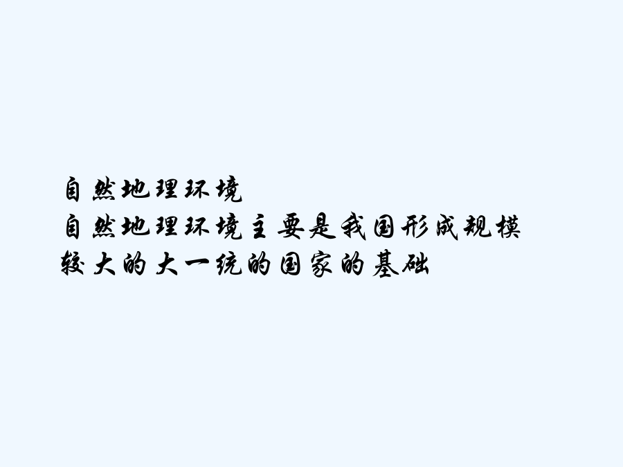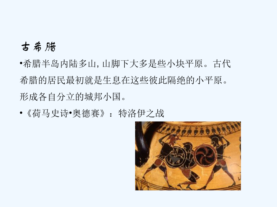 古代中国大一统成因的探讨自然地理环境 自然地理环境主要是我国形成规模较大的大一统的国家的基础古希腊 •希腊半岛内陆多山,山脚下大多是些小块平原。古代希腊的居民最初就是生息在这些彼此隔绝的小平原。形成各自分立的城邦小国。 •《荷马史诗•奥德赛》:特洛伊之战多山,多港,多岛,三面环海的地理环境中国 •在我国,文明起源于中原一带。这里没有高山所隔,是一片广裹的平原地带。如果不是人为地划定疆界(如后来的封邦建土),人们是不会把自己局限在一个狭小的范围内的。 大家应该也有点累了,稍作休息《史记·五帝本纪》 轩辕之时,神农氏世衰。诸侯相侵伐,暴虐百姓,而神农氏弗能征。于是轩辕乃习用干戈,以征不享,诸侯咸来宾从。而蚩尤最为暴,莫能伐……于是黄帝乃征师诸侯,与蚩尤战于涿鹿之野,遂禽杀蚩尤。而诸侯咸尊轩辕为天子,代神农氏,是为黄帝。” 迁徙往来无常处,以师兵为营卫……置左右大监,监万国……时播百谷草木,淳化鸟兽虫蛾,旁罗日月星辰水波土石金玉,劳勤心力耳目,节用水火材物。经济基础 经济基础是我国政治大一统和思想文化大一统的主要原因古希腊 多山,多港,多岛,三面环海的地理环境,导致经济上农业不发达,航海业发达,商品生产和海外贸易占主导地位,古希腊广泛的海外贸易,殖民扩张及经济和文化交往活动,形成了宽松自由的社会环境,并较早地接受平等互利观念,利于民主政治的形成. 大范围的相似的农业经济 另一方面,由于农耕经济的经营规模狭小,缺乏积累和储备的能力,经不起风吹浪打,在遭受严重自然灾害或战乱时,多数农民家庭就会陷于贫困,失去土地或破产流亡。 西汉晃错《论贵粟疏》“勤苦如此,尚复被水旱之灾,急政暴赋,赋敛不时,朝令而暮当。有者半贾而卖,亡者取倍称之息。于是有卖田宅、鬻子女以偿责者。” 《小雅·北山》“溥天之下,莫非王土;率土之滨,莫非王臣”